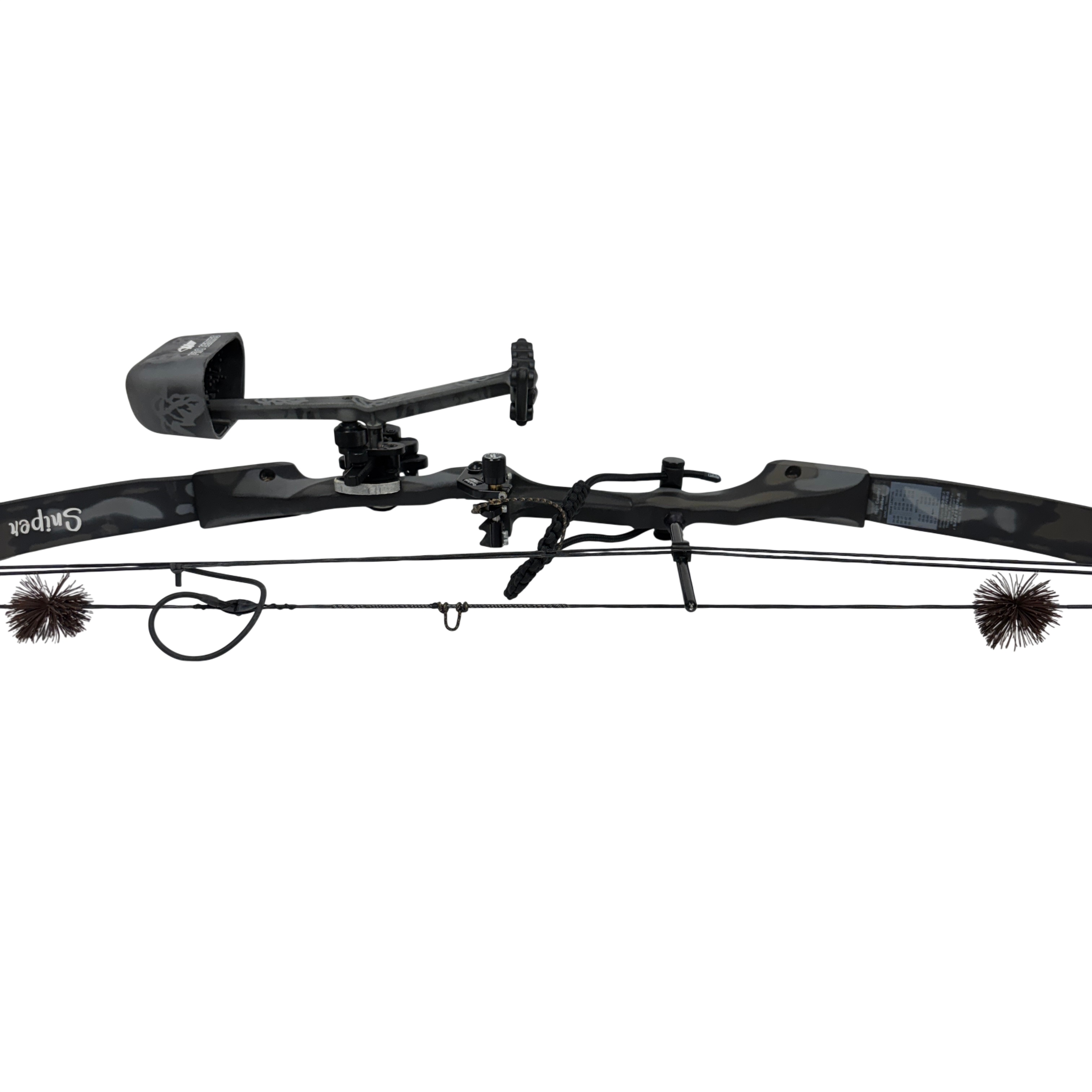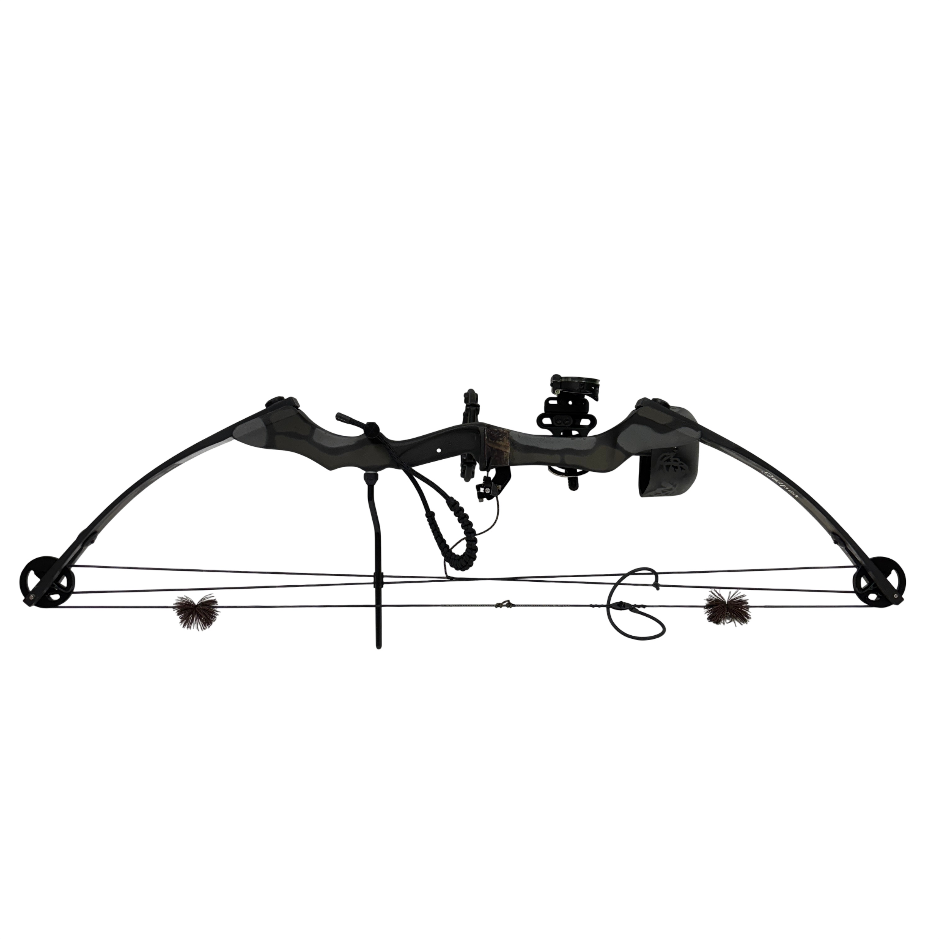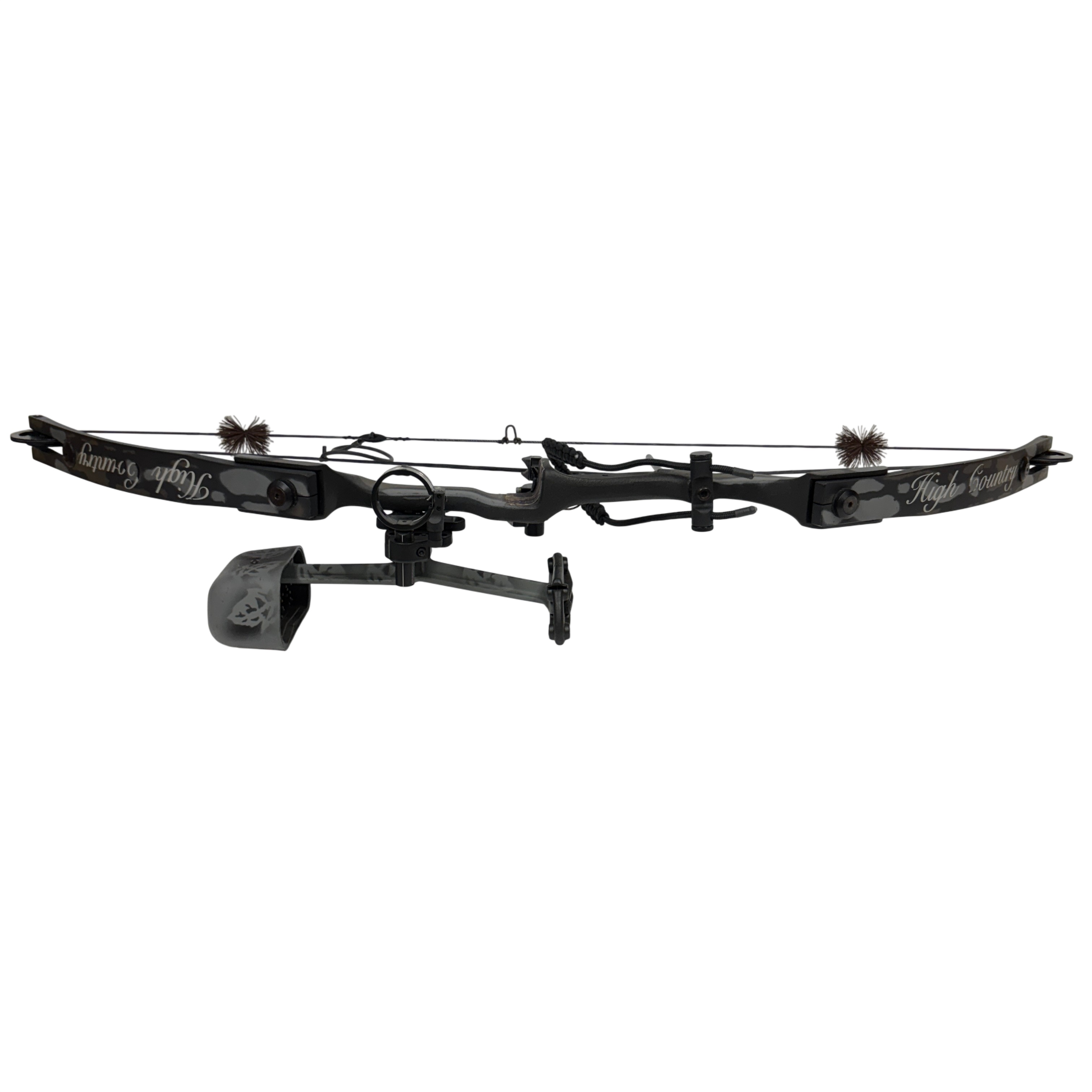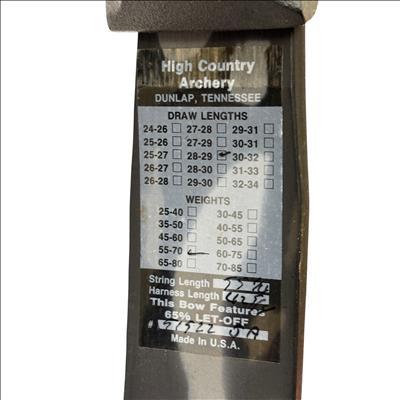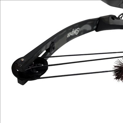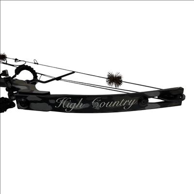 The High Country Sniper Bow with Quiver is a compound bow designed for archery enthusiasts seeking precision and power. Featuring an adjustable draw length of 28-29 inches and a draw weight range of 55-70 pounds, this bow offers a 65% let-off to reduce holding effort at full draw. Made in the USA, it comes with an attached quiver for convenient arrow storage. Ideal for hunting or target shooting, this bow combines durability with performance in a sleek black and gray camouflage finish.