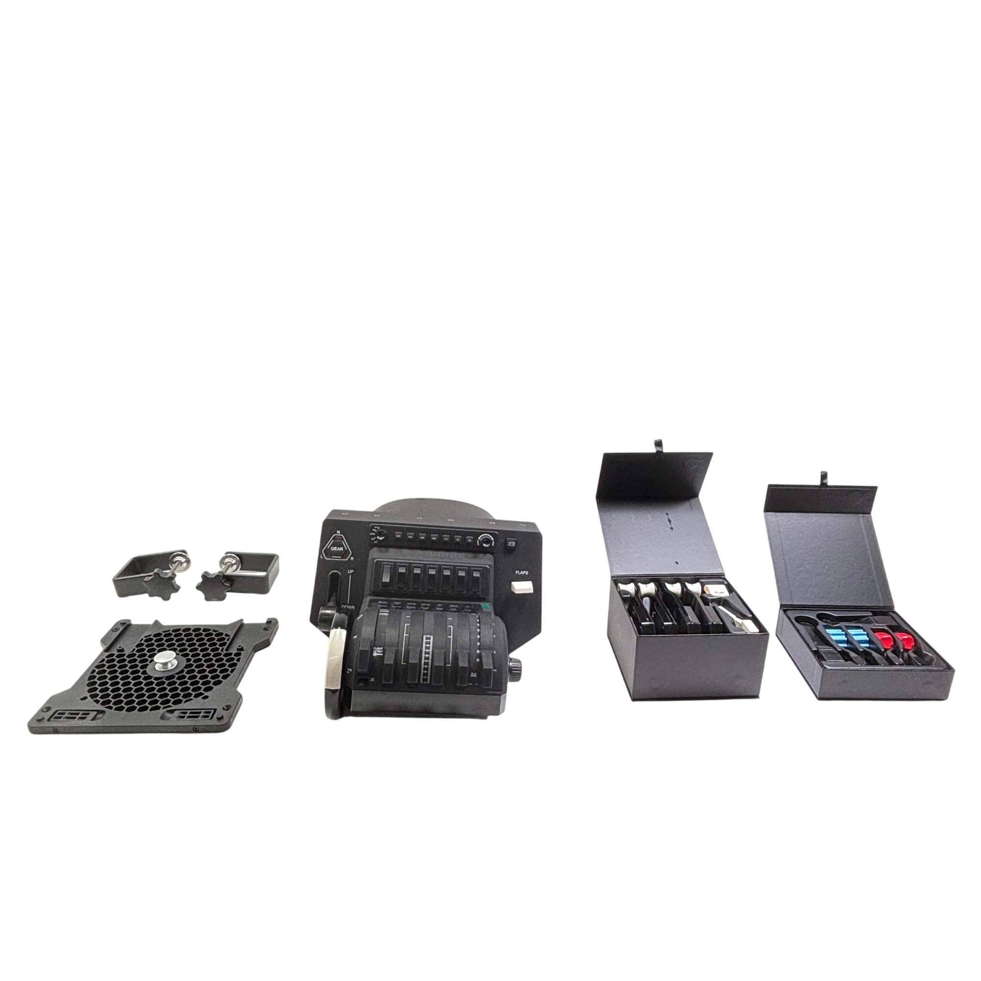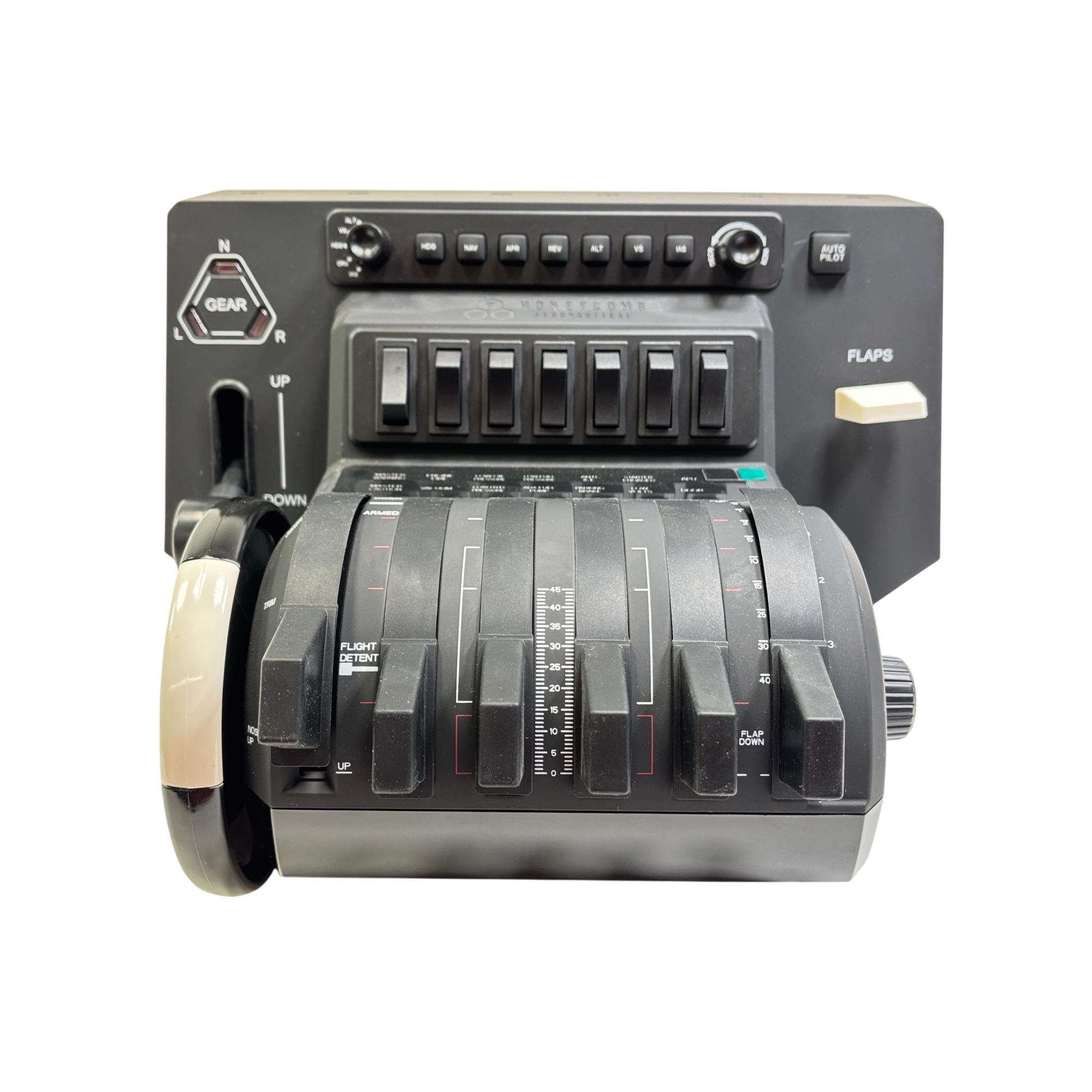 Honeycomb Aeronautical Bravo Throttle Quadrant Flight Simulator Controller provides precise control with its robust design, featuring multiple dials, knobs, and a grey rectangular button for enhanced functionality. This throttle quadrant is engineered for flight simulation enthusiasts seeking realistic gear and flap management, making it ideal for use with various flight simulator setups.