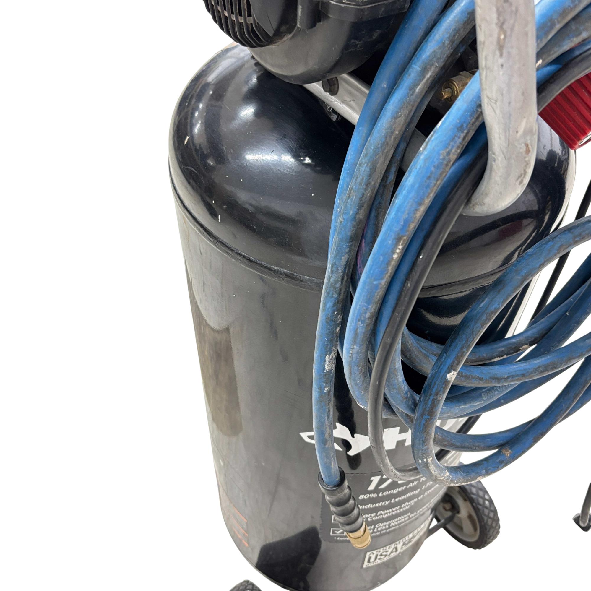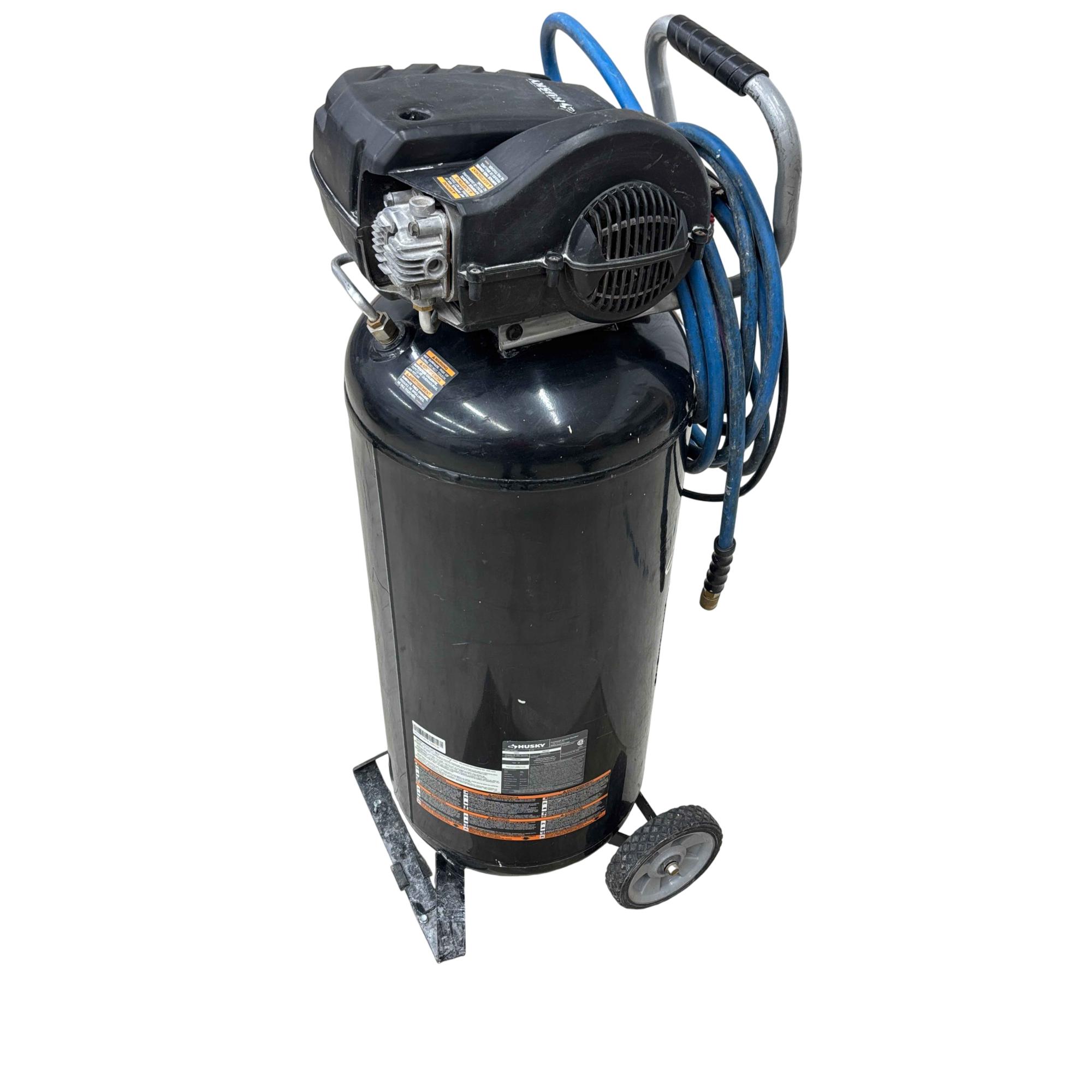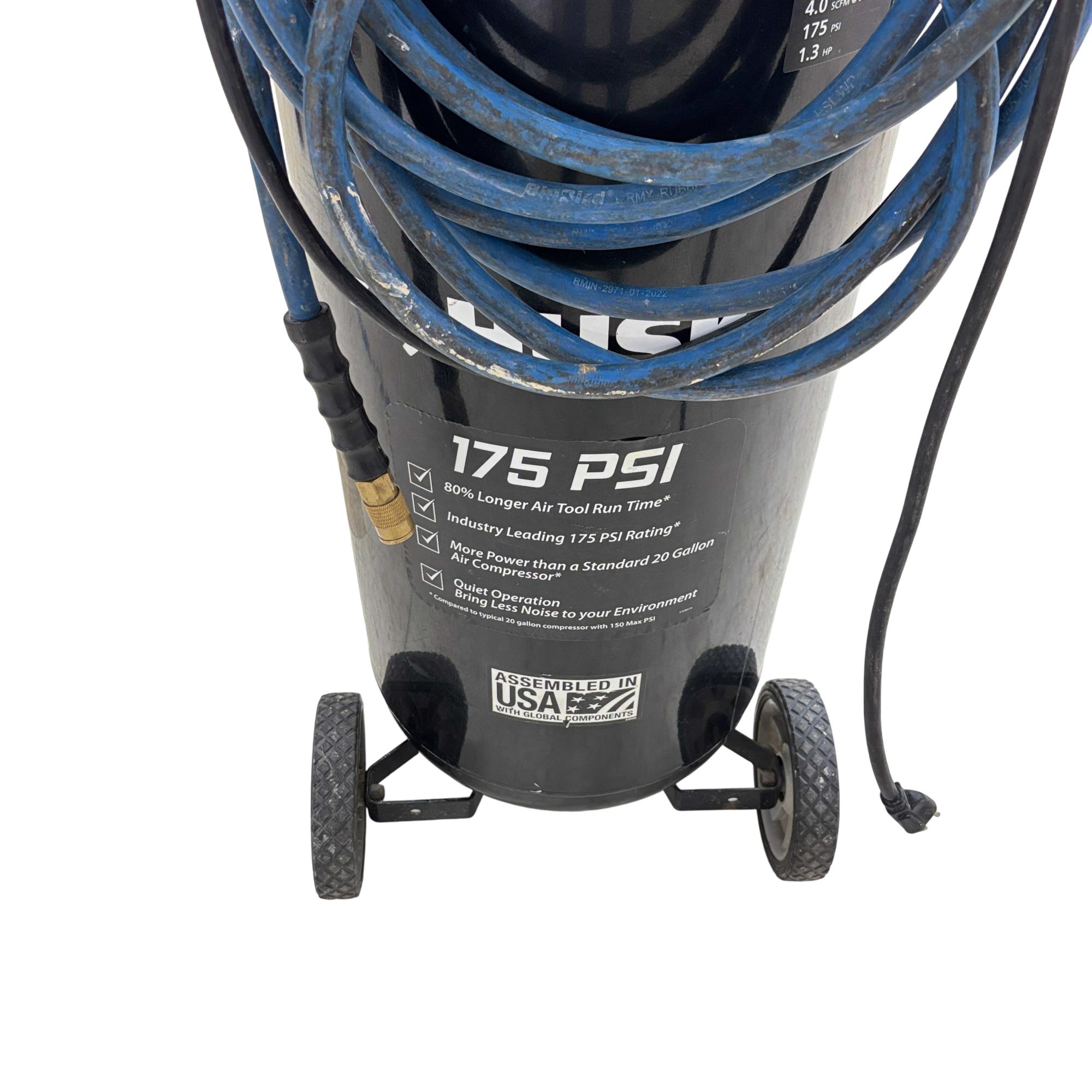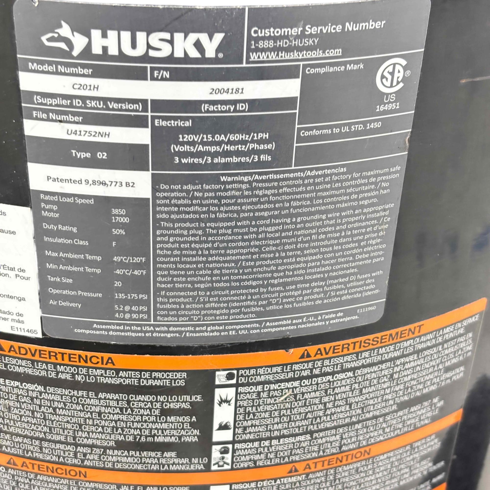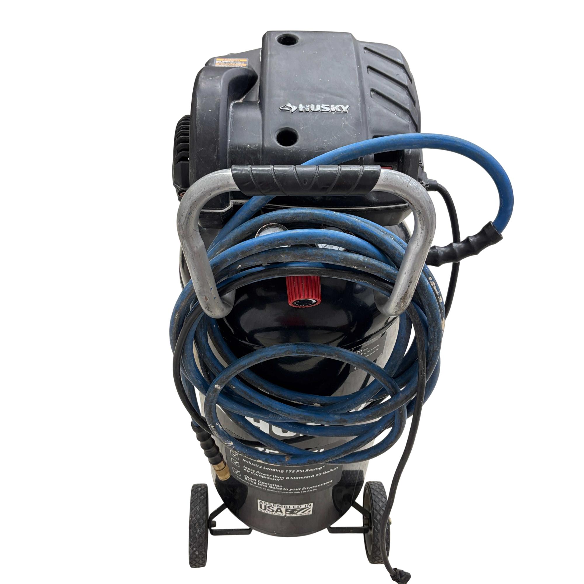 The Husky C201H 20 Gallon 175 PSI Portable Electric Air Compressor delivers reliable, oil-free performance with a 20-gallon vertical tank and a maximum pressure of 175 PSI. Its durable design features a powerful 120V motor and compliance with UL standards, ensuring safe and efficient operation for a variety of pneumatic tasks. This compressor is assembled in the USA using domestic and global components, optimized for both professional and home use.