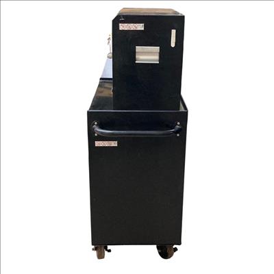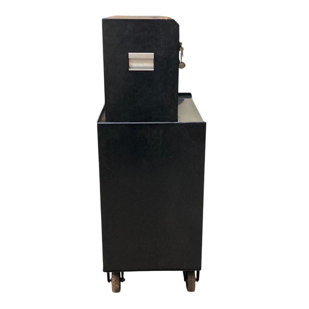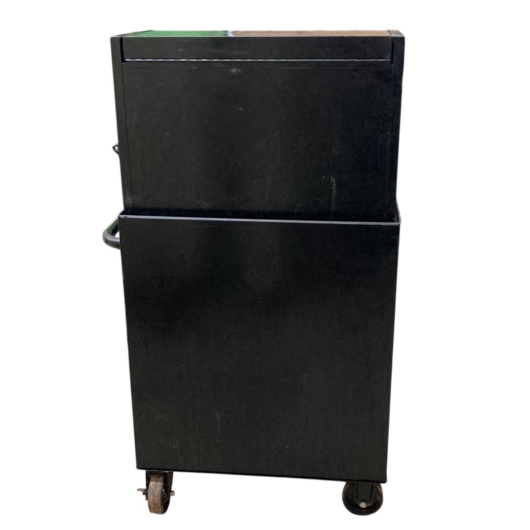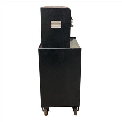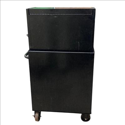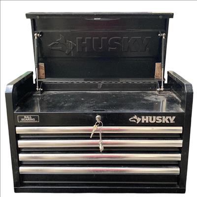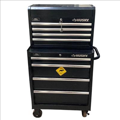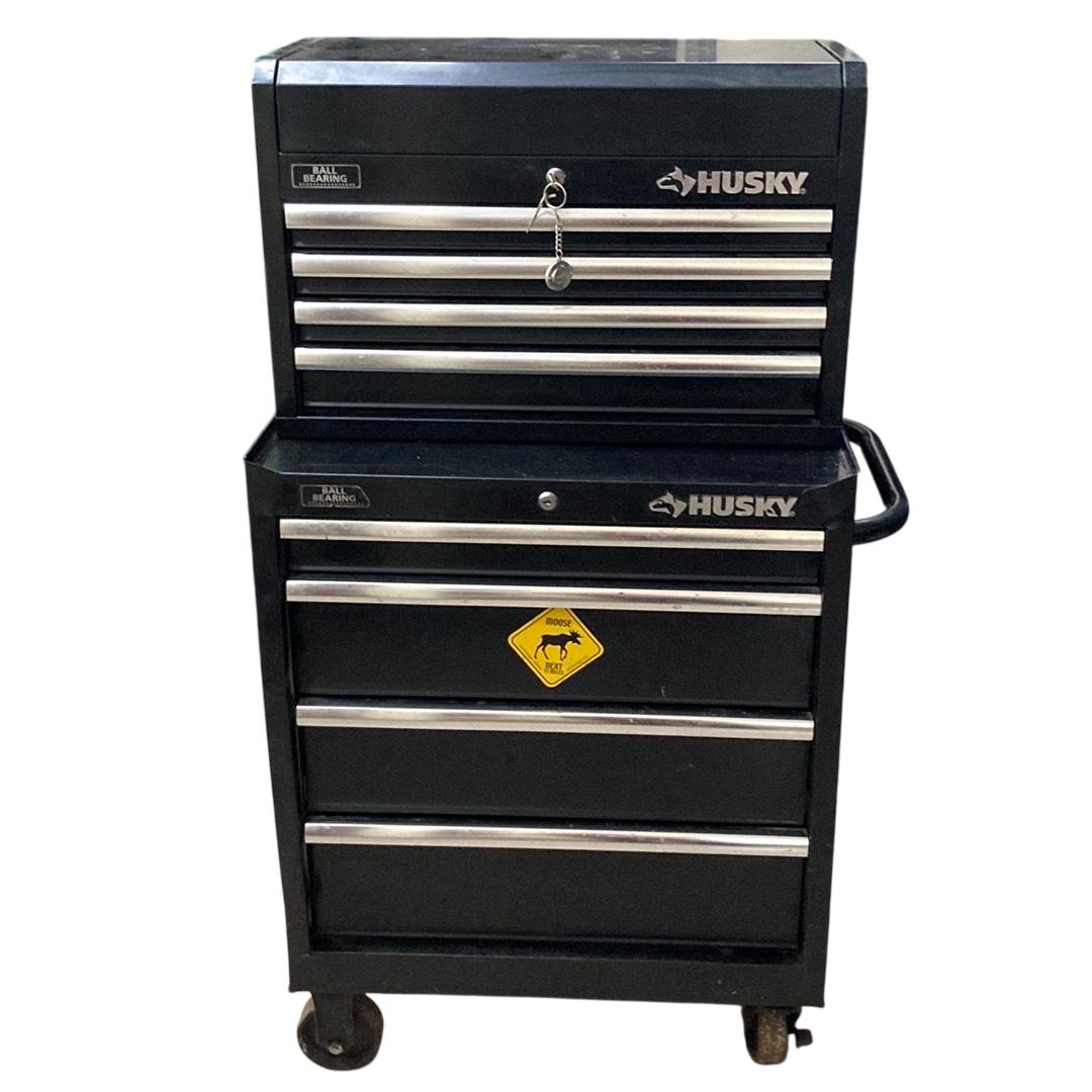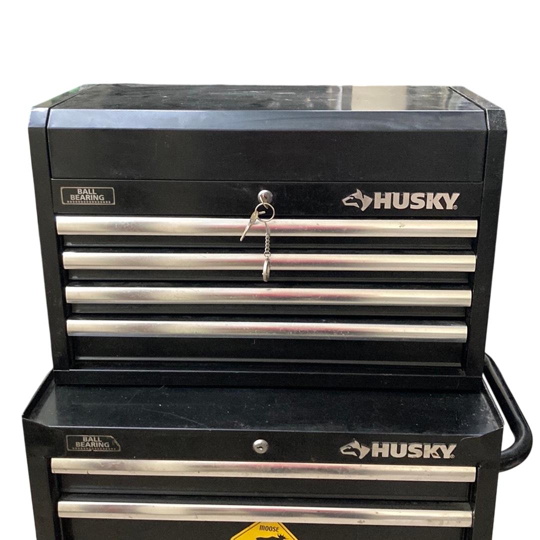 Husky 26 in. W x 16 in. D 5-Drawer Ball-Bearing Rolling Tool Chest Combo features durable ball-bearing drawers that provide smooth, reliable operation and robust construction ideal for organized tool storage. This glossy black rolling toolbox is equipped with a sturdy handle and wheels for convenient mobility, making it a practical solution for both professional and home workshops.