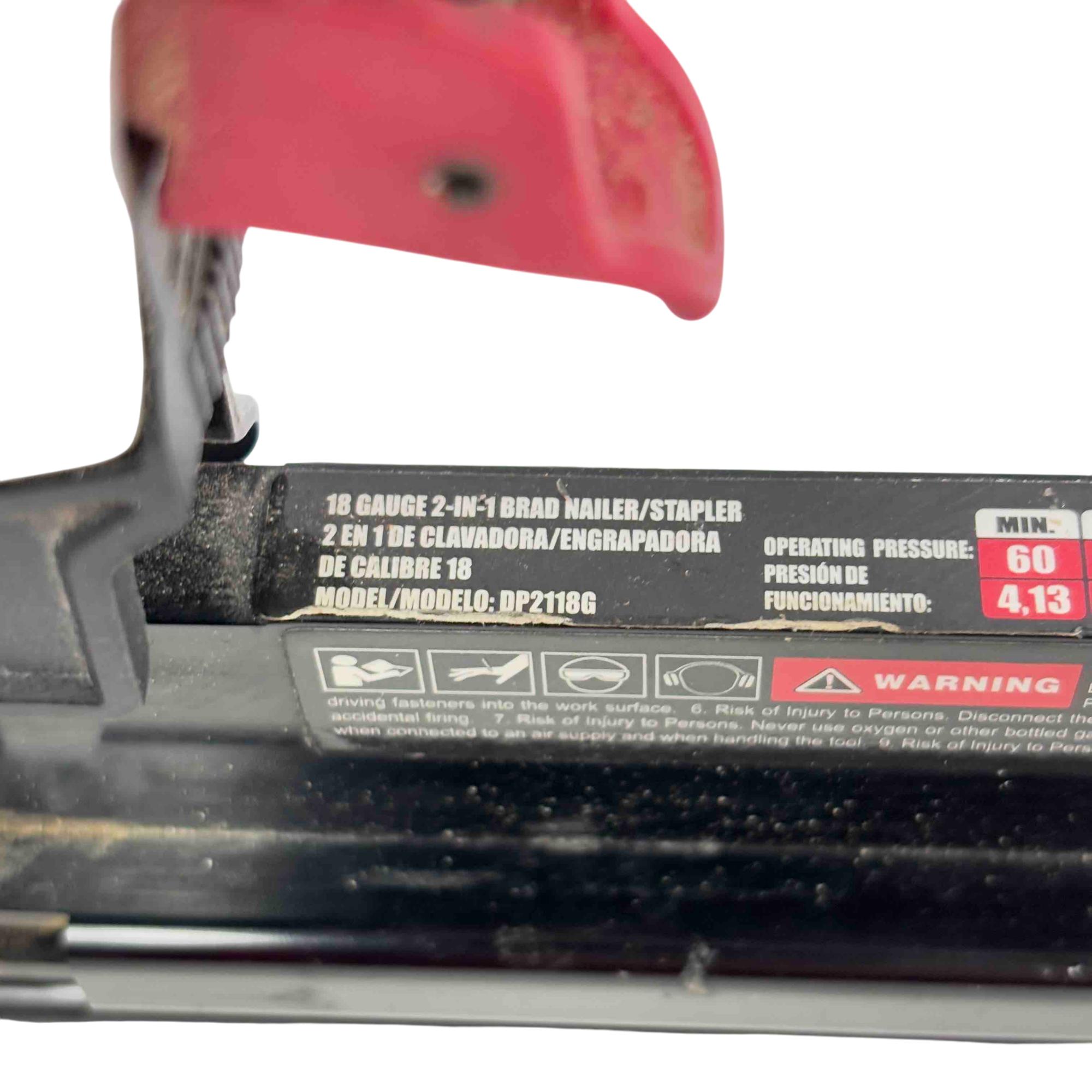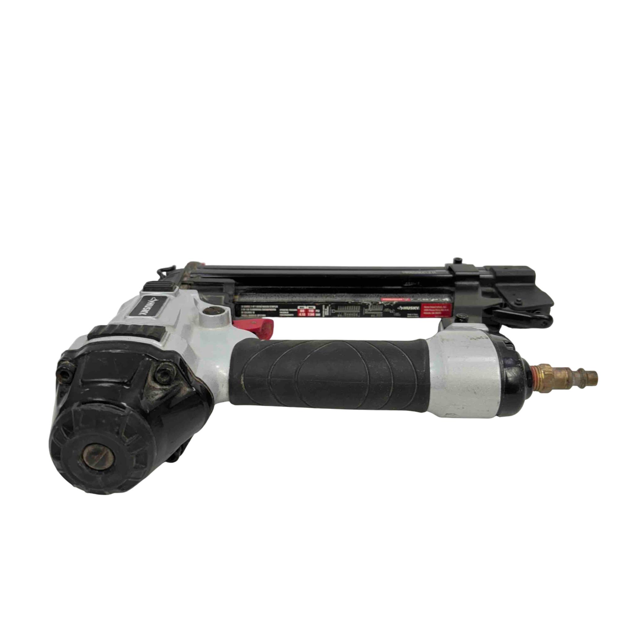 Upgrade your tool collection with the Husky DP2118G 18-Gauge 2-in-1 Brad Nailer and Stapler. Perfect for both professional and DIY enthusiasts, this versatile pneumatic tool seamlessly combines the function of a brad nailer and a stapler, providing efficient and reliable performance for a variety of projects. Its durable construction and ergonomic design ensure comfortable handling, making it an essential addition to your workshop.