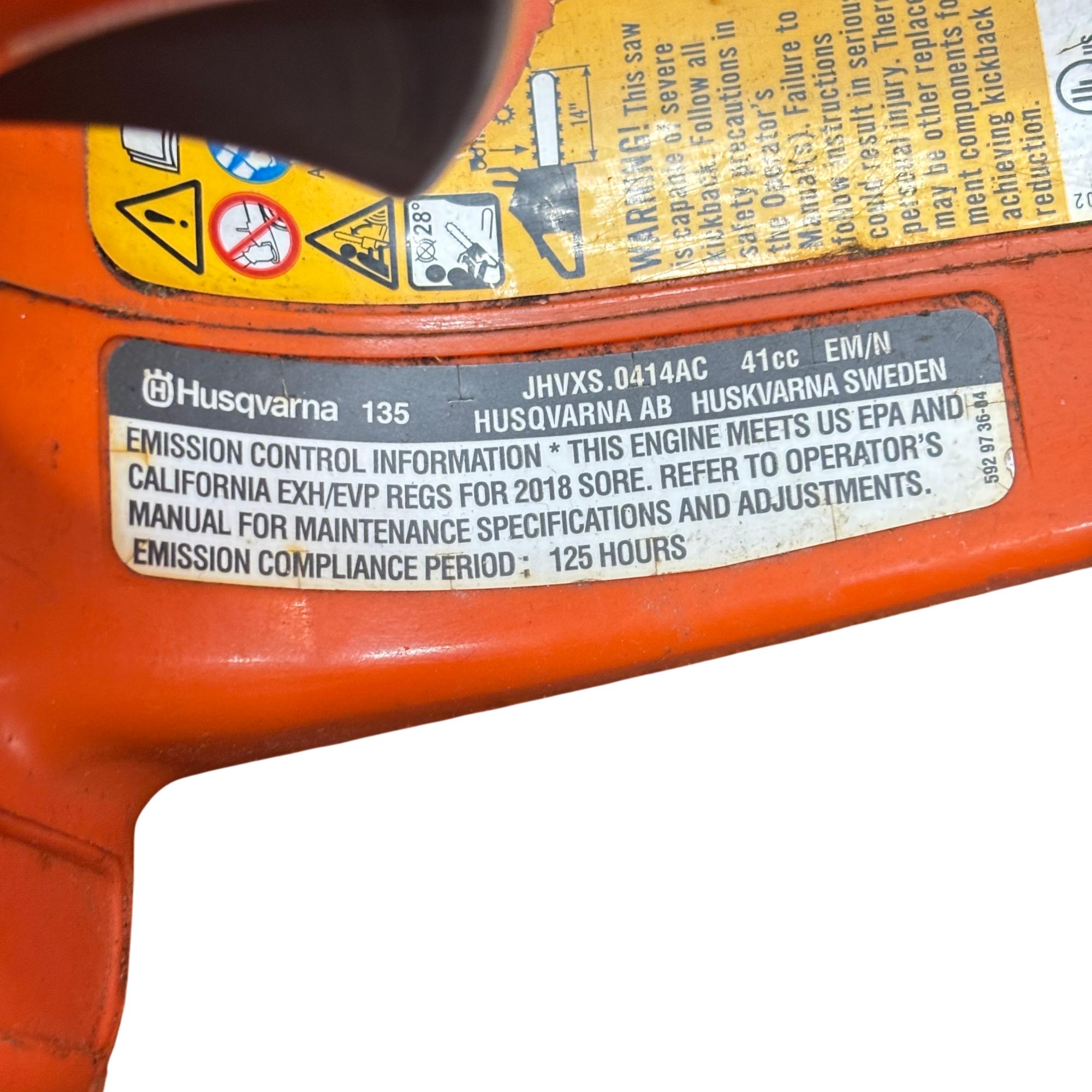 The Husqvarna 135 is a lightweight gas-powered chainsaw equipped with a 41cc engine and a 14-inch bar, ideal for trimming, limbing, and firewood cutting. Its compact design and responsive performance make it easy to handle for property maintenance and everyday yard work.