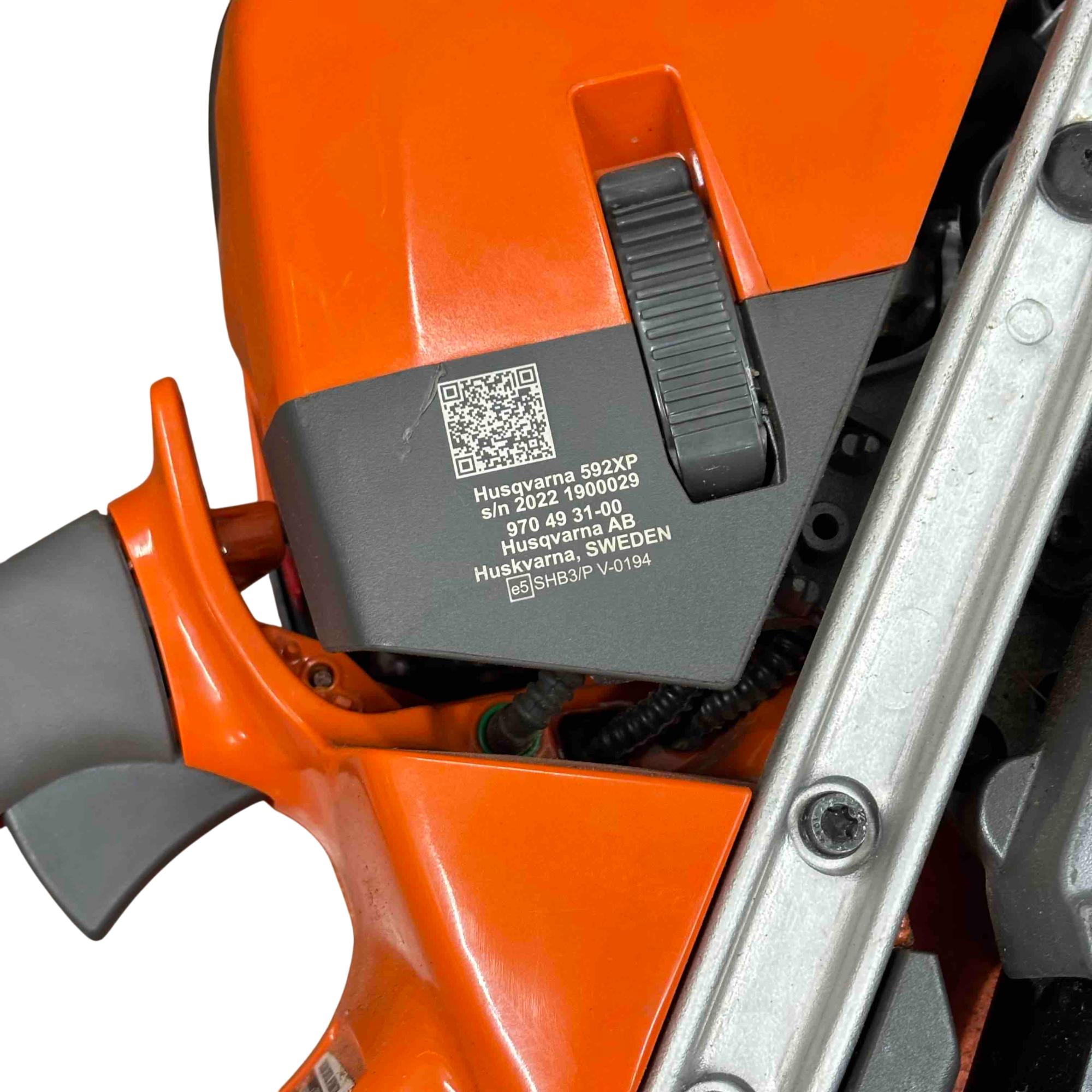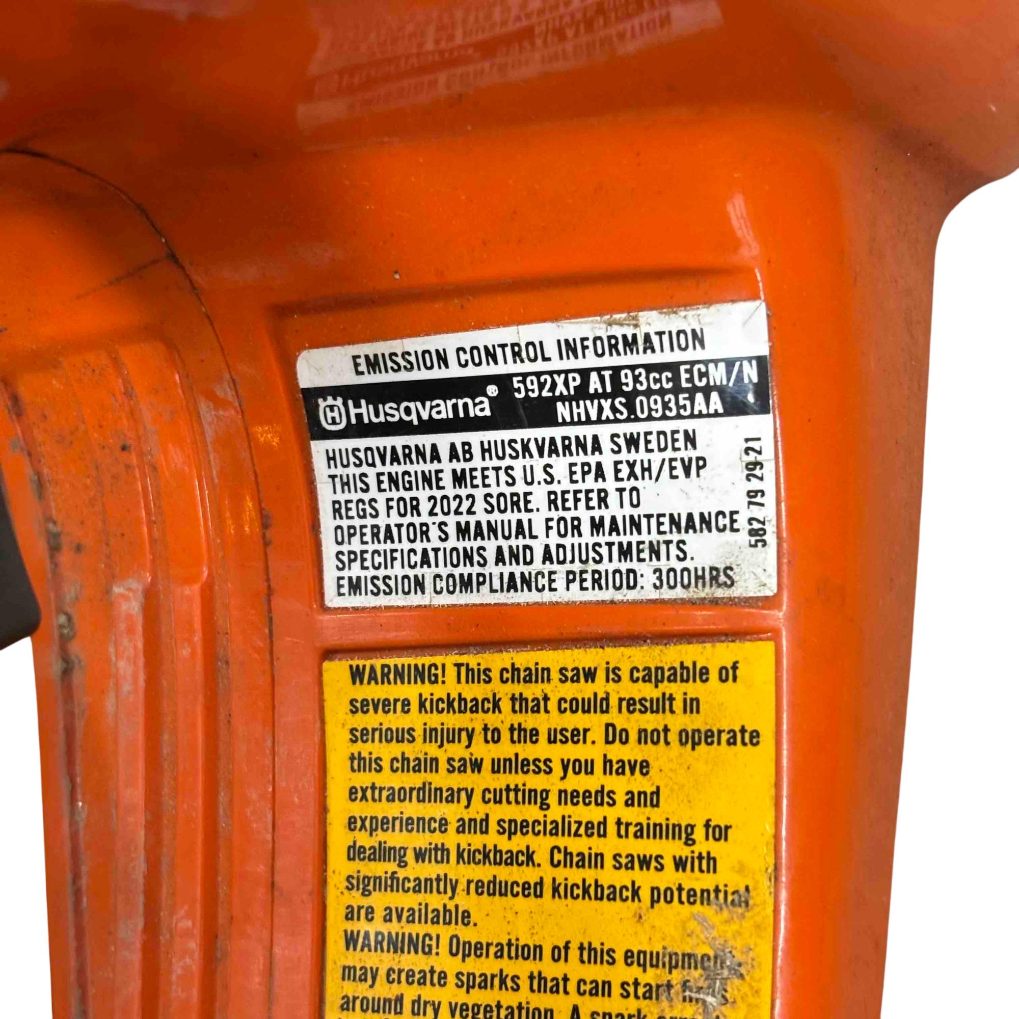 The Husqvarna 592 XP AutoTune is a gasoline-powered chain saw with a robust 7.6 hp (5.6 kW) power output and a 92.7 cm³ cylinder displacement. Equipped with a 44-inch bar, it is designed for high-performance cutting, offering efficiency and precision for demanding tasks.