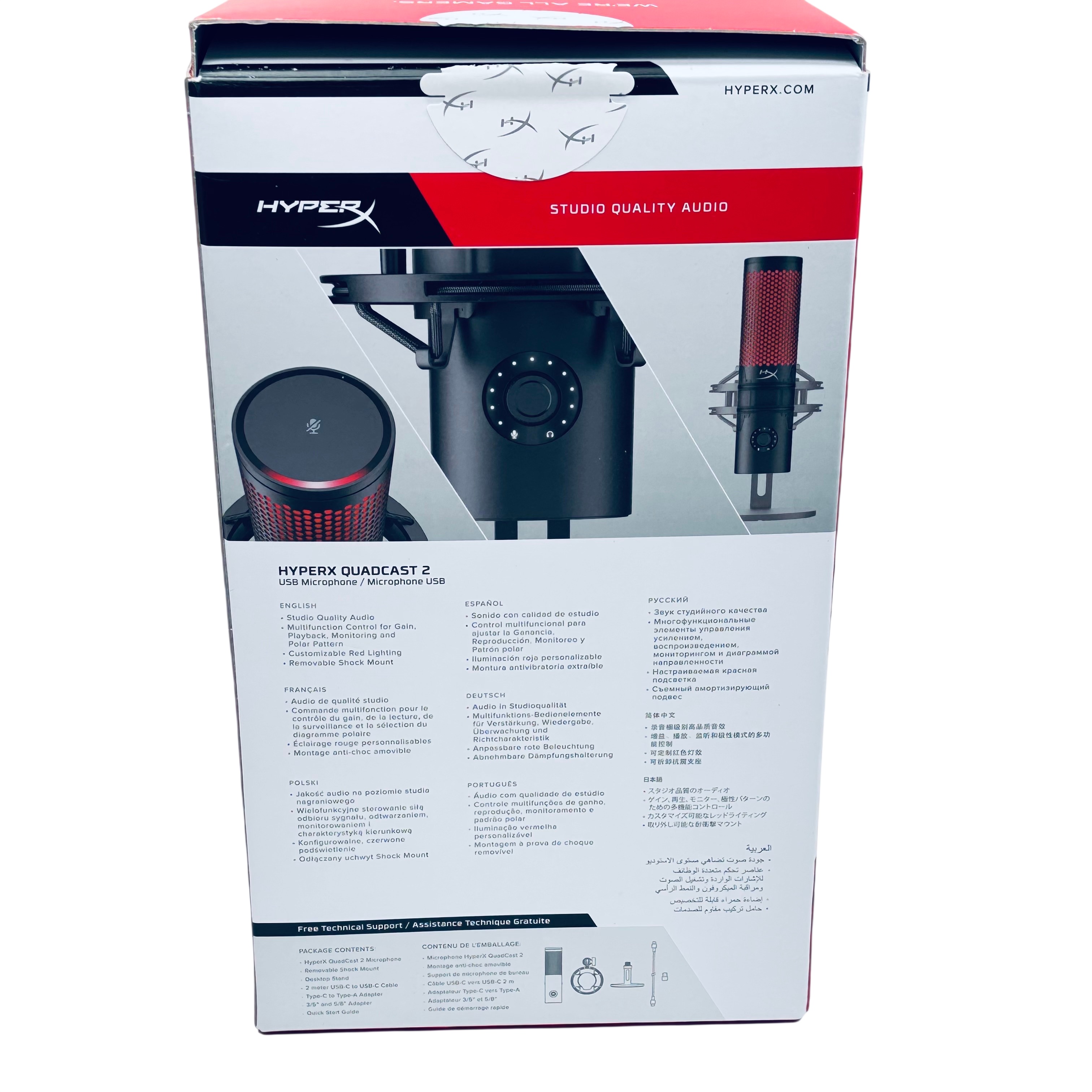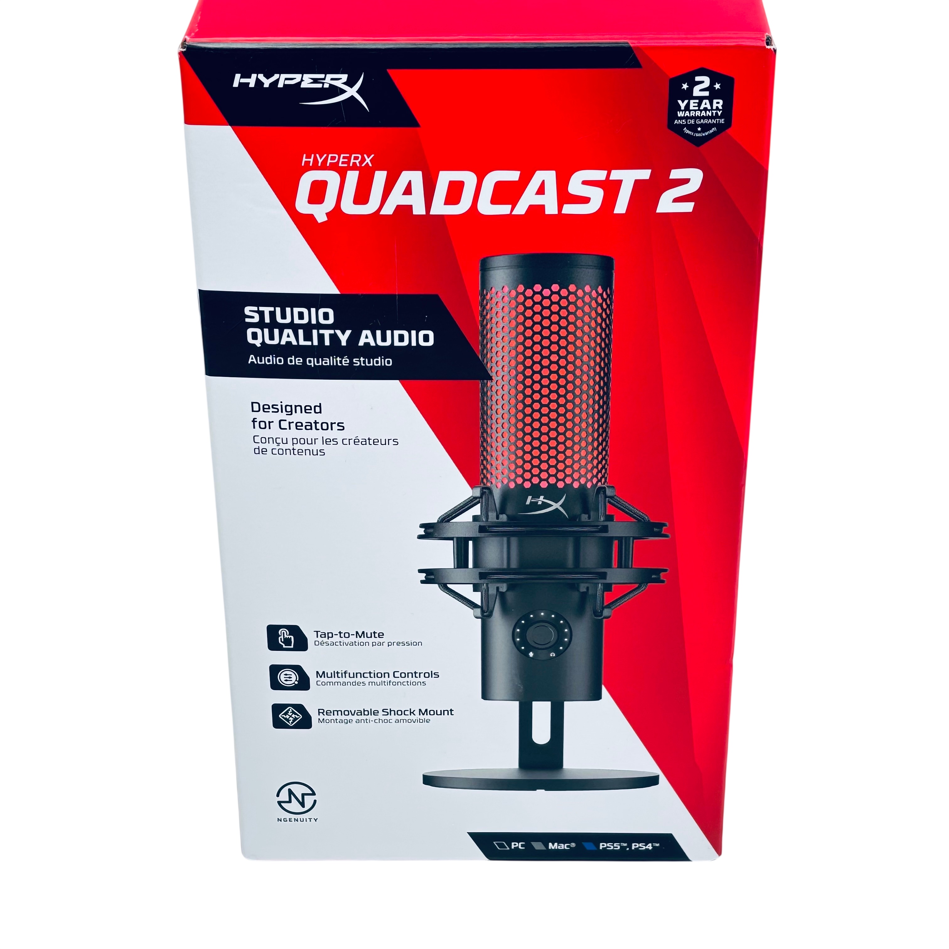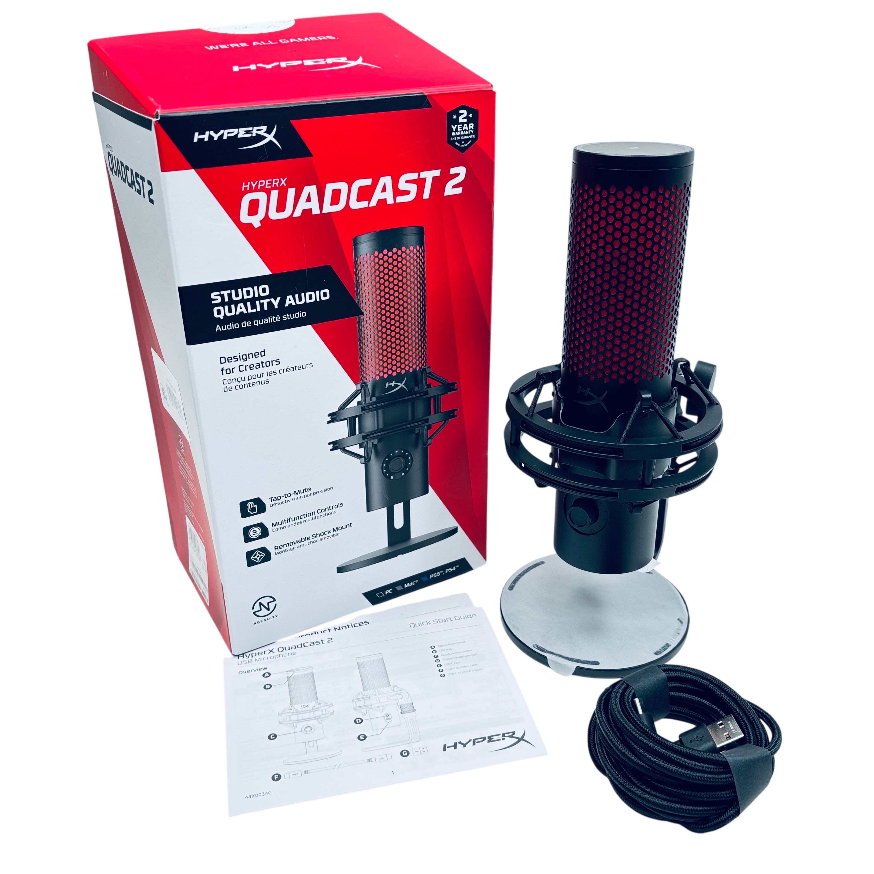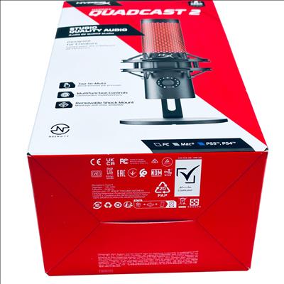 The HyperX QuadCast 2 USB Microphone (Model QDC002) delivers studio-quality audio with versatile USB-C connectivity, including a USB-A adapter for compatibility. Featuring a removable shock mount and tap-to-mute functionality, this microphone is designed specifically for content creators and podcasters seeking clear, professional sound. Its omnidirectional polar pattern captures audio from all directions, making it ideal for streaming, podcasting, and voice recording. The microphones compact design and multifunction controls provide an easy and efficient user experience.
