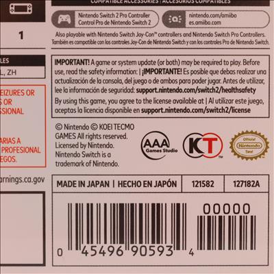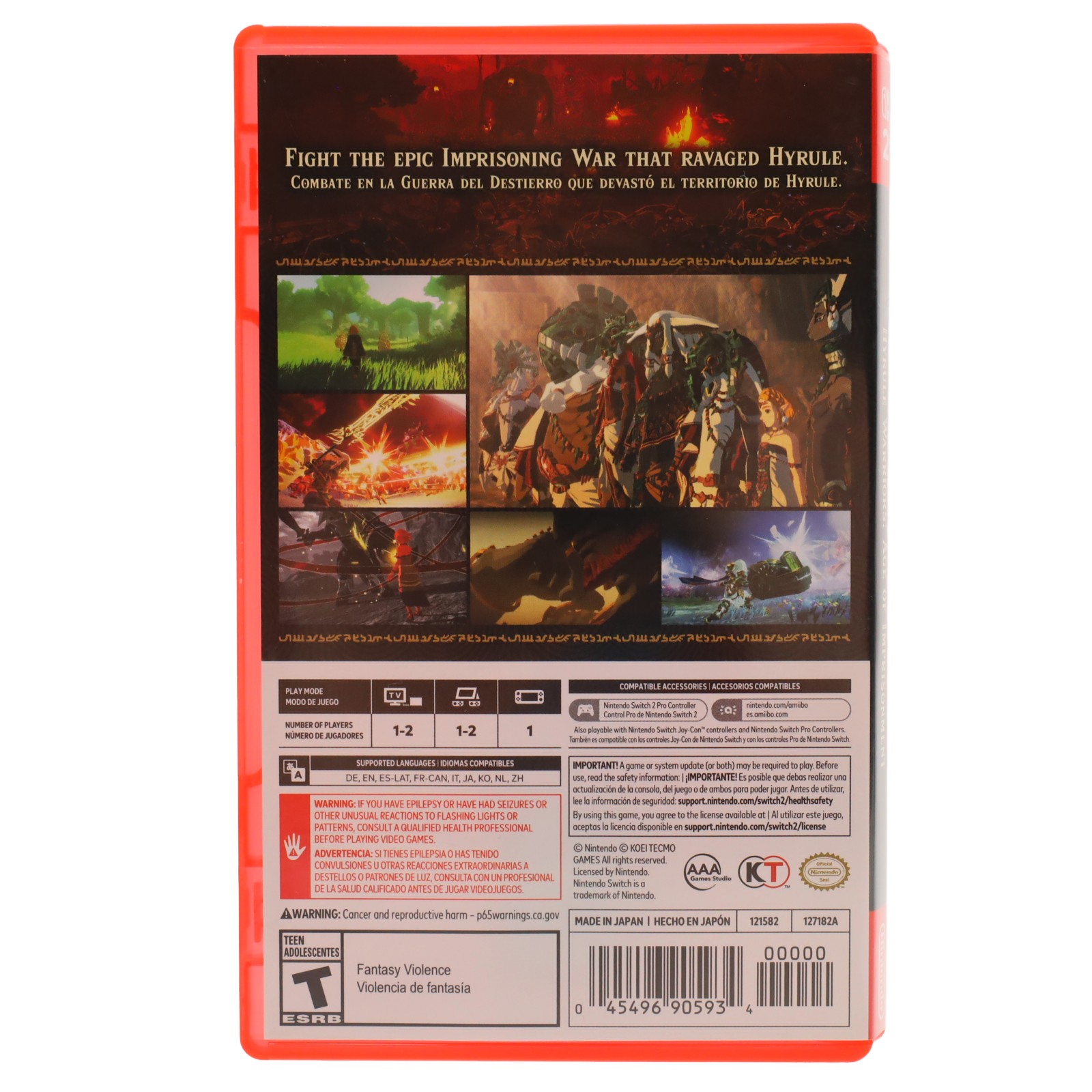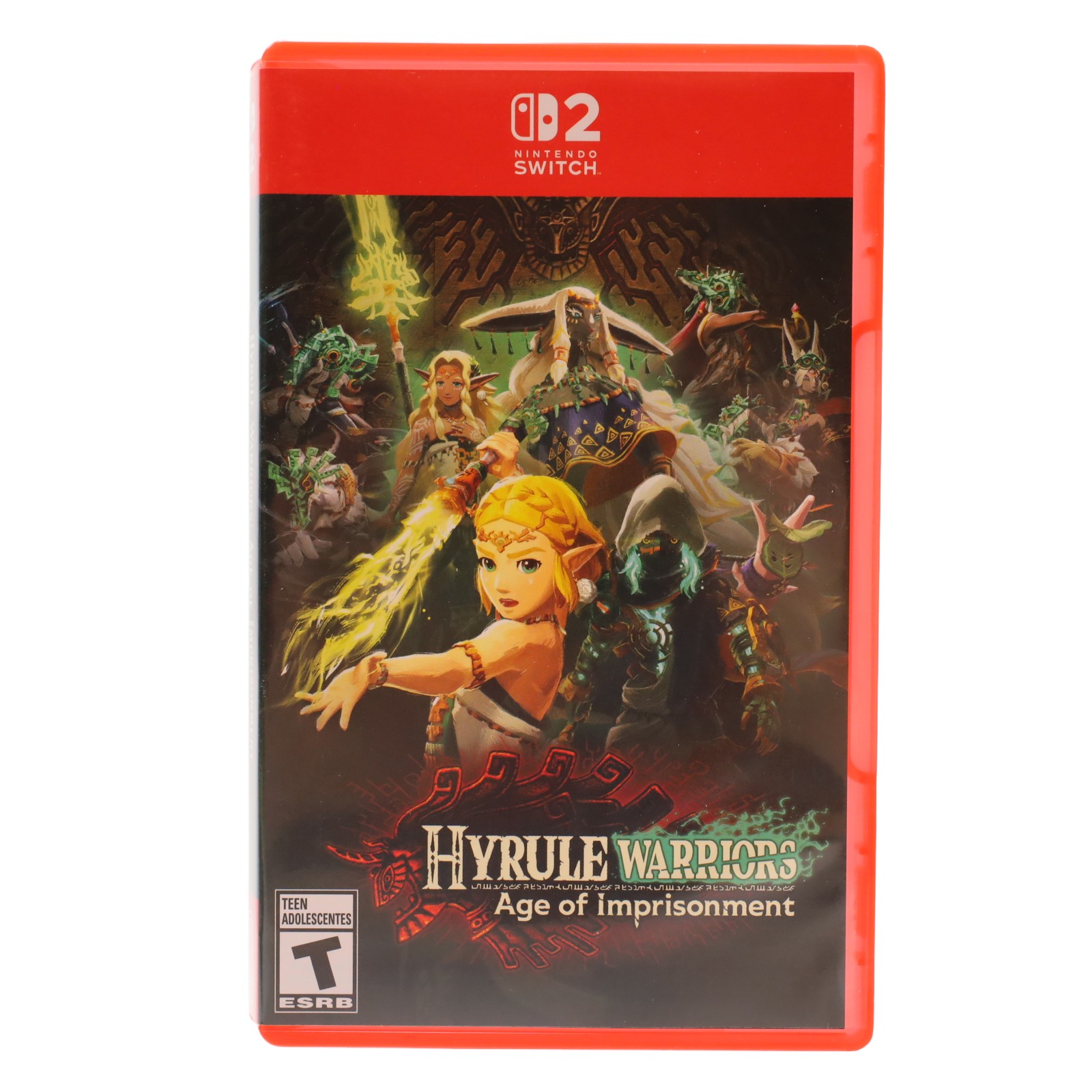 Nintendo Hyrule Warriors Age of Imprisonment Switch 2 (Model 121582) is an action-packed video game cartridge compatible with the Nintendo Switch 2 console. Featuring support for 1-2 players and multiple languages including English, Spanish, French, and Japanese, this game delivers immersive gameplay with fantasy violence rated Teen by ESRB. The package includes the game cartridge housed in a red plastic case, made in Japan, and is perfect for fans of the Hyrule Warriors series looking for cooperative or solo play on the latest Nintendo platform.