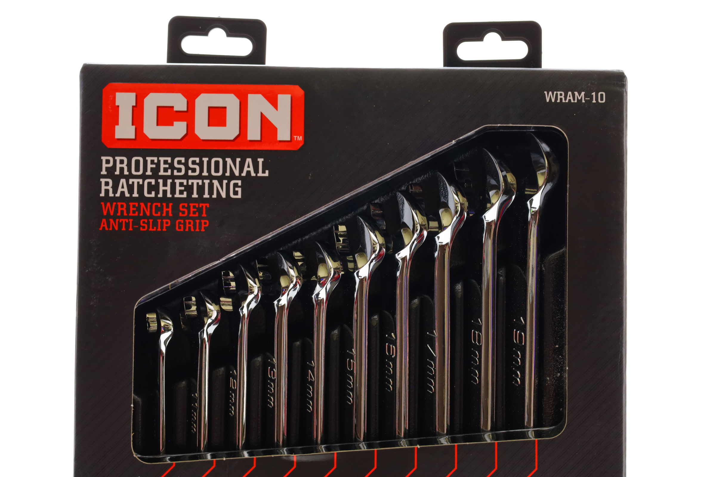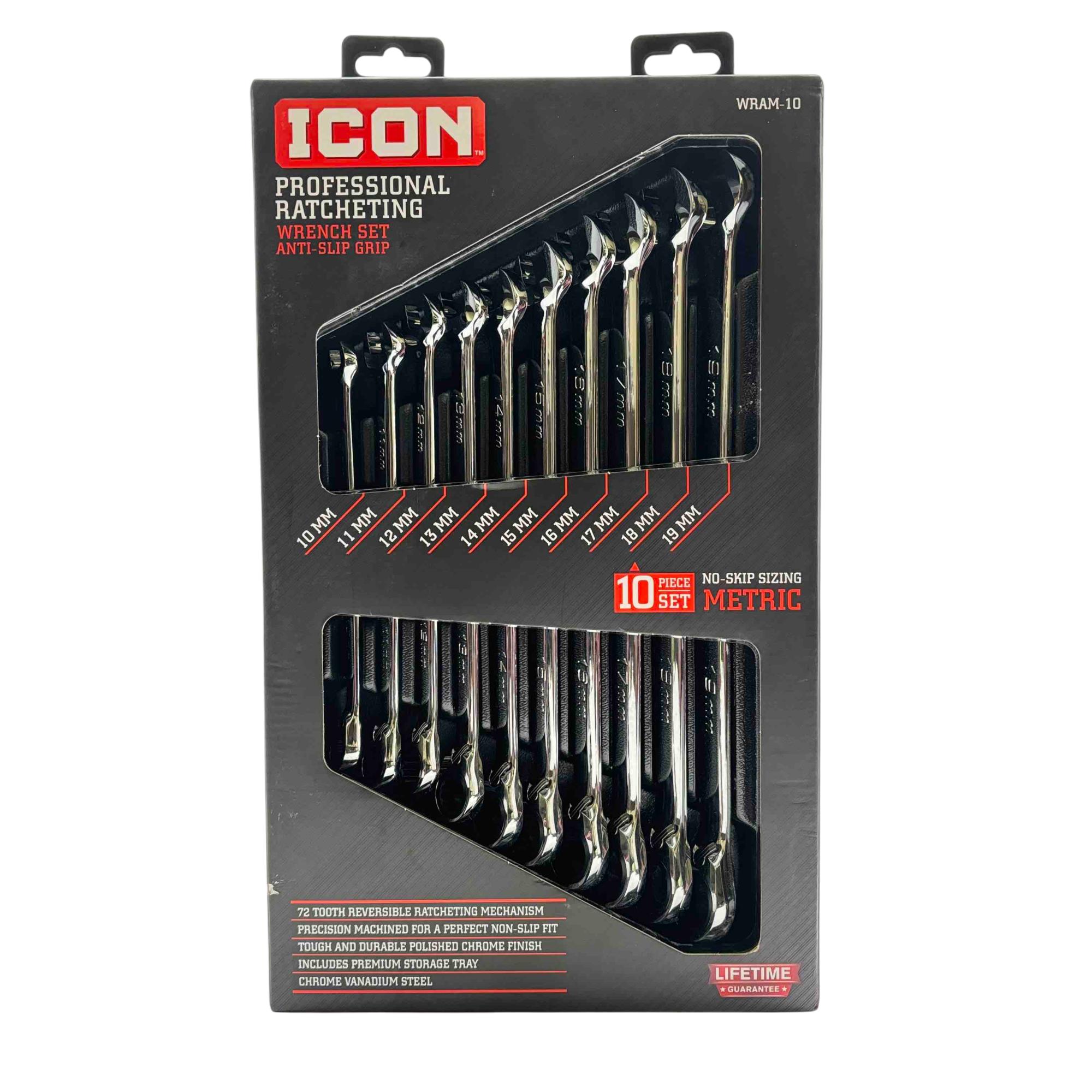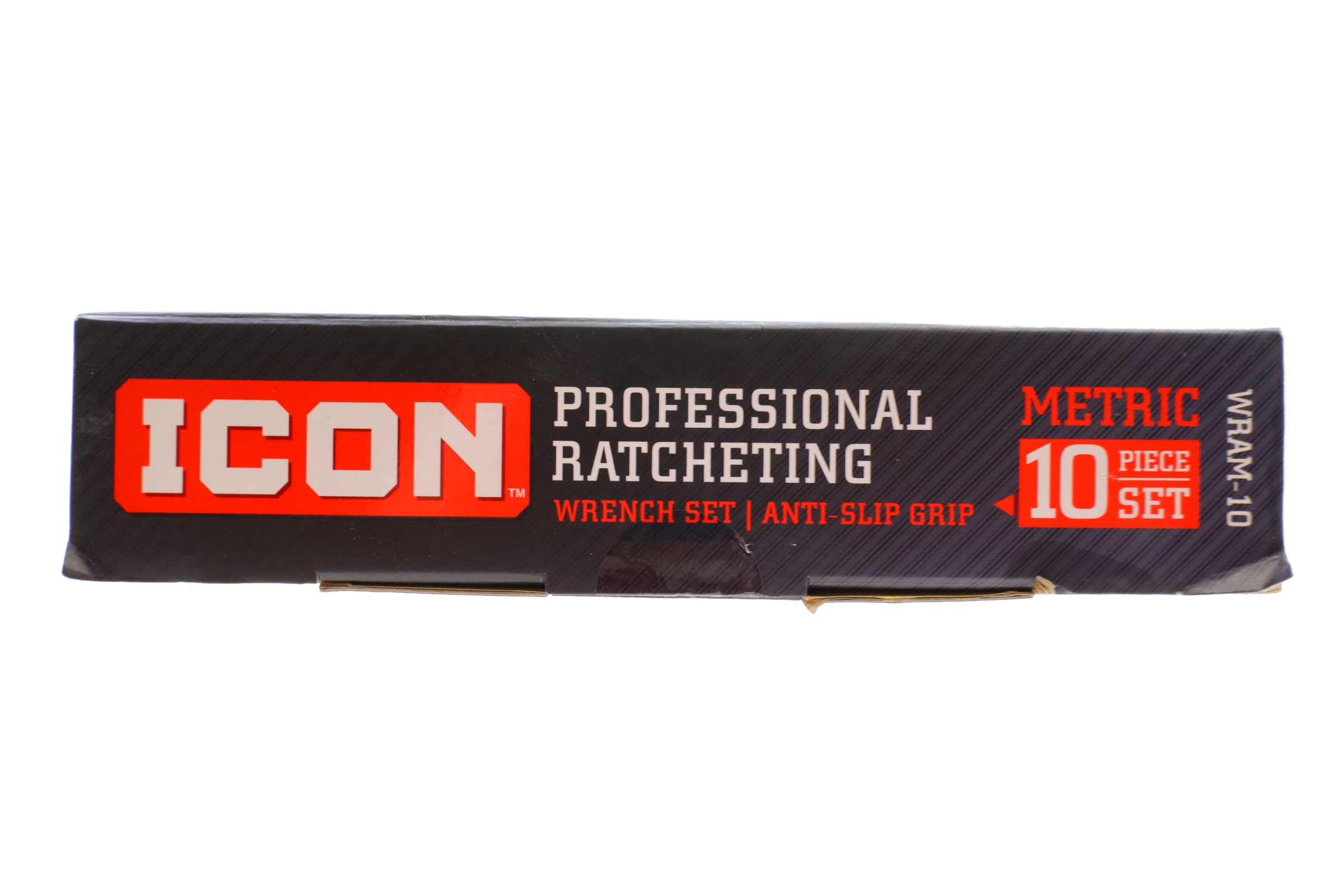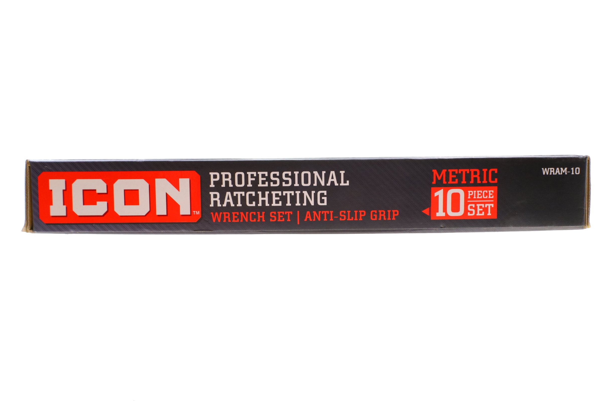 Elevate your toolset with the ICON WRAM-10 Professional Ratcheting Wrench Set. This 10-piece metric set features no-skip sizing and a 72 tooth reversible ratcheting mechanism for precision and efficiency. Crafted from durable chrome vanadium steel with a polished finish, it ensures a non-slip grip and comes with a premium storage tray for easy organization. Perfect for professional mechanics or DIY enthusiasts seeking reliability and performance.