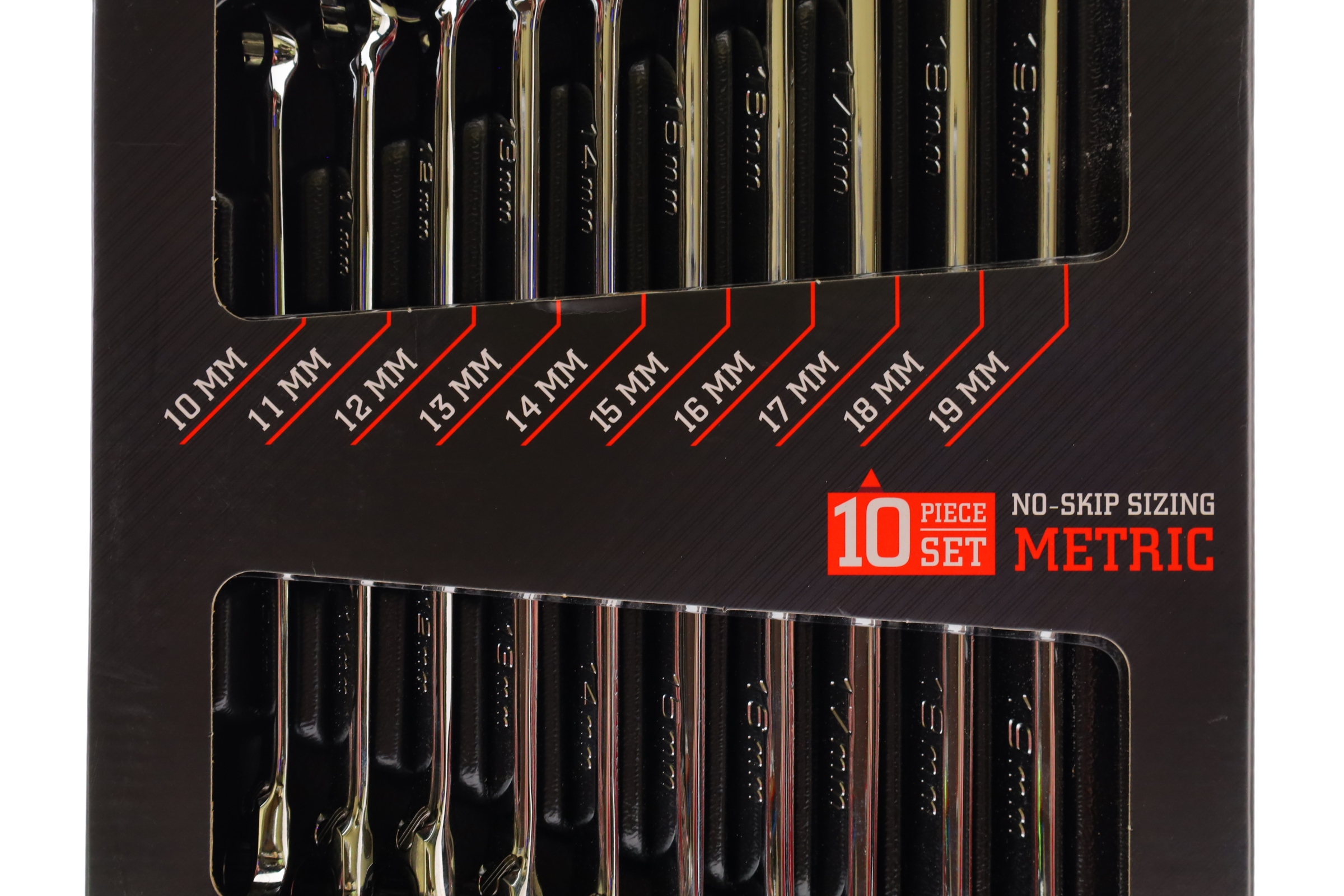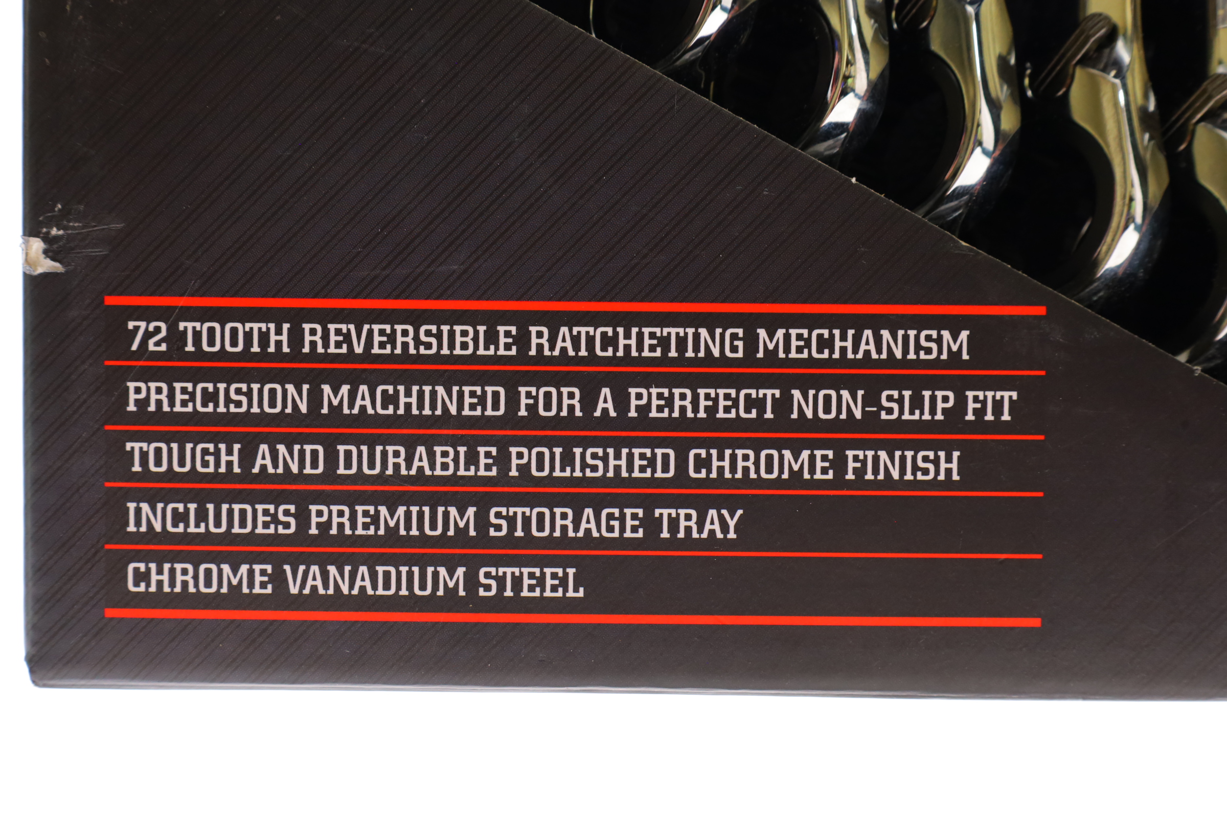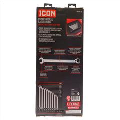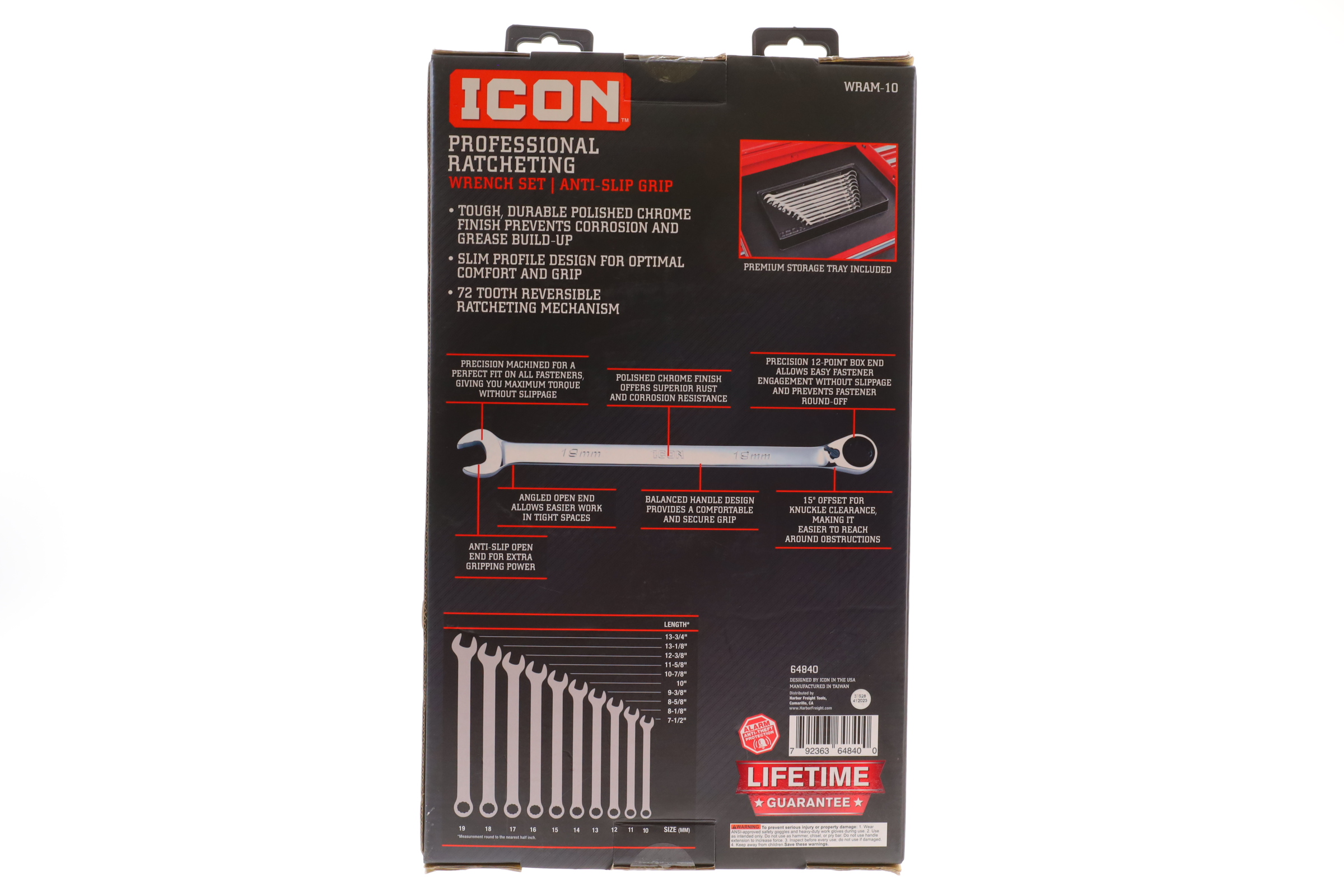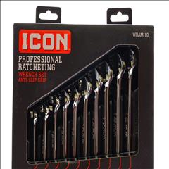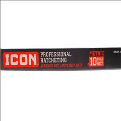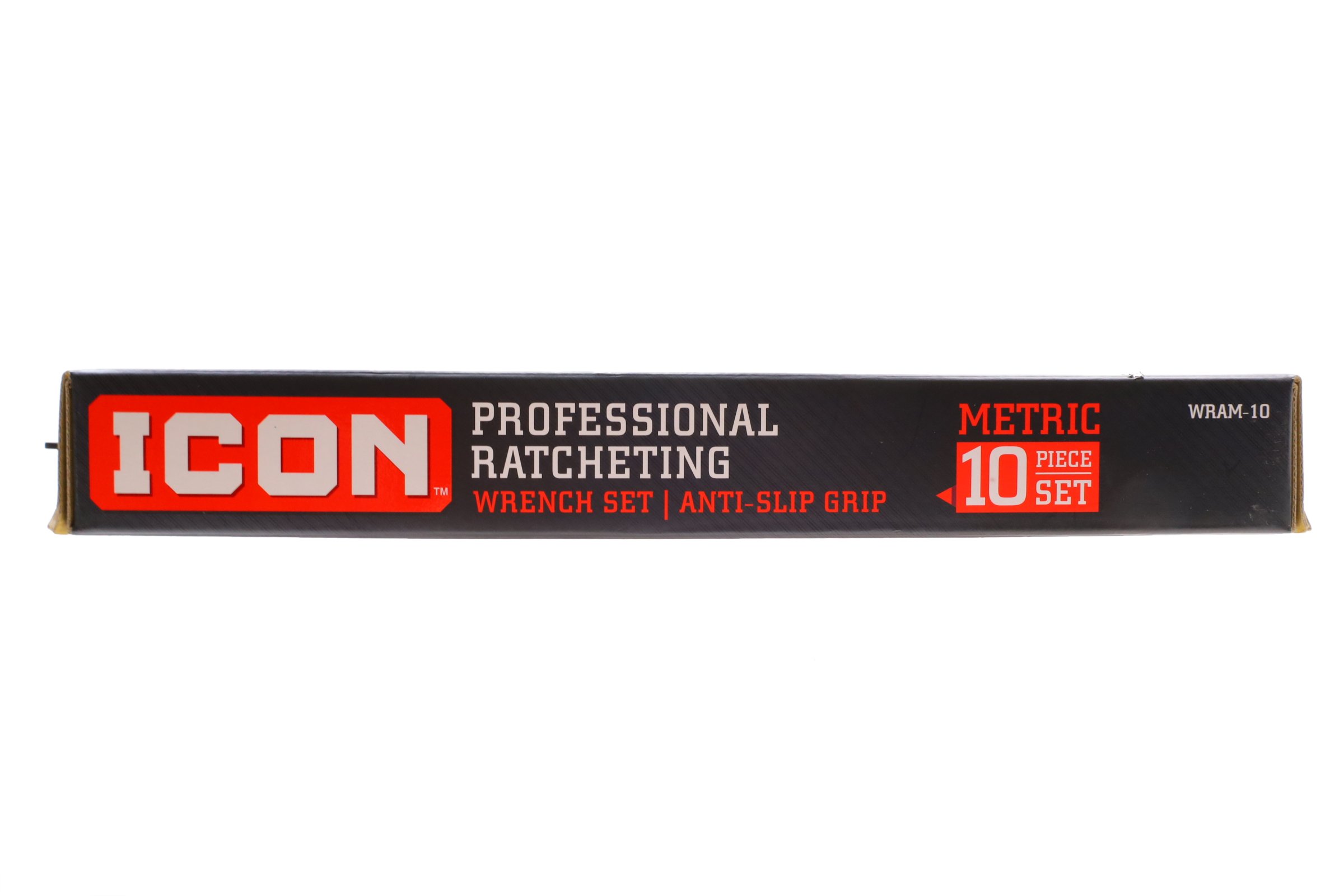 Elevate your toolset with the ICON WRAM-10 Professional Ratcheting Wrench Set. This 10-piece metric set features no-skip sizing and a 72 tooth reversible ratcheting mechanism for precision and efficiency. Crafted from durable chrome vanadium steel with a polished finish, it ensures a non-slip grip and comes with a premium storage tray for easy organization. Perfect for professional mechanics or DIY enthusiasts seeking reliability and performance.