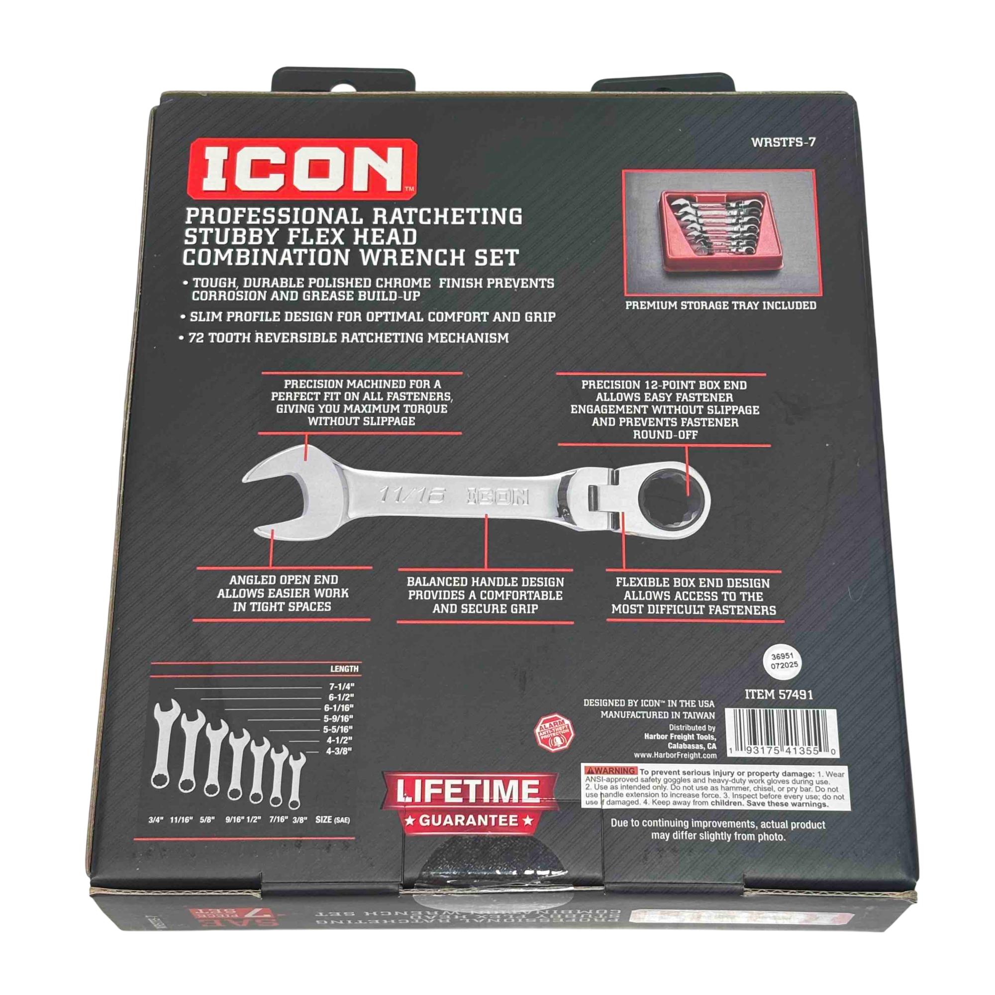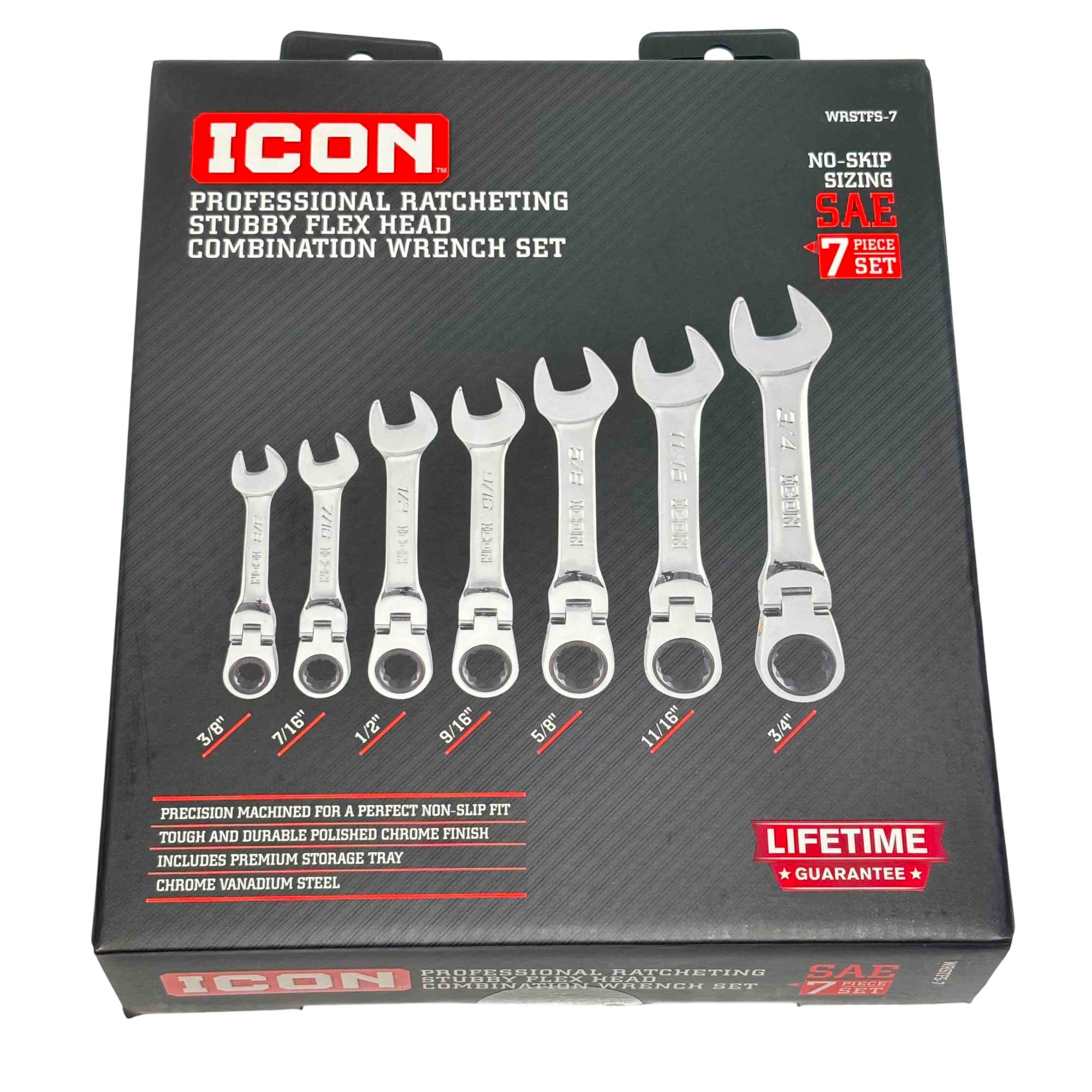 Upgrade your toolbox with the ICON WRSTFS-7 Professional Ratcheting Stubby Flex Head SAE Combination Wrench Set. This 7-piece set features a tough, corrosion-resistant polished chrome finish, a slim profile for optimal comfort and grip, and a 72-tooth reversible ratcheting mechanism for maximum efficiency. Designed for tight spaces, each wrench offers a precision-machined, non-slip fit and comes in a premium storage tray—ideal for automotive and home repair enthusiasts.