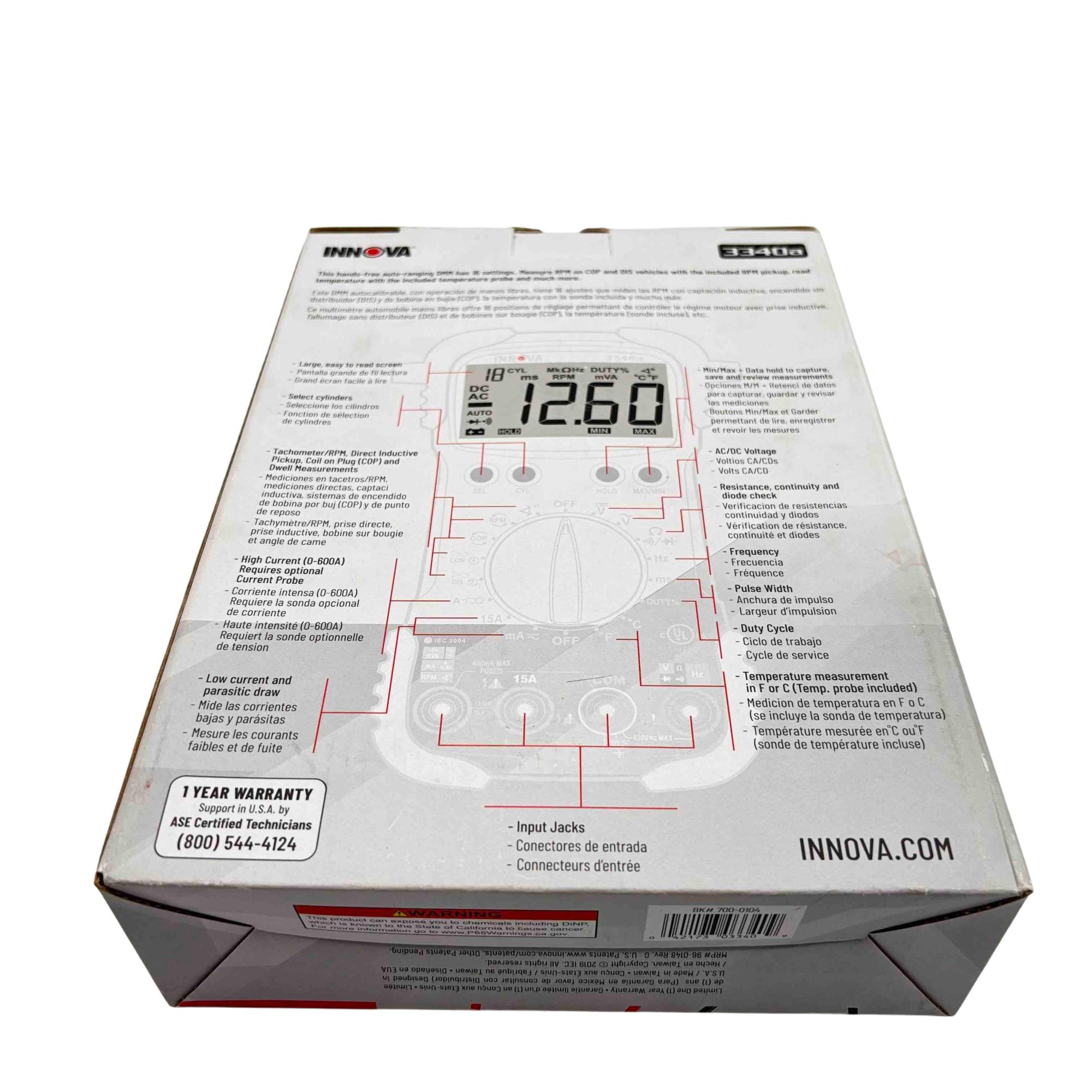 Discover precision and versatility with the INNOVA 3340a Automotive Digital Multimeter. Built for automotive professionals and enthusiasts, this tool features a large, easy-to-read display and a durable design, perfect for diagnosing electrical issues. With its high current capability and included temperature probe, this multimeter is essential for accurate testing and troubleshooting.