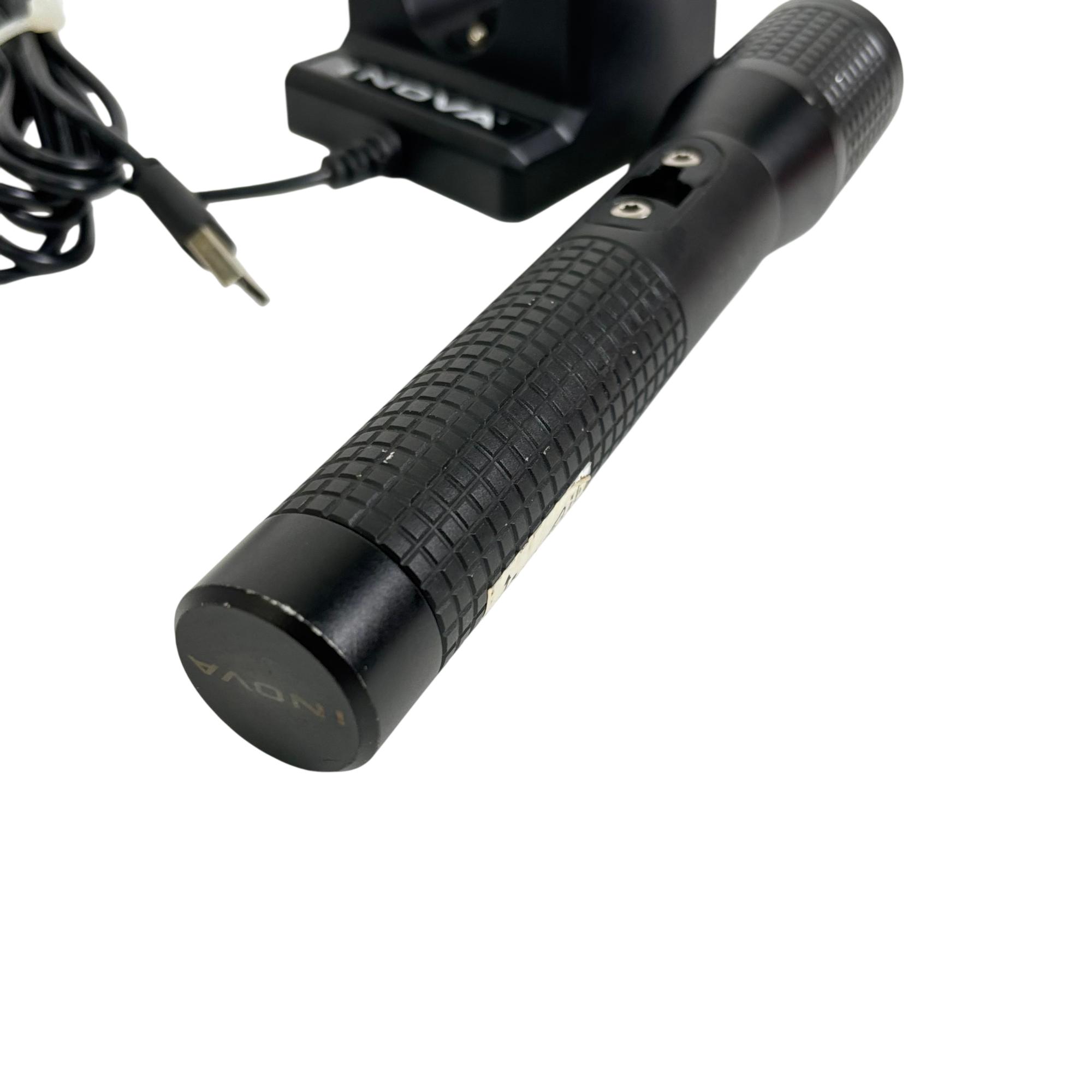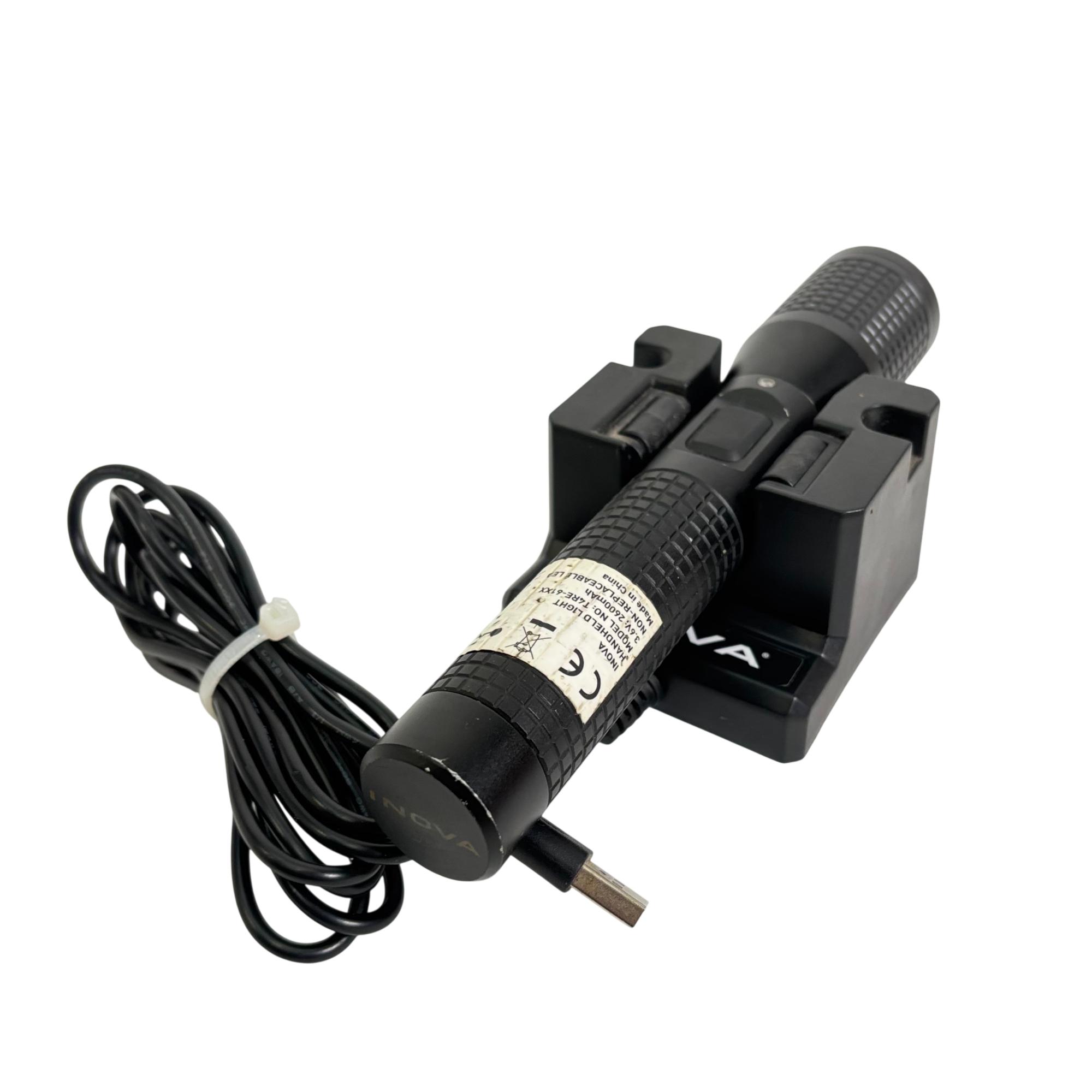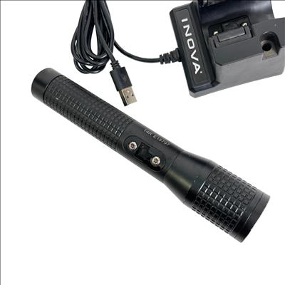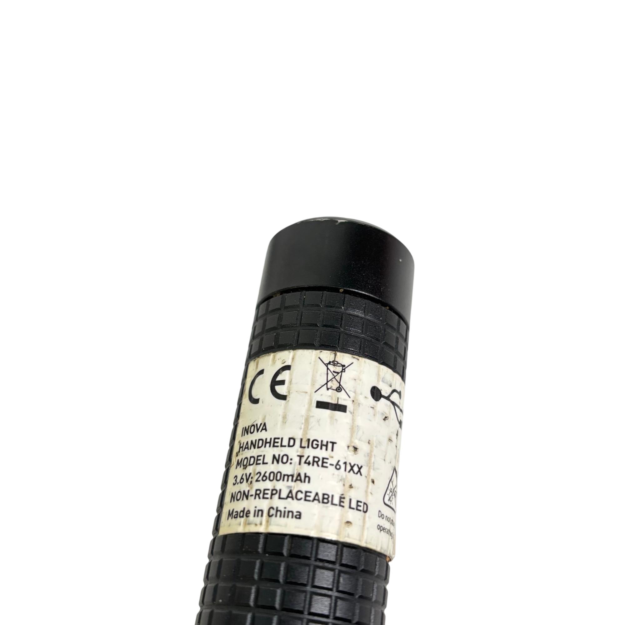 INOVA T4R Rechargeable LED Flashlight Model T4RE61XX features a durable black design with a convenient cap and a sturdy cord for secure handling. This flashlight utilizes a rechargeable lithium-ion battery to deliver reliable, high-performance LED lighting, making it ideal for various tasks requiring a powerful and portable light source.