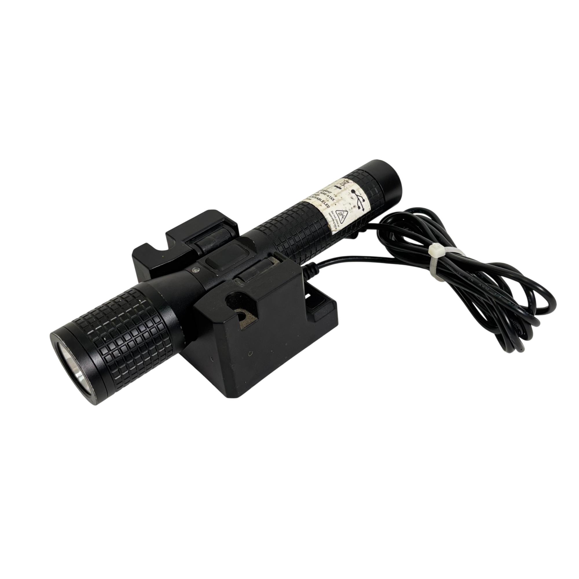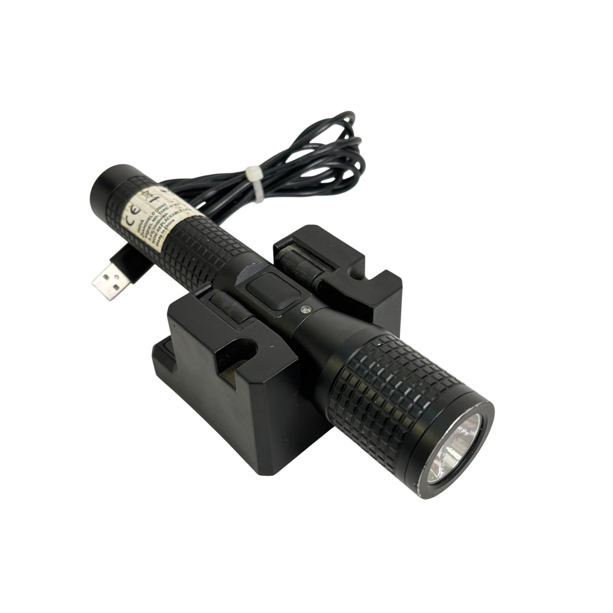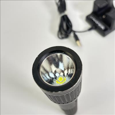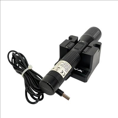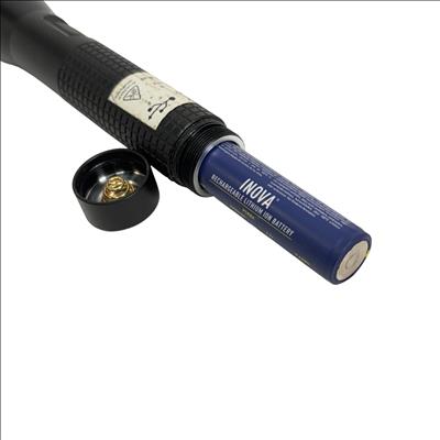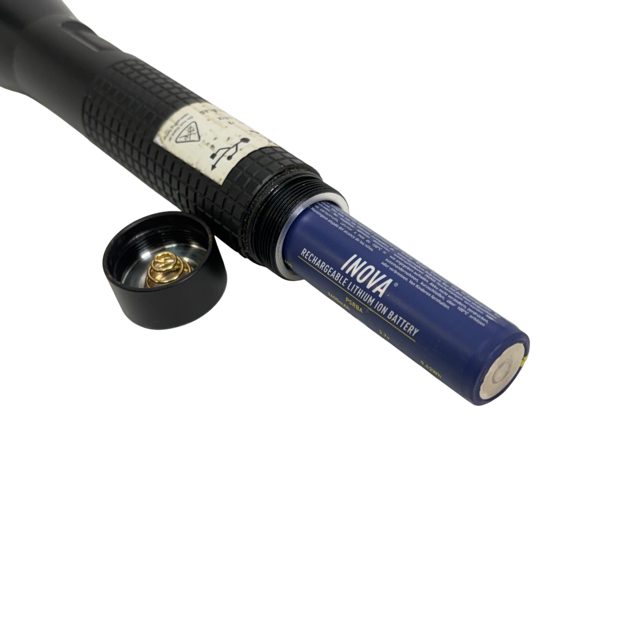 INOVA T4R Rechargeable LED Flashlight Model T4RE61XX features a durable black design with a convenient cap and a sturdy cord for secure handling. This flashlight utilizes a rechargeable lithium-ion battery to deliver reliable, high-performance LED lighting, making it ideal for various tasks requiring a powerful and portable light source.