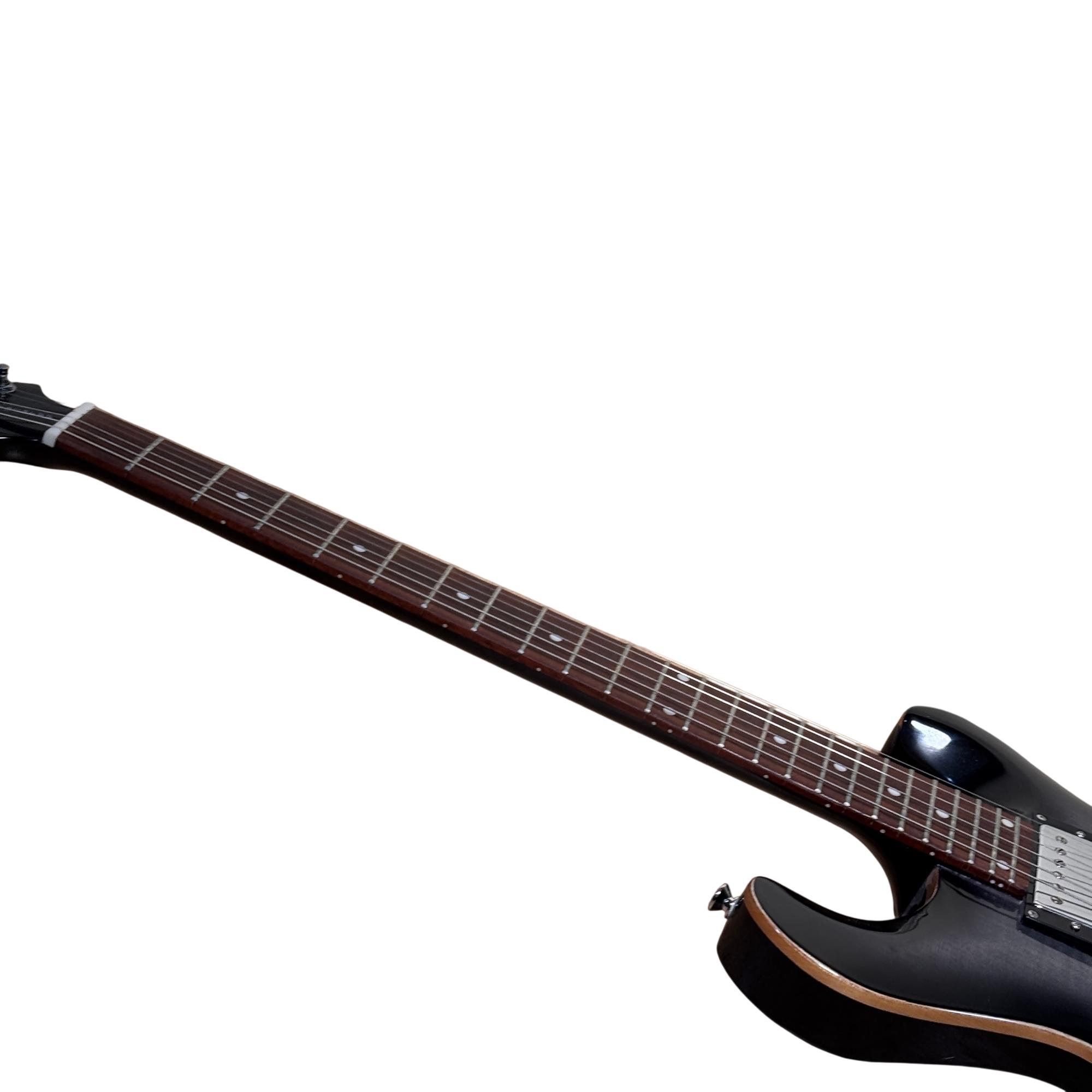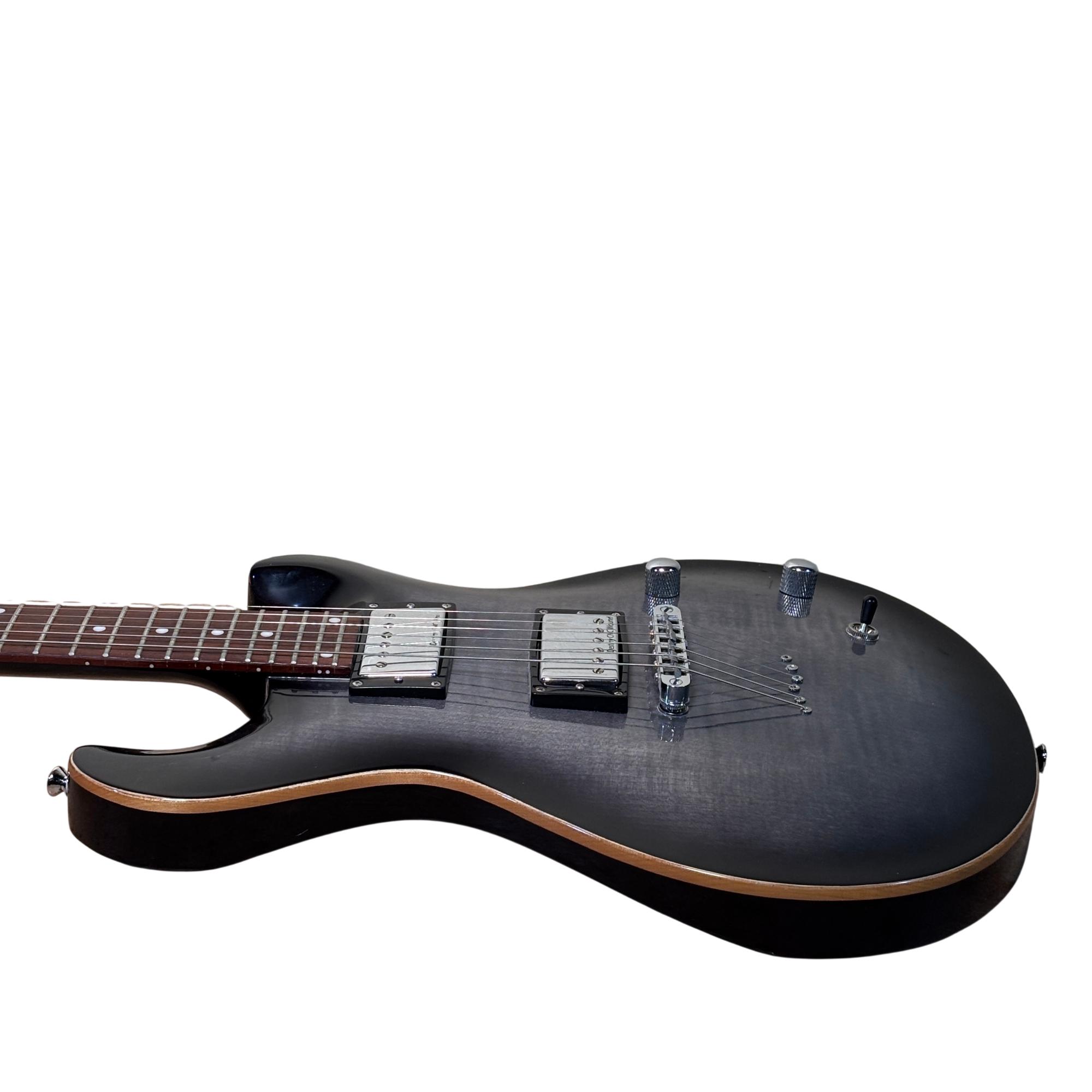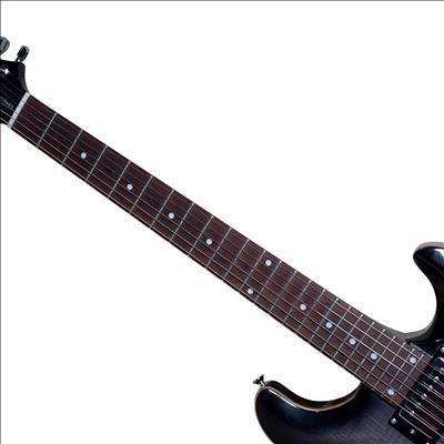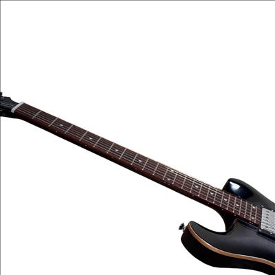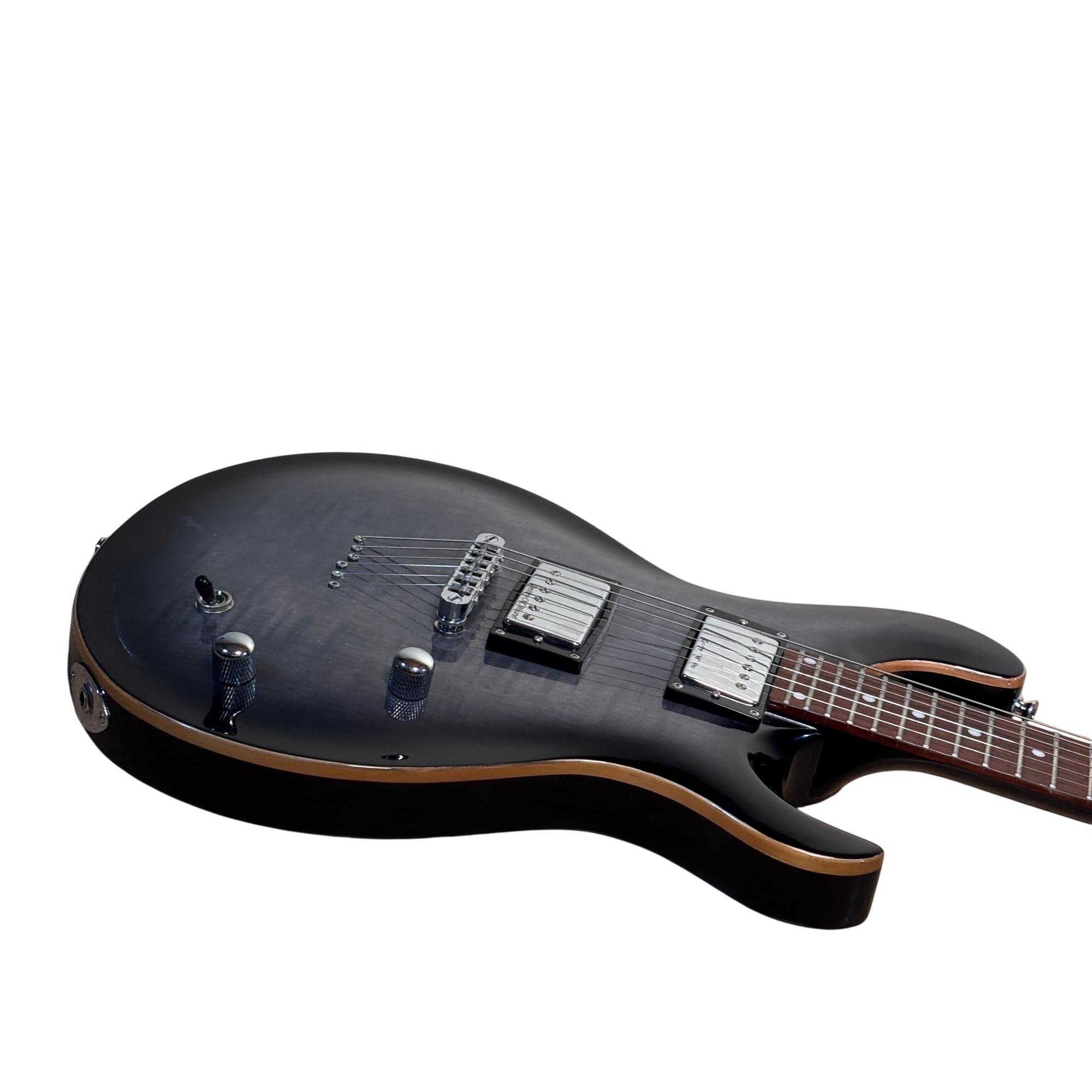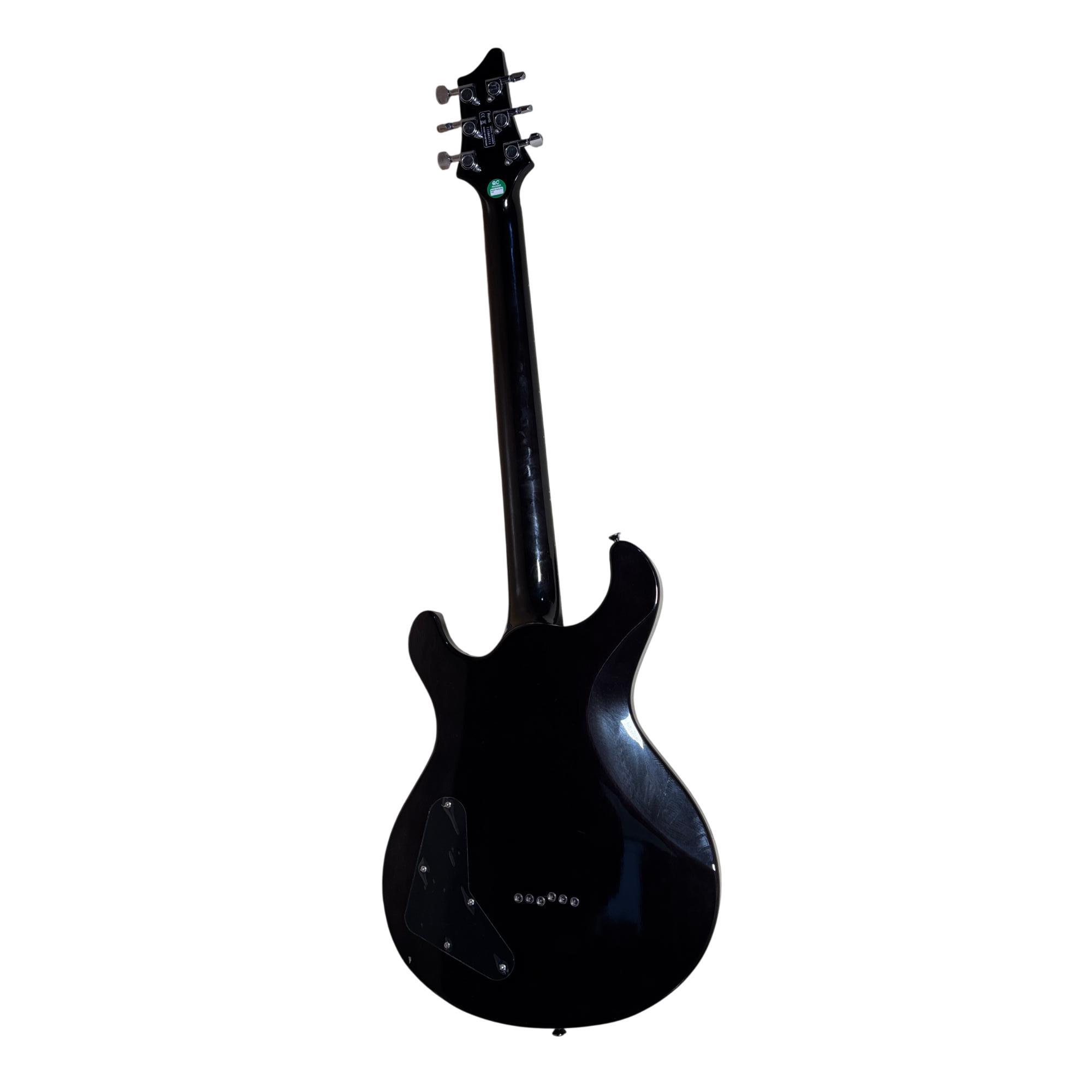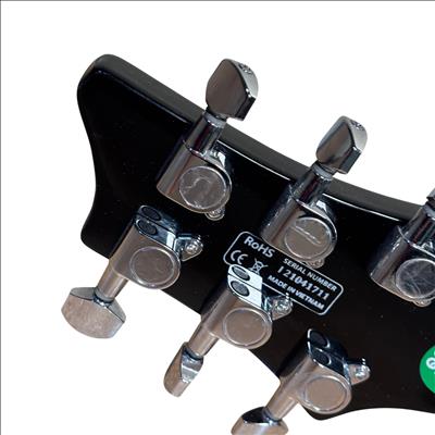 IYV 6 String IP-350 TBK PRS Solid-Body Electric Guitar, Trans Black features a sleek black finish with white dot inlays on the fretboard, combining classic design with modern playability. This solid-body electric guitar offers a smooth neck and precise string action, making it suitable for a variety of musical styles and performance settings.