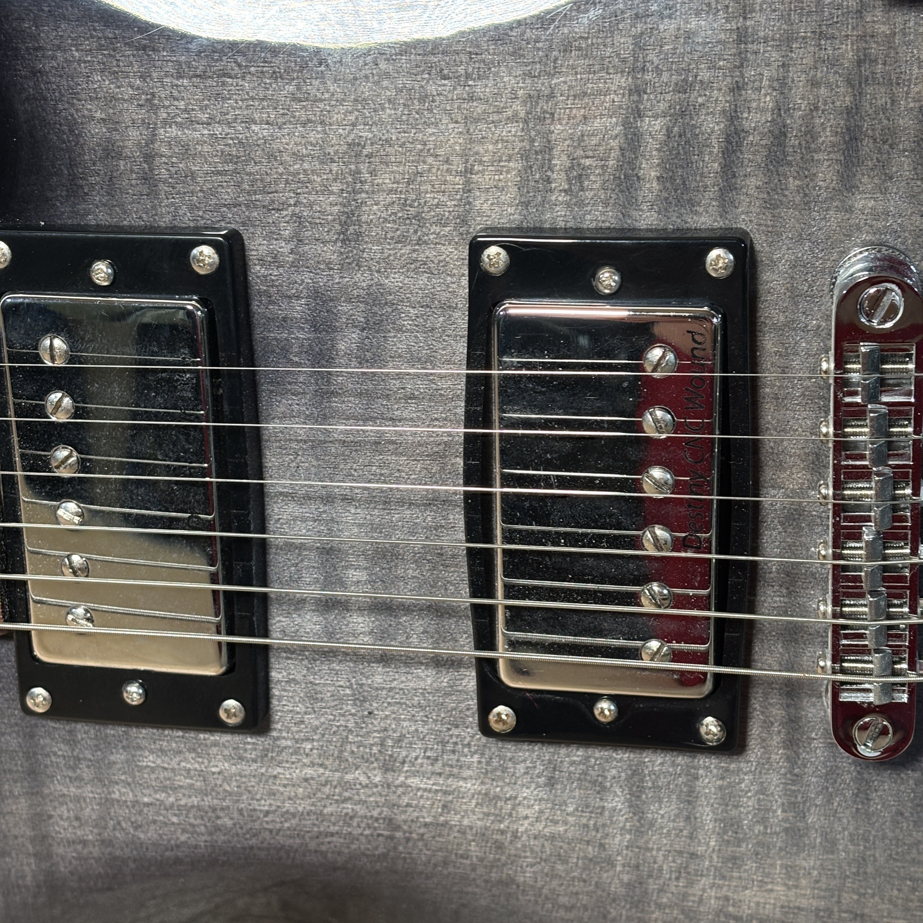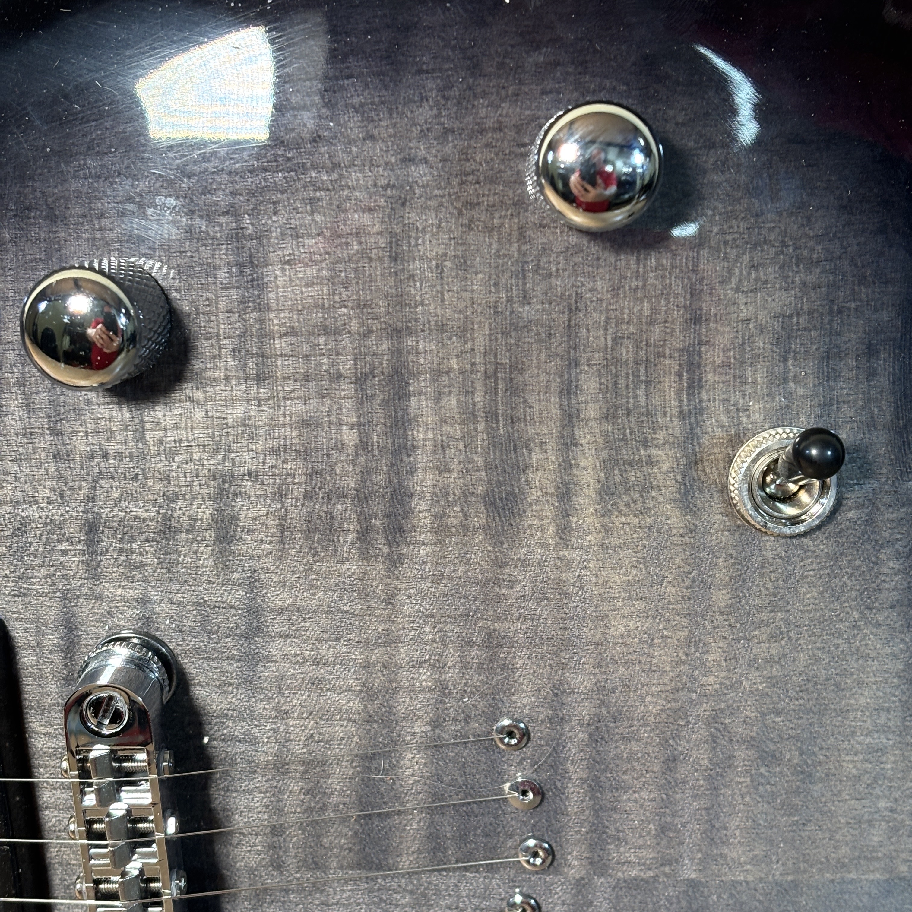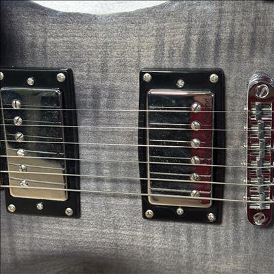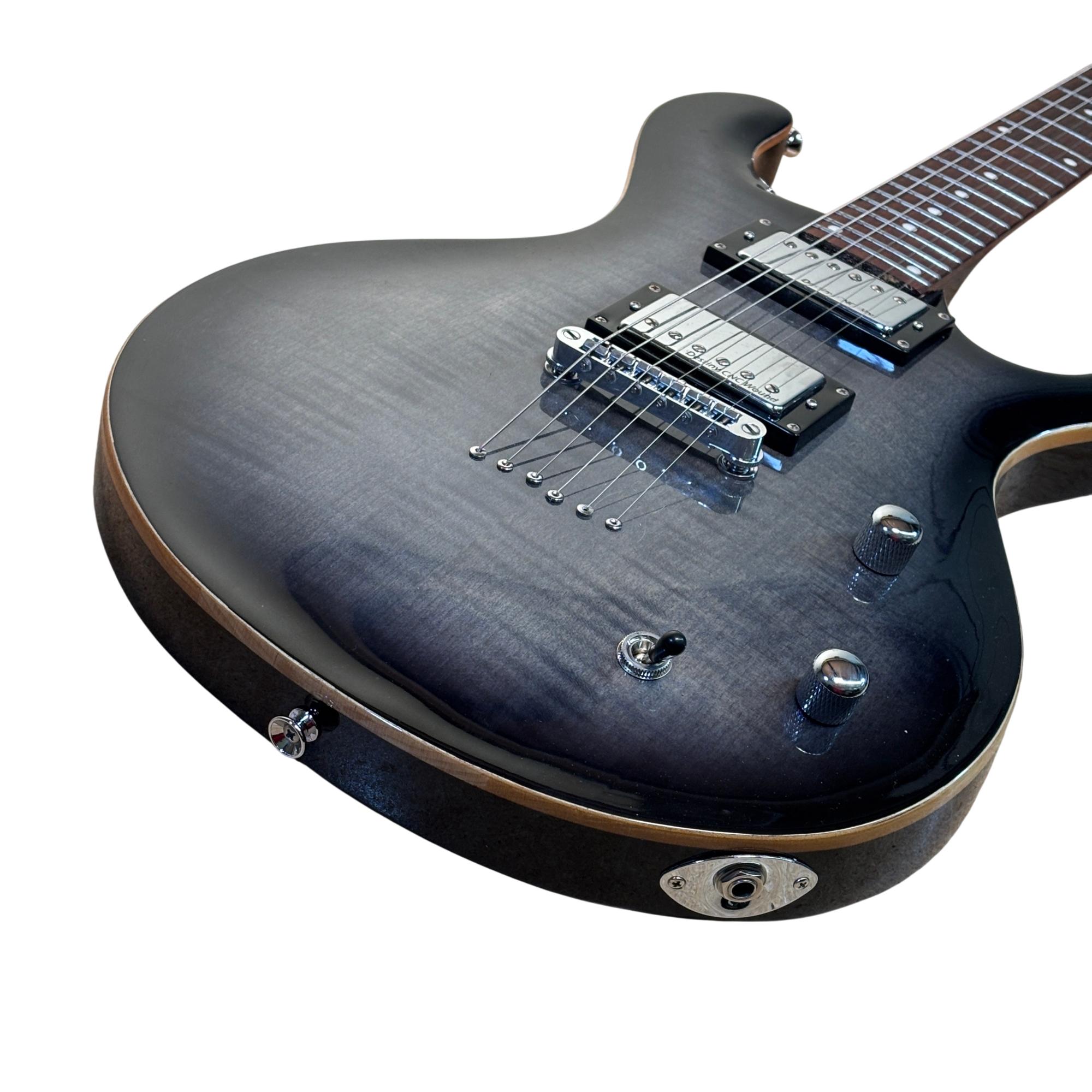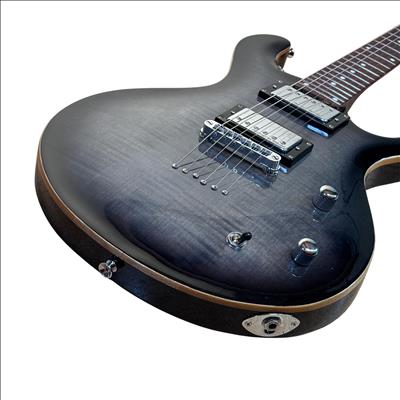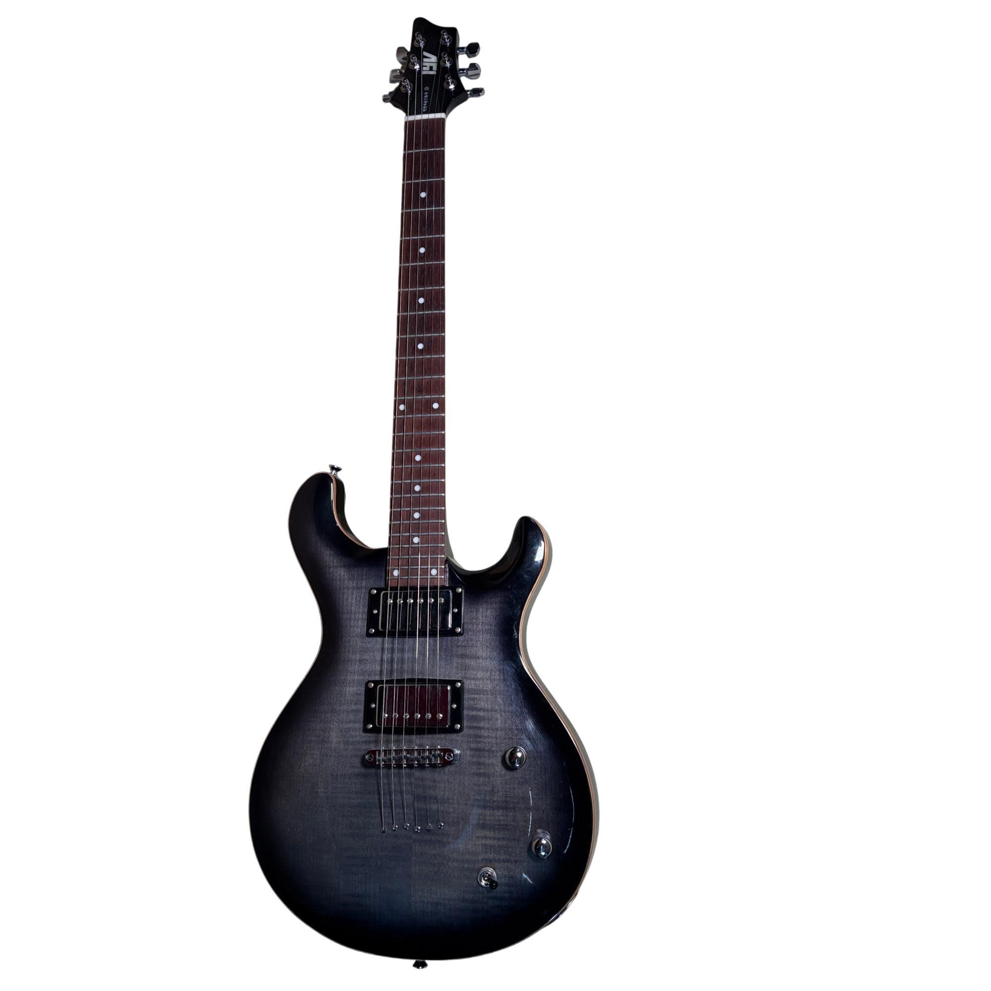 IYV 6 String IP-350 TBK PRS Solid-Body Electric Guitar, Trans Black features a sleek black finish with white dot inlays on the fretboard, combining classic design with modern playability. This solid-body electric guitar offers a smooth neck and precise string action, making it suitable for a variety of musical styles and performance settings.