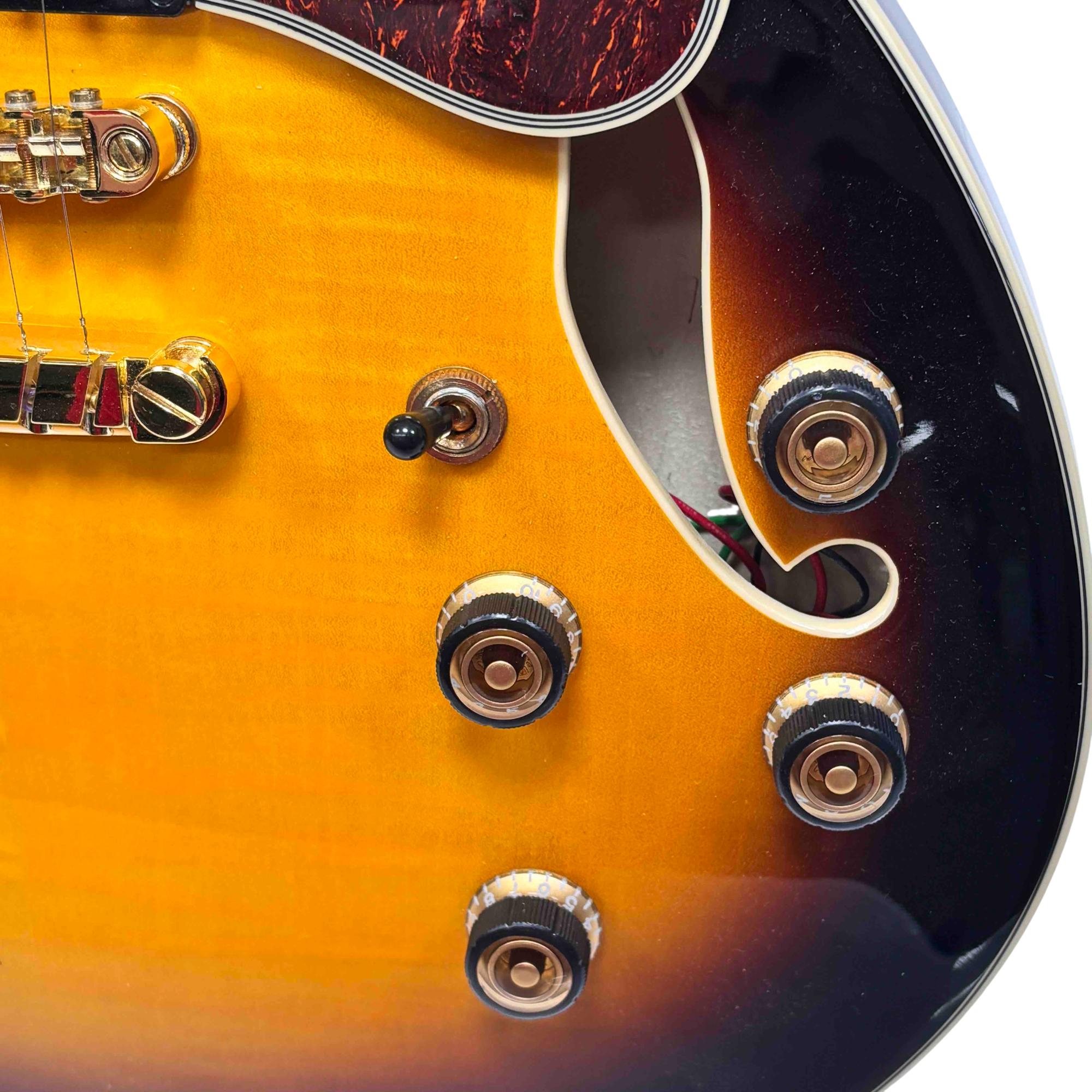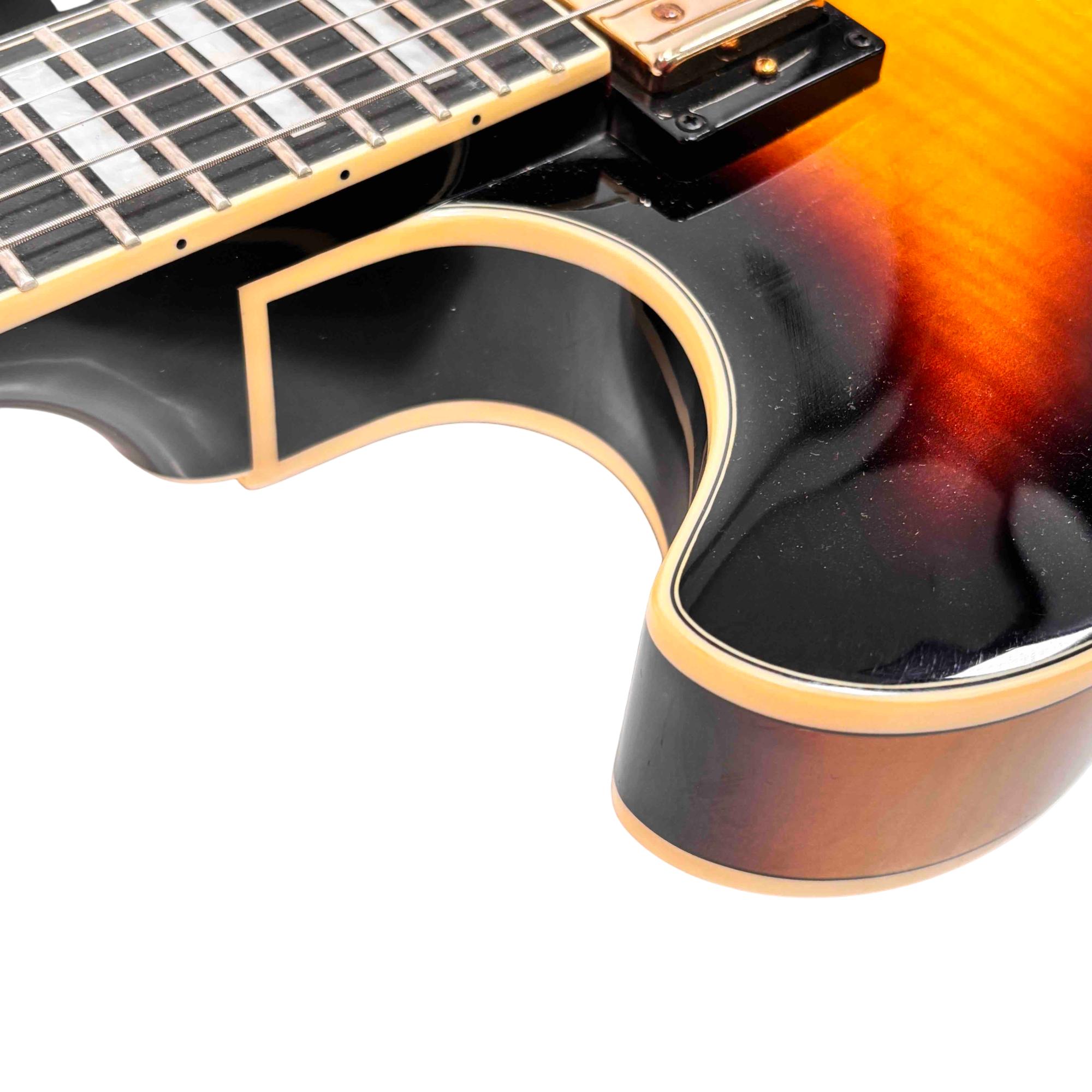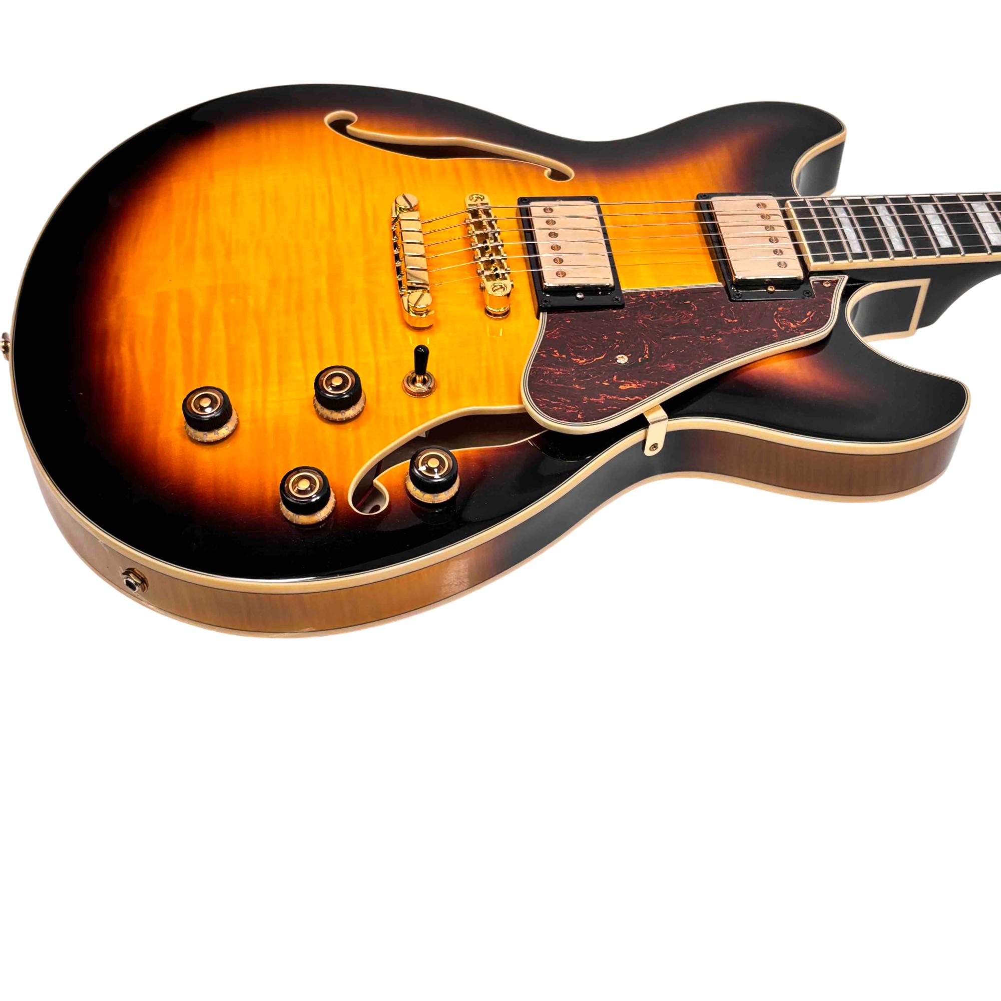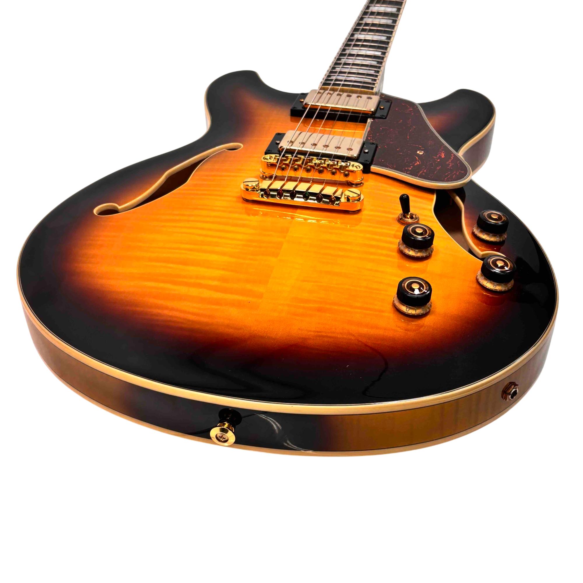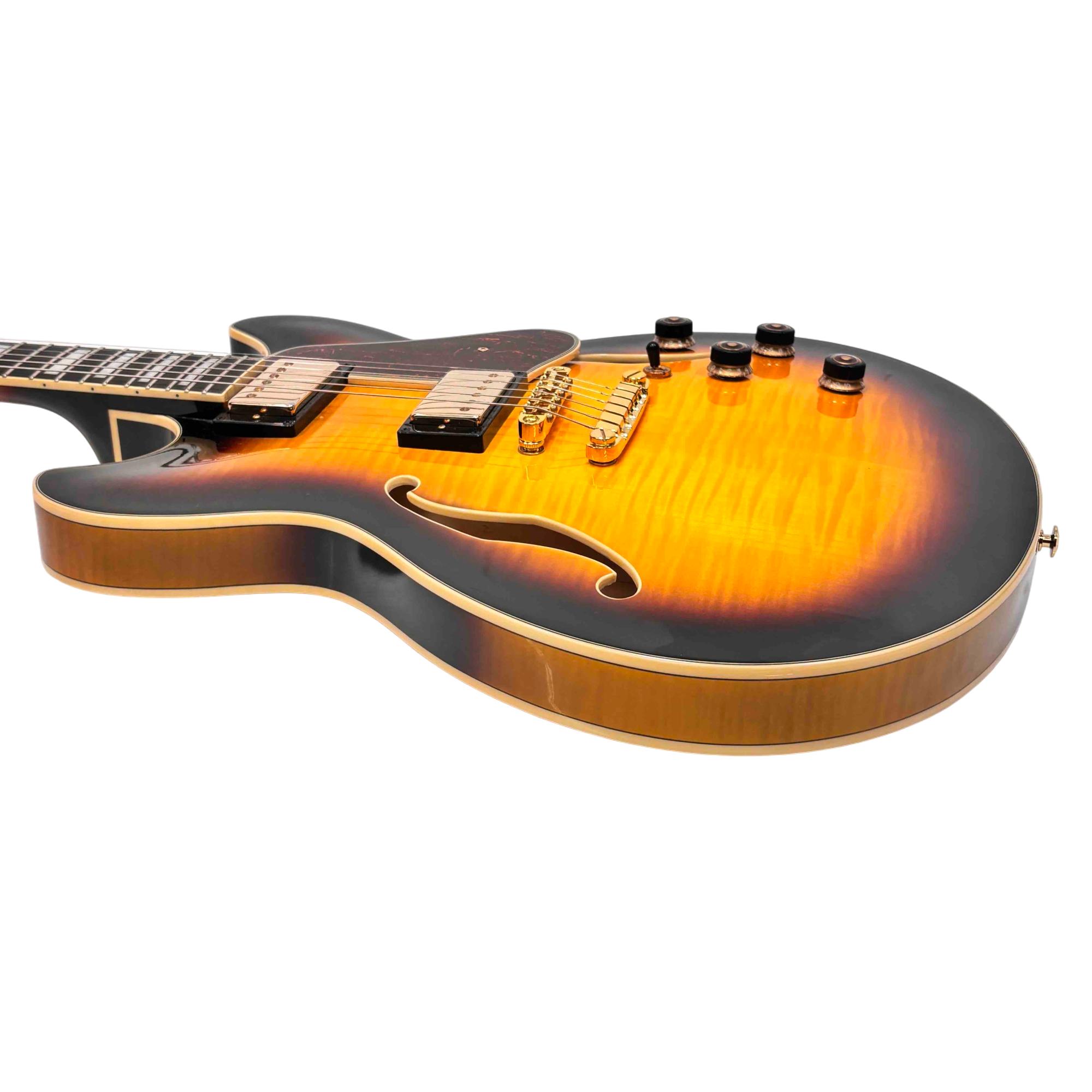 Featuring a gorgeous flamed maple top, classic Yellow Sunburst finish, and gold hardware, this instrument delivers rich, versatile tones for jazz, blues, and rock. Experience premium playability and stellar craftsmanship, making it ideal for both discerning hobbyists and gigging musicians.