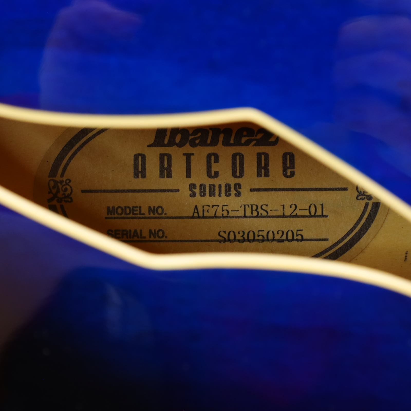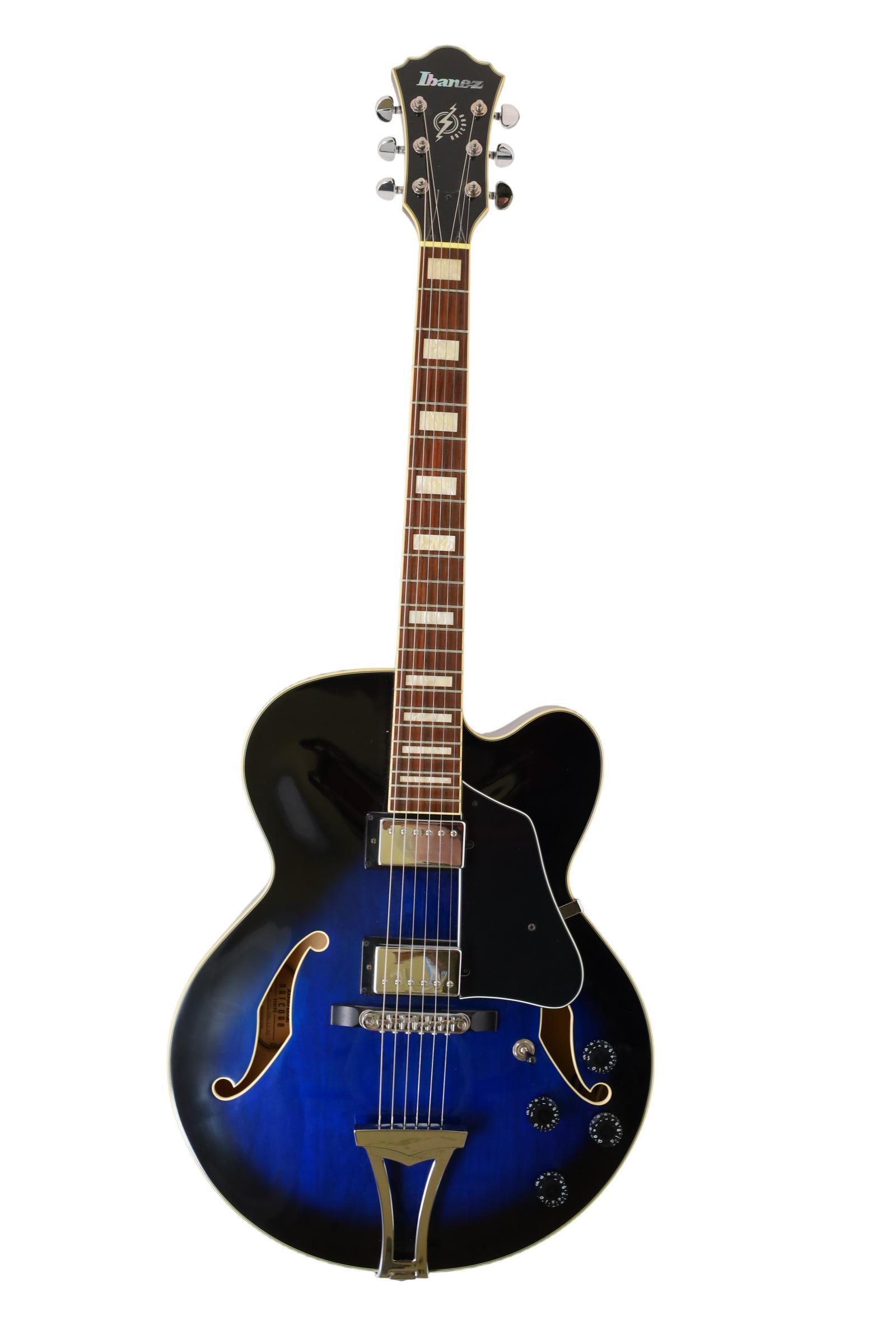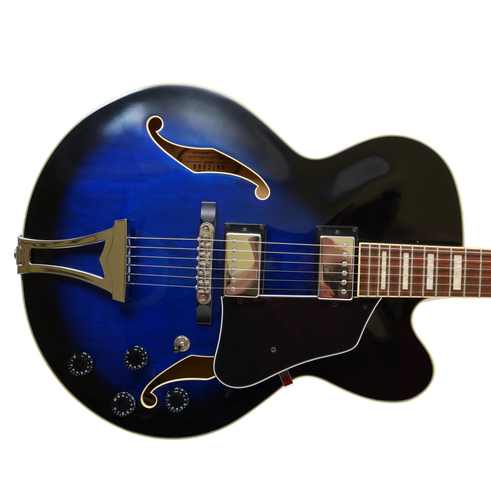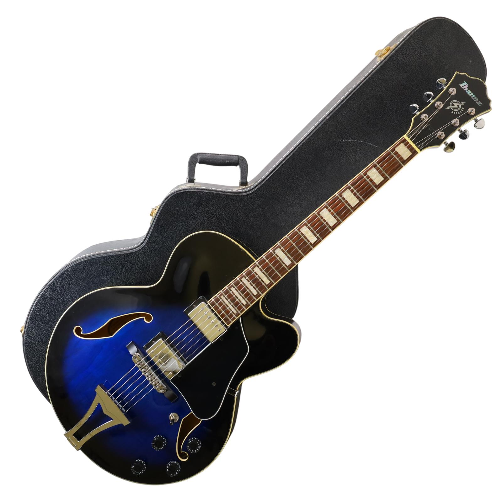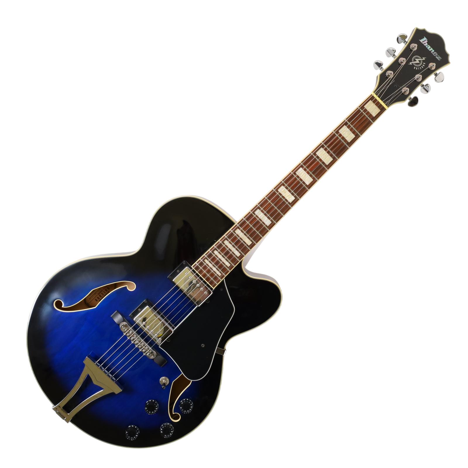 A full hollow body 6-string electric guitar in Blue Burst, manufactured in 2003. It features a laminated maple top, back, and sides with a gloss finish and ivory multi-ply binding. The neck is a set-in, one-piece mahogany design with a rosewood fingerboard adorned with pearl block inlays. It has 22 large nickel silver frets, a 628mm (24¾") scale length, and an ivory plastic nut measuring 43mm. The bridge is an ART-1 mounted on a wooden base, paired with a VT50 tailpiece. Chrome hardware includes Ibanez die-cast tuners with half-moon buttons, speed-style black knobs, and a 3-ply black/white/black pickguard. The guitar is equipped with Ibanez Artcore Humbucker pickups (model 1 at the neck and model 2 at the bridge) in a humbucker-humbucker configuration, with individual volume and tone controls for each pickup and a 3-way toggle selector. The output jack is mono and side mounted.