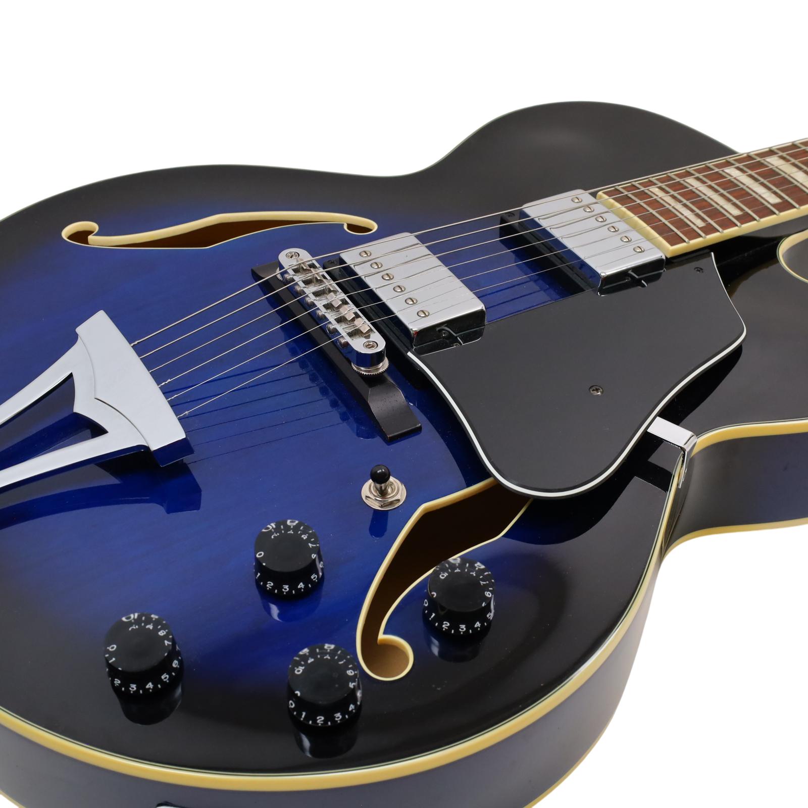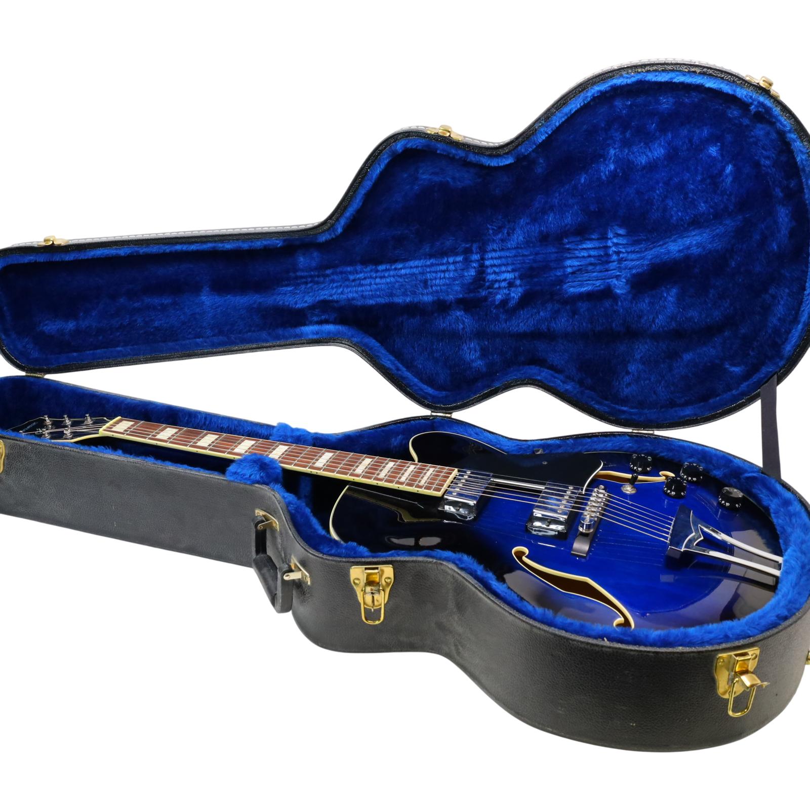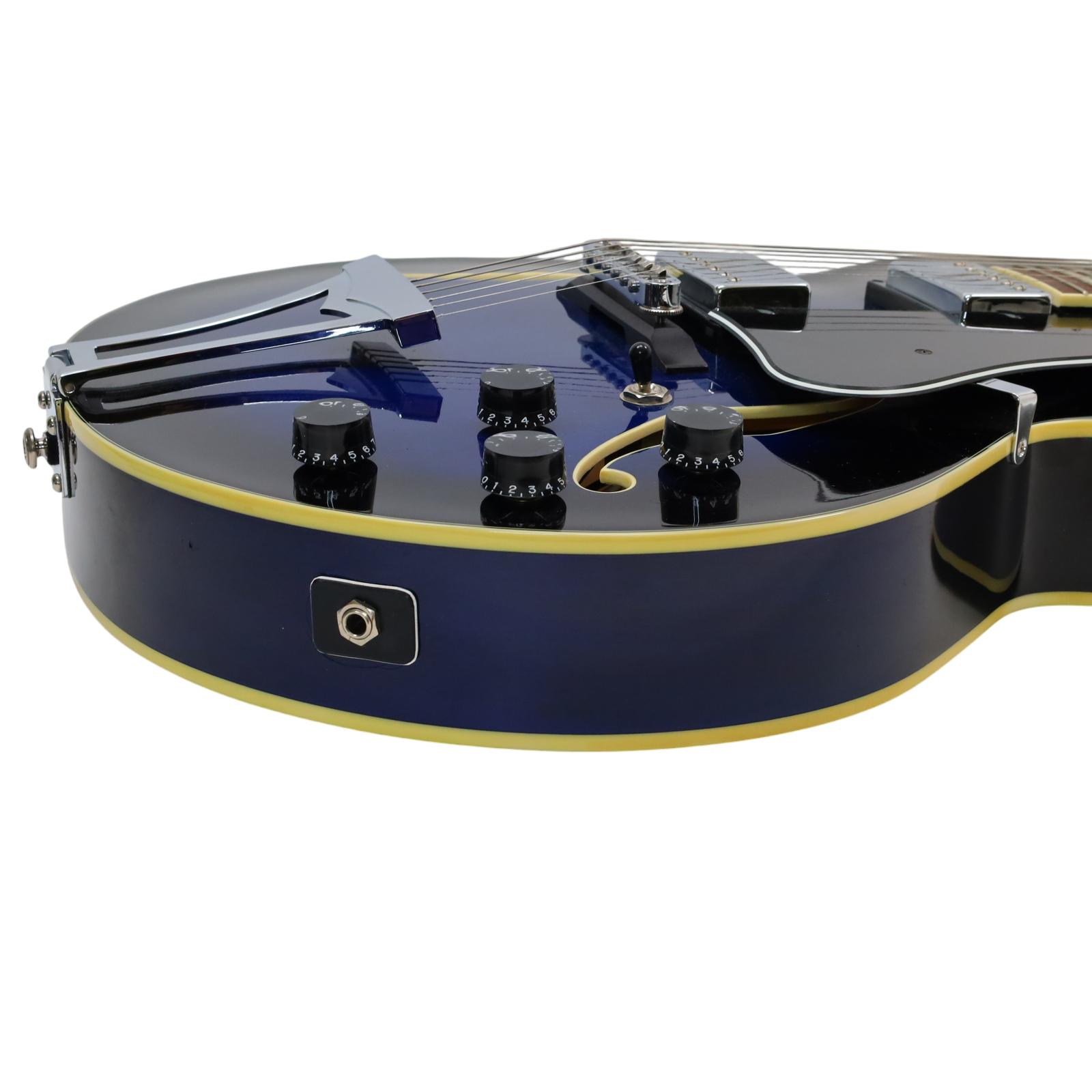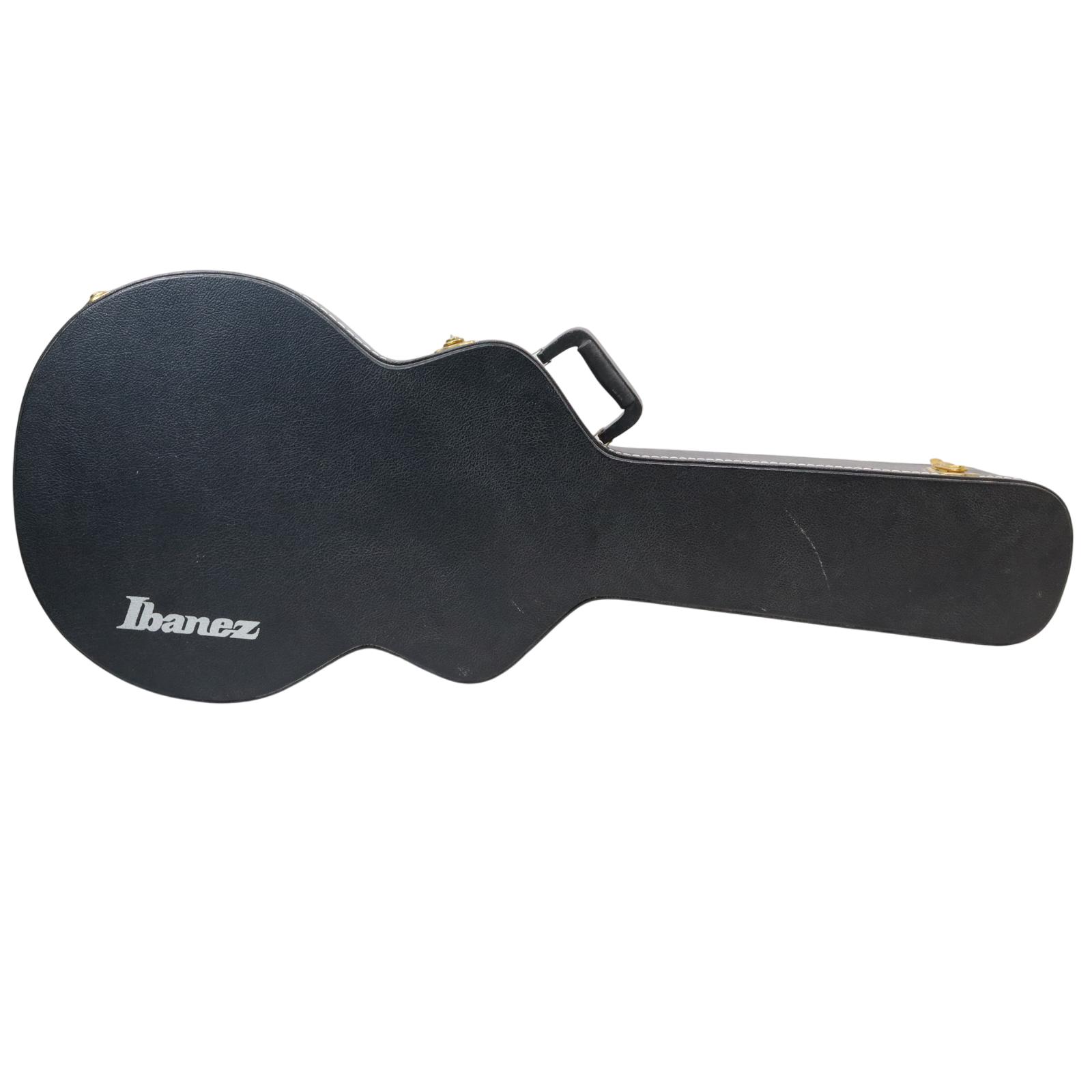 A full hollow body 6-string electric guitar in Blue Burst, manufactured in 2003. It features a laminated maple top, back, and sides with a gloss finish and ivory multi-ply binding. The neck is a set-in, one-piece mahogany design with a rosewood fingerboard adorned with pearl block inlays. It has 22 large nickel silver frets, a 628mm (24¾") scale length, and an ivory plastic nut measuring 43mm. The bridge is an ART-1 mounted on a wooden base, paired with a VT50 tailpiece. Chrome hardware includes Ibanez die-cast tuners with half-moon buttons, speed-style black knobs, and a 3-ply black/white/black pickguard. The guitar is equipped with Ibanez Artcore Humbucker pickups (model 1 at the neck and model 2 at the bridge) in a humbucker-humbucker configuration, with individual volume and tone controls for each pickup and a 3-way toggle selector. The output jack is mono and side mounted.