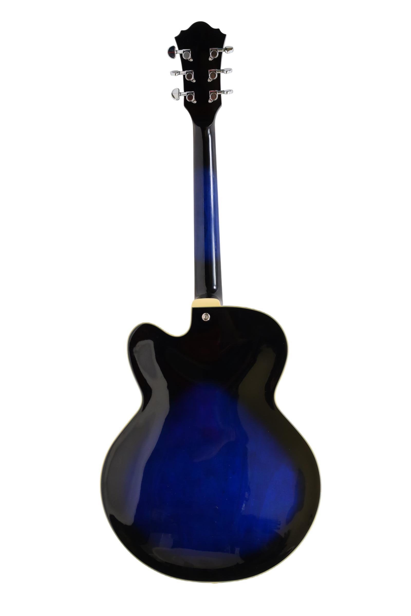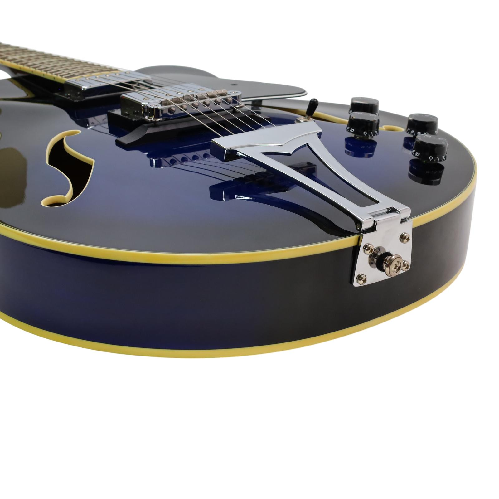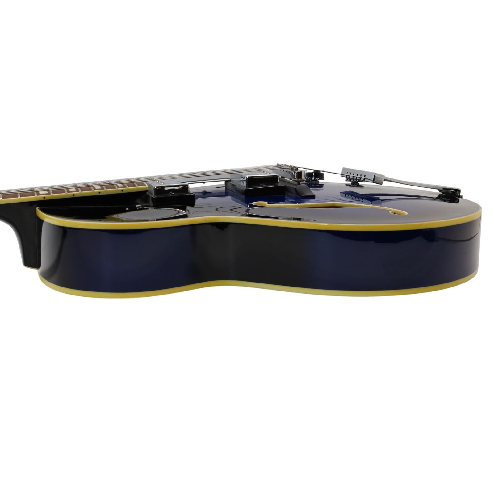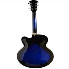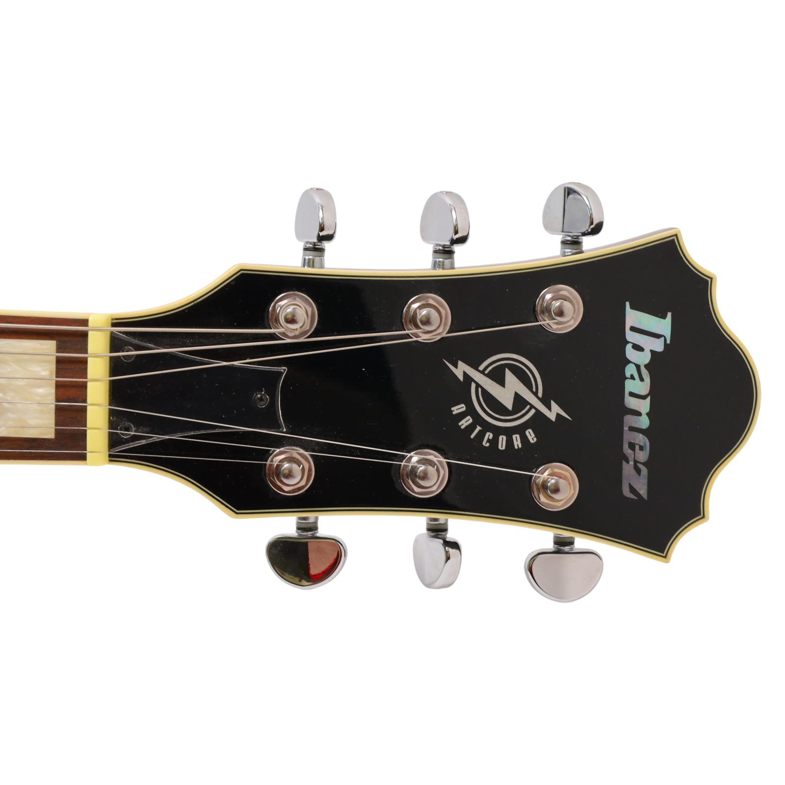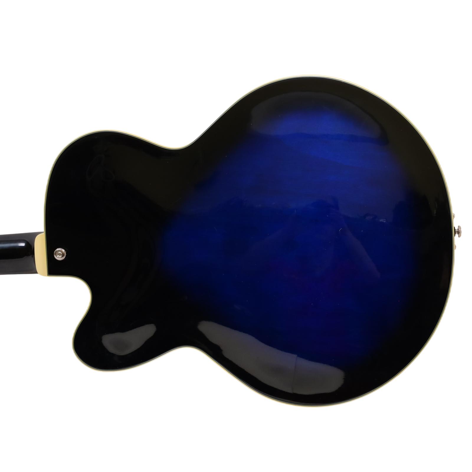A full hollow body 6-string electric guitar in Blue Burst, manufactured in 2003. It features a laminated maple top, back, and sides with a gloss finish and ivory multi-ply binding. The neck is a set-in, one-piece mahogany design with a rosewood fingerboard adorned with pearl block inlays. It has 22 large nickel silver frets, a 628mm (24¾") scale length, and an ivory plastic nut measuring 43mm. The bridge is an ART-1 mounted on a wooden base, paired with a VT50 tailpiece. Chrome hardware includes Ibanez die-cast tuners with half-moon buttons, speed-style black knobs, and a 3-ply black/white/black pickguard. The guitar is equipped with Ibanez Artcore Humbucker pickups (model 1 at the neck and model 2 at the bridge) in a humbucker-humbucker configuration, with individual volume and tone controls for each pickup and a 3-way toggle selector. The output jack is mono and side mounted.