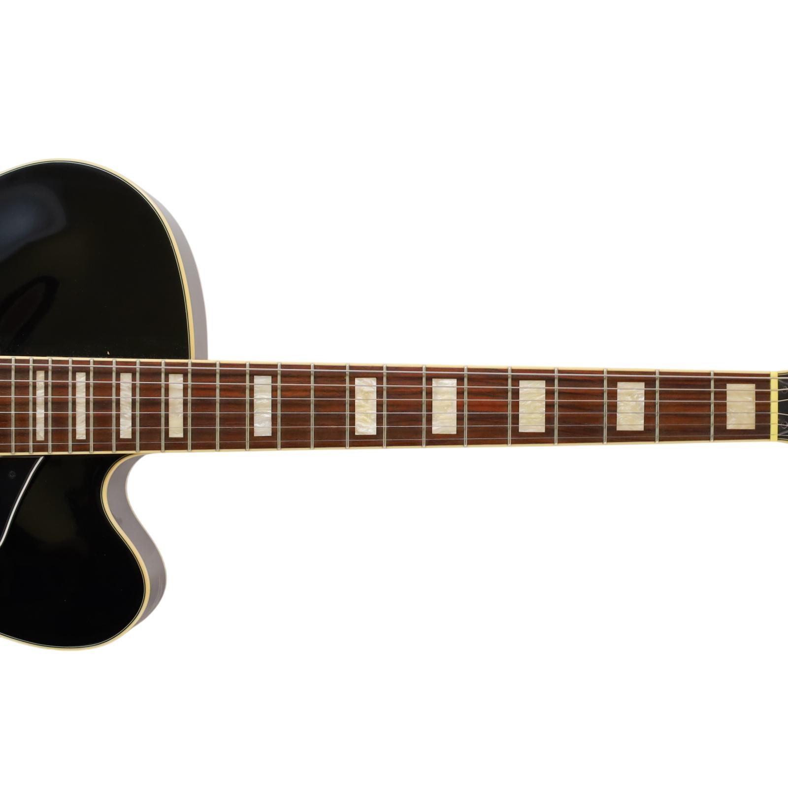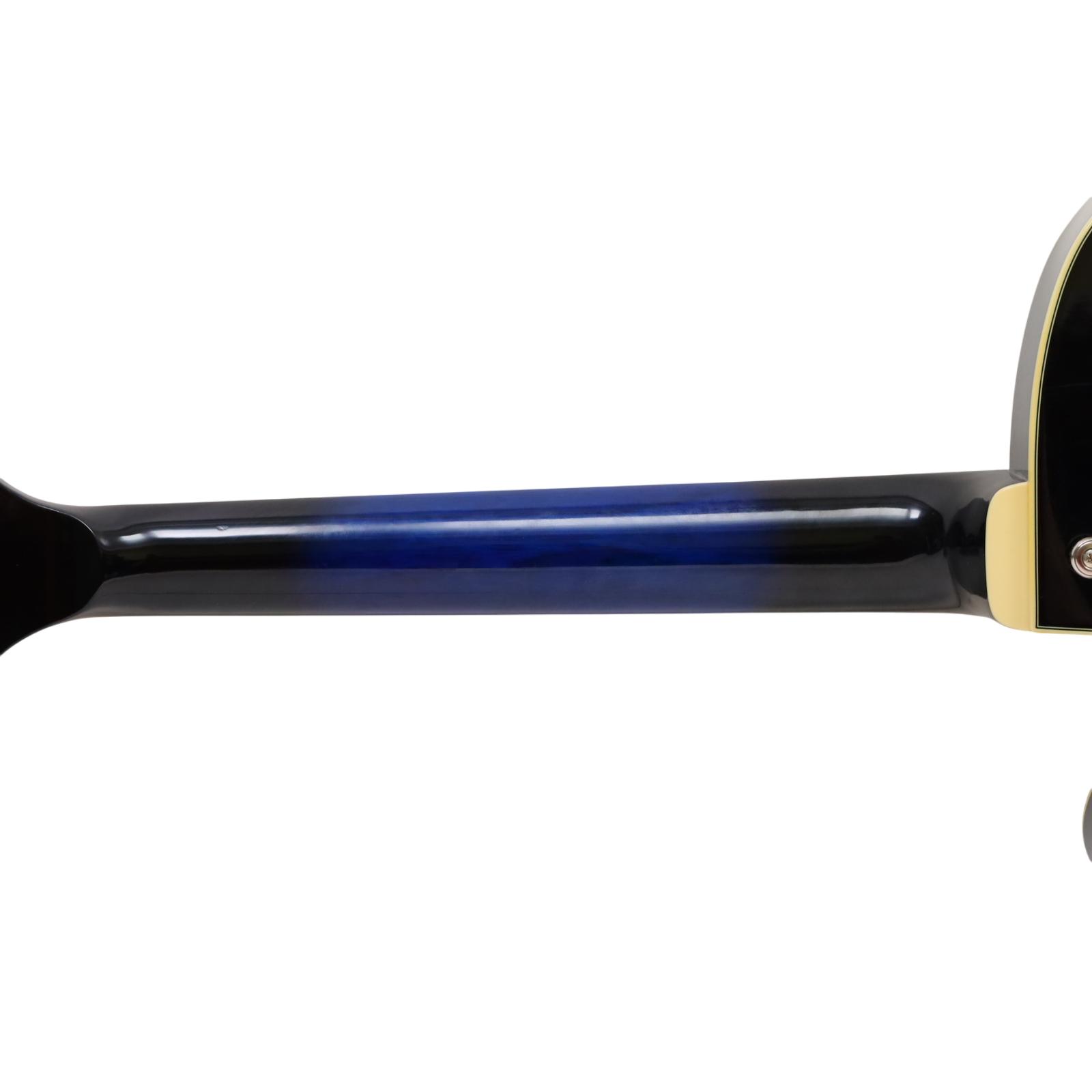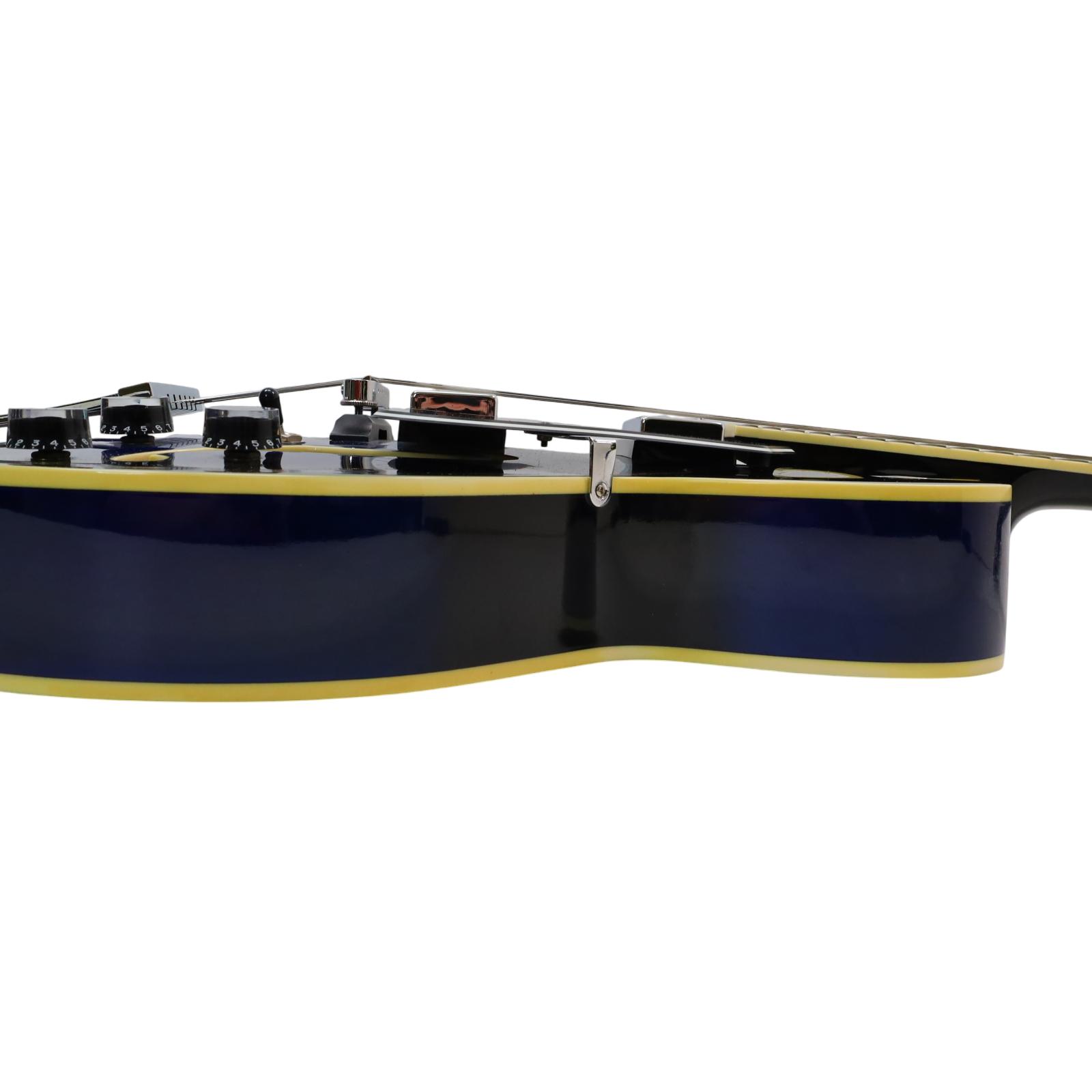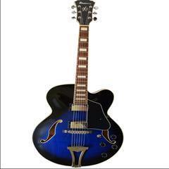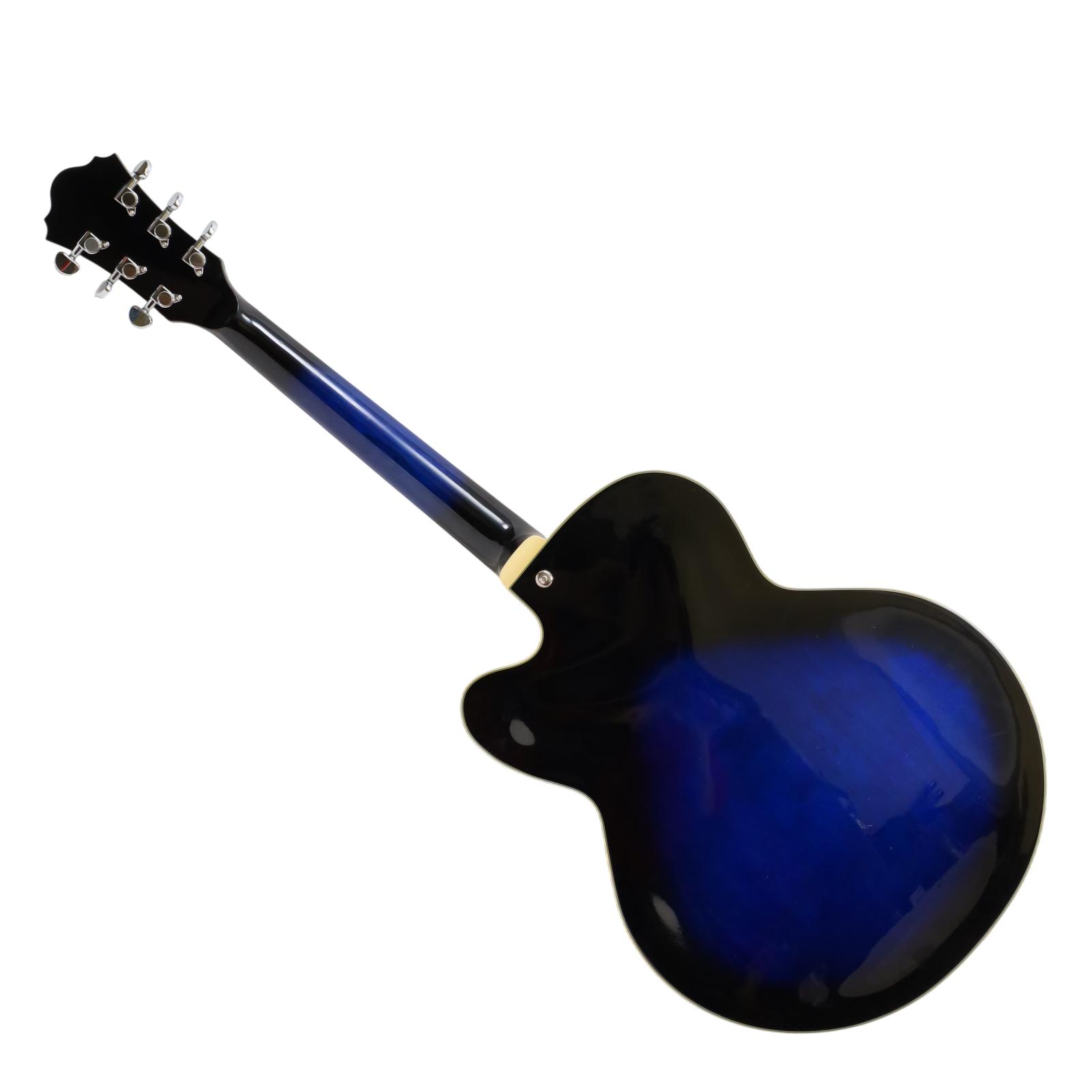 A full hollow body 6-string electric guitar in Blue Burst, manufactured in 2003. It features a laminated maple top, back, and sides with a gloss finish and ivory multi-ply binding. The neck is a set-in, one-piece mahogany design with a rosewood fingerboard adorned with pearl block inlays. It has 22 large nickel silver frets, a 628mm (24¾") scale length, and an ivory plastic nut measuring 43mm. The bridge is an ART-1 mounted on a wooden base, paired with a VT50 tailpiece. Chrome hardware includes Ibanez die-cast tuners with half-moon buttons, speed-style black knobs, and a 3-ply black/white/black pickguard. The guitar is equipped with Ibanez Artcore Humbucker pickups (model 1 at the neck and model 2 at the bridge) in a humbucker-humbucker configuration, with individual volume and tone controls for each pickup and a 3-way toggle selector. The output jack is mono and side mounted.