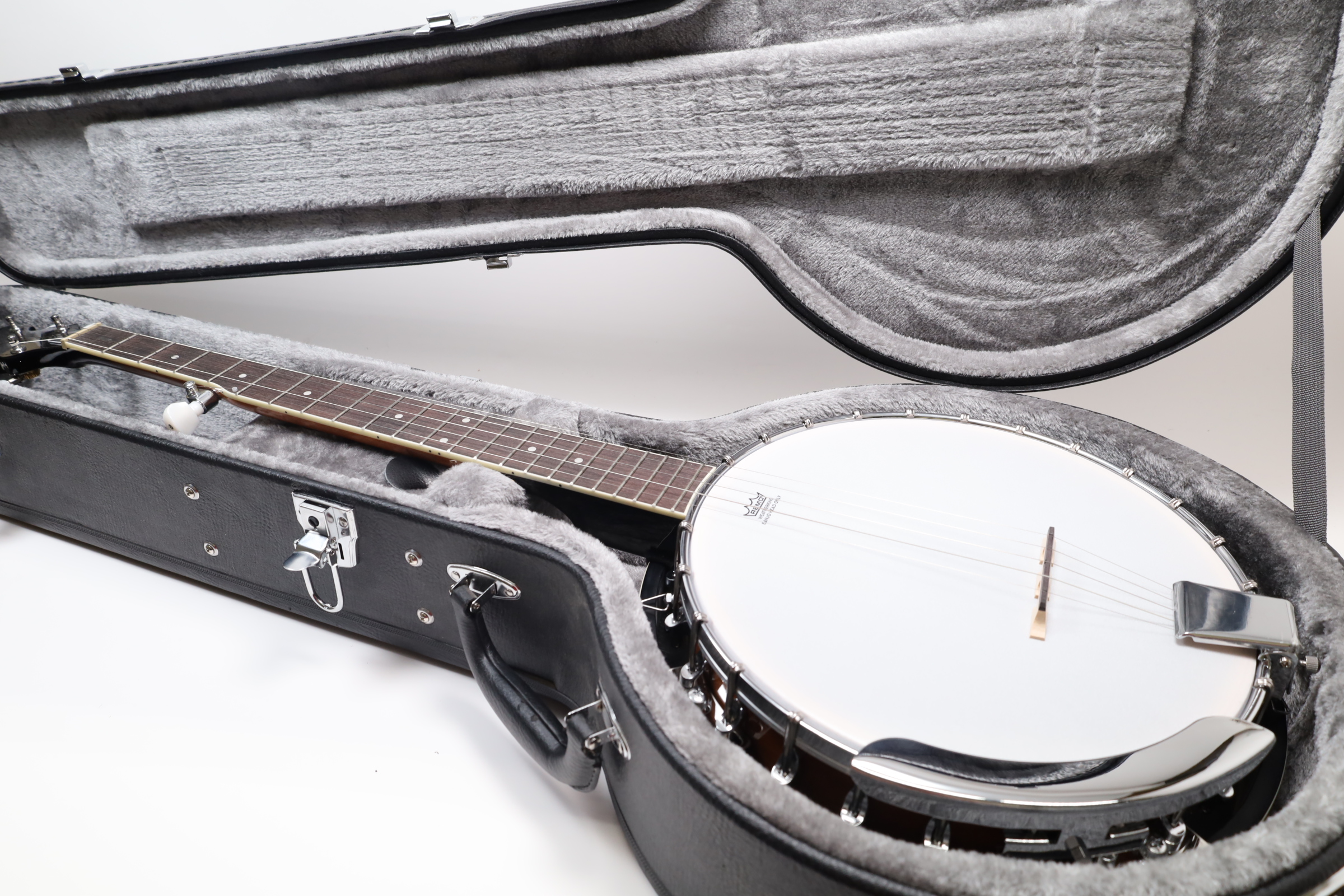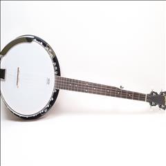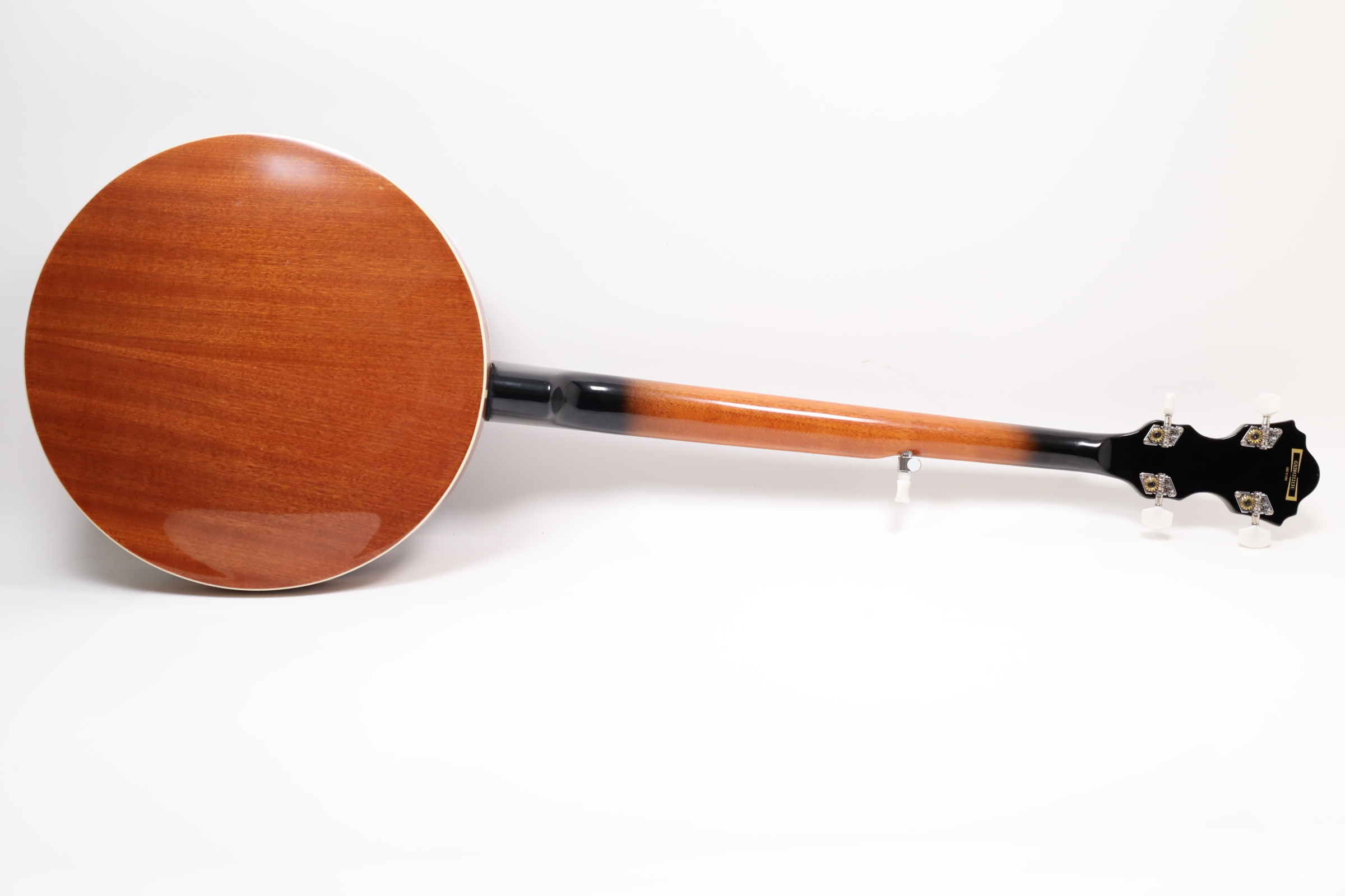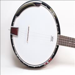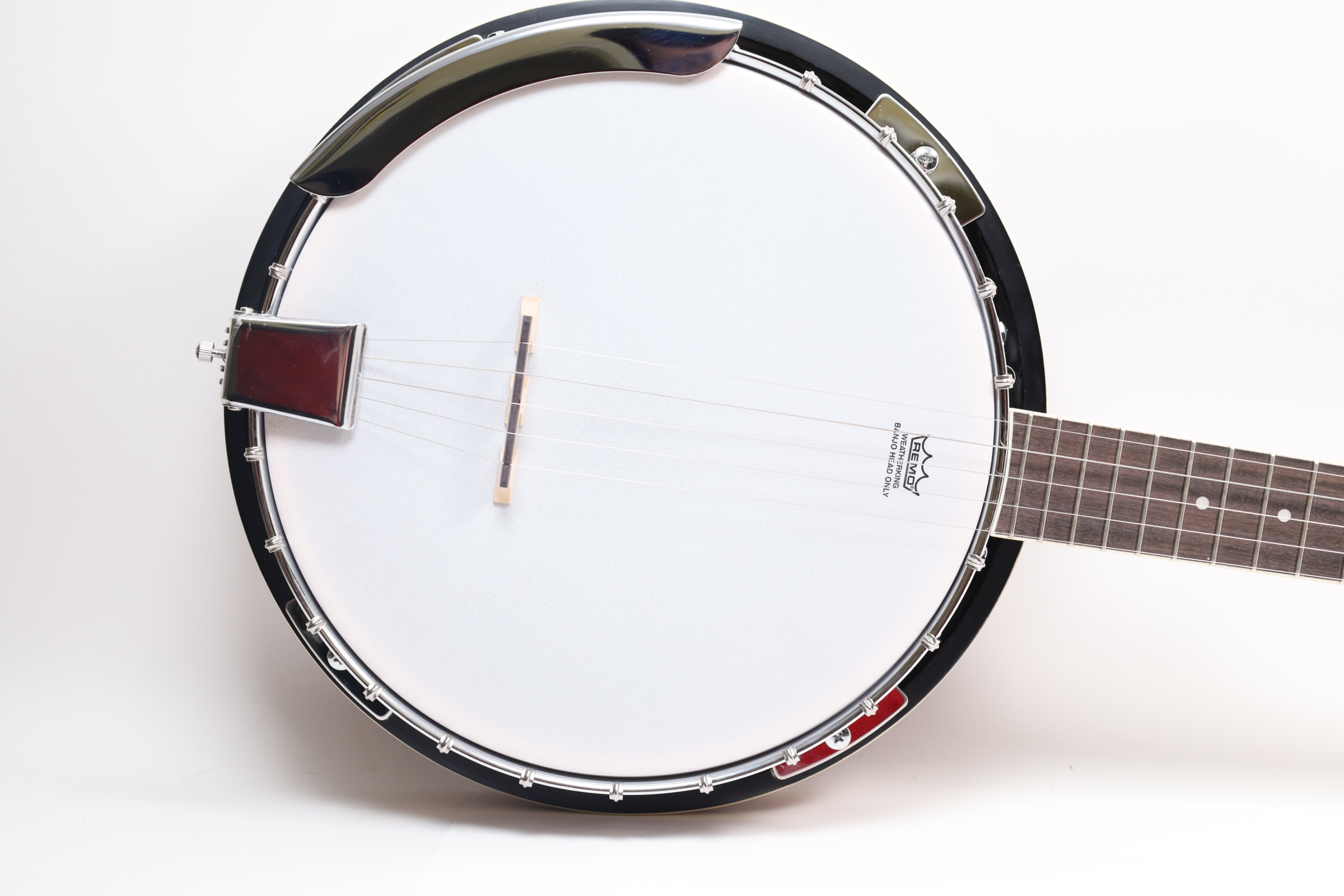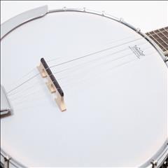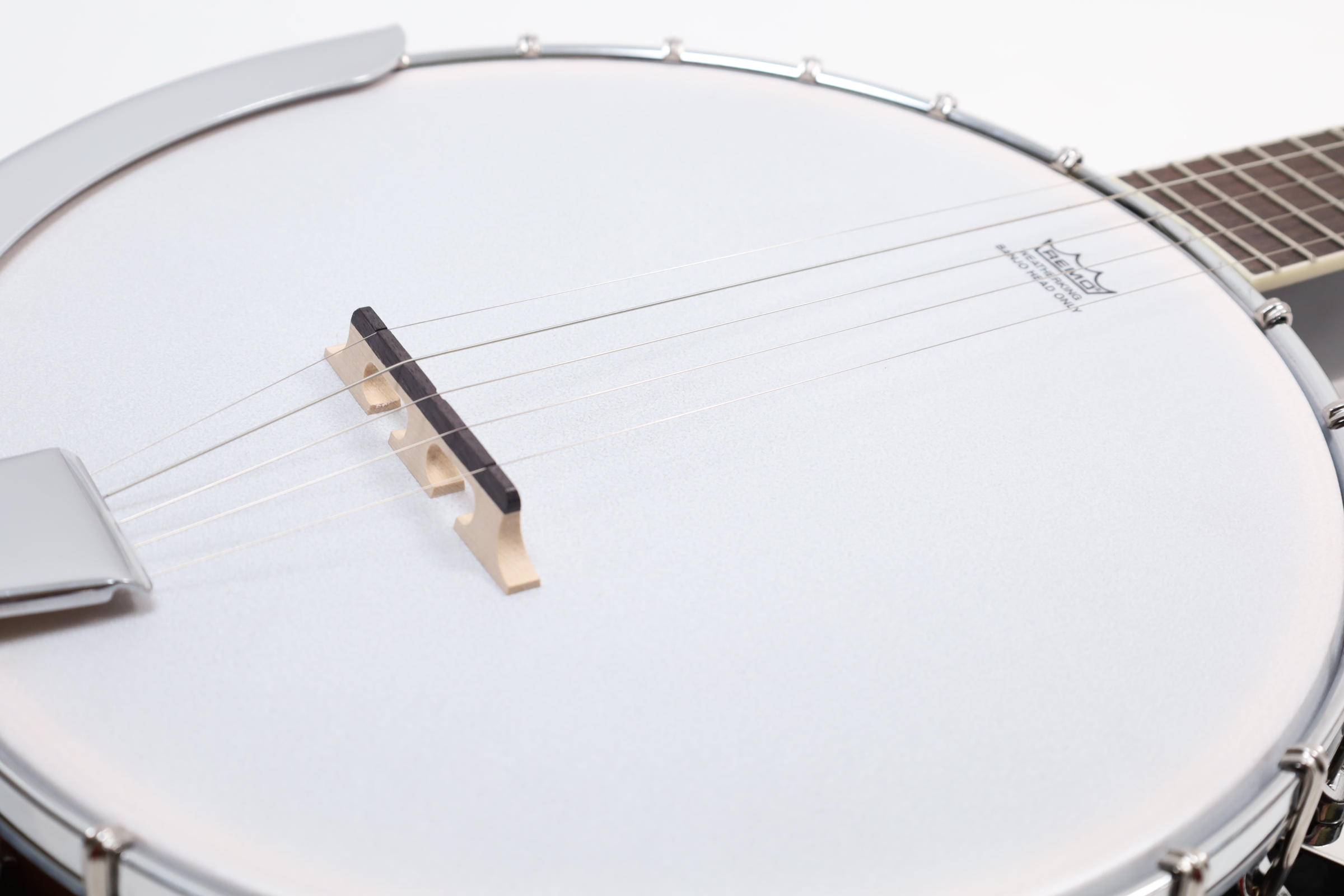 a 5-string banjo that combines traditional design with modern features. It has a banjo body shape with Sapele back and sides, a B Okoume neck, and a Purpleheart fretboard and bridge. The banjo features a 24-lug configuration, a Remo 11-inch coated weatherking banjo head, open gear tuners, and a rosewood bridge and fretboard. The finish is gloss on the top, back, sides, and neck. The body dimensions are 13 1/8" in length and width, with a maximum depth of 3 3/4".