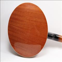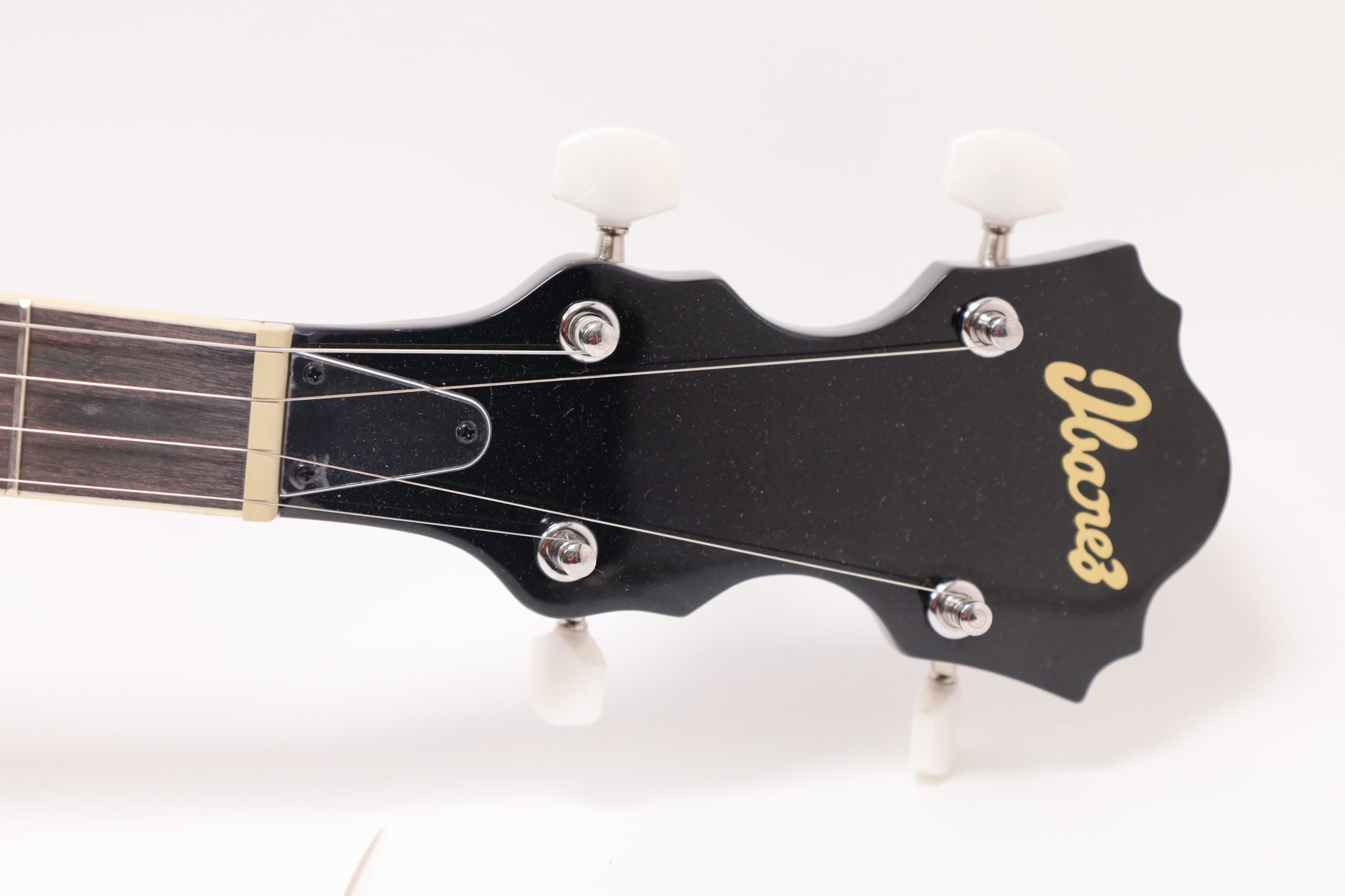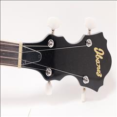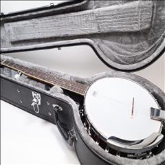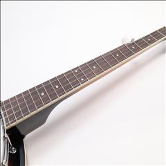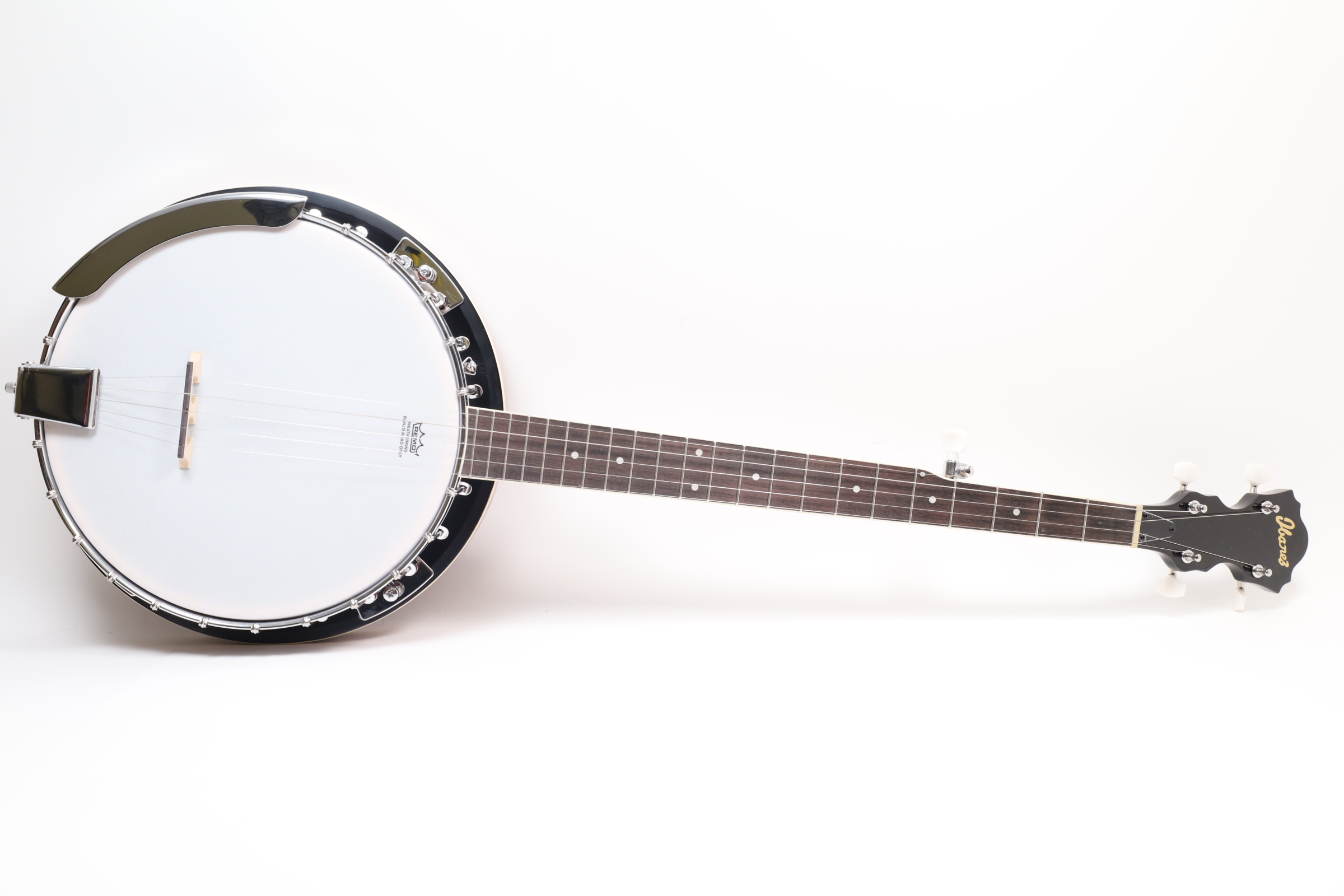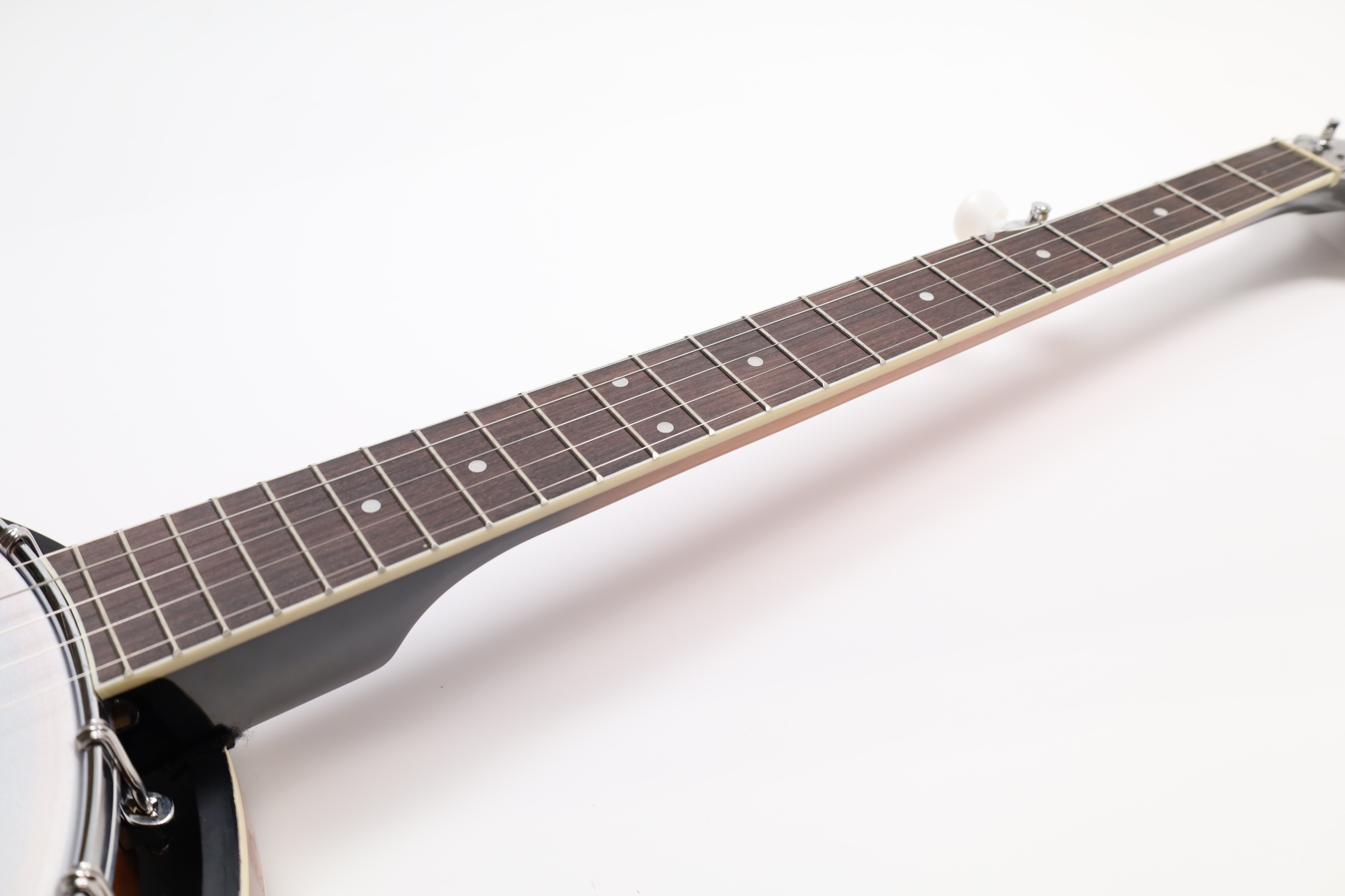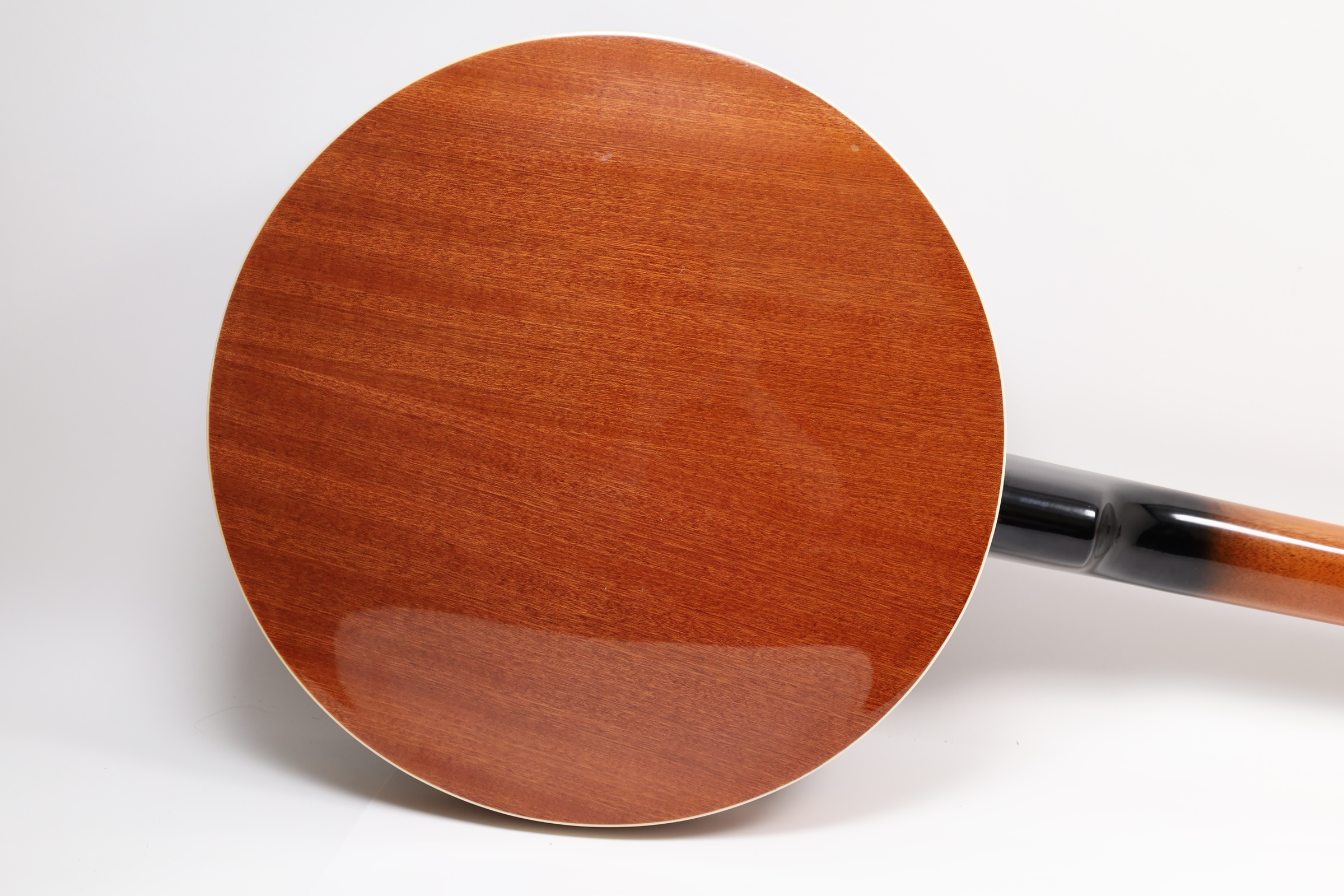 a 5-string banjo that combines traditional design with modern features. It has a banjo body shape with Sapele back and sides, a B Okoume neck, and a Purpleheart fretboard and bridge. The banjo features a 24-lug configuration, a Remo 11-inch coated weatherking banjo head, open gear tuners, and a rosewood bridge and fretboard. The finish is gloss on the top, back, sides, and neck. The body dimensions are 13 1/8" in length and width, with a maximum depth of 3 3/4".
