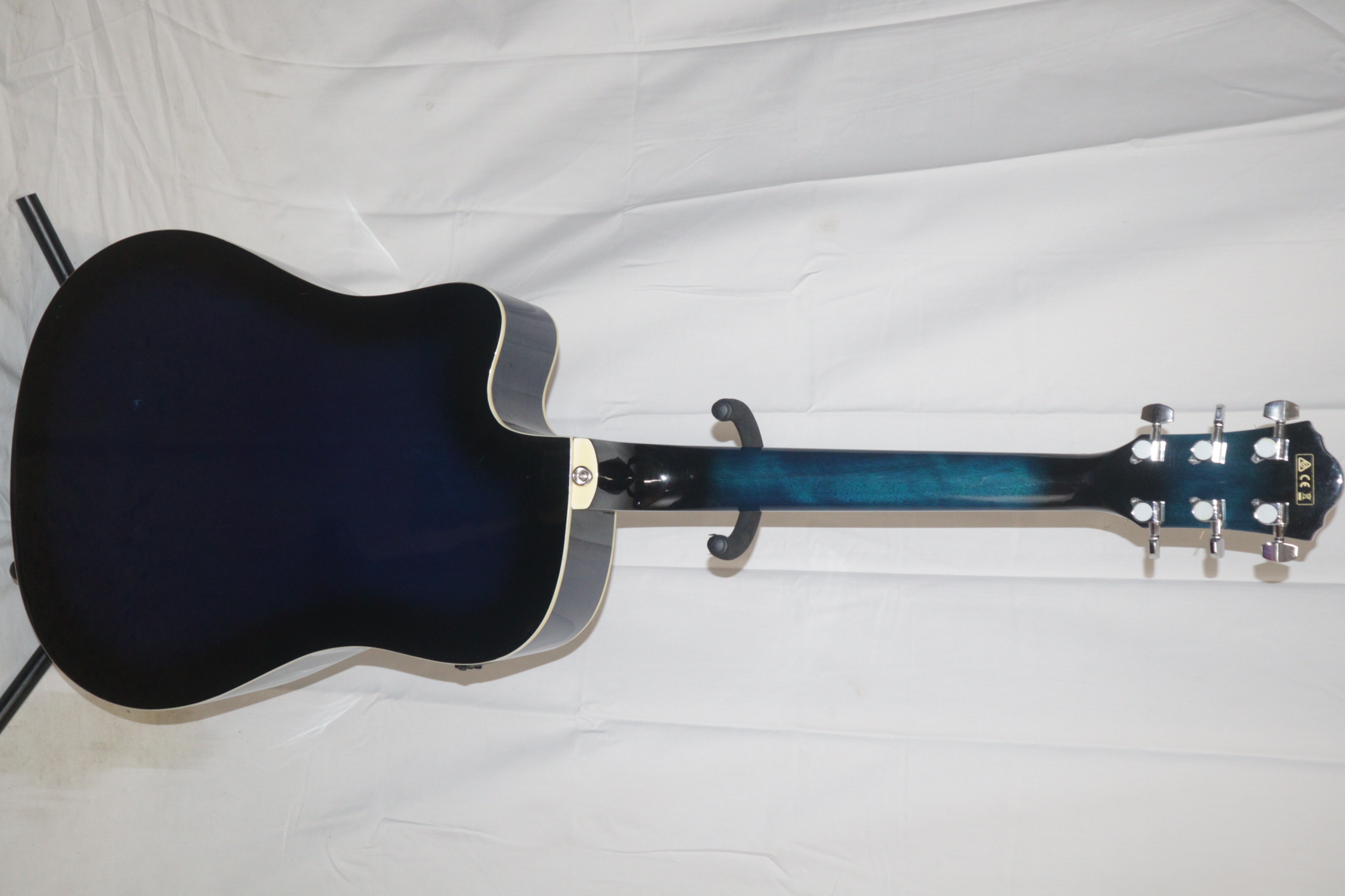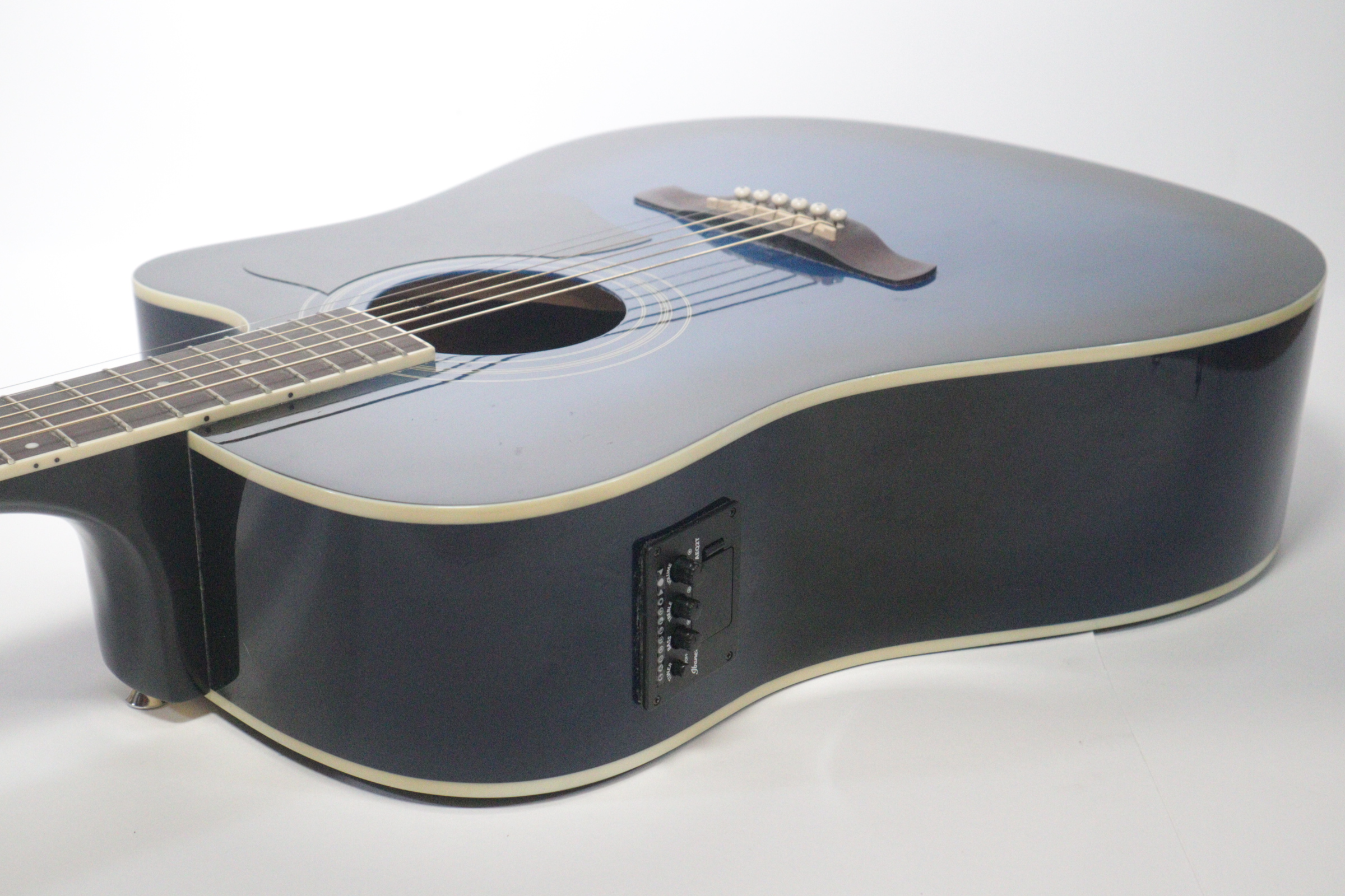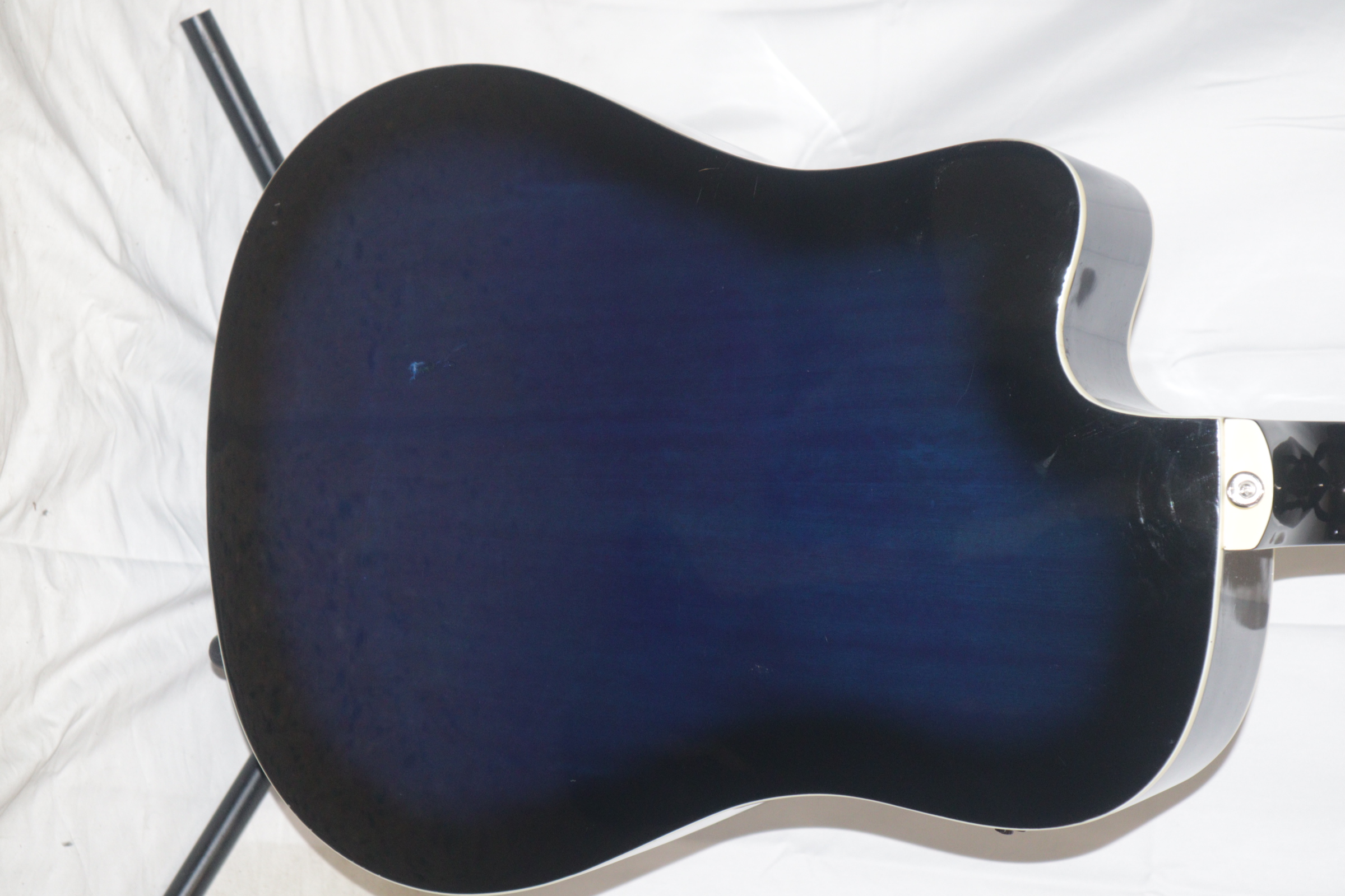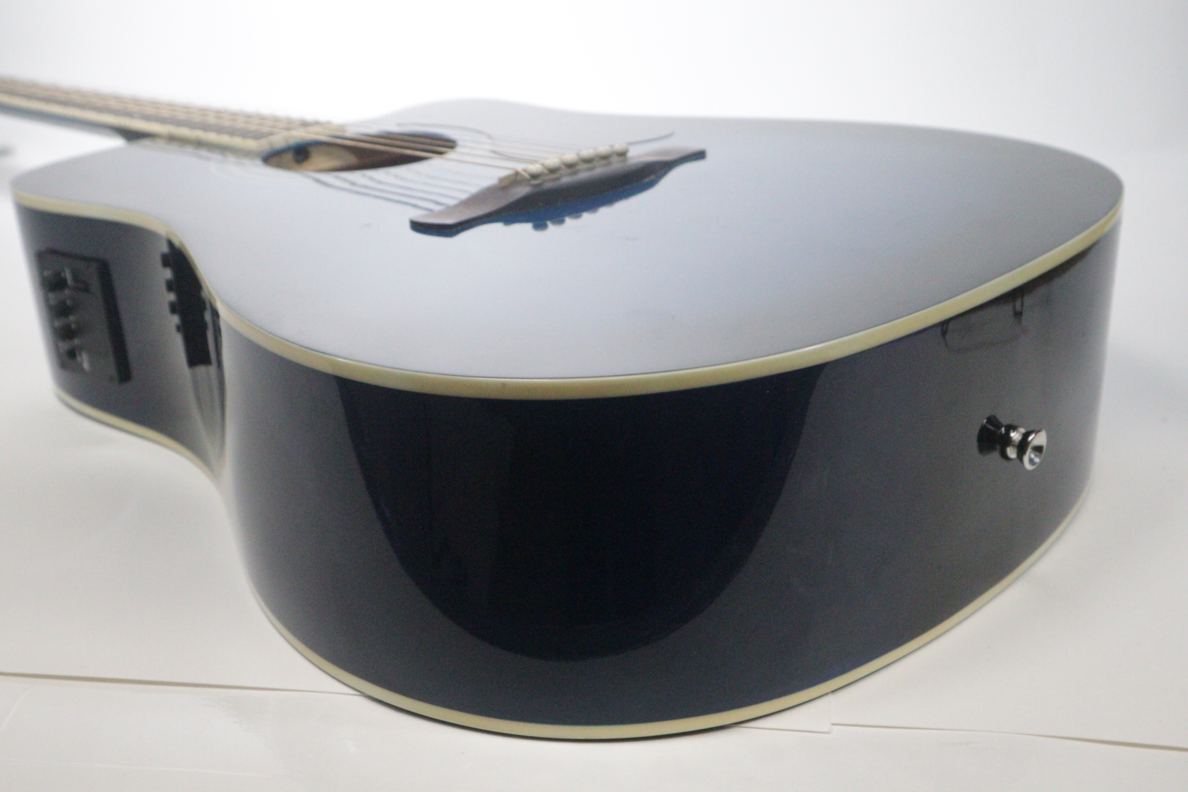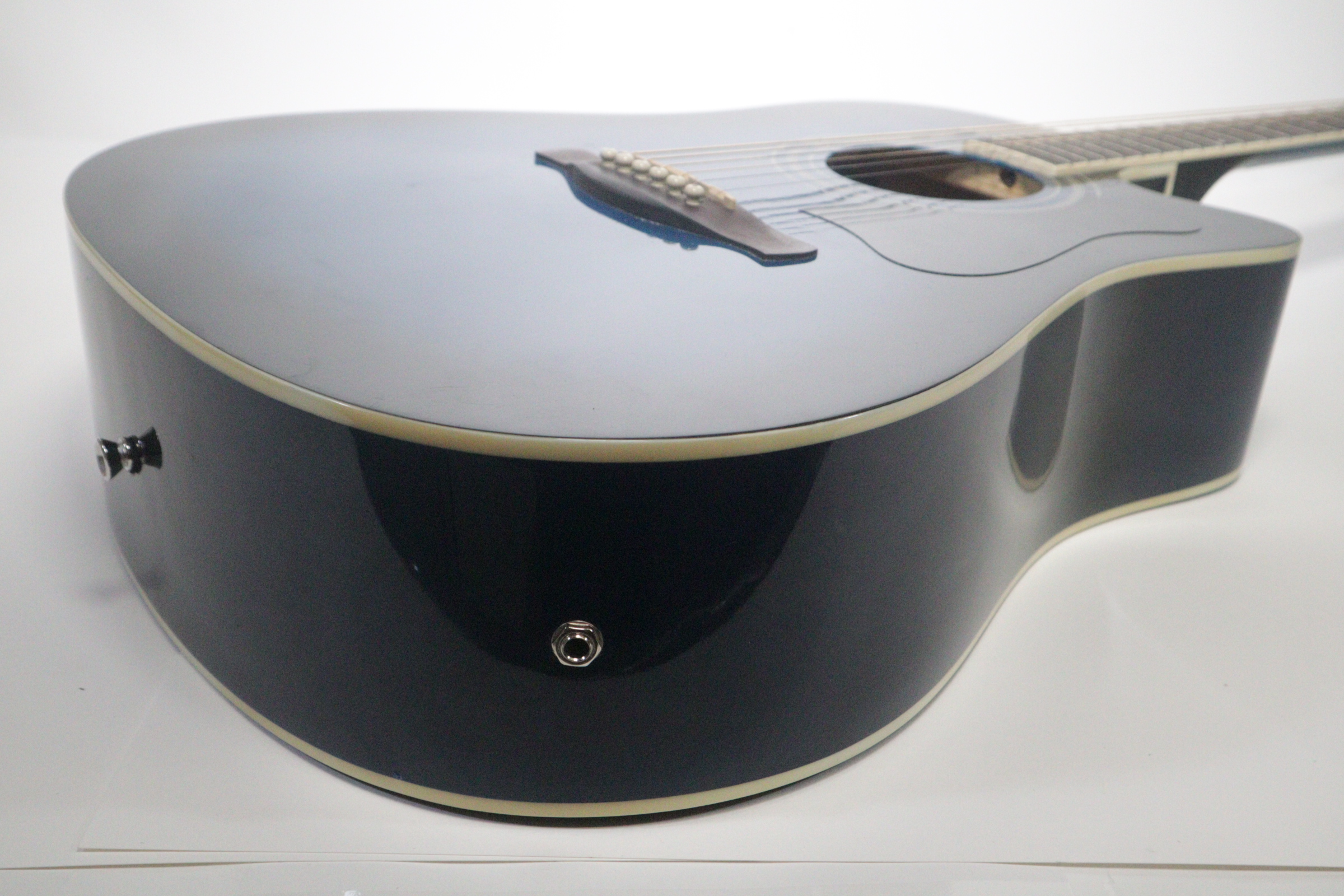This acoustic electric guitar was previously owned. It shows signs of normal use. It is in fair condition. It has been tested and works. There is a tiny indent on the face of the guitar. On the back of it there is a long-curved scratch and another blemish.