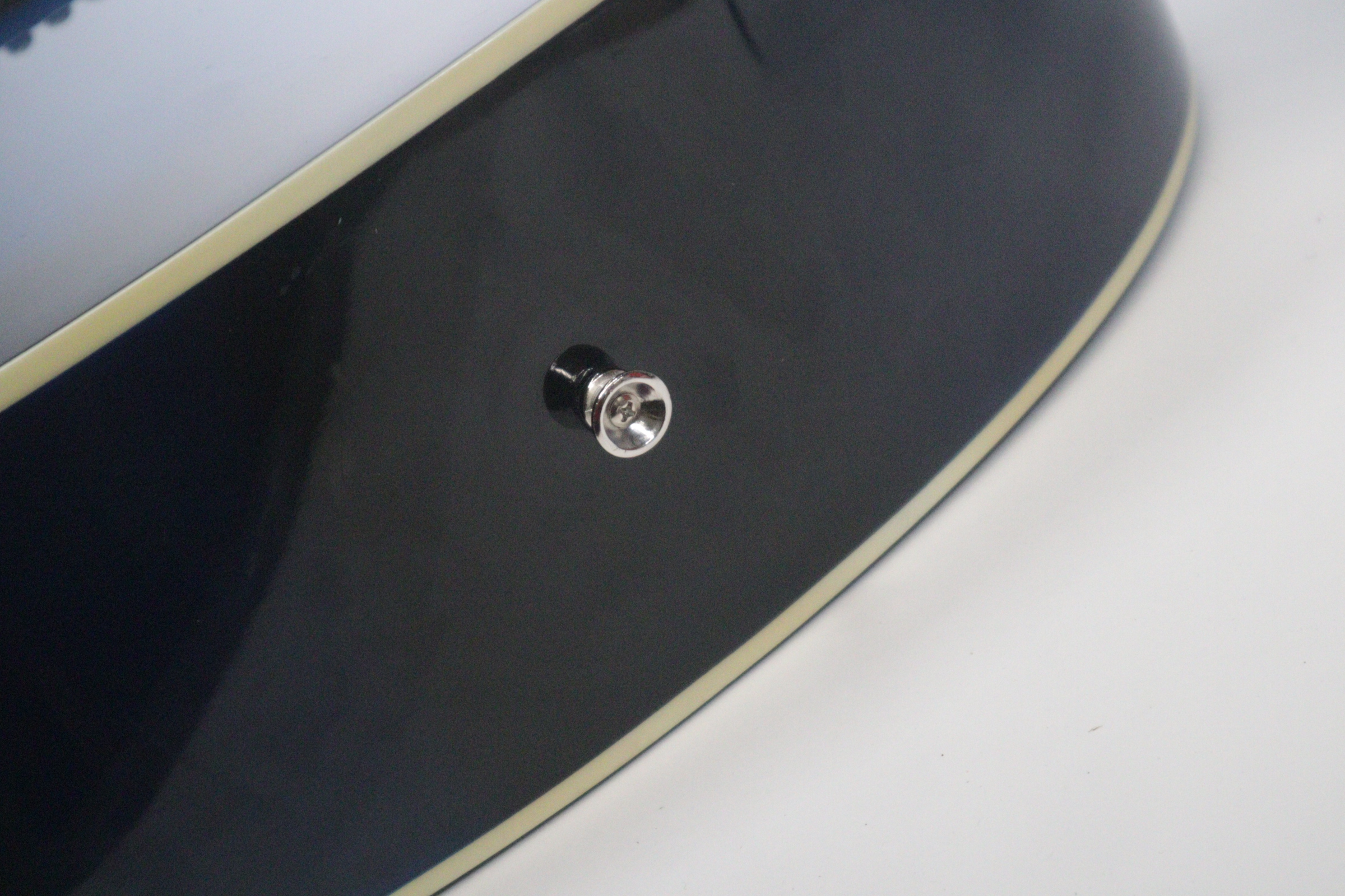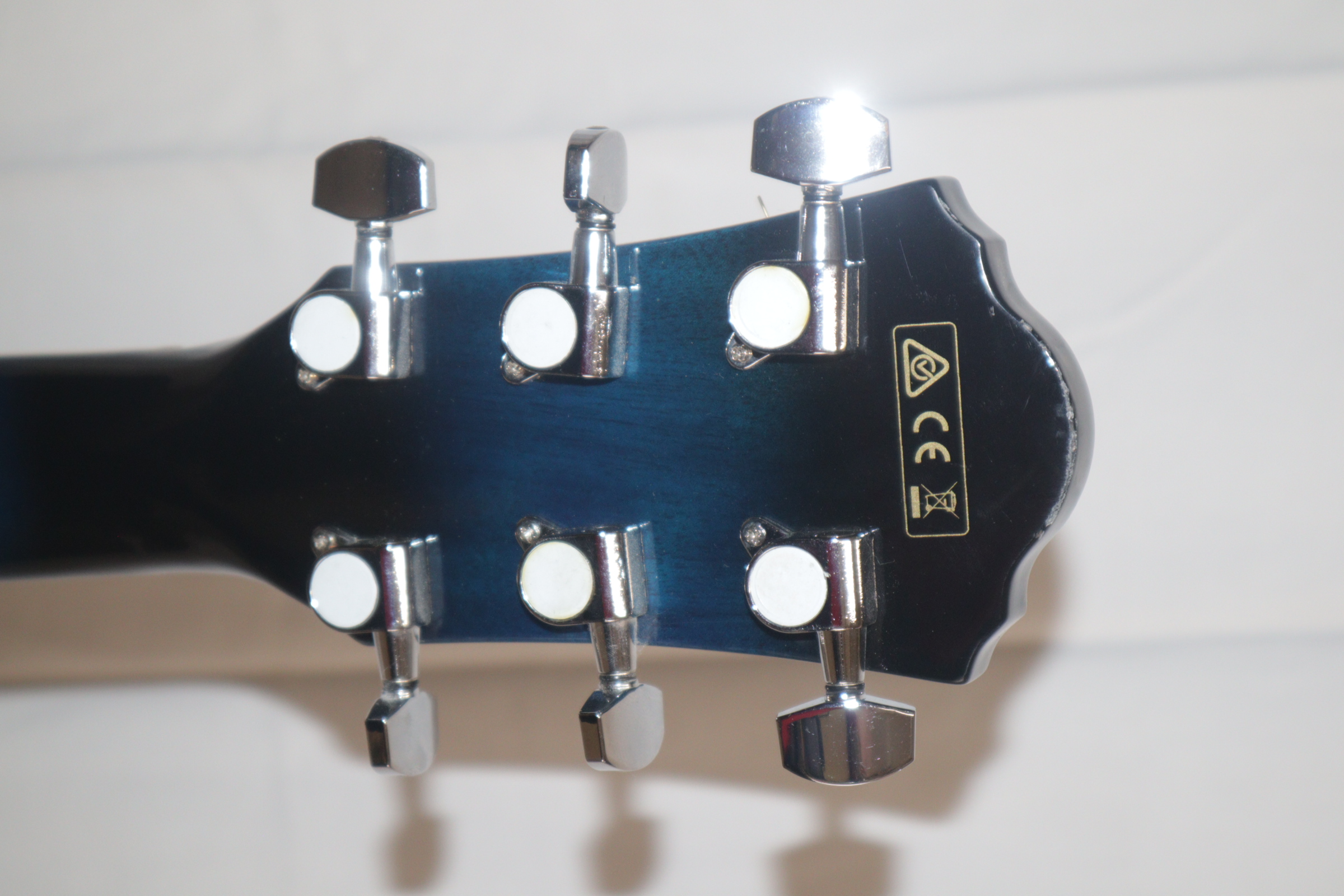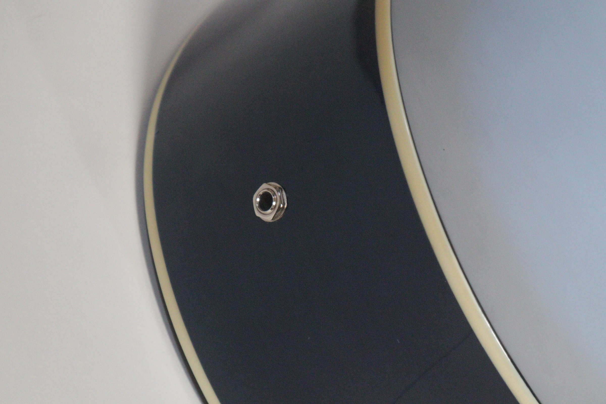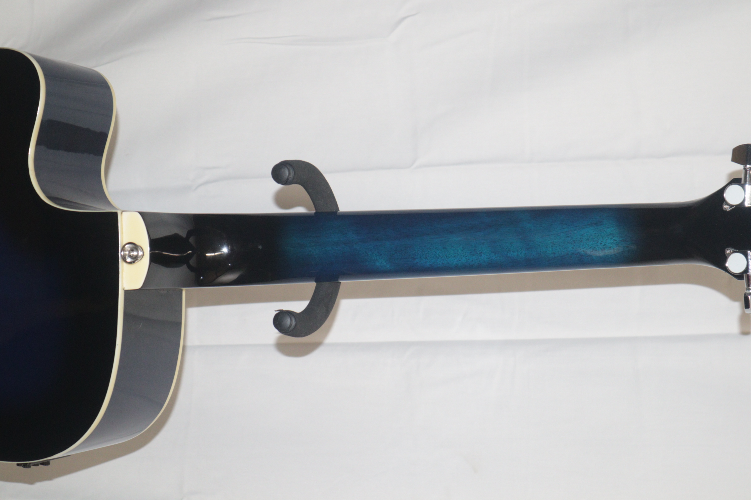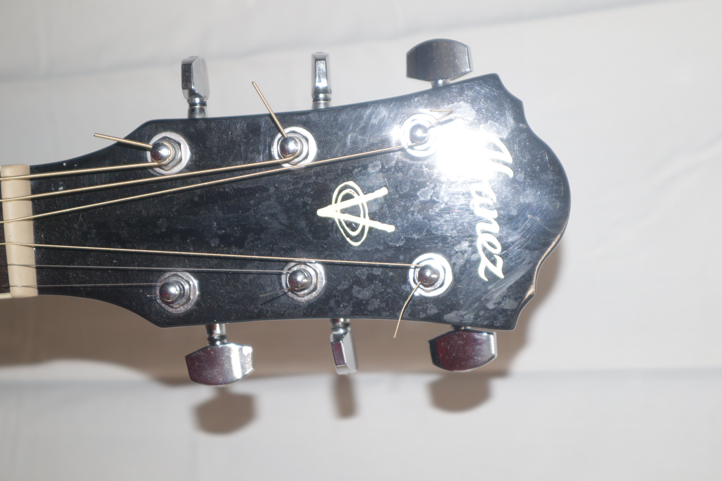 This acoustic electric guitar was previously owned. It shows signs of normal use. It is in fair condition. It has been tested and works. There is a tiny indent on the face of the guitar. On the back of it there is a long-curved scratch and another blemish.