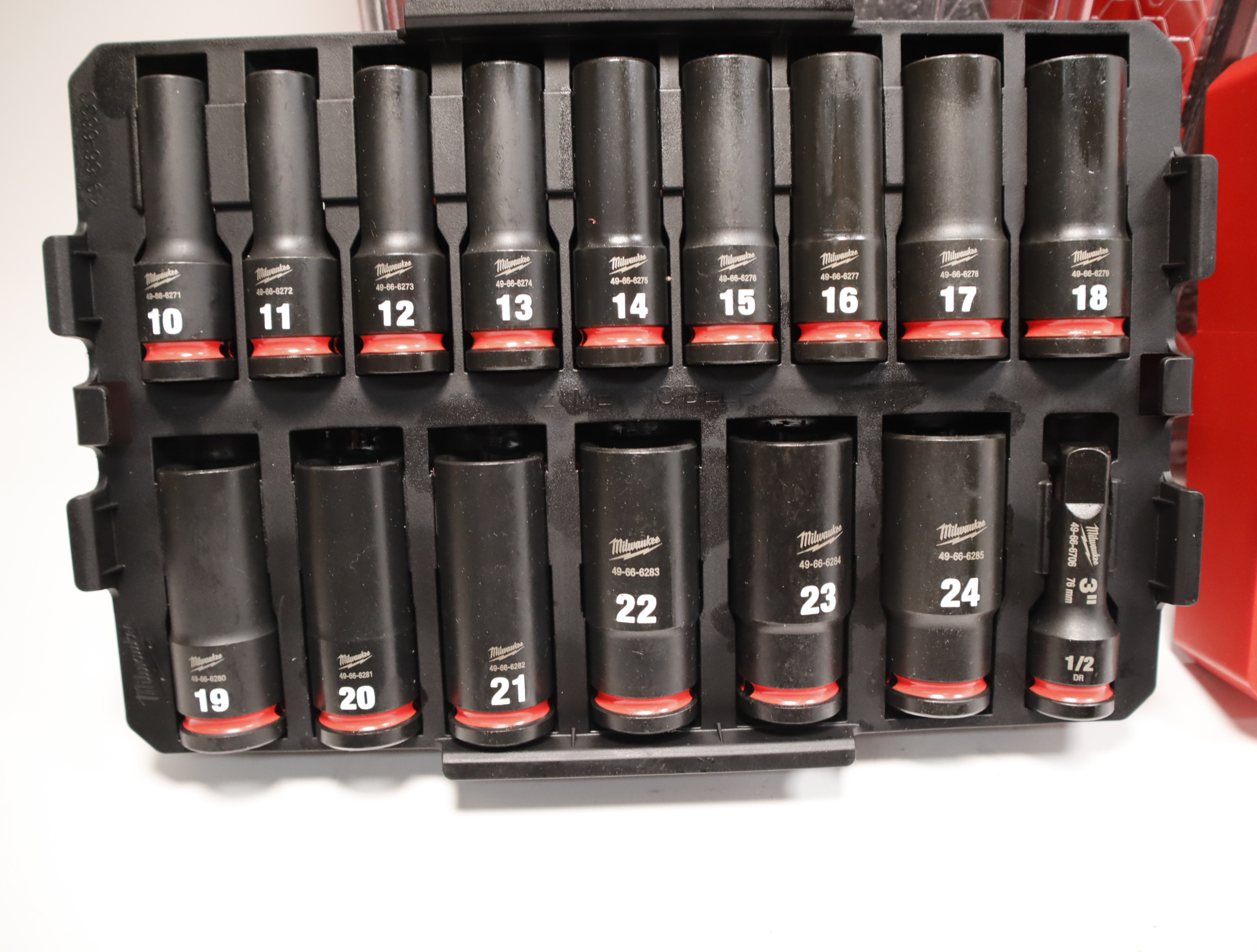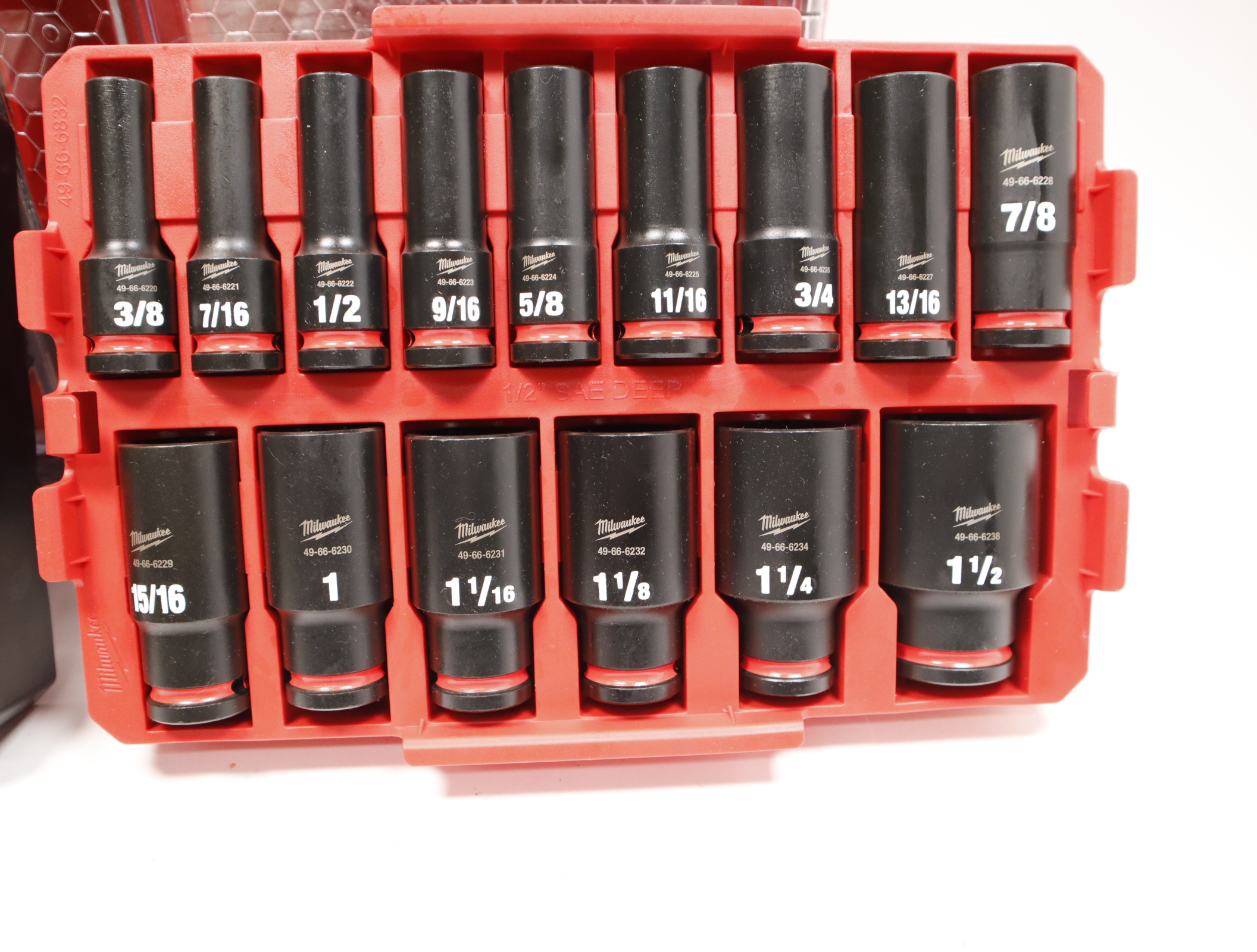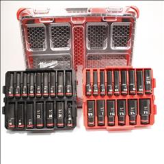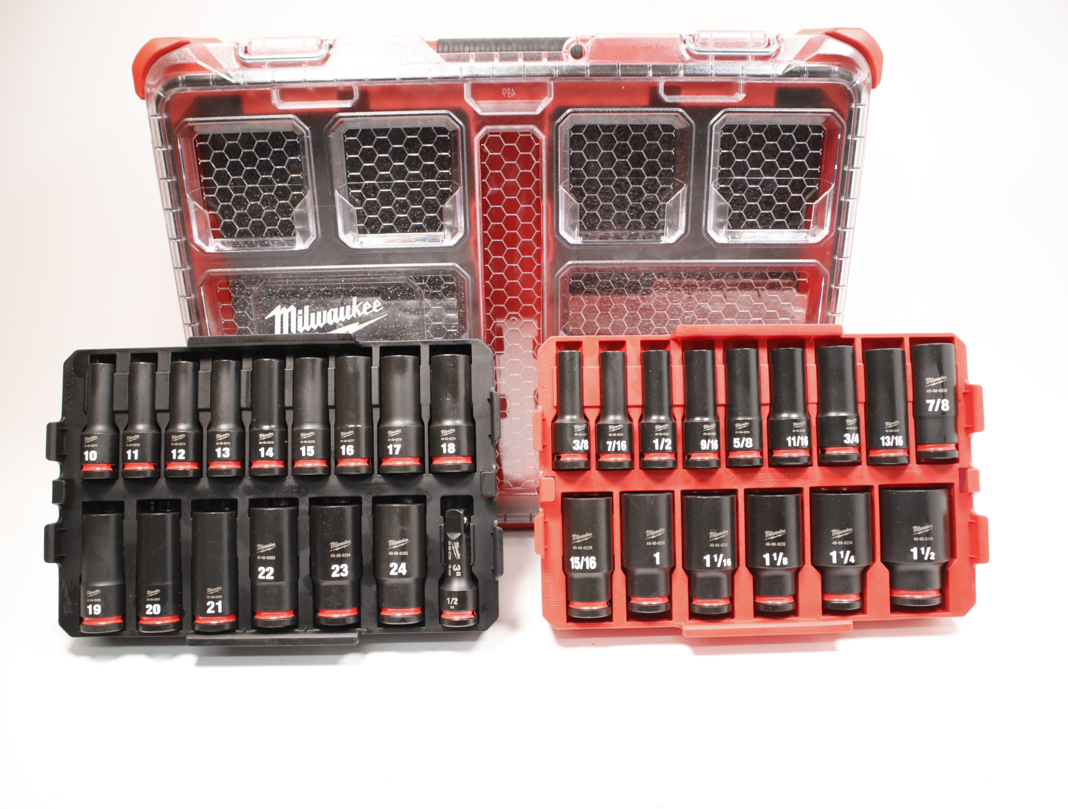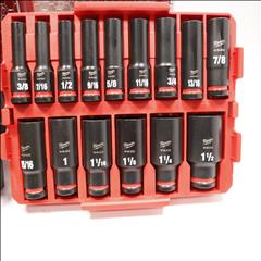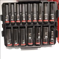 Kit includes 31 Deep SAE & Metric Sockets and 1 Impact Socket Accessory . The following sizes are included: in.,3/8 in., 7/16 in. 1/2, 9/16, 5/8, 11/16, 3/4, 13/16, 7/8, 15/16, 1 in., 1-1/16 in., 1-1/8 in., 1-1/4 in., 1-1/2 in., 10mm, 11mm, 12mm, 13mm, 14mm, 15mm, 16mm, 17mm, 18mm, 19mm, 20mm, 21mm, 22mm, 23mm, 24mm, 3 in. Extension