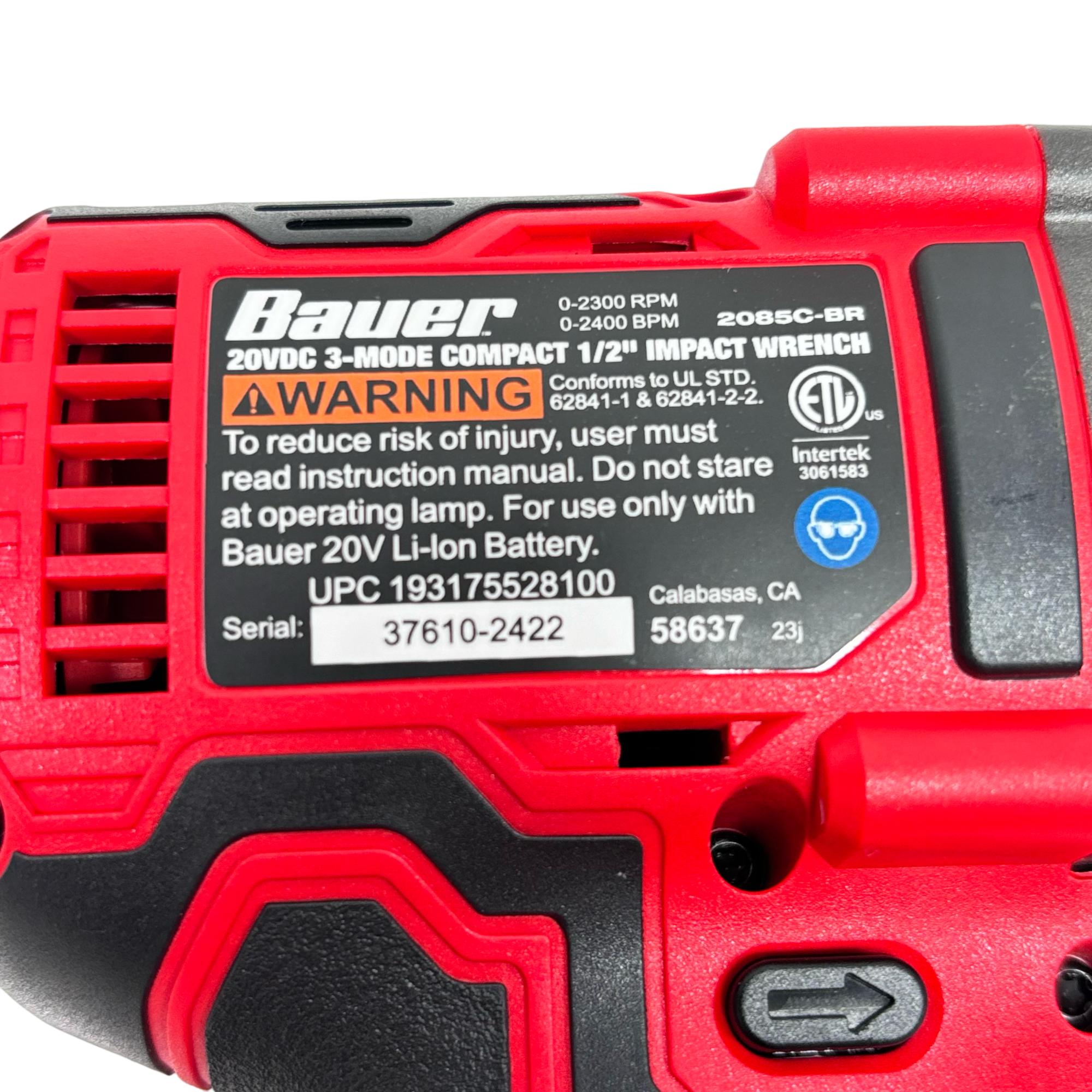 Introducing the Bauer 2085C-BR 20V Lithium-Ion Brushless Impact Wrench, a powerhouse tool for your toughest jobs. With a robust 475 ft. lbs. of nut-busting torque and a versatile 3-mode drive control, this lightweight and compact tool is designed to deliver maximum performance. Perfect for both professionals and DIY enthusiasts, this new impact wrench comes in an original box, ensuring a pristine condition straight out of the package. Experience precision and power like never before!