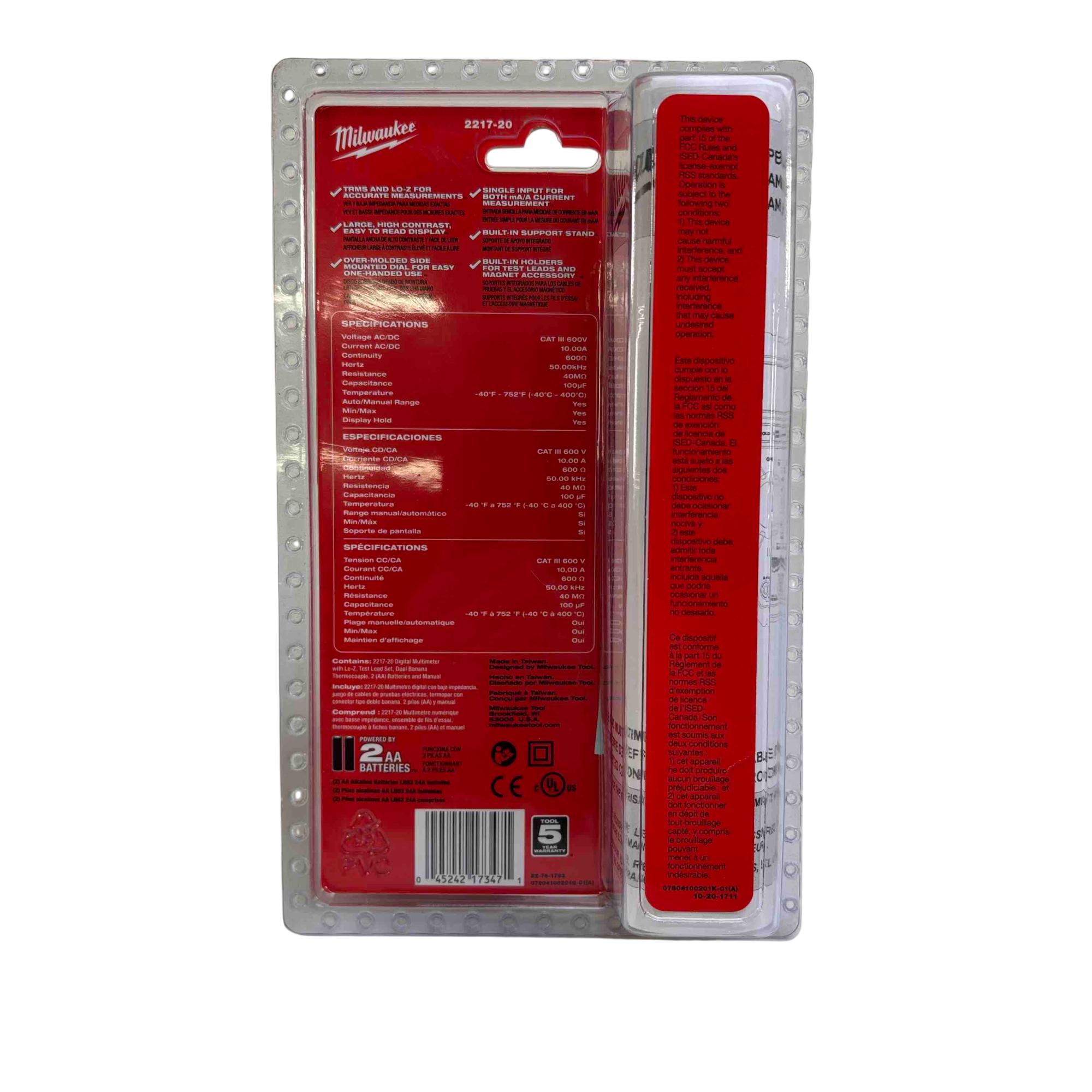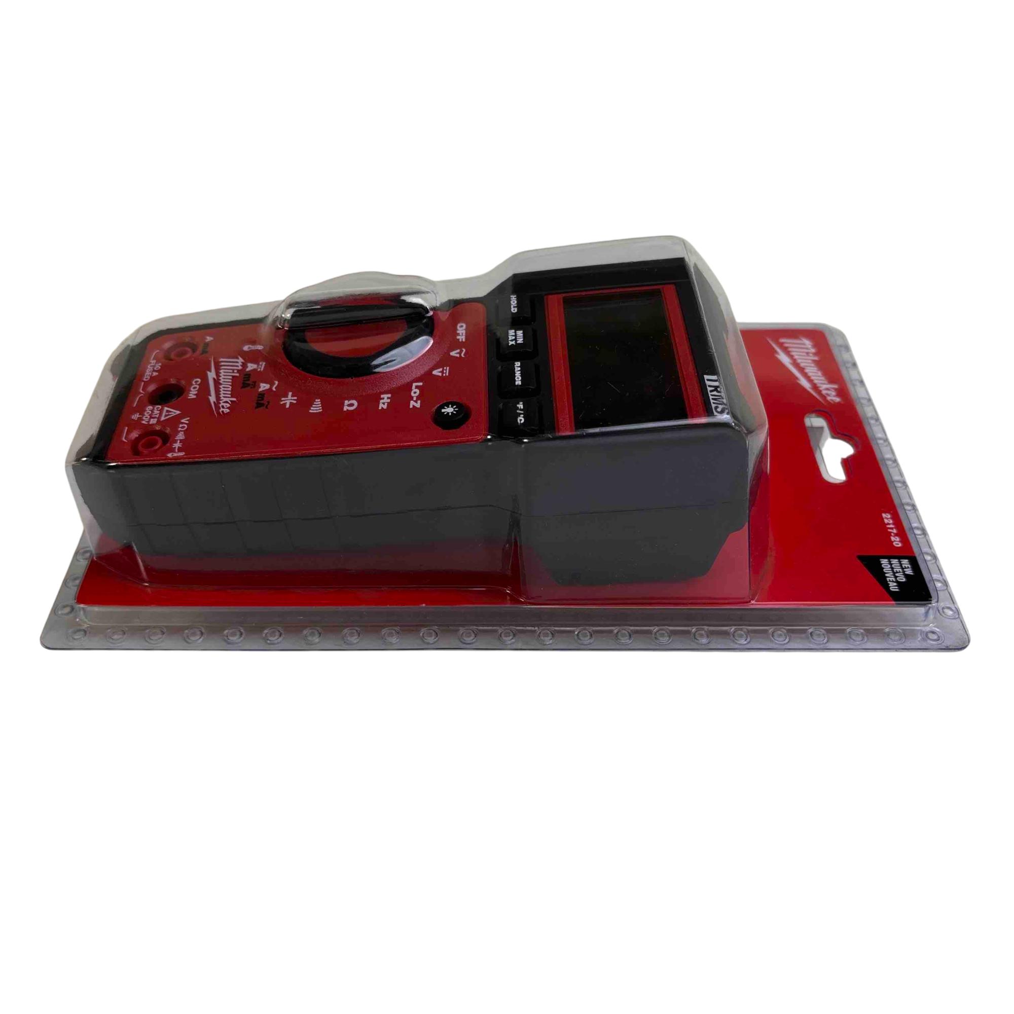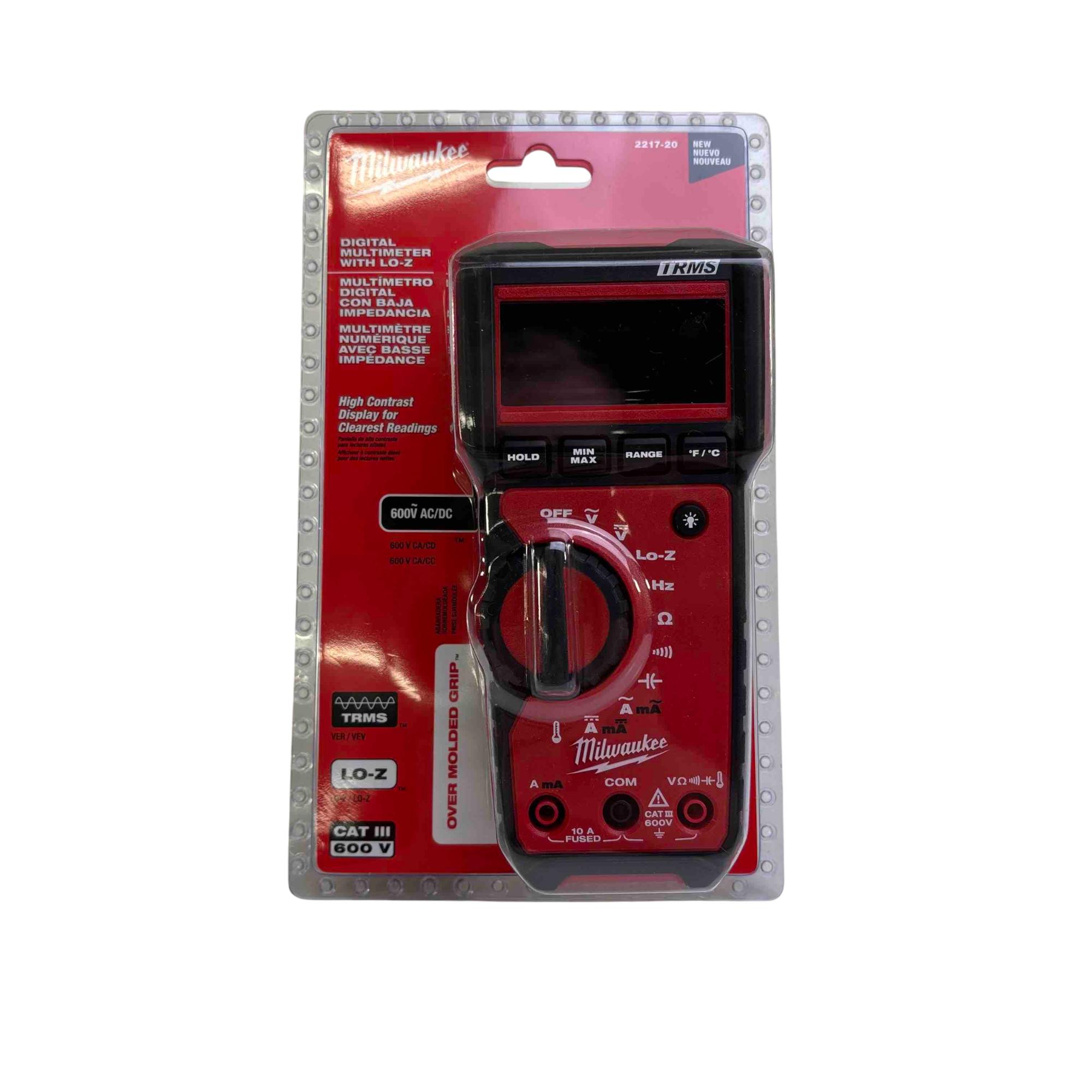 The Milwaukee 2217-20 Digital Multimeter offers a wide voltage range to 600-Volt AC/DC and measures frequencies from 10Hz to 50kHz. The heavy-duty True-RMS meter offers accuracy and durability with an easy-to-read white on black display and an over-molded dial for 1-handed use. A slide rail system provides space for adding proprietary accessories.
