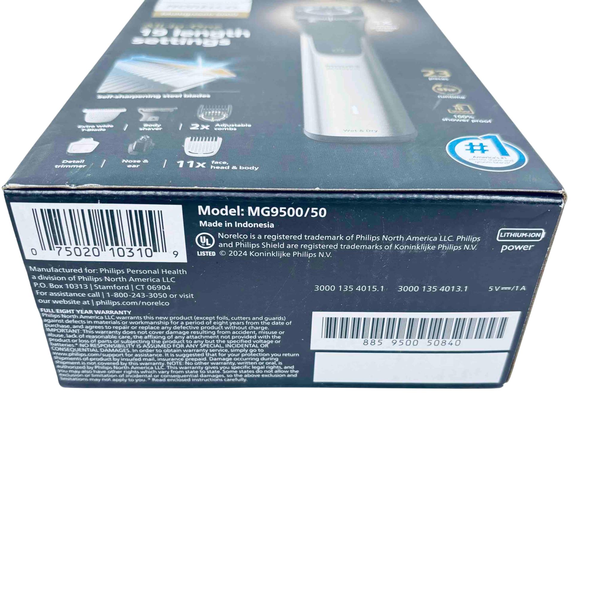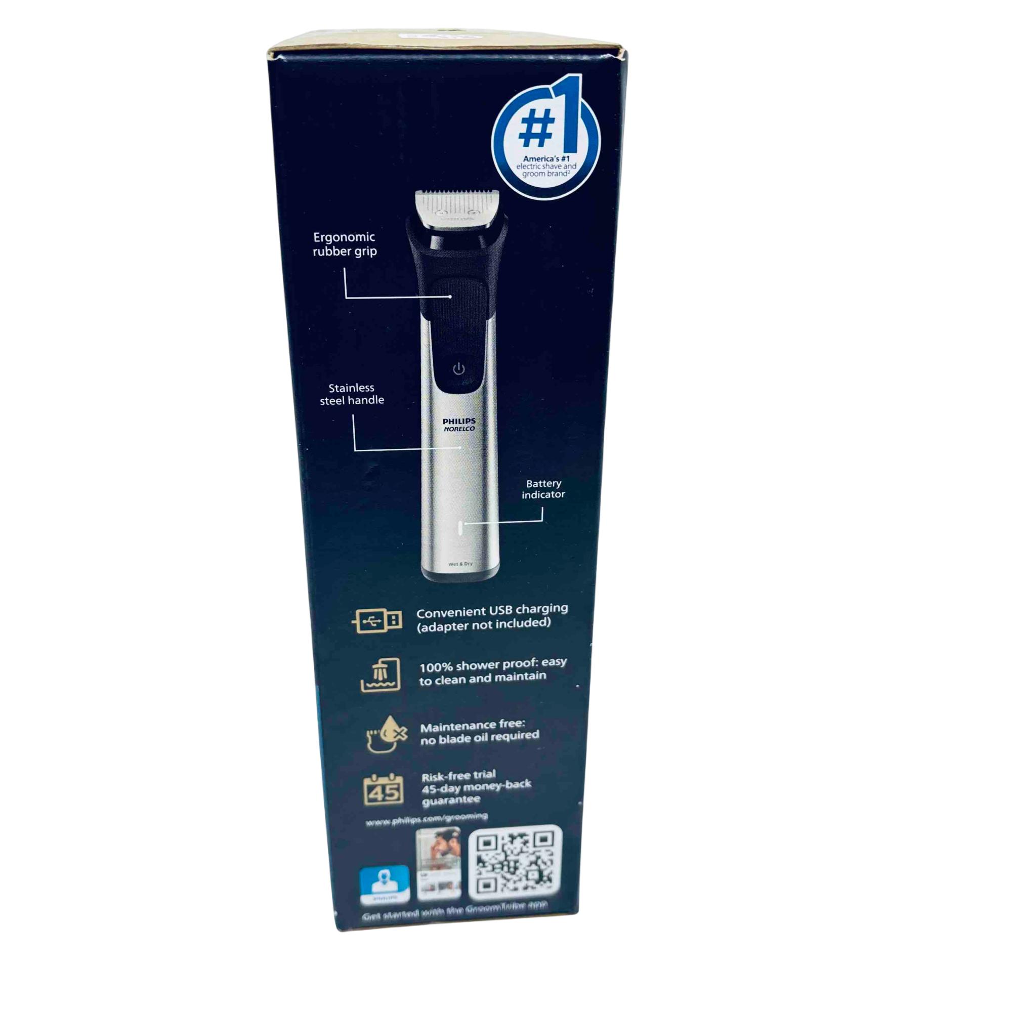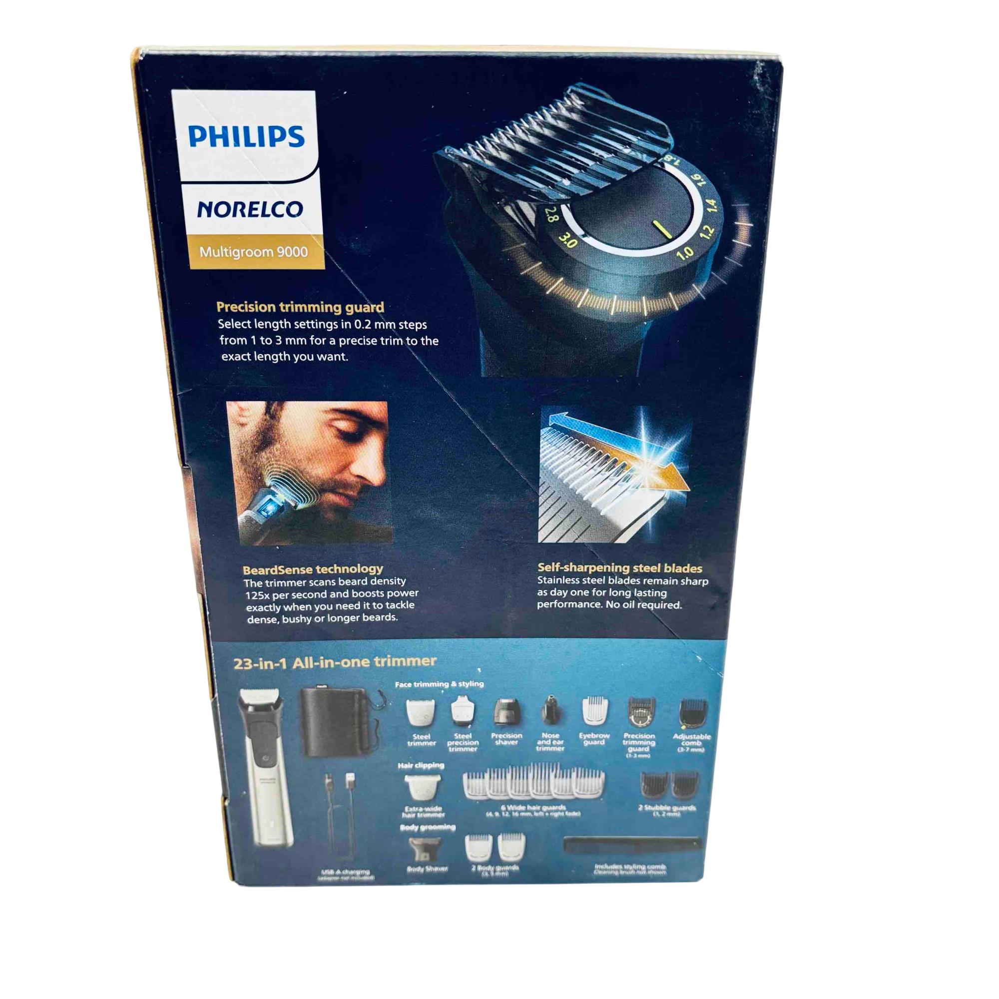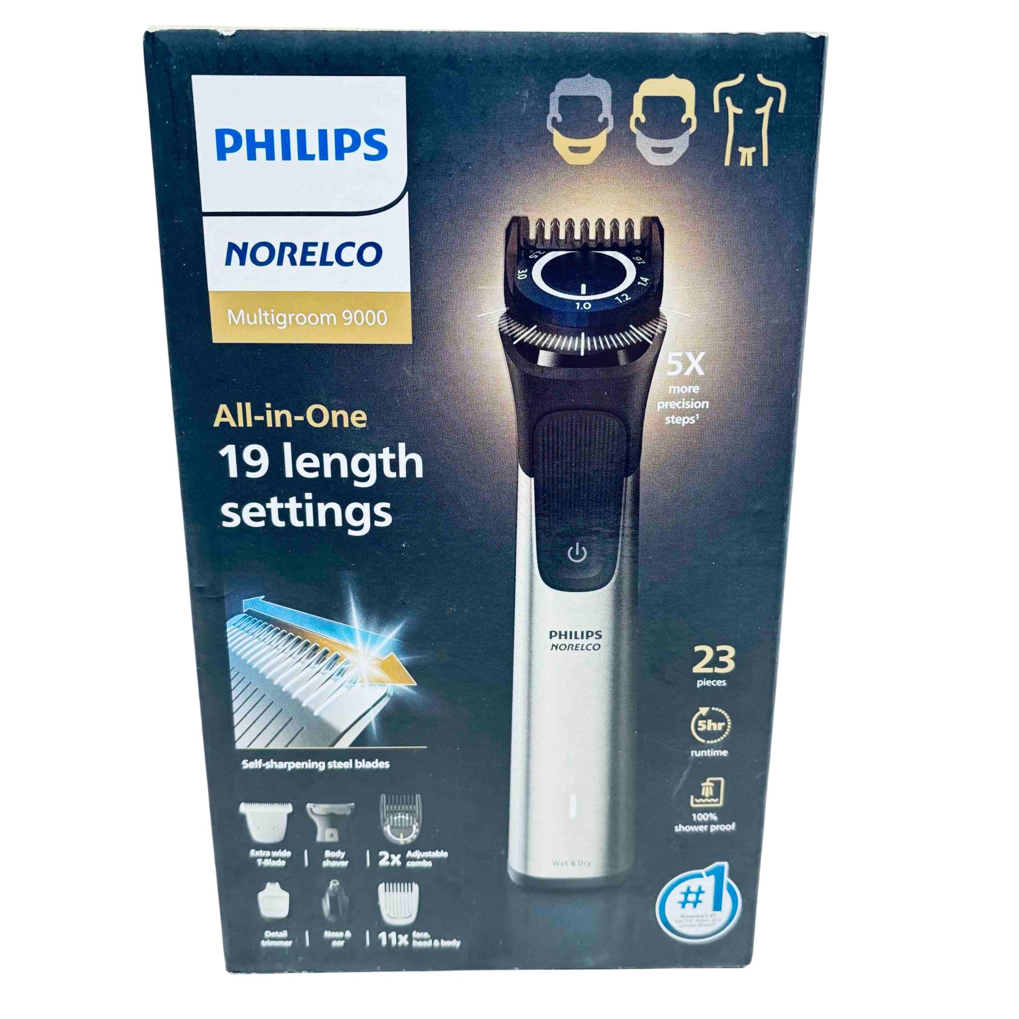Elevate your grooming experience with the Philips Norelco Multigroom 9000 All-in-One Trimmer. This versatile grooming tool is equipped with 23 attachments for unparalleled precision and customization, featuring BeardSense technology for optimal performance. With its ergonomic design and self-sharpening steel blades, this trimmer offers the ultimate convenience with a 5-hour runtime and USB charging capability. Perfect for face, head, and body grooming, all while being 100% shower-proof.