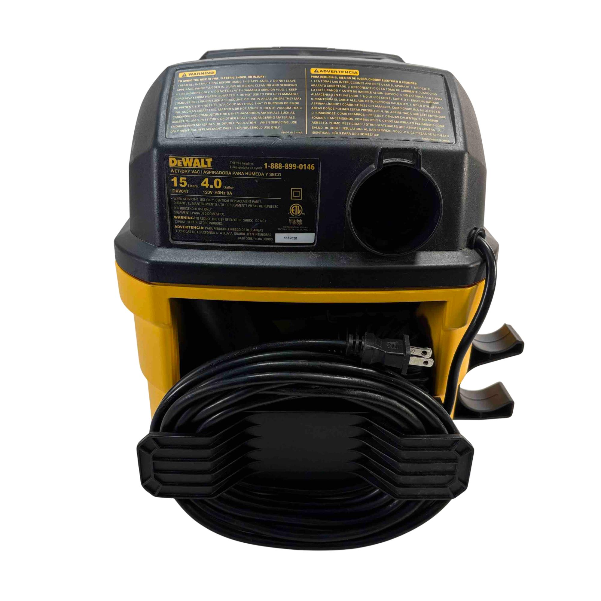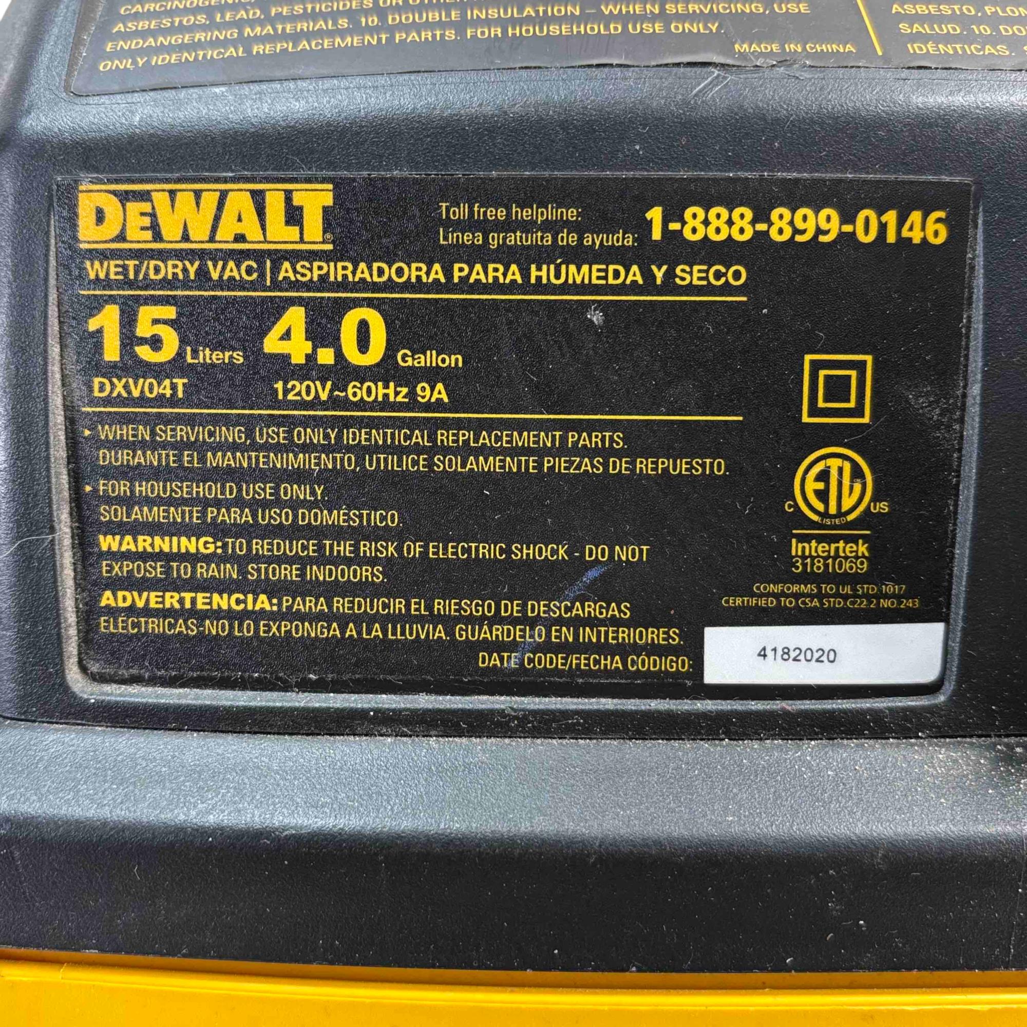 Introducing the DeWalt DXV04T Wet/Dry Vacuum - the ultimate cleaning companion for your household needs. This powerful vacuum combines functionality and durability, offering a spacious 15-liter capacity and a robust 4-gallon tank. Its double insulation ensures safe operation, while the 120V motor delivers efficient performance for both wet and dry messes. Perfect for any home, this compact yet tough vacuum will tackle any spill or dirt with ease!