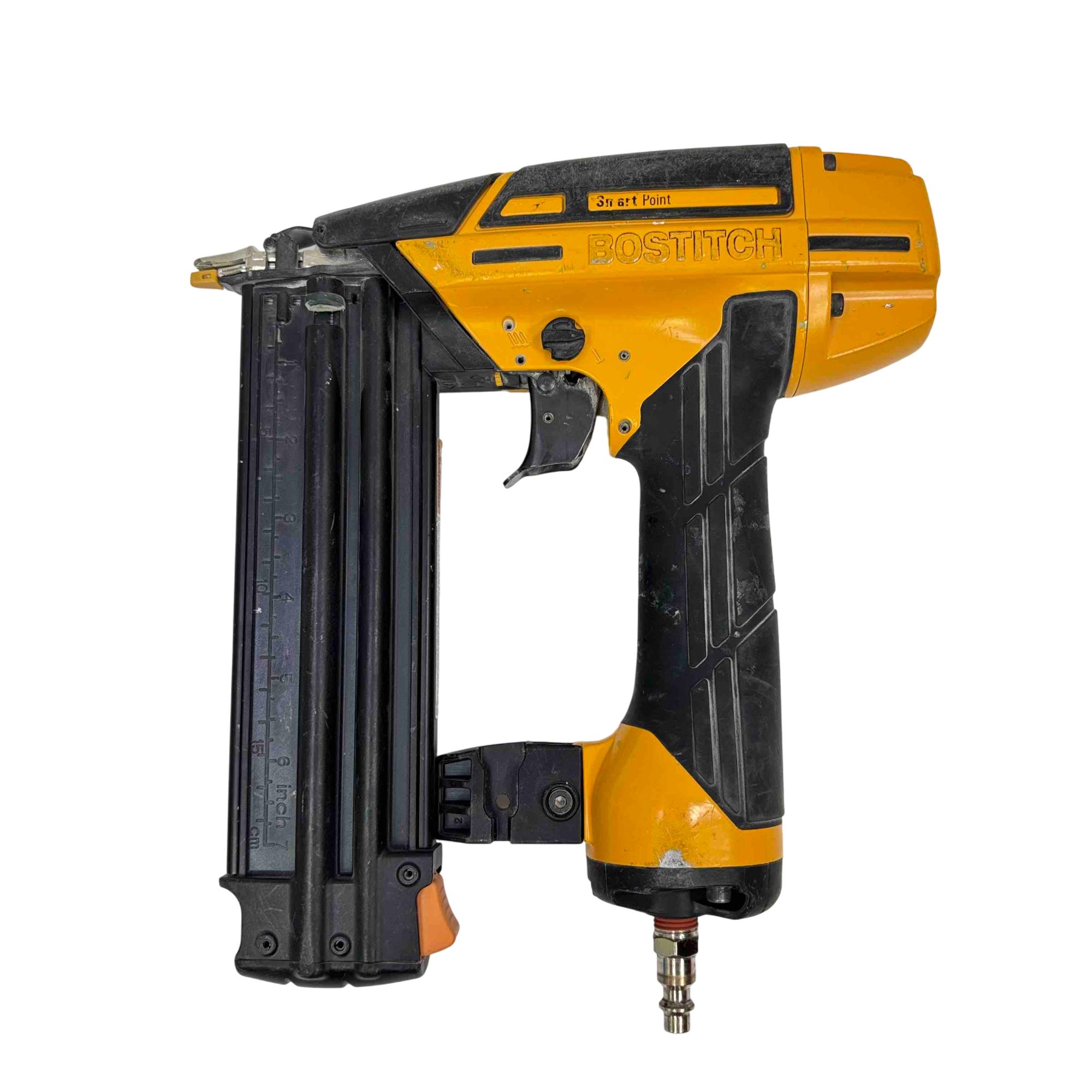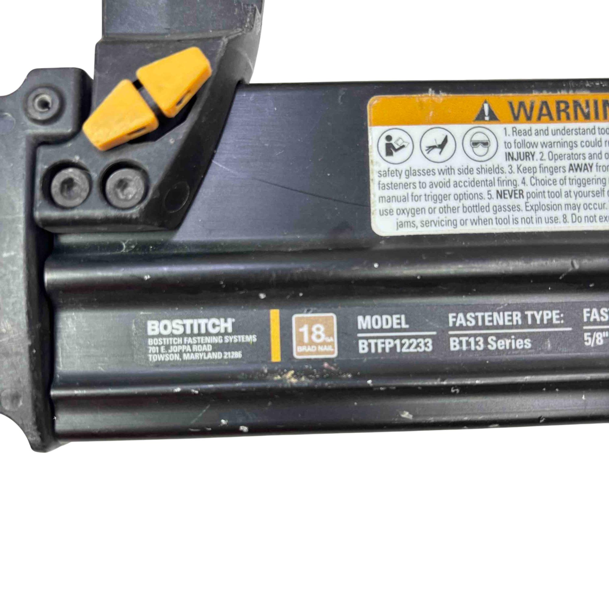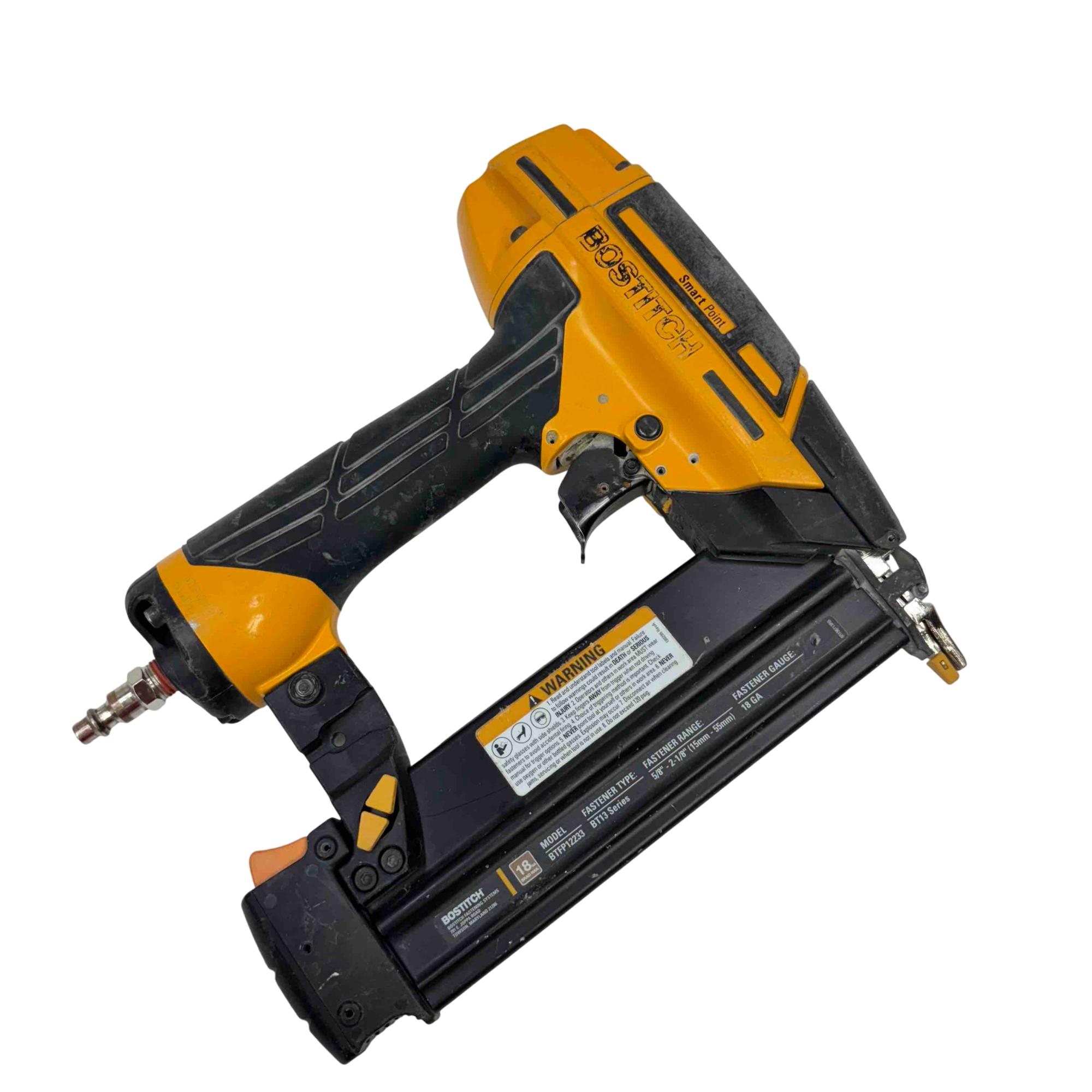 The Bostitch Smart Point 18GA Brad Nailer (Model BTFP12233) is a highly reliable pneumatic tool designed for precise fastening with 18 gauge brad nails ranging from 5/8" to 2-1/8". Its Smart Point technology allows for easy nail placement, reducing work surface damage and increasing productivity. Perfect for professional carpenters and DIY enthusiasts alike, this robust yellow and black tool offers performance and convenience for trim, cabinetry, and finish work.