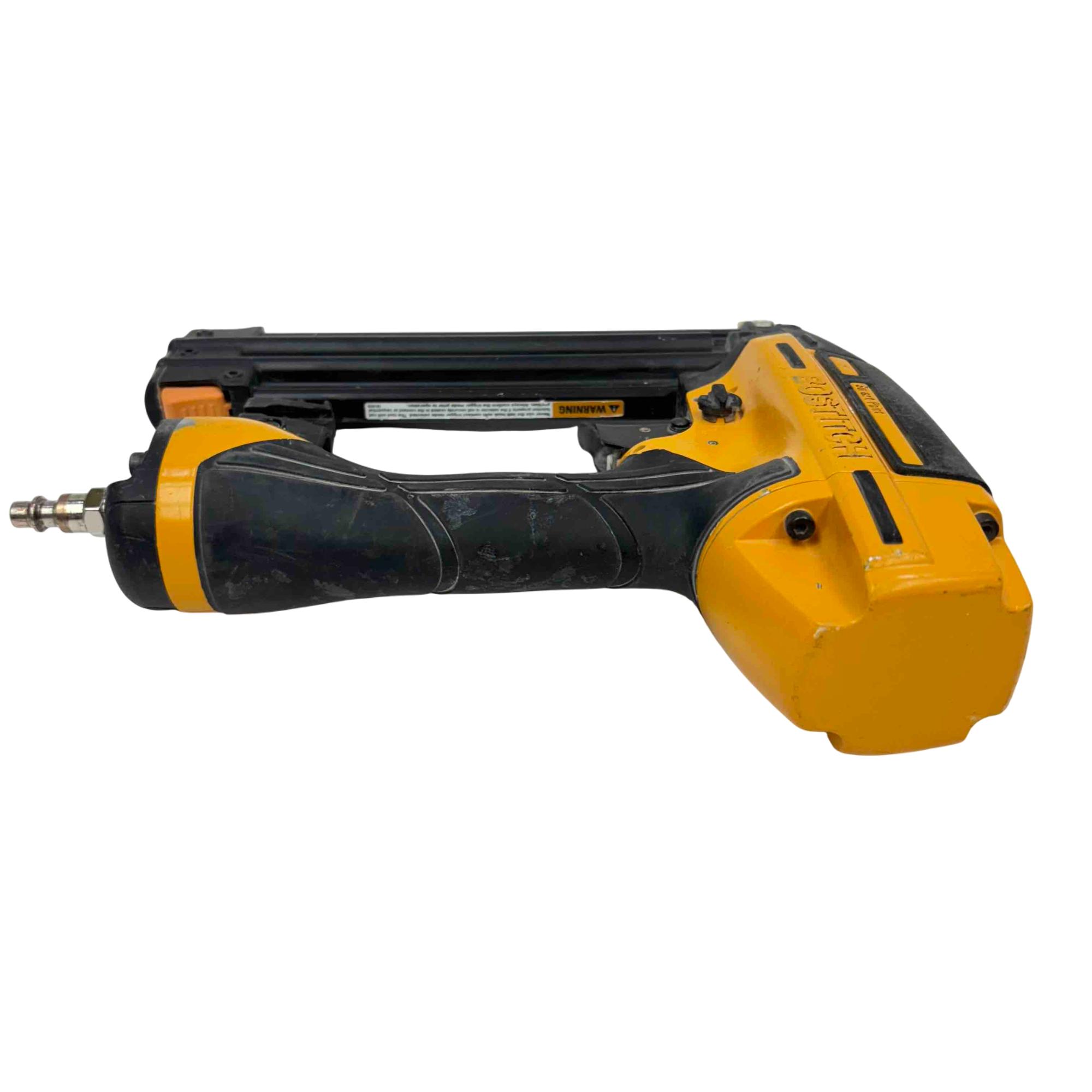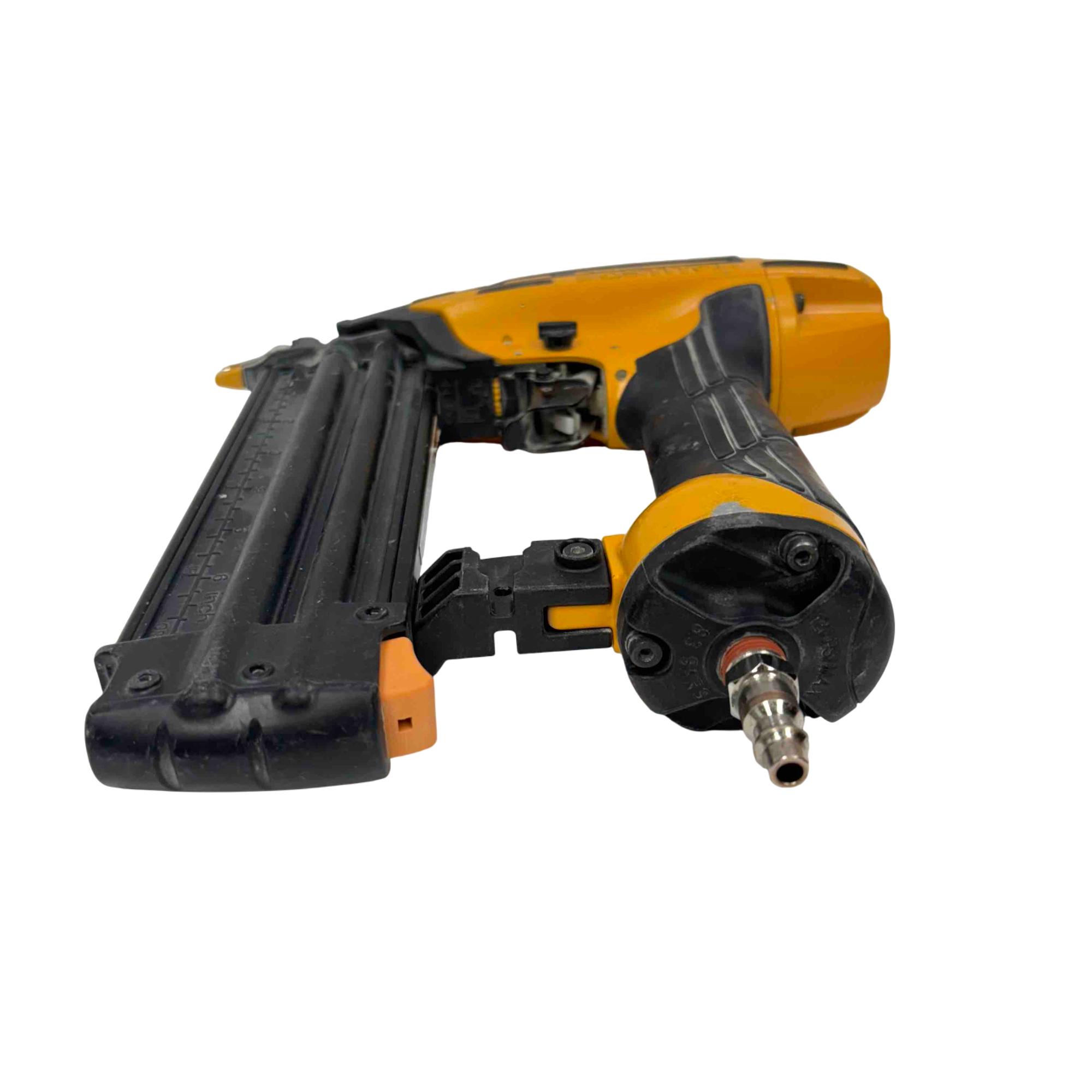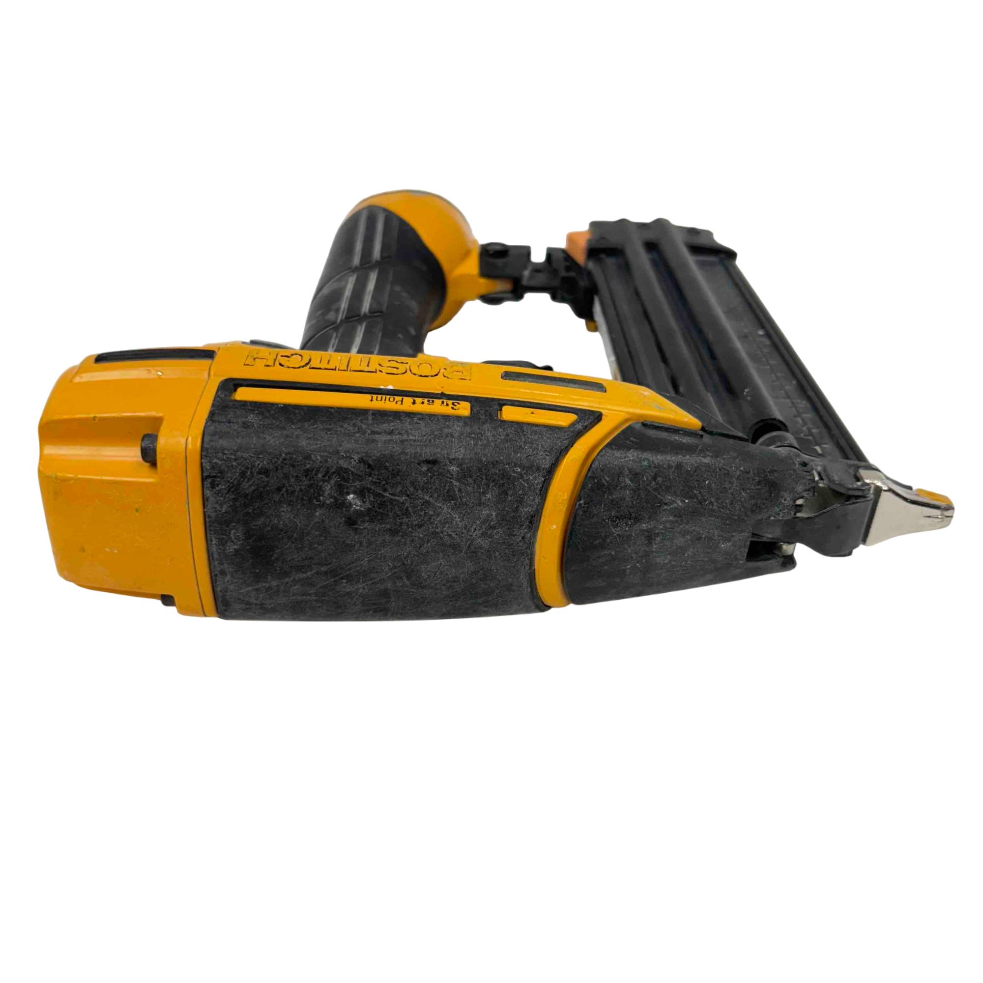 The Bostitch Smart Point 18GA Brad Nailer (Model BTFP12233) is a highly reliable pneumatic tool designed for precise fastening with 18 gauge brad nails ranging from 5/8" to 2-1/8". Its Smart Point technology allows for easy nail placement, reducing work surface damage and increasing productivity. Perfect for professional carpenters and DIY enthusiasts alike, this robust yellow and black tool offers performance and convenience for trim, cabinetry, and finish work.