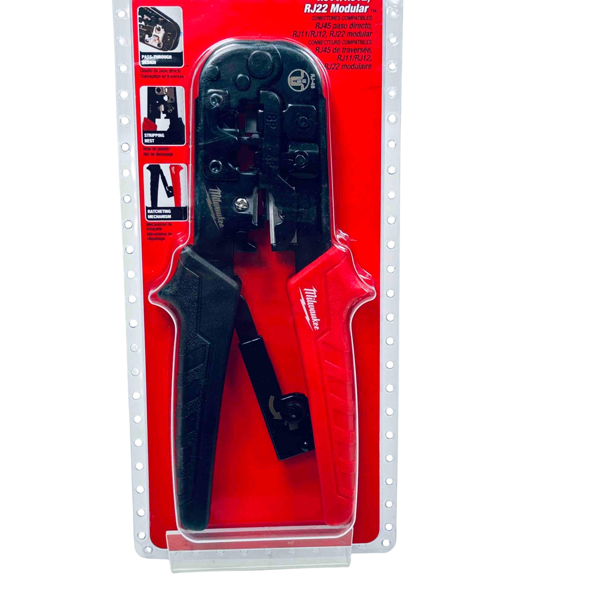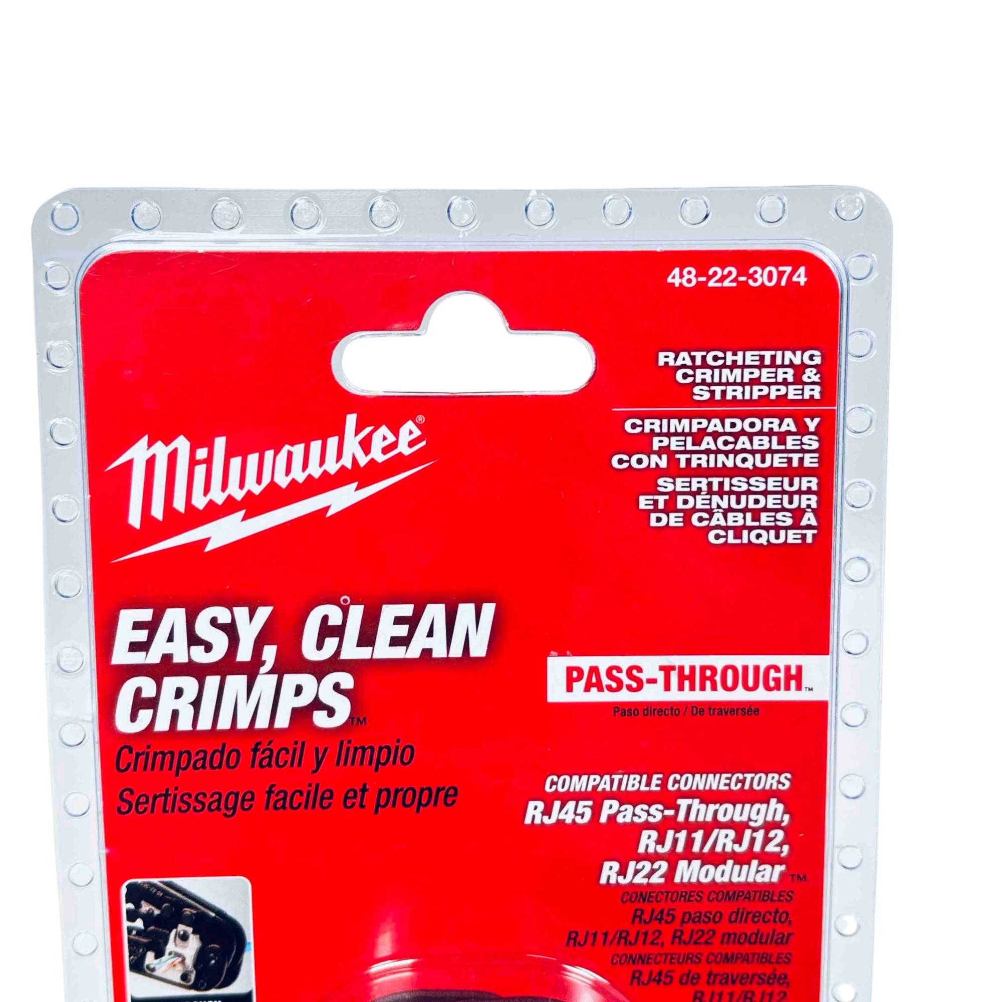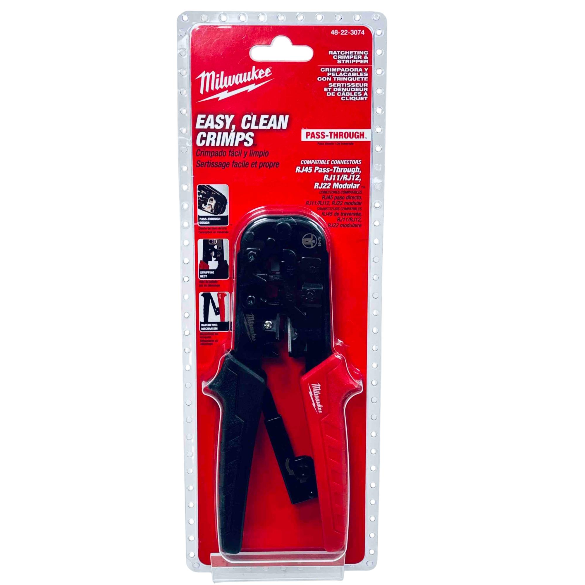 Achieve easy, clean crimps every time with the Milwaukee 48-22-3074 Ratcheting Crimper & Stripper, designed for efficient and professional networking installations. Compatible with pass-through RJ45, RJ11, RJ12, and RJ22 modular connectors, this rugged tool features a ratcheting mechanism and stripping nest for quick, precise results. Ideal for electricians and DIYers, it delivers the unmatched durability and ergonomic comfort you expect from Milwaukee.