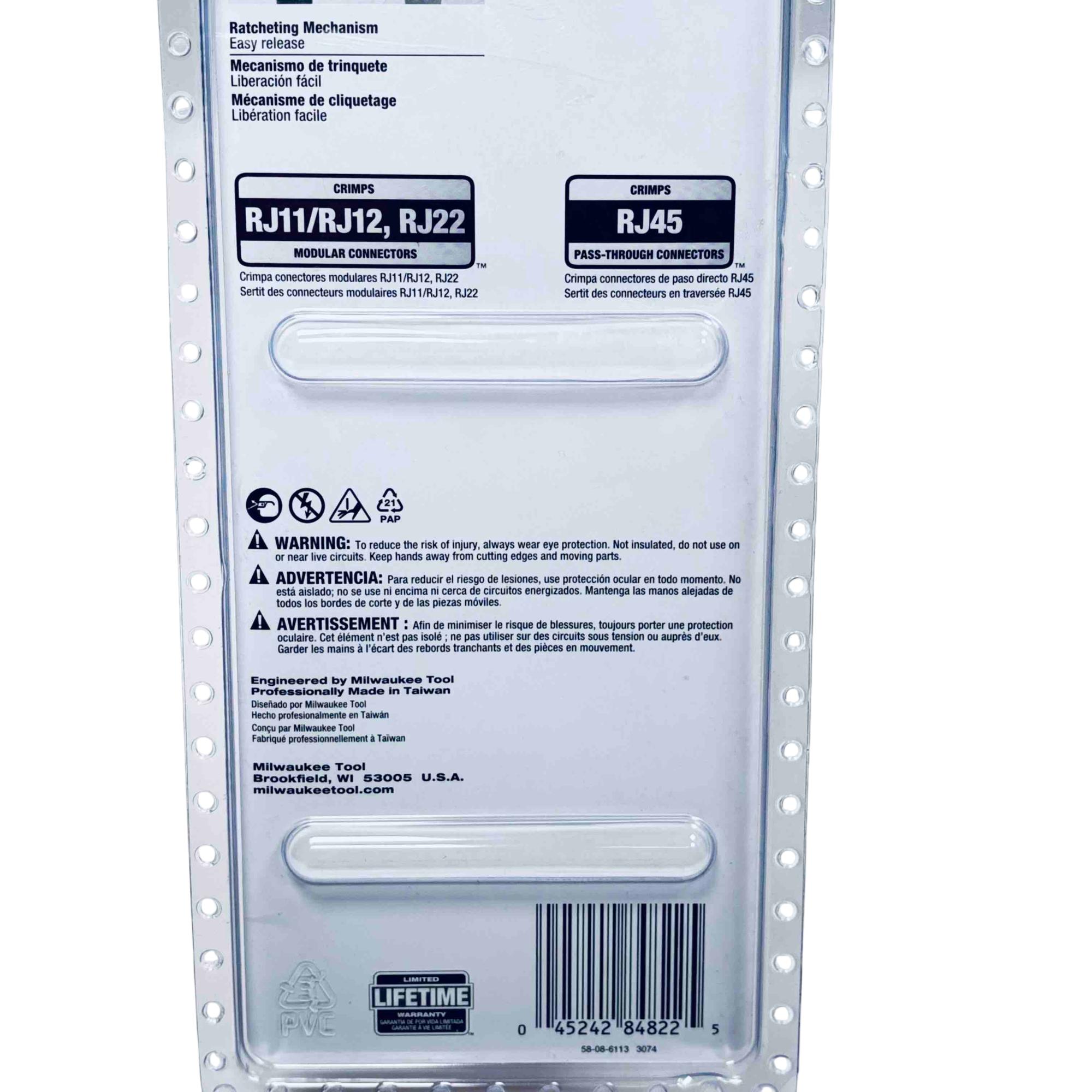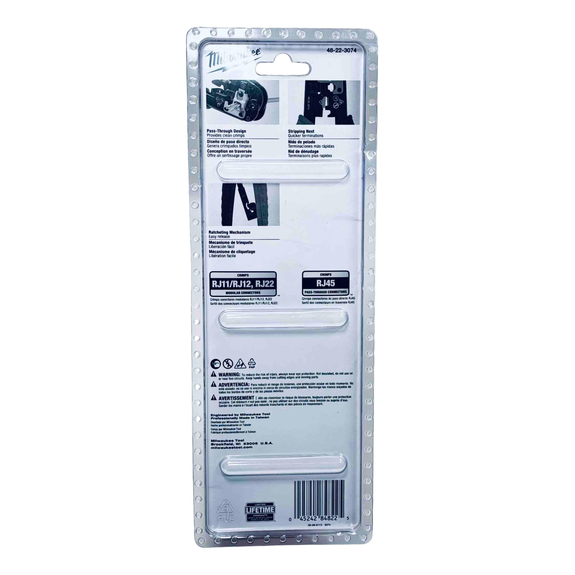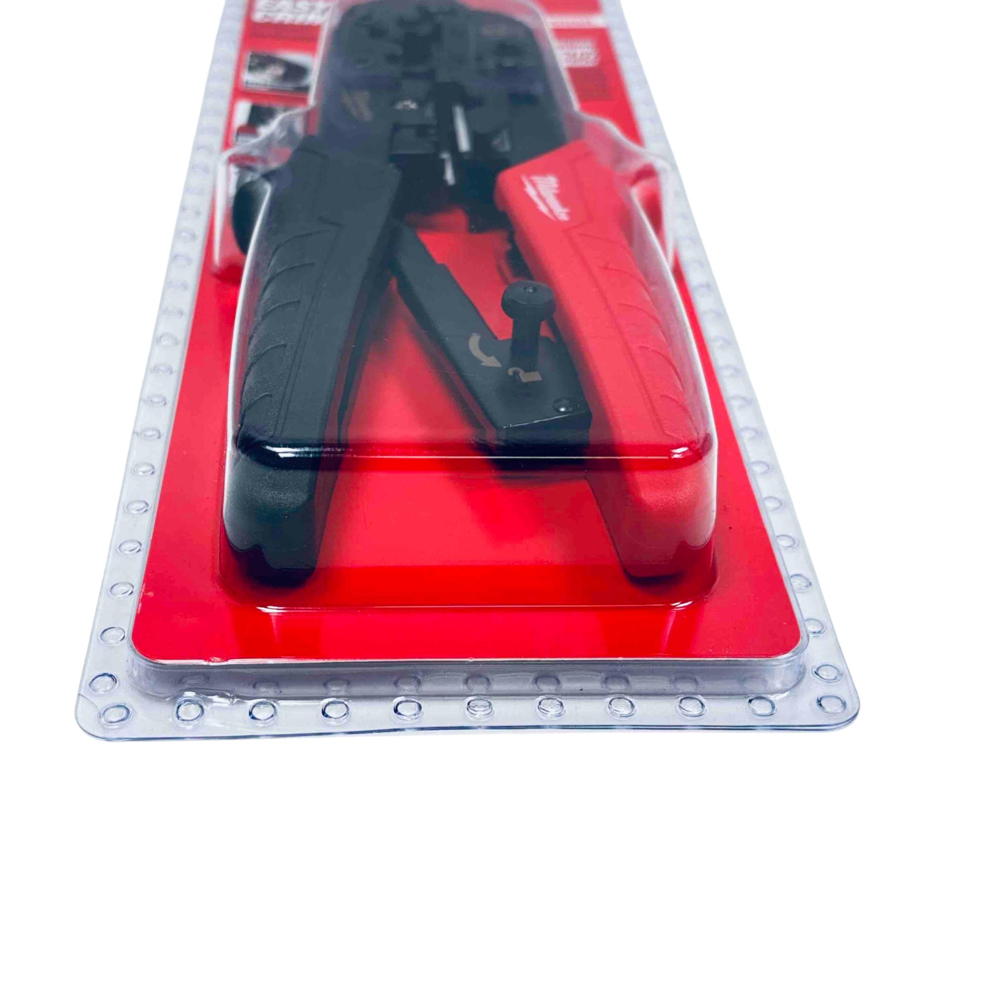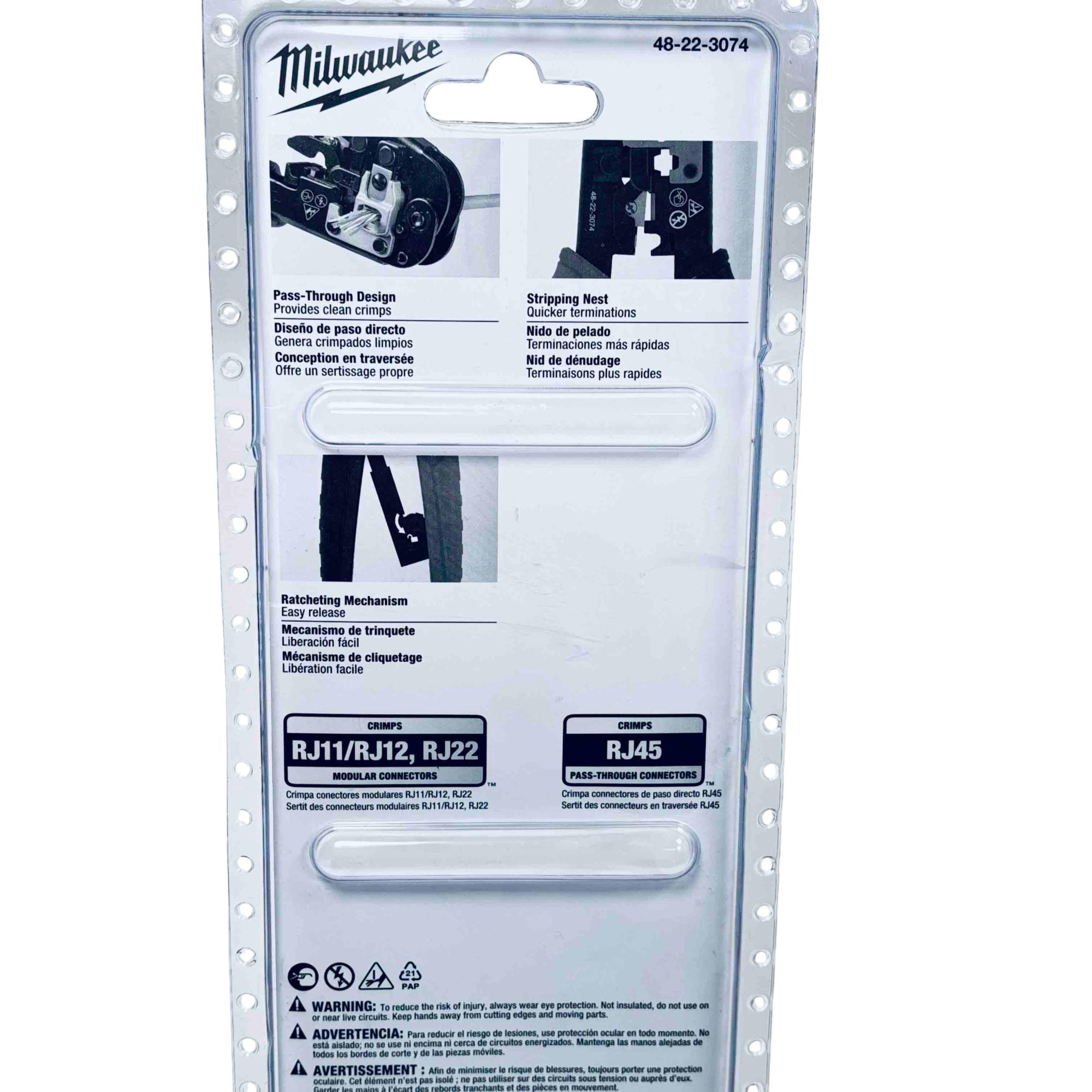 Achieve easy, clean crimps every time with the Milwaukee 48-22-3074 Ratcheting Crimper & Stripper, designed for efficient and professional networking installations. Compatible with pass-through RJ45, RJ11, RJ12, and RJ22 modular connectors, this rugged tool features a ratcheting mechanism and stripping nest for quick, precise results. Ideal for electricians and DIYers, it delivers the unmatched durability and ergonomic comfort you expect from Milwaukee.