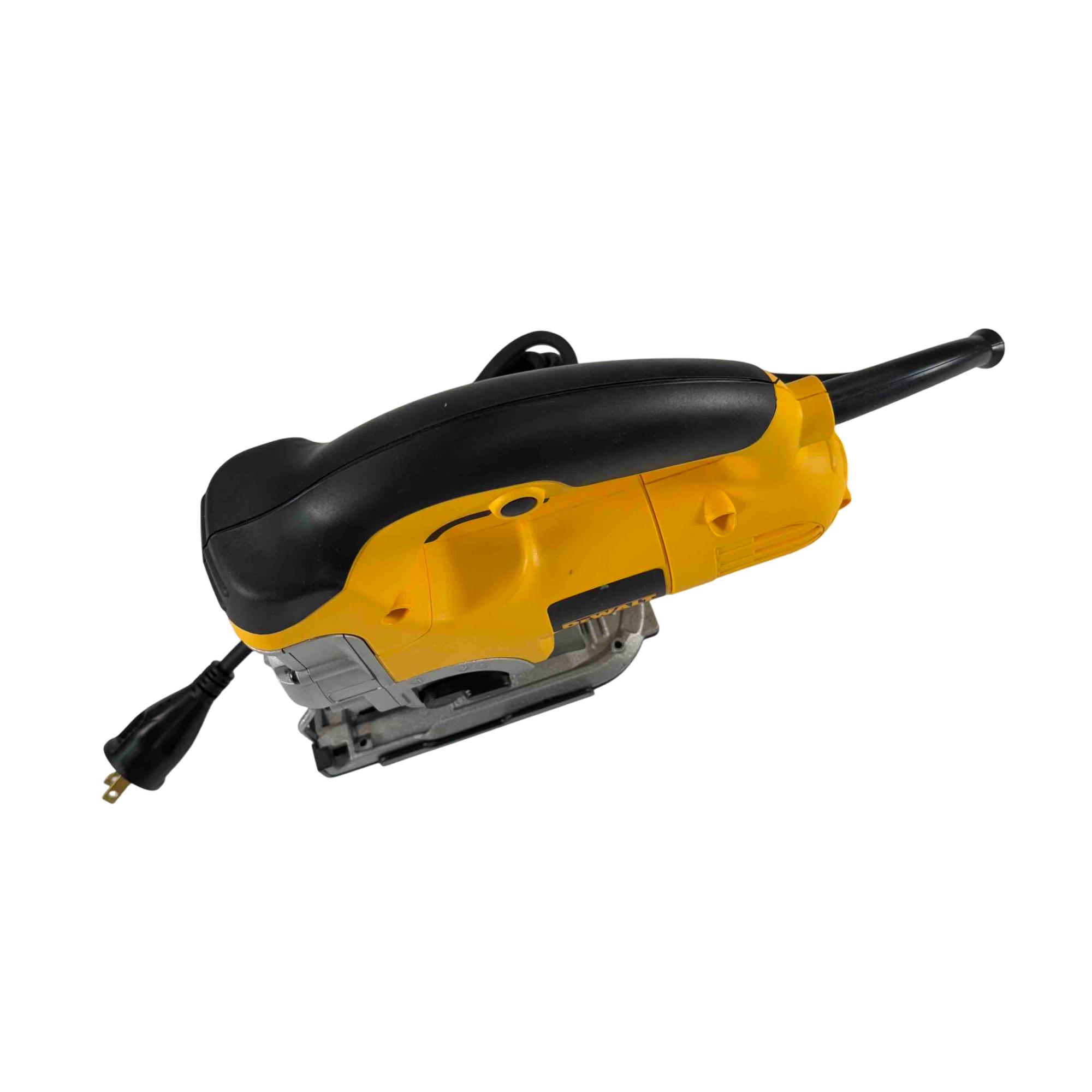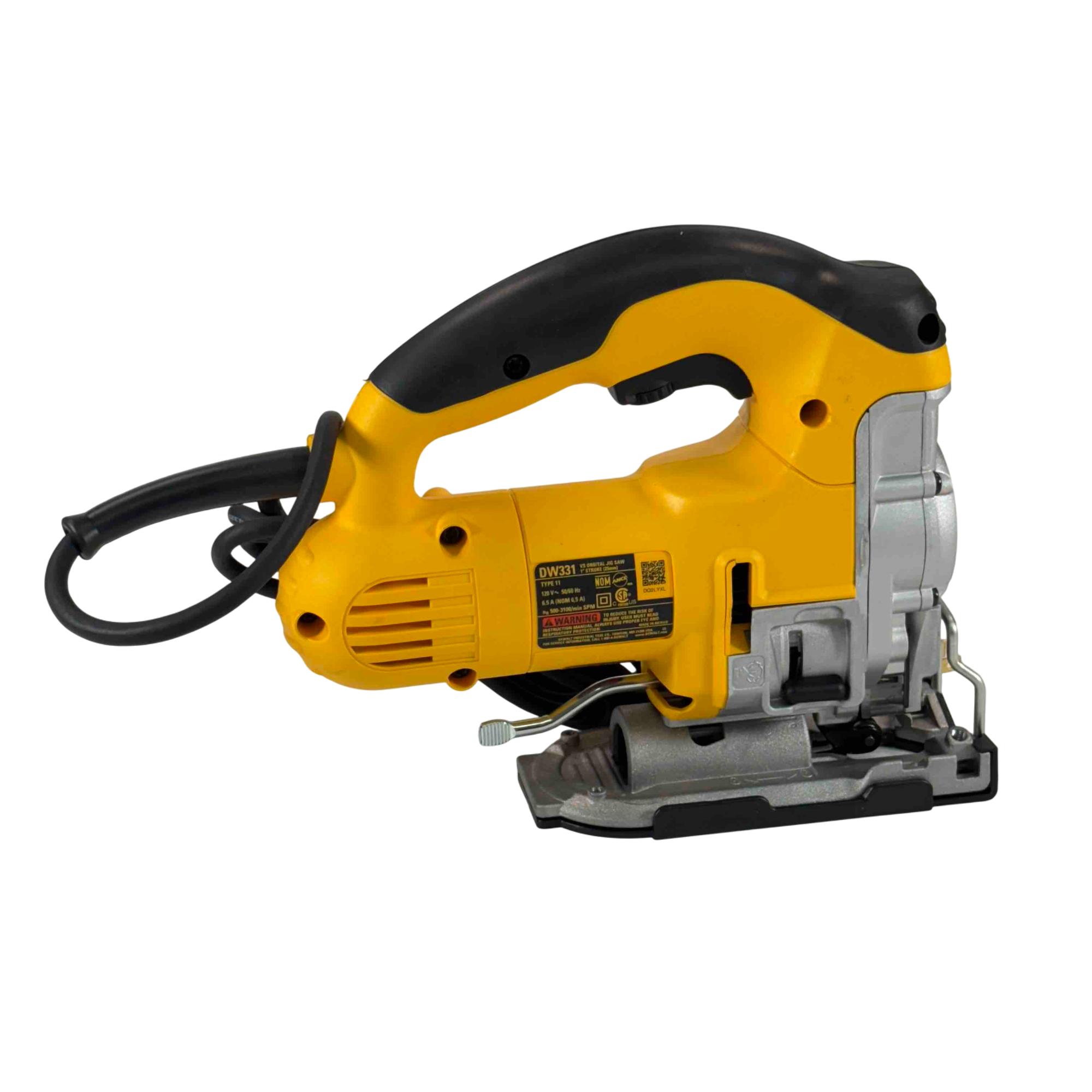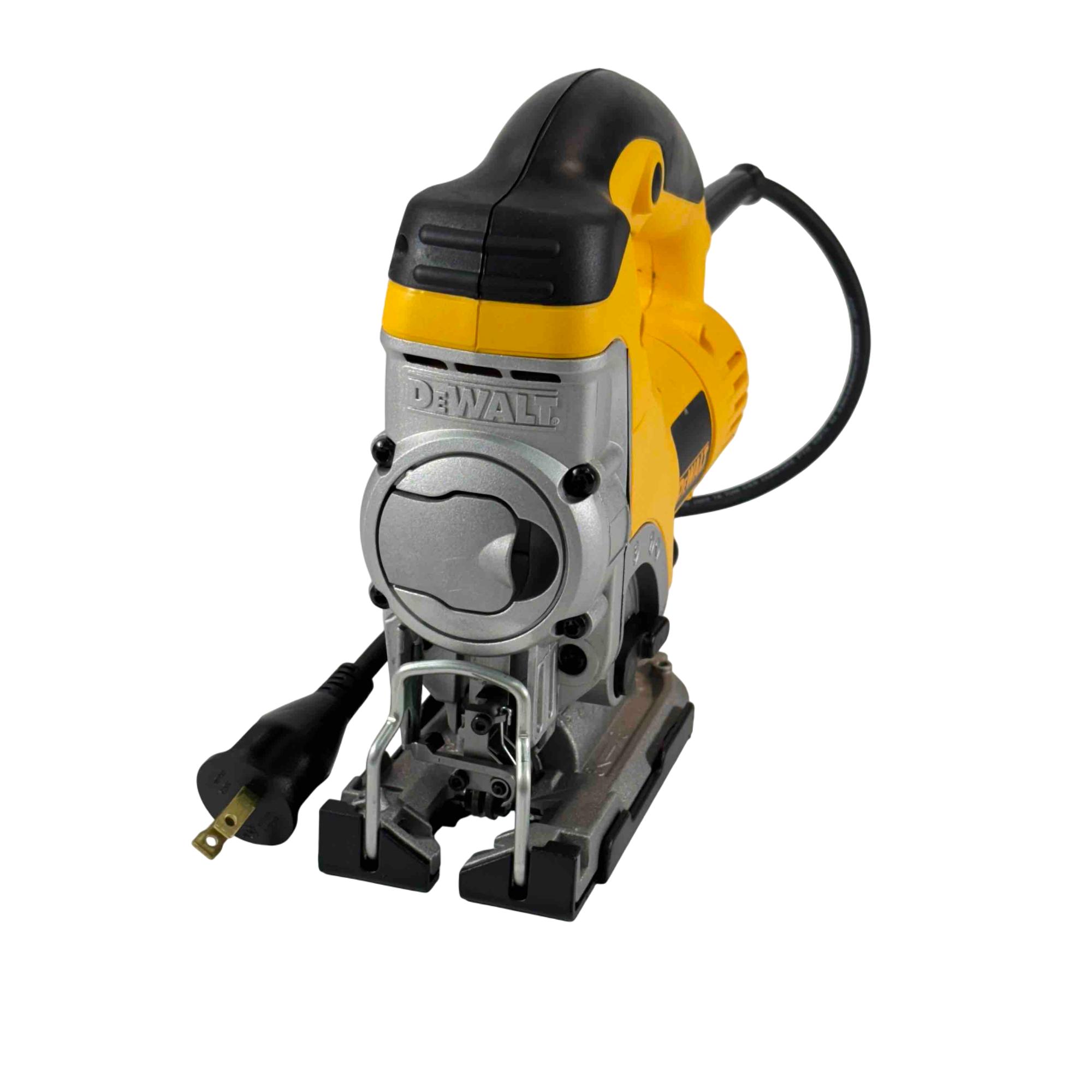 This jigsaw features a powerful motor designed to tackle demanding materials with ease. The extra-large front-facing blade clamp lever and lever-action, keyless blade change system make swaps quick and hassle-free. Its adjustable base plate allows for bevel cuts up to 45 degrees, while the adjustable shoe enhances cutting stability. A no-mar shoe cover helps protect surfaces from scratches, and the top handle with trigger switch provides a secure grip and precise control. The all-metal gear case adds durability, and the 8-foot power cord offers extended reach for flexible operation.
