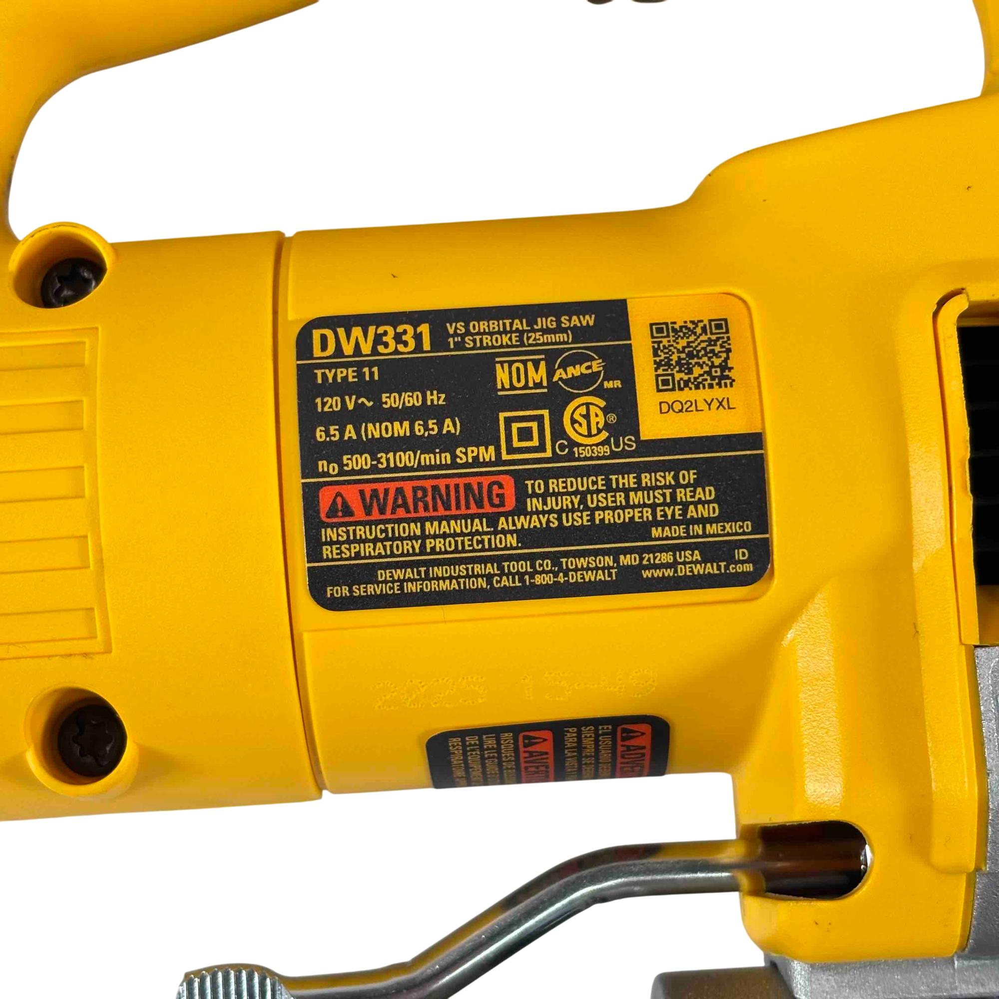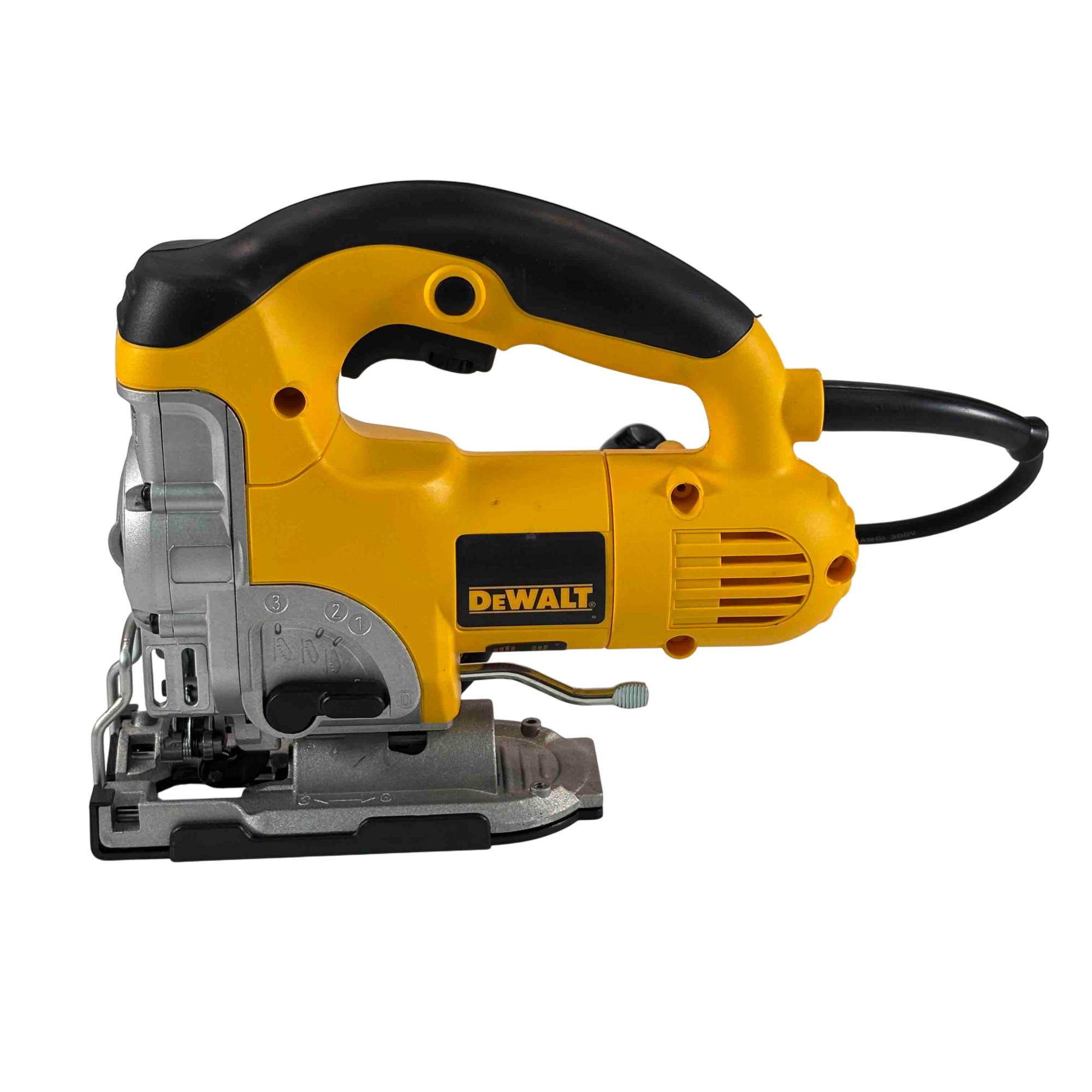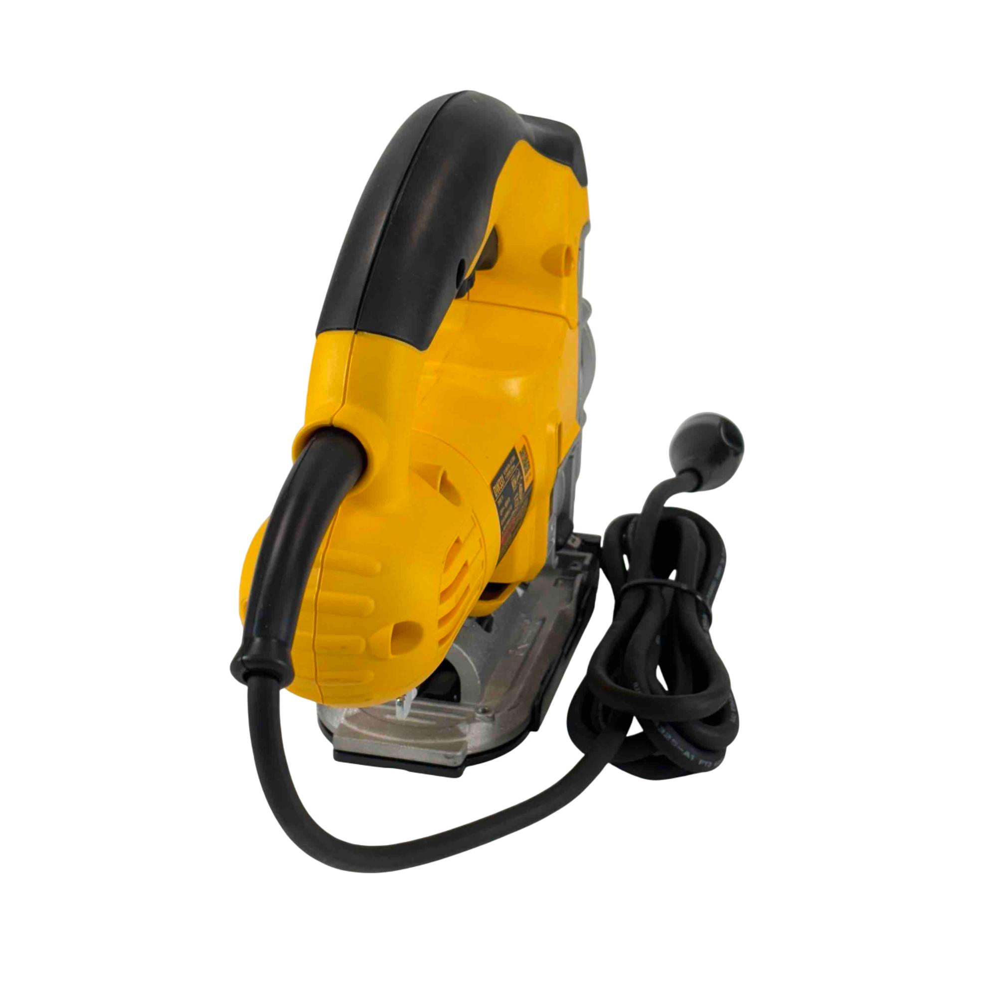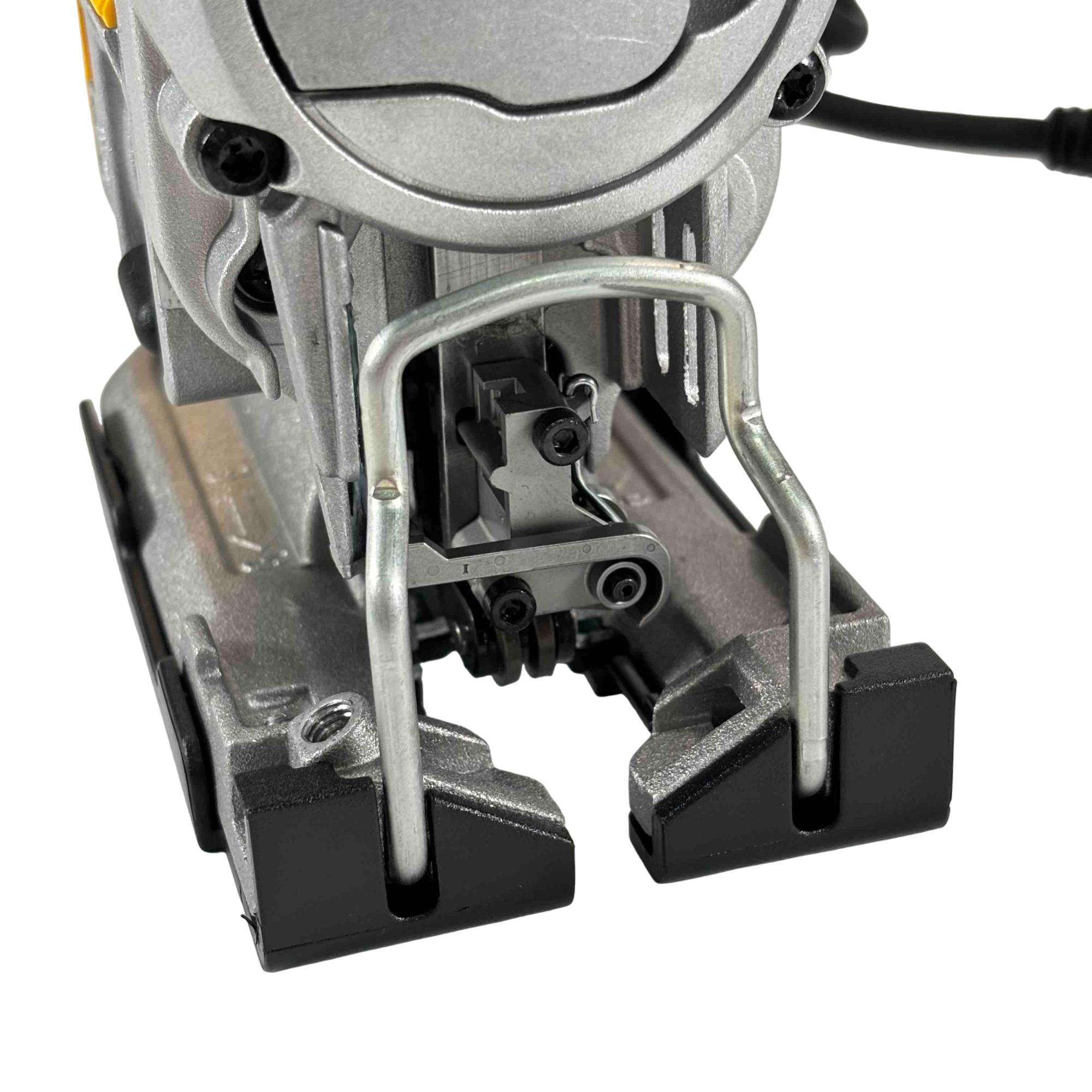 This jigsaw features a powerful motor designed to tackle demanding materials with ease. The extra-large front-facing blade clamp lever and lever-action, keyless blade change system make swaps quick and hassle-free. Its adjustable base plate allows for bevel cuts up to 45 degrees, while the adjustable shoe enhances cutting stability. A no-mar shoe cover helps protect surfaces from scratches, and the top handle with trigger switch provides a secure grip and precise control. The all-metal gear case adds durability, and the 8-foot power cord offers extended reach for flexible operation.