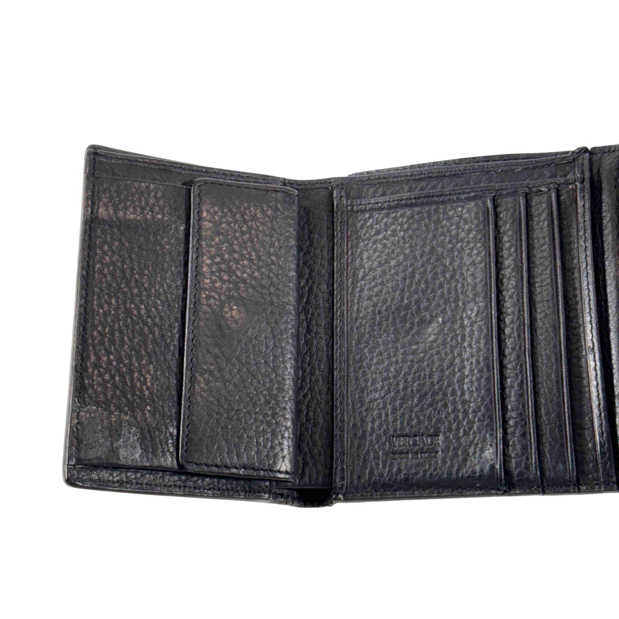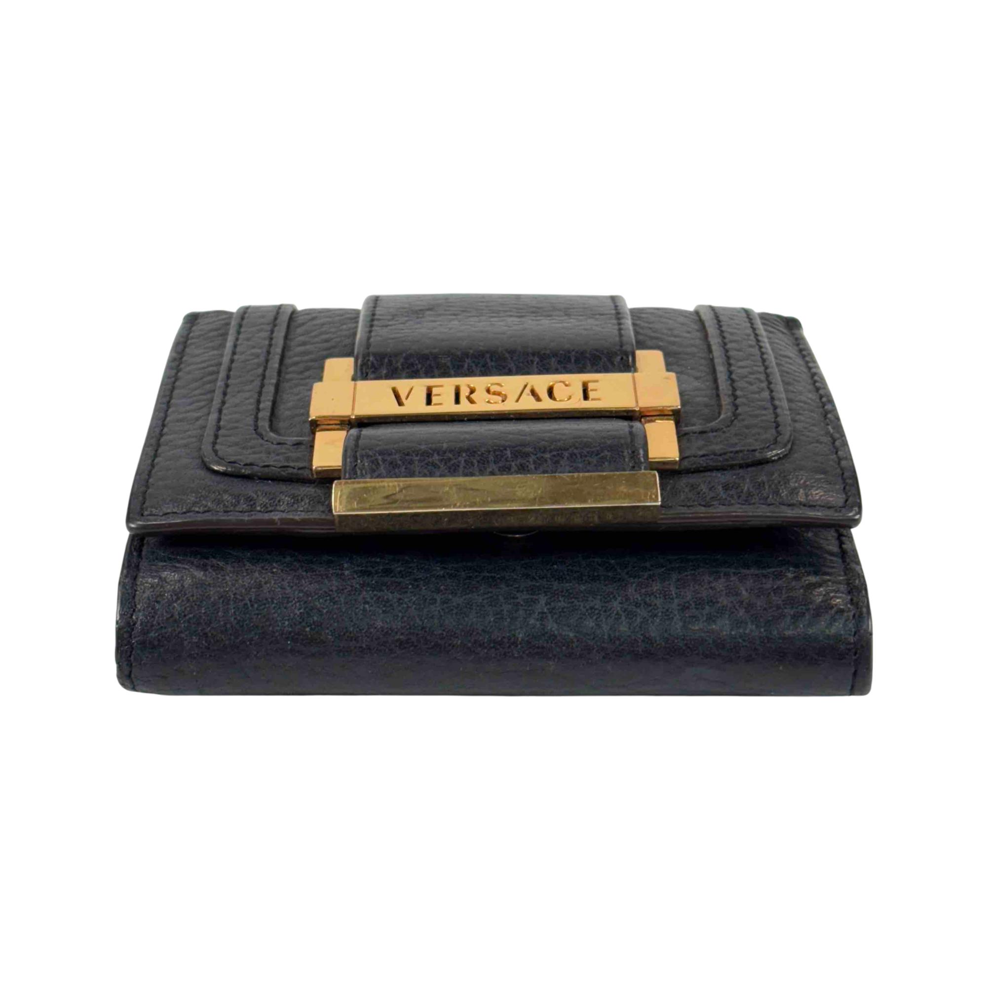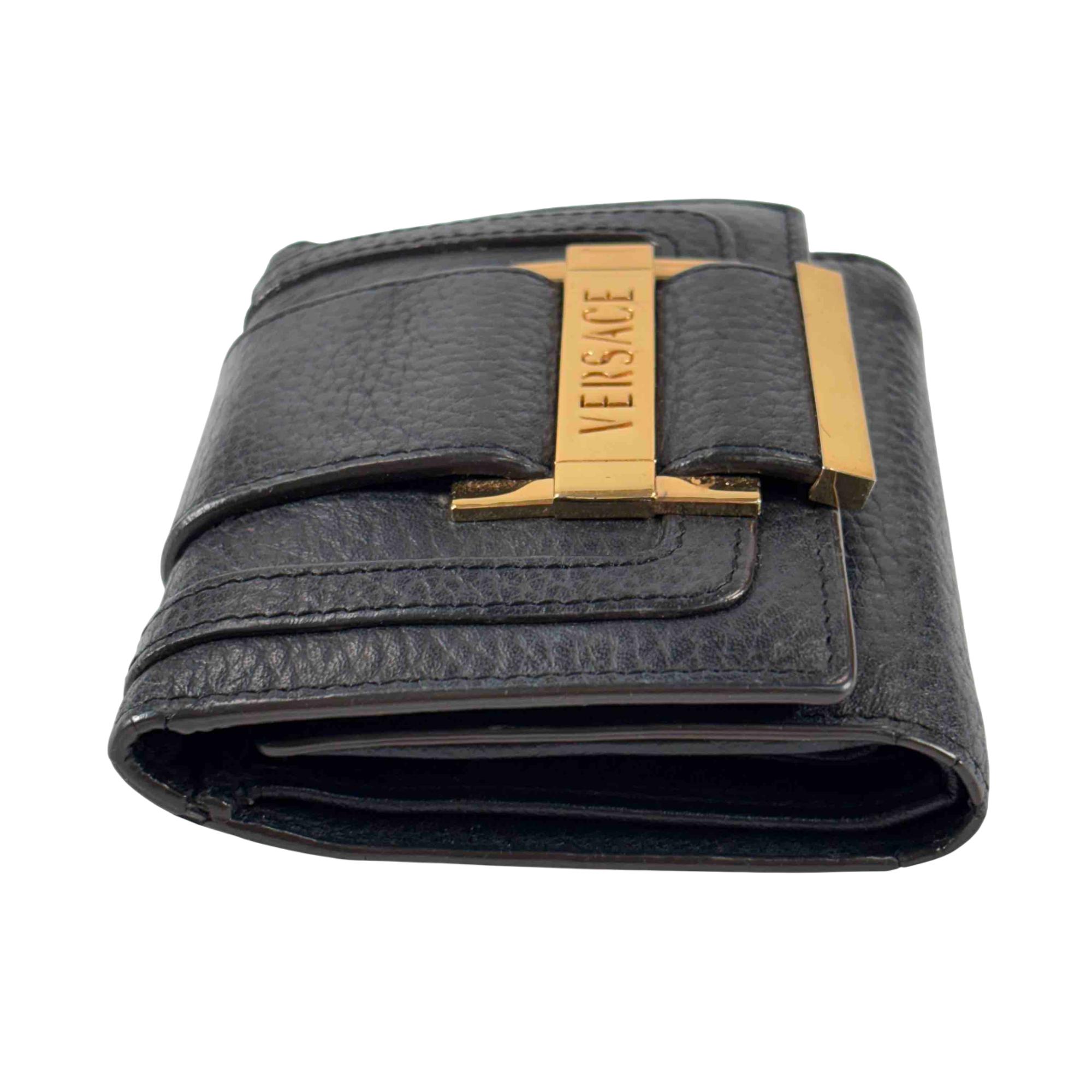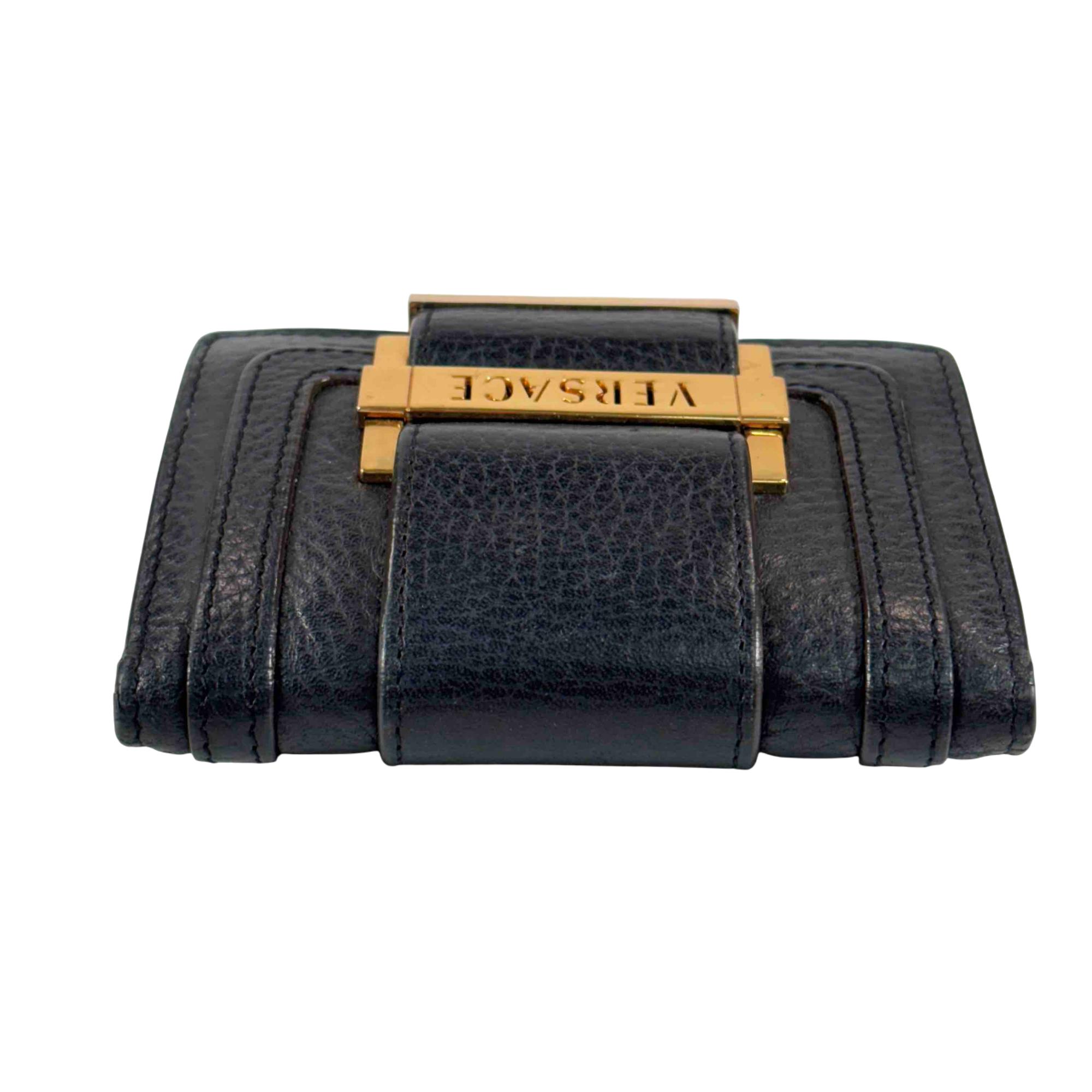 This authentic Versace black leather wallet is the epitome of luxury accessory fashion, featuring a chic gold buckle prominently engraved with the iconic Versace logo. Designed with multiple compartments for cards and cash, this wallet makes a sophisticated statement for any occasion. Crafted from premium leather, it delivers both durability and a timeless look for the discerning style enthusiast.