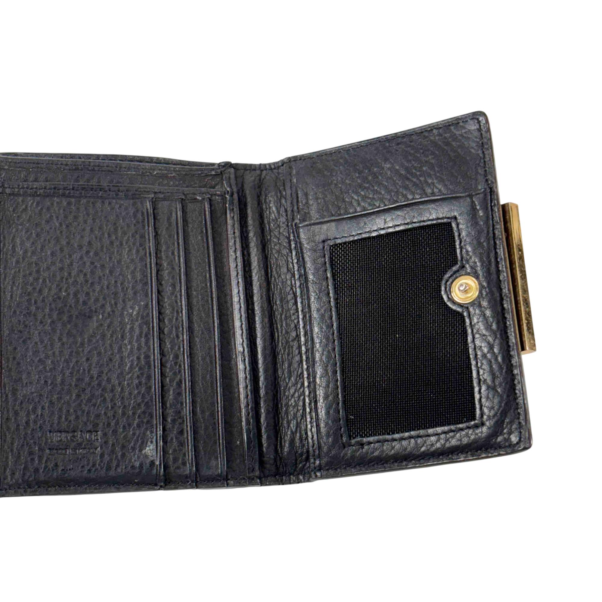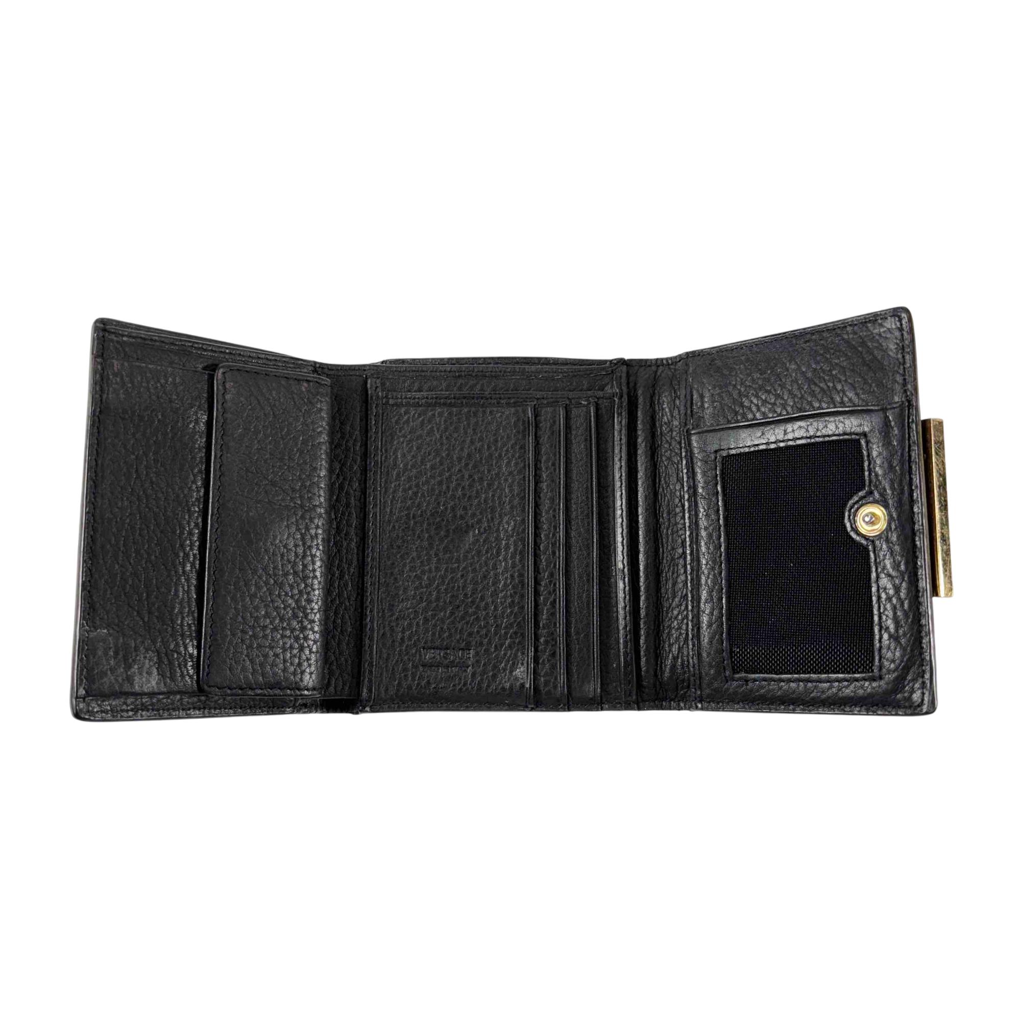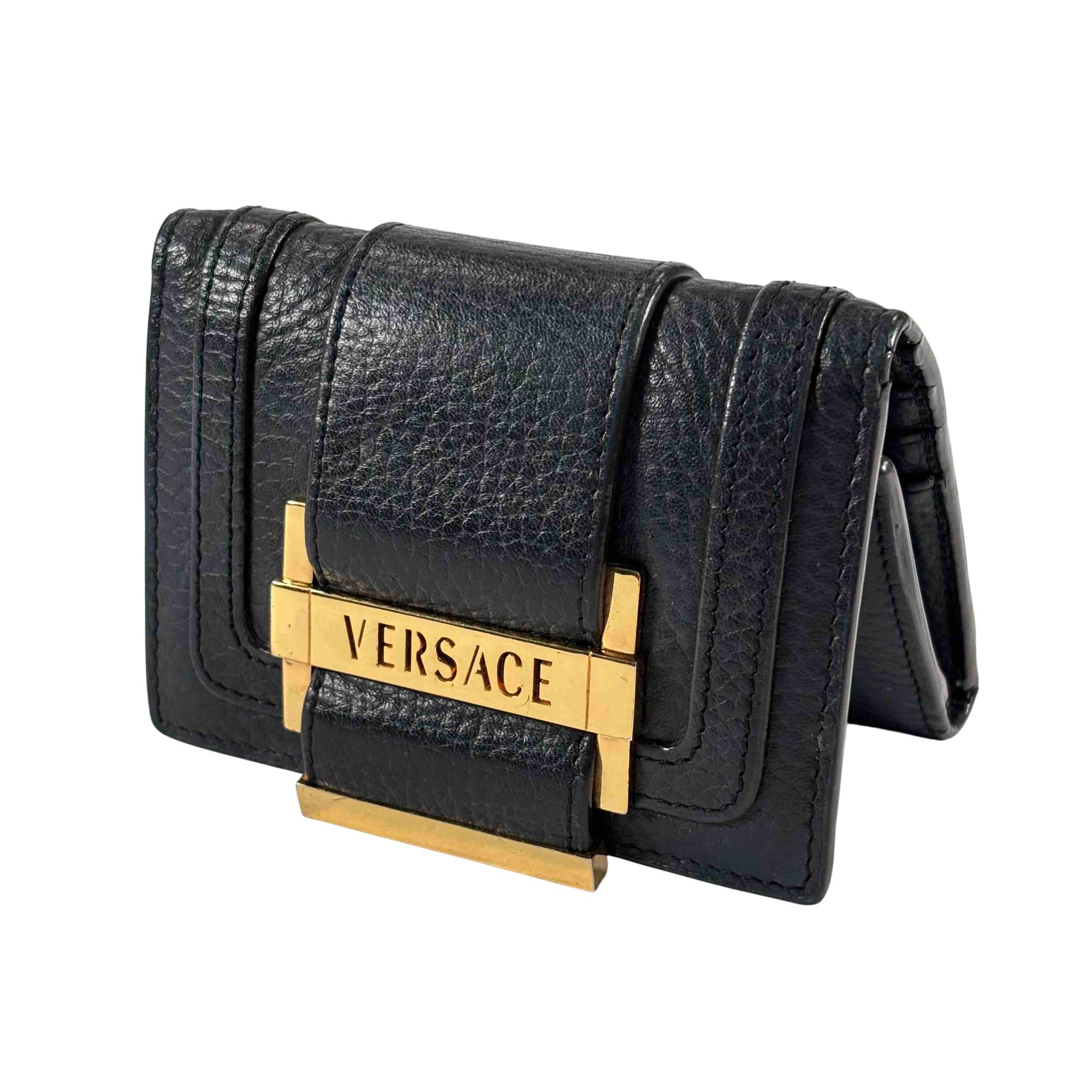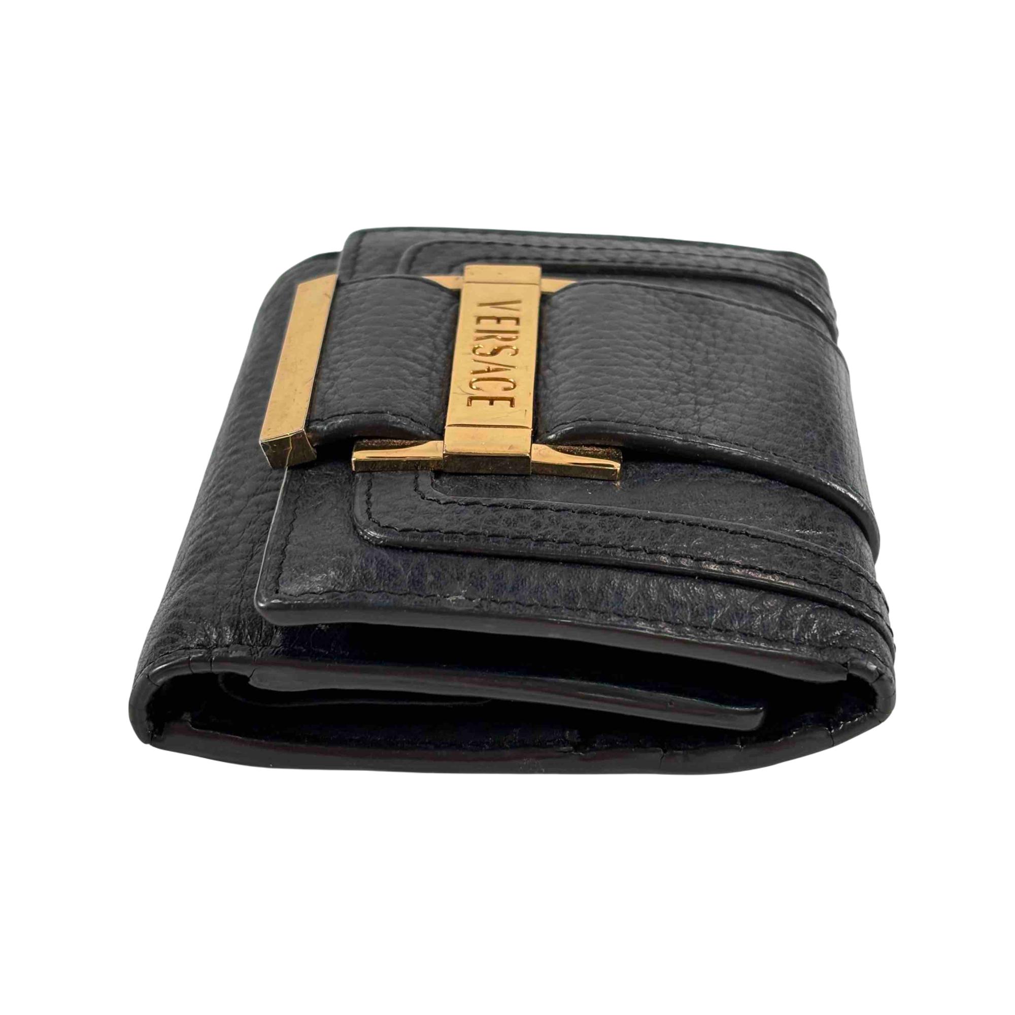 This authentic Versace black leather wallet is the epitome of luxury accessory fashion, featuring a chic gold buckle prominently engraved with the iconic Versace logo. Designed with multiple compartments for cards and cash, this wallet makes a sophisticated statement for any occasion. Crafted from premium leather, it delivers both durability and a timeless look for the discerning style enthusiast.