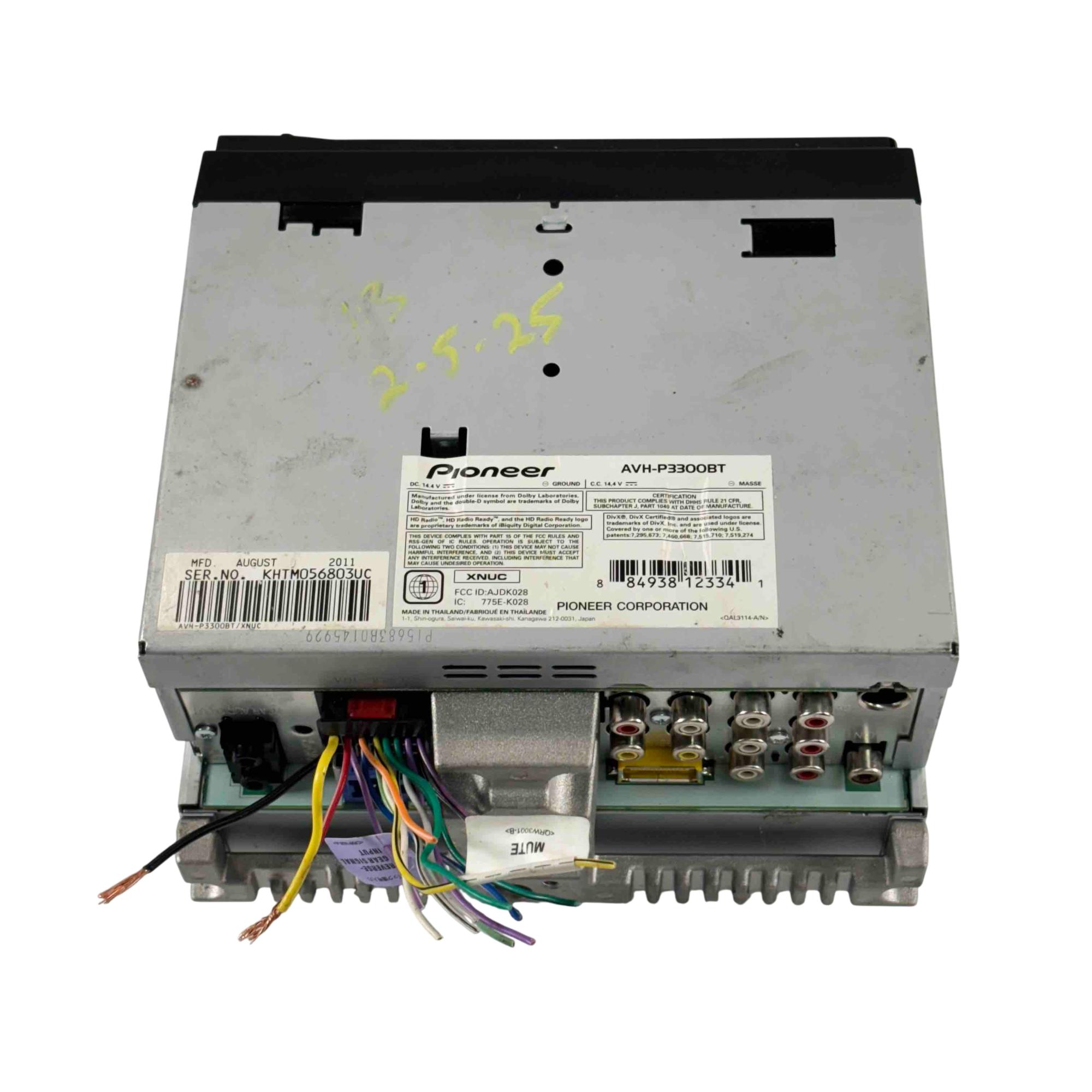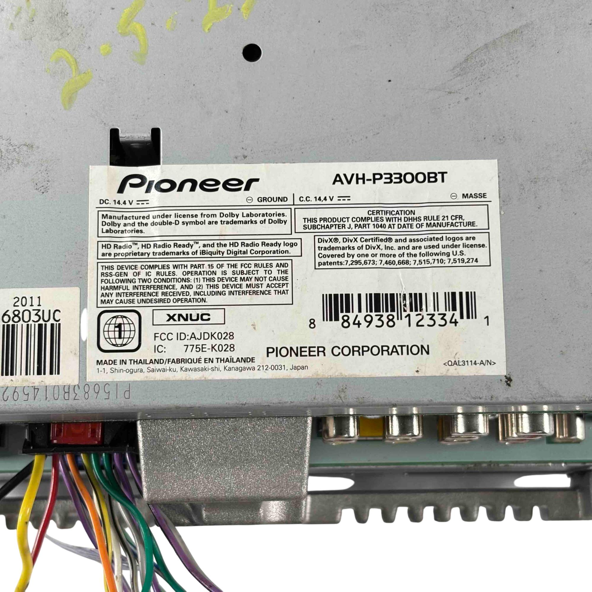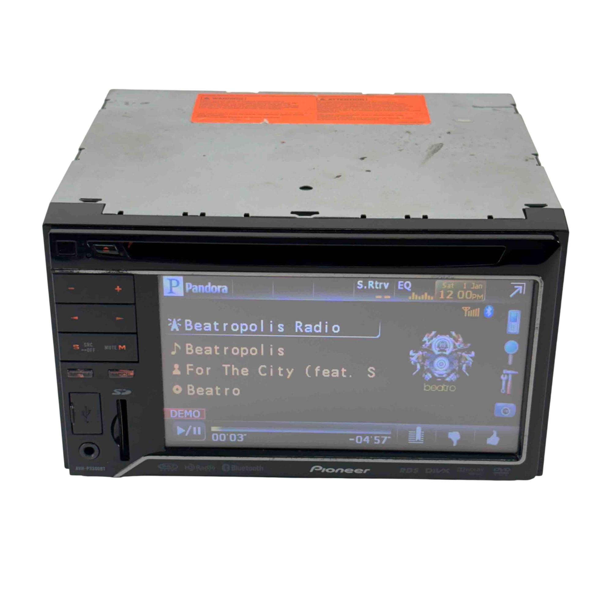 Pioneer AVH-P3300BT Car Audio Double-DIN Touchscreen DVD Receiver. Features a 5.8 inch color touchscreen with multi-angle adjustments for intuitive control. Includes built-in Bluetooth for hands-free calling and Pandora Link for iPhone to control Pandora stations via USB (optional cable required). Plays MP3 WMA AAC and DivX files from CD DVD SD or SDHC cards plus JPEG images. Delivers 14 watts RMS per channel with an 8-band equalizer high/low-pass filters and Advanced Sound Retriever for enhanced audio. Supports iPod audio control satellite radio HD Radio navigation module and rear-view camera (all optional). Offers front A/V USB SD card inputs and 4-volt preamp outputs for front rear and subwoofer. Five customizable display colors and button illumination. Fits double-DIN dash openings weighs 5.3 pounds for versatile in-car entertainment.