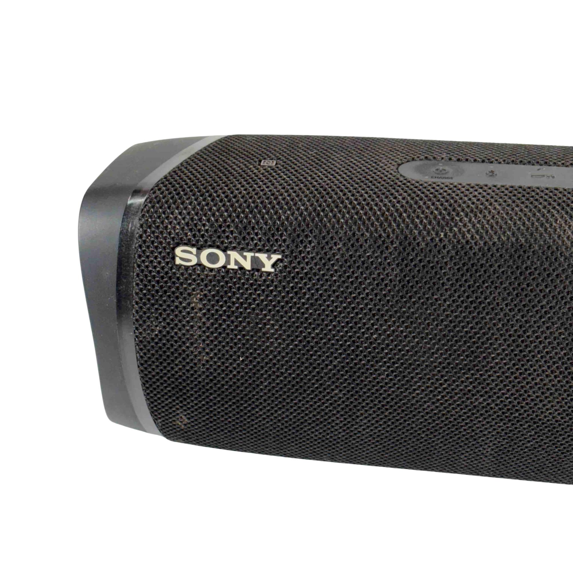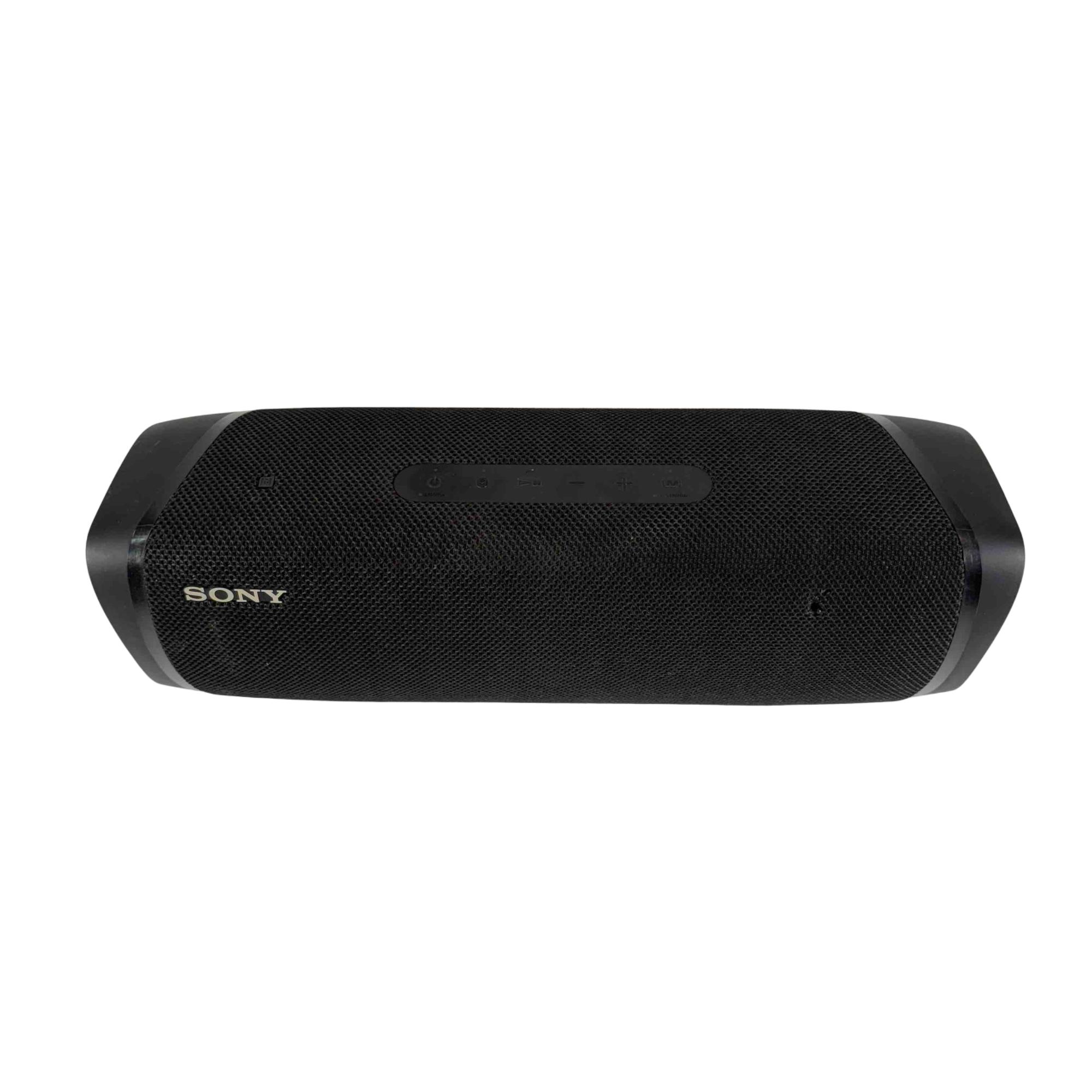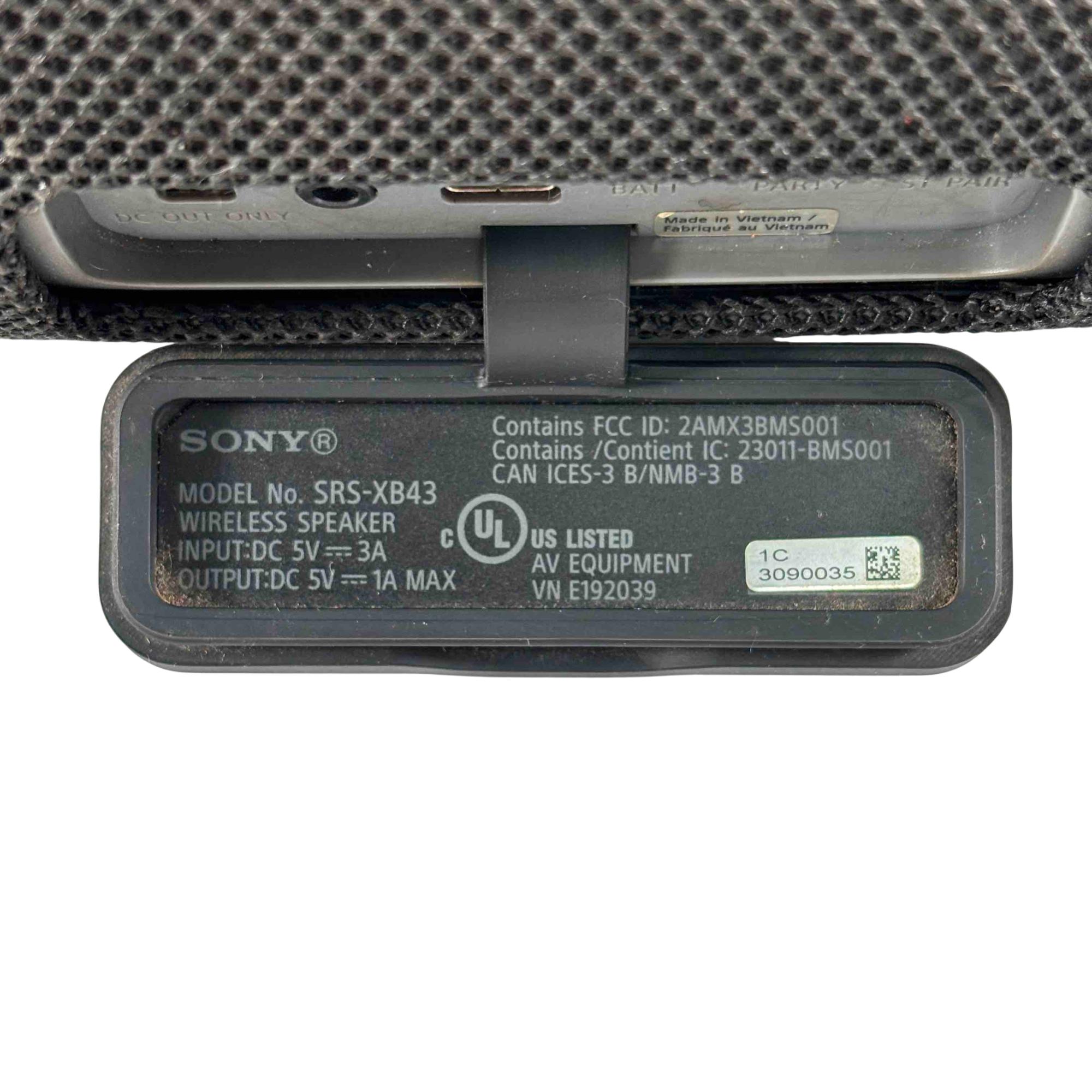 Sony SRS-XB43 Extra Bass Portable Bluetooth Speaker. Features powerful Extra Bass and Live Sound mode for immersive 3D audio. Connects up to 100 compatible speakers via Party Connect for synced music and lights with customizable patterns. Offers speakerphone function for hands-free calls and wireless pairing up to 98.4 feet via Bluetooth or NFC. X-Balanced speaker unit with non-circular diaphragm delivers rich high-quality sound. Control playlists and lighting with Sony Music Center and Fiestable apps. IP67 waterproof rustproof and dustproof design in a compact 6.5 pound build with a strap for portability,