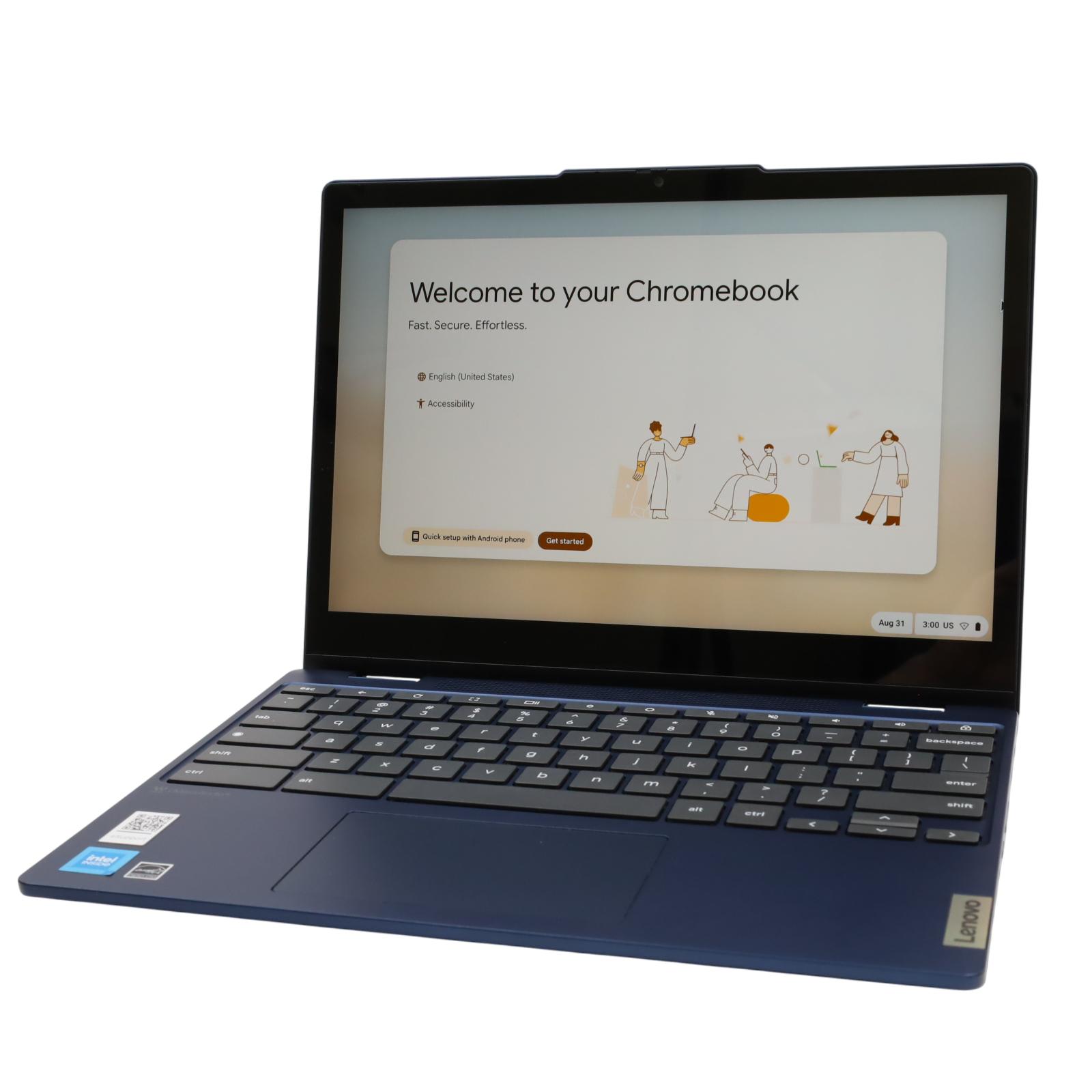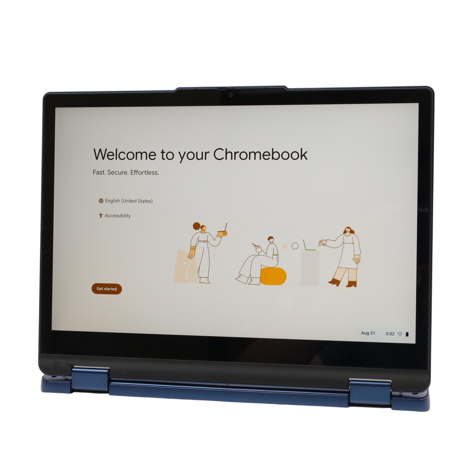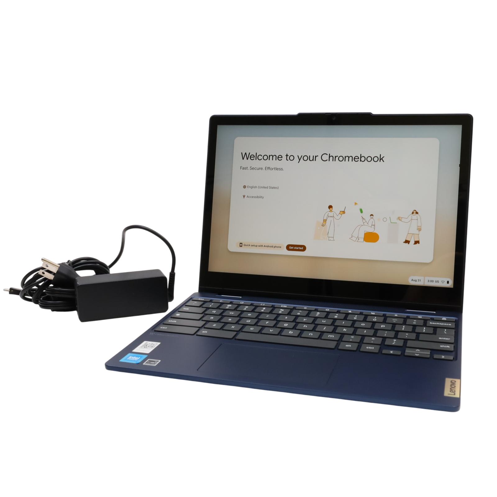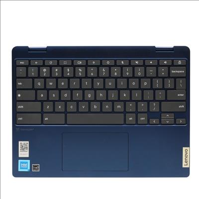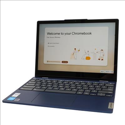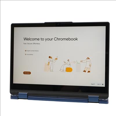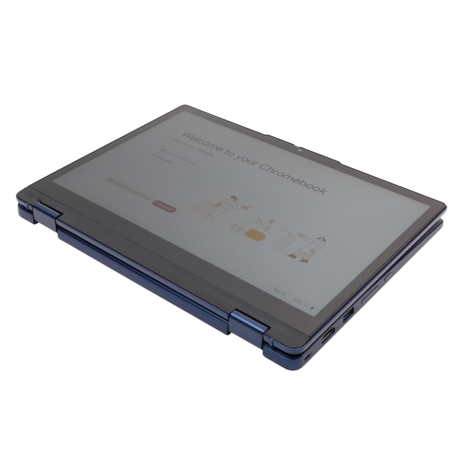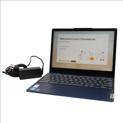 A 12.2-inch 2-in-1 Chromebook designed for portability and everyday use. It features a WUXGA (1920 x 1200) IPS touchscreen with 300-nit brightness and a 60Hz refresh rate, powered by an Intel N100 quad-core processor with Intel UHD integrated graphics. The system comes with 4GB LPDDR5 memory at 4800MHz and 64GB eMMC storage. Connectivity options include 2 USB-A 3.2 ports, 1 USB-C 3.2 port with DisplayPort 1.4 support, and 1 HDMI 1.4 port, along with a headphone/microphone combo jack. The device supports multiple modes with its 360-degree hinge, functioning as a laptop, tablet, tent, or stand, and includes a physical webcam shutter for privacy.
