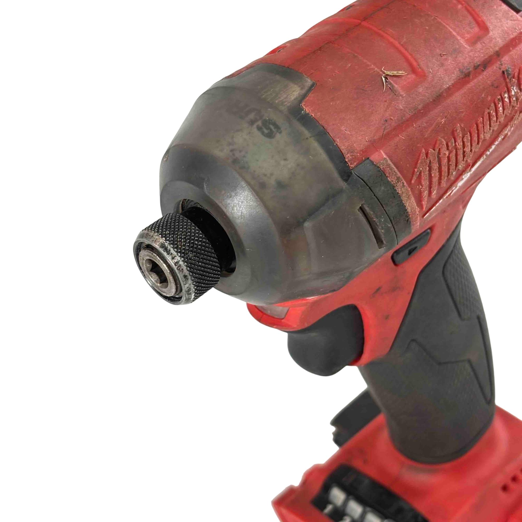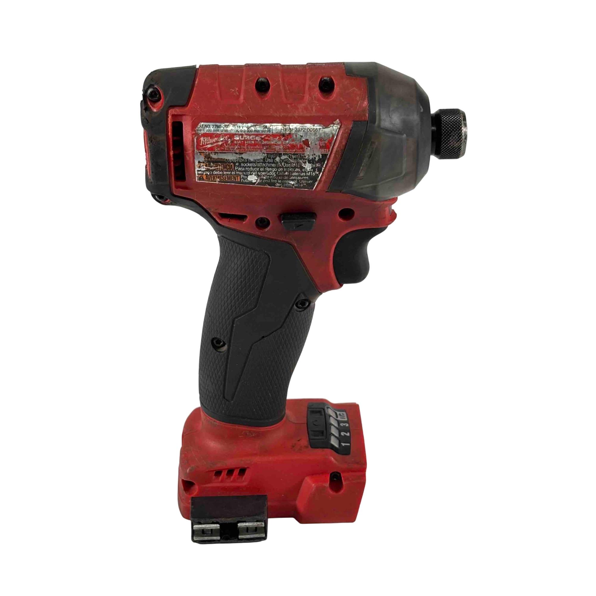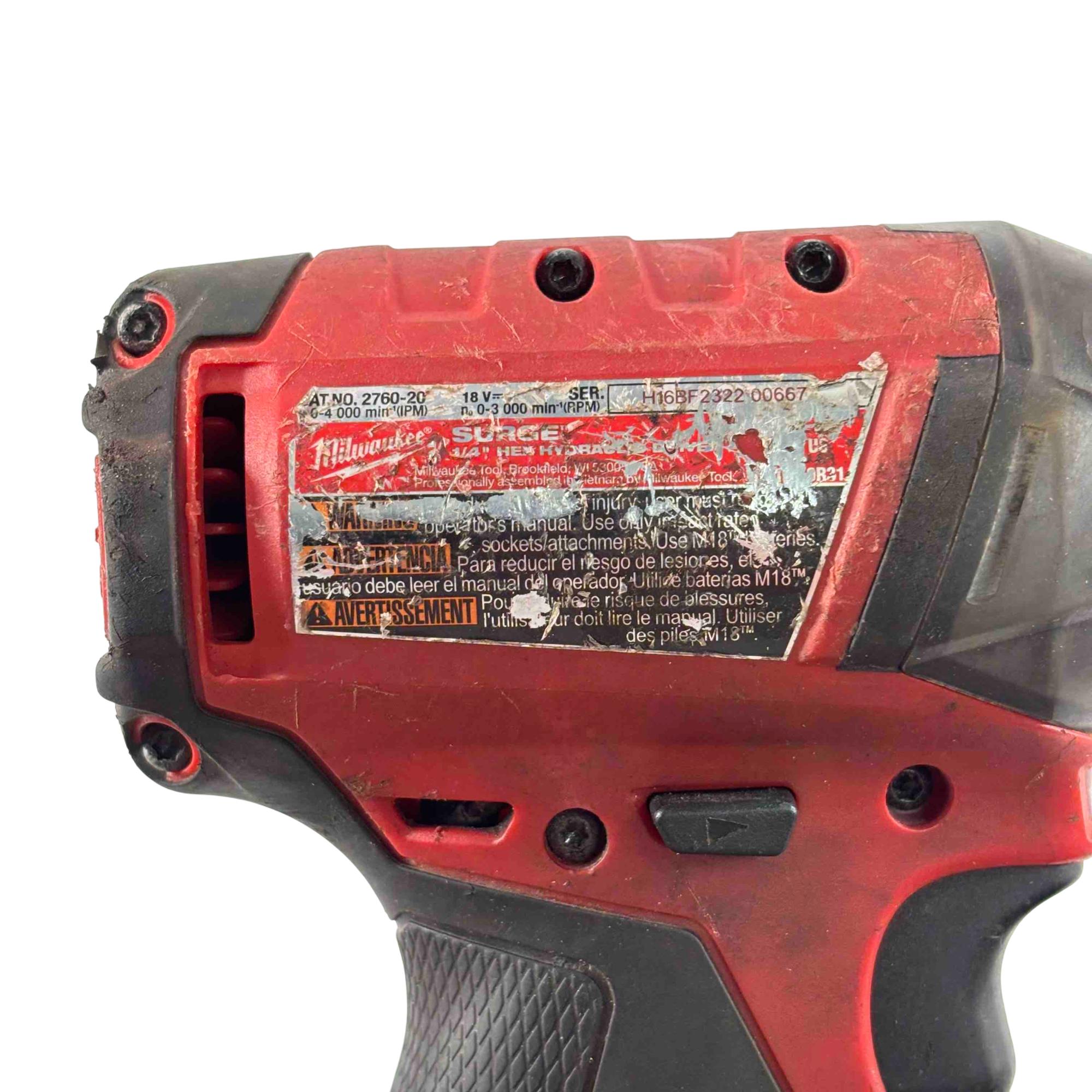 The Milwaukee 2760-20 M18 FUEL SURGE 18V Li-Ion Brushless 1/4 in. Hex Impact Driver features a FLUID-DRIVE hydraulic powertrain for quieter operation, smoother performance, and increased durability by reducing metal-on-metal contact. Equipped with REDLINK PLUS intelligence, it prevents damage from overloading or overheating. Compatible with REDLITHIUM batteries, it delivers extended work per charge and over the battery’s life. With 4-mode drive control, users can adjust output speed and power for precise fastening, making it ideal for demanding tasks.