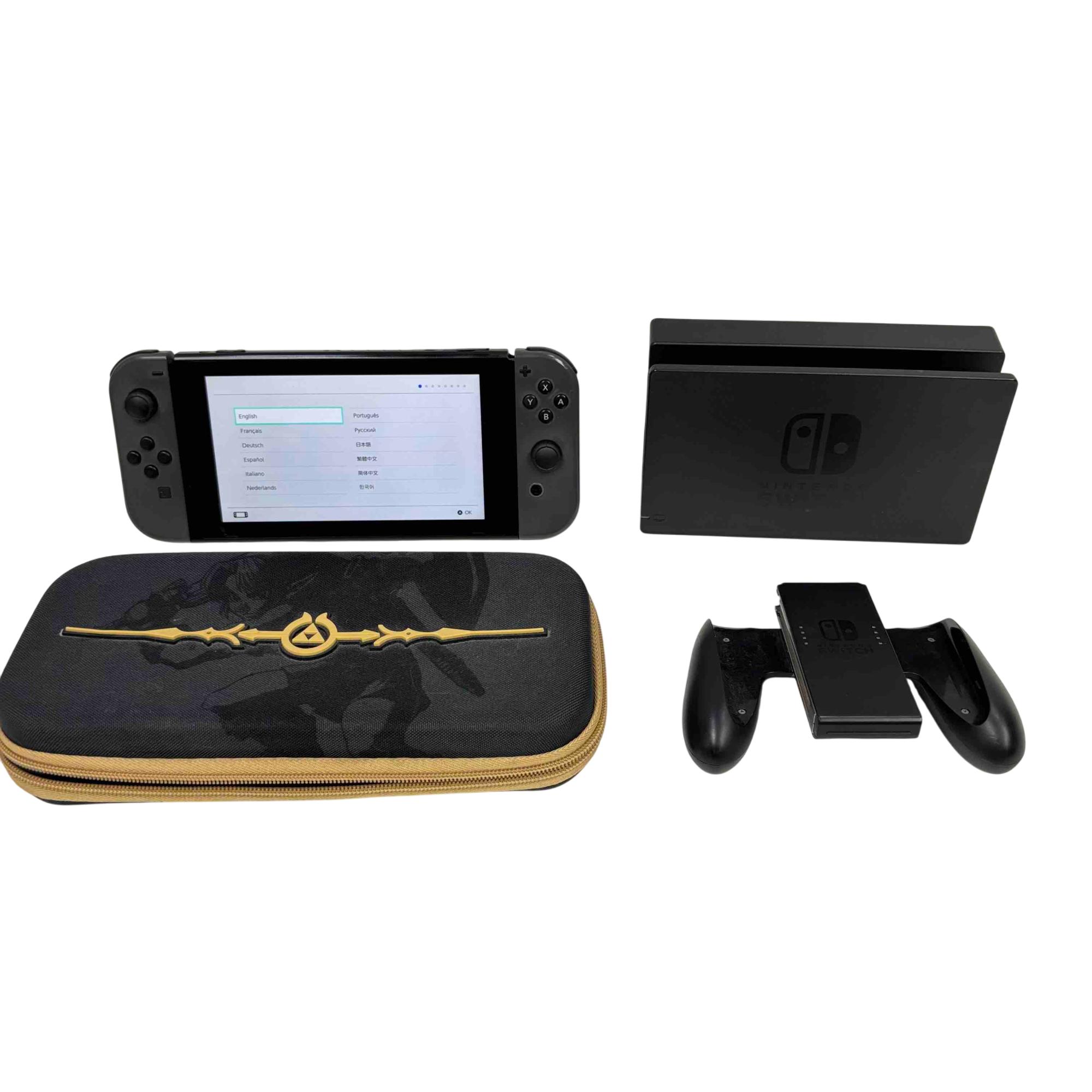 Experience flexible gaming at home or on the go with the Nintendo Switch HAC-001. This bundle includes the versatile tablet console, official Nintendo Switch dock for TV connectivity, Joy-Con grip controller, and a striking Legend of Zelda-themed travel case with gold trim—perfect for fans and collectors. Enjoy top-tier gaming performance and a stylish way to protect your system on every adventure.
