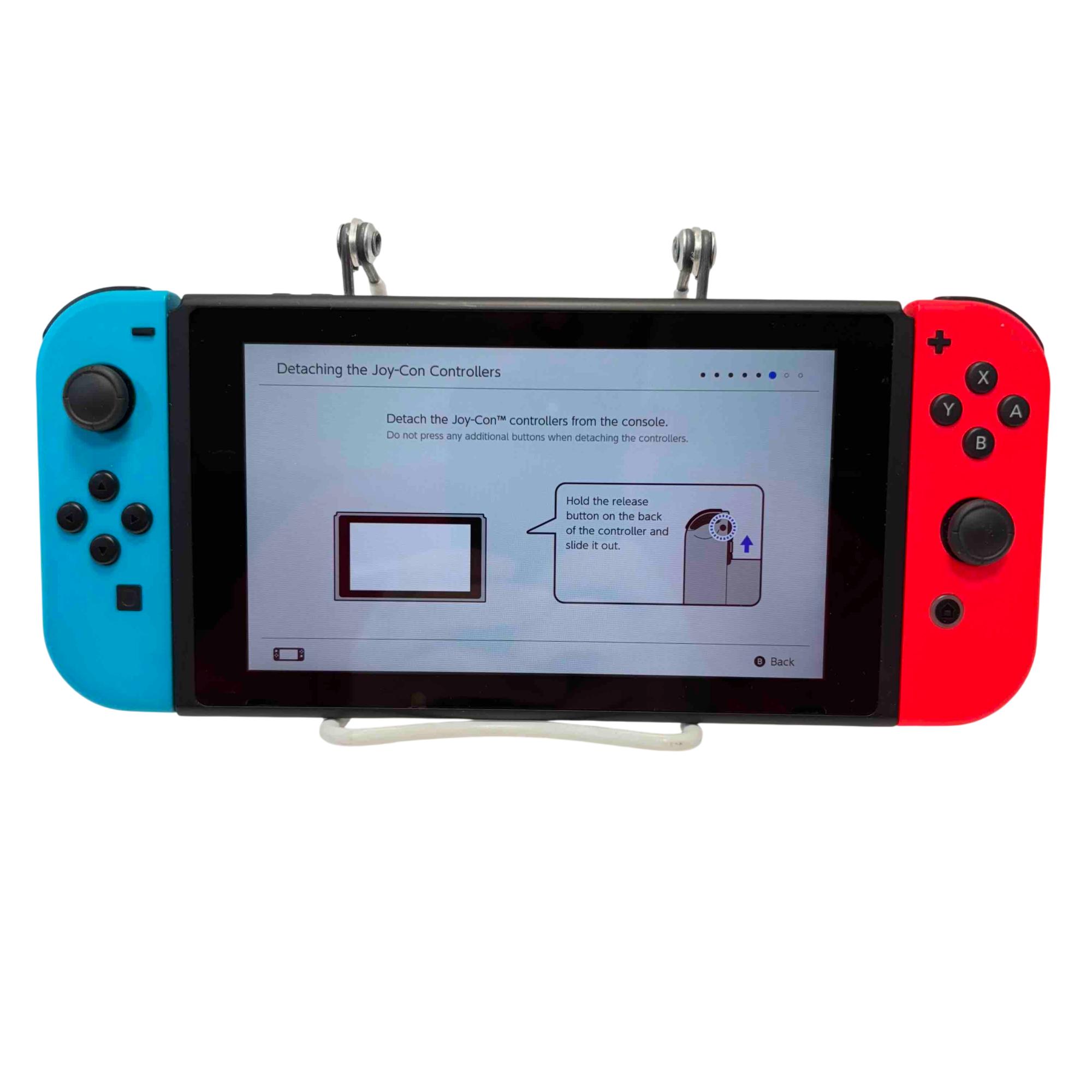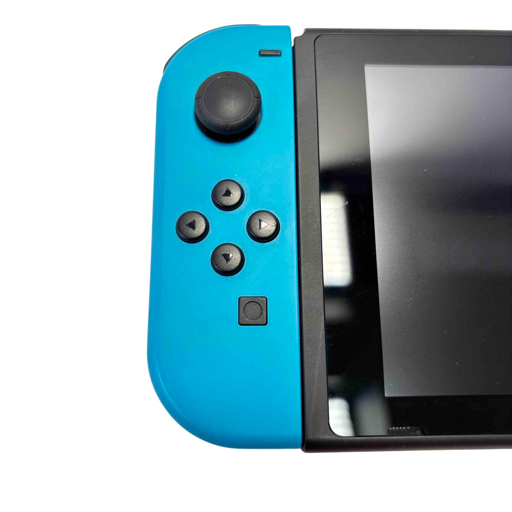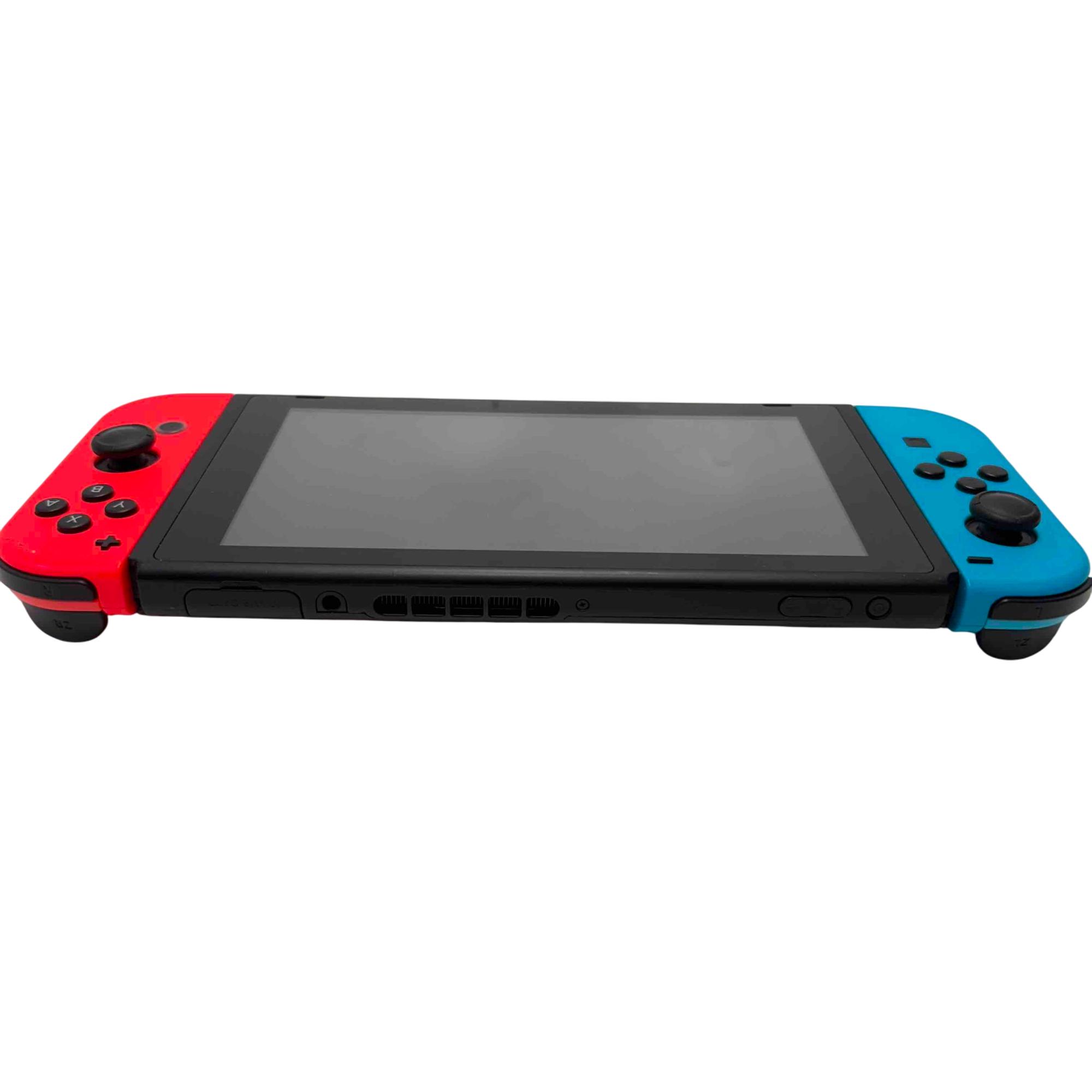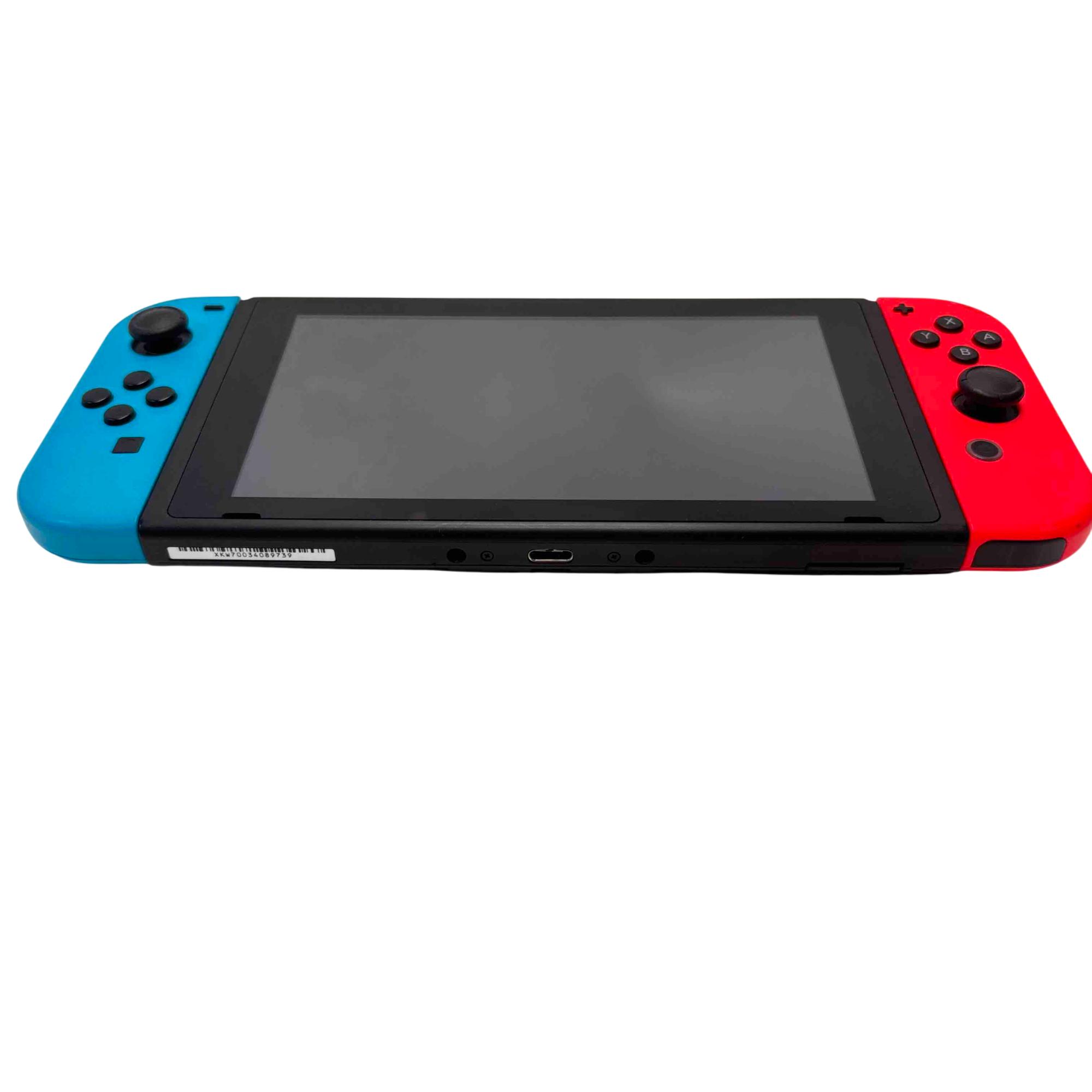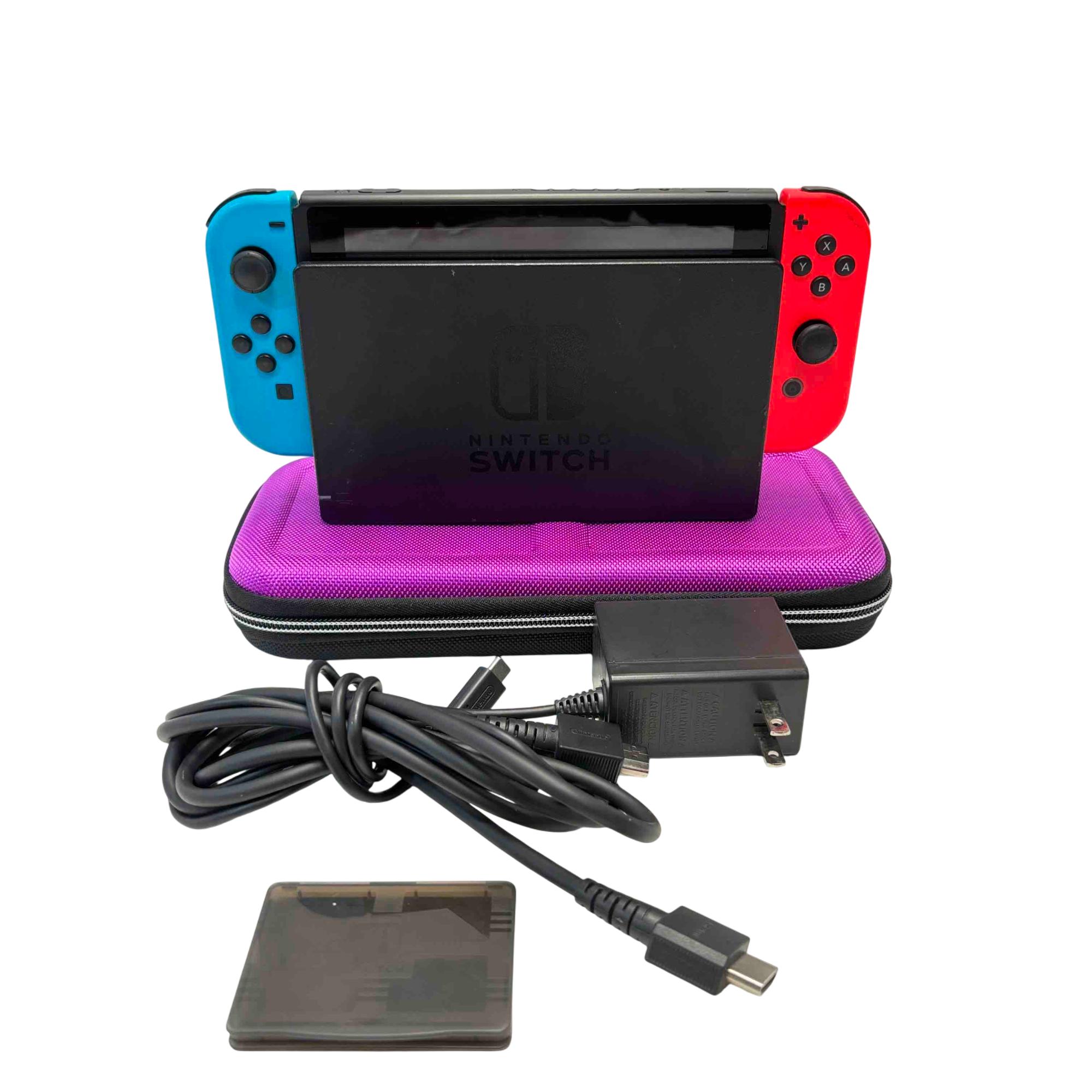 Experience versatile gaming at home or on-the-go with this Nintendo Switch HAC-001 console set, featuring vibrant Neon Blue and Red Joy-Con controllers. This bundle includes the original Nintendo dock for TV play, power adapter, and a stylish purple carrying case for maximum portability. Its gently-used condition ensures high performance while saving you money compared to new models.