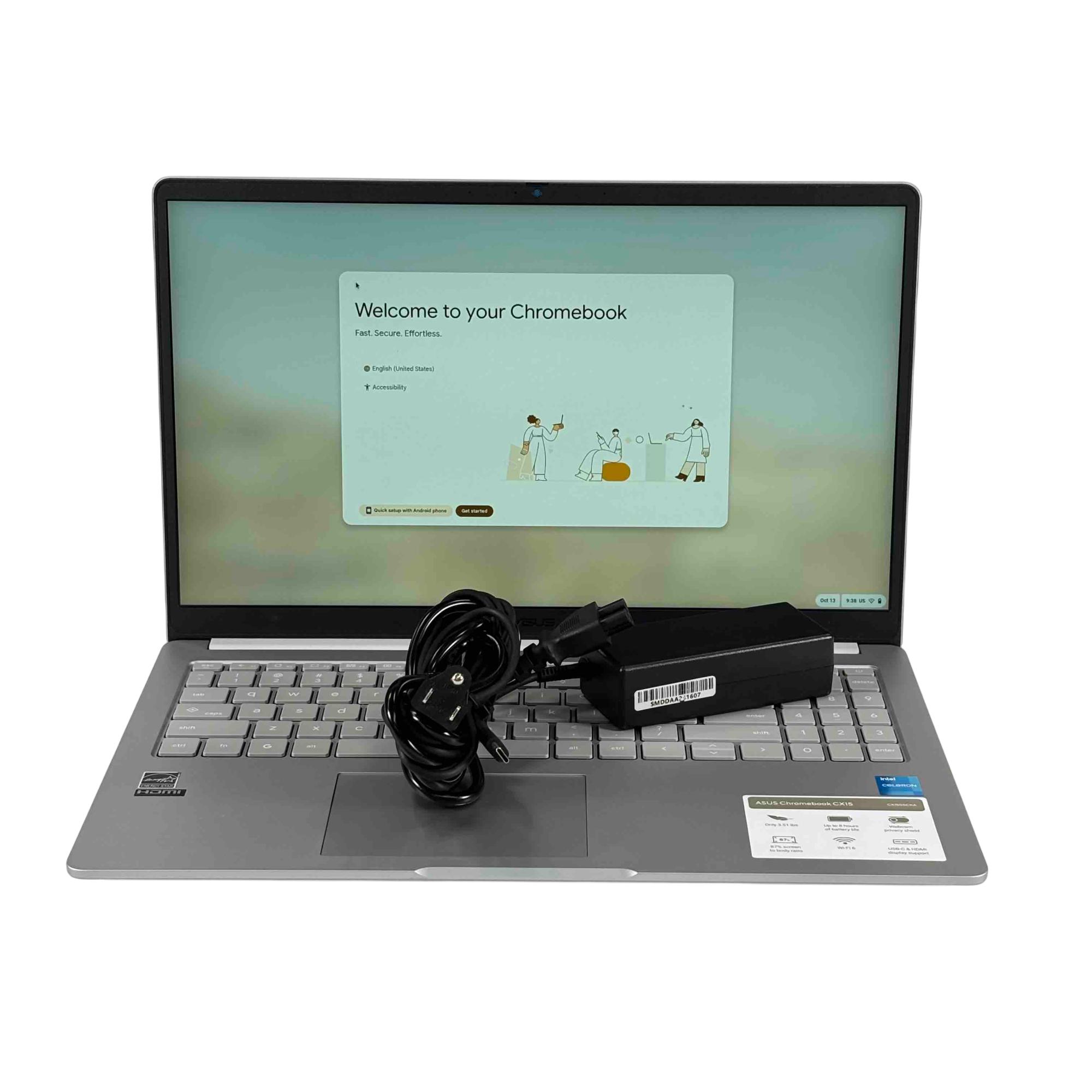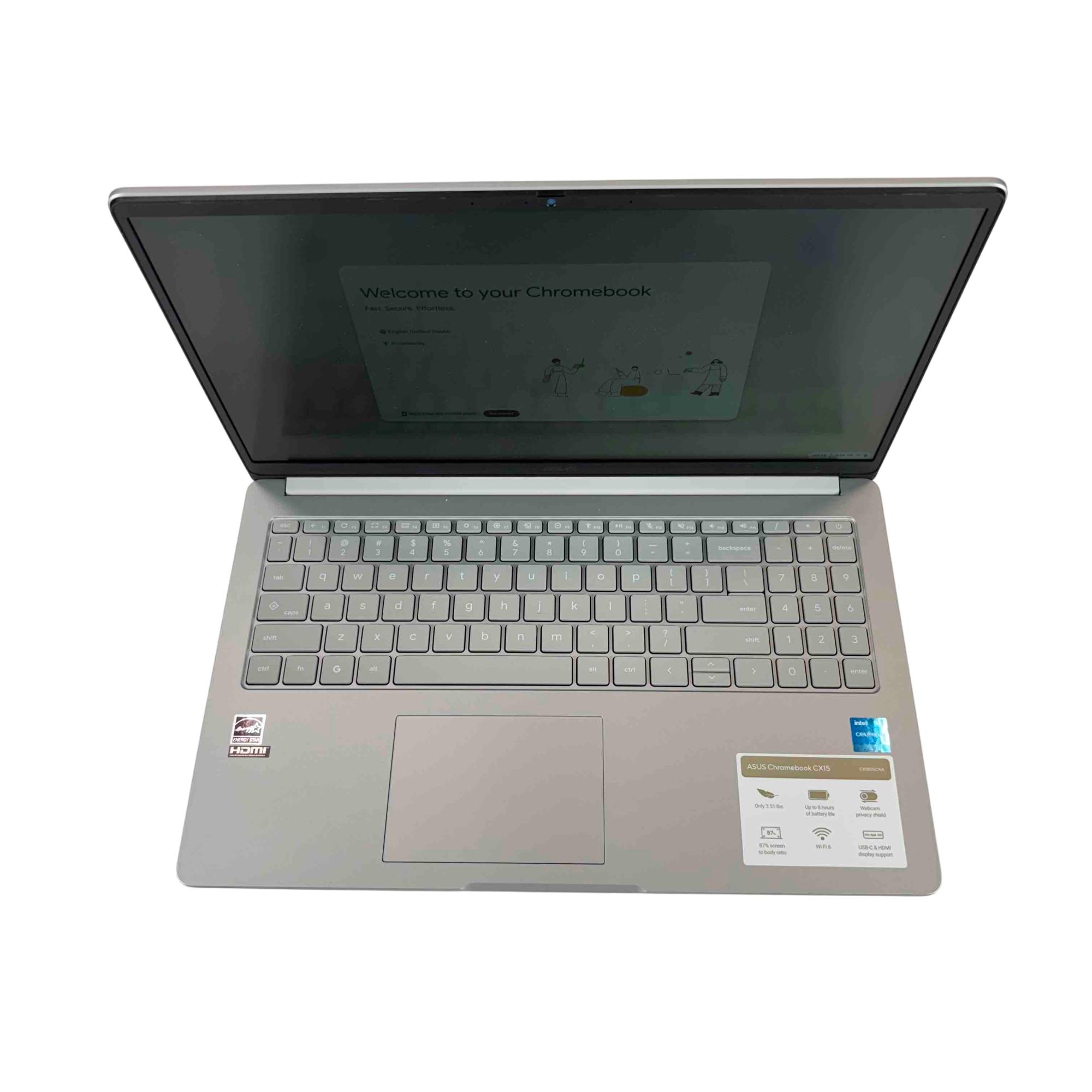 Built for everyday work and play, the ASUS Chromebook CX15 combines style, performance, and sustainability. Powered by an Intel Celeron N4500 processor with 4GB of RAM and 128GB of eMMC storage, it delivers smooth performance for productivity and entertainment. The 15.6" Full HD display with slim bezels offers an expansive viewing experience, while the durable, military-grade chassis ensures long-lasting reliability. Featuring Wi-Fi 6, Bluetooth 5.4, and a full suite of ports including HDMI and USB-C, this Chromebook is fast, secure, and ready for anything.