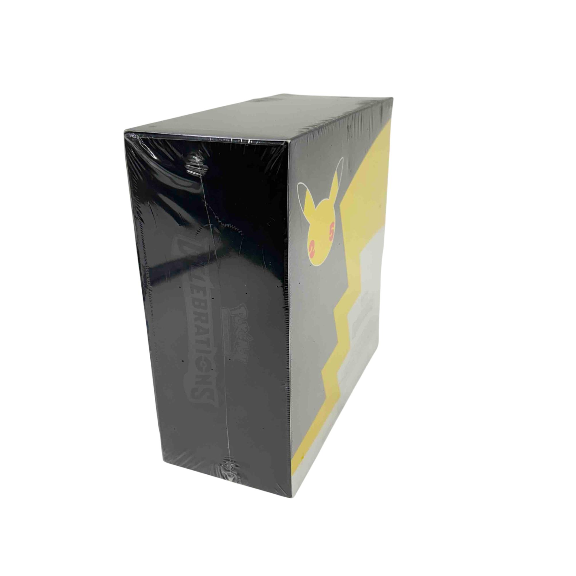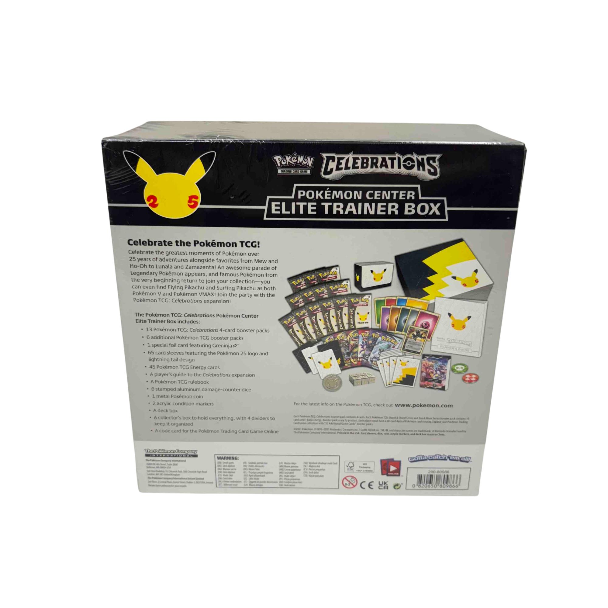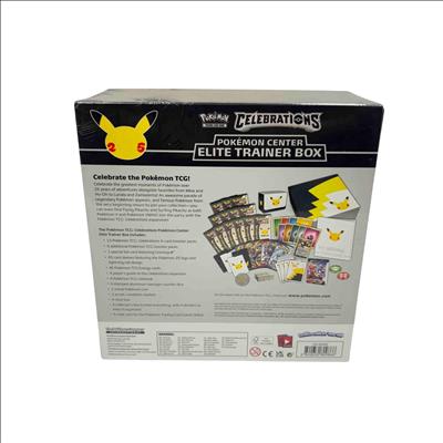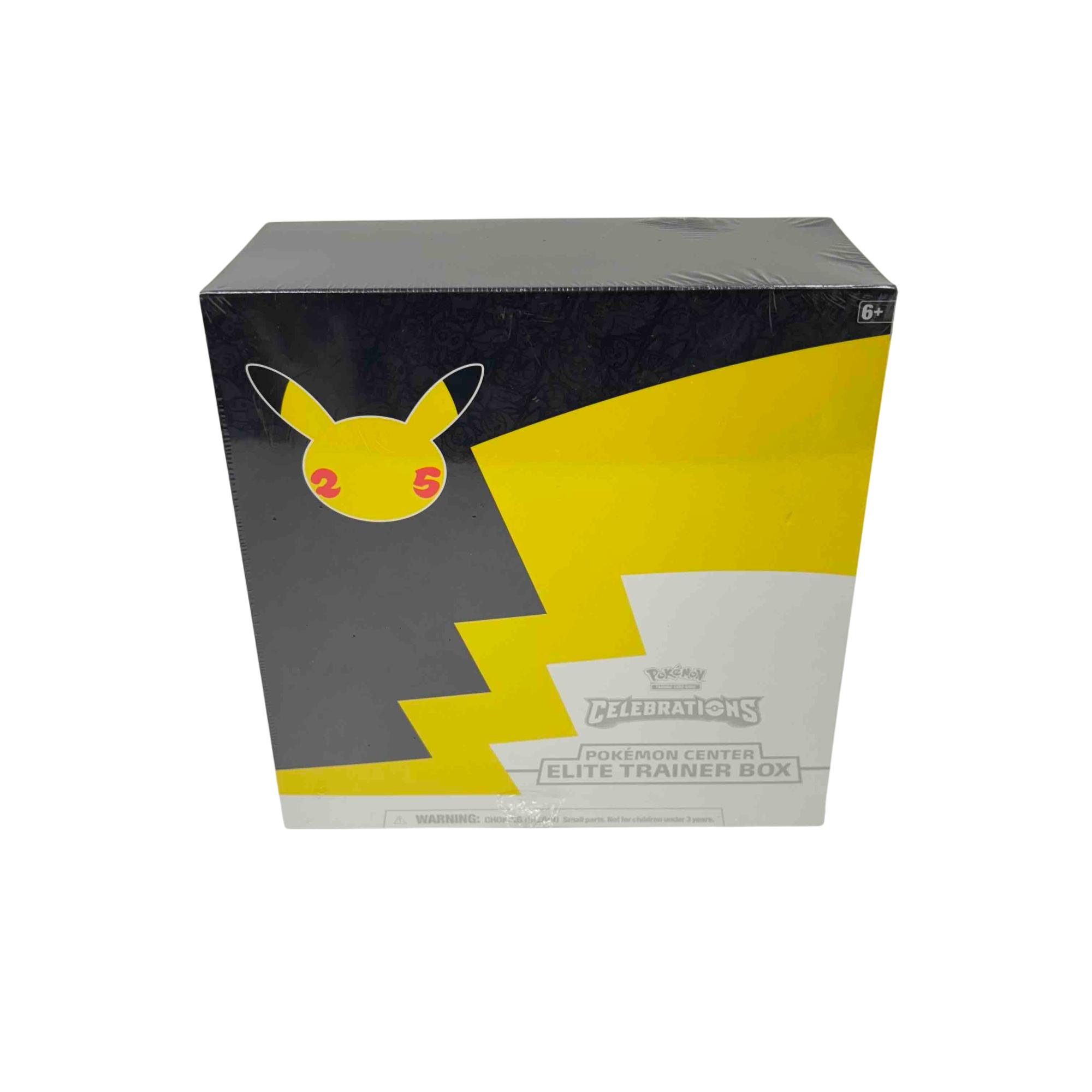 The Pokémon TCG Pokémon Center Celebrations Elite Trainer Box (25th Anniversary Edition, Sealed) features exclusive 25th anniversary-themed artwork with a black, yellow, and gray design. This sealed collectors box contains premium Pokémon Trading Card Game accessories, including a card storage box with iconic Celebrations branding, perfect for fans and players alike.
