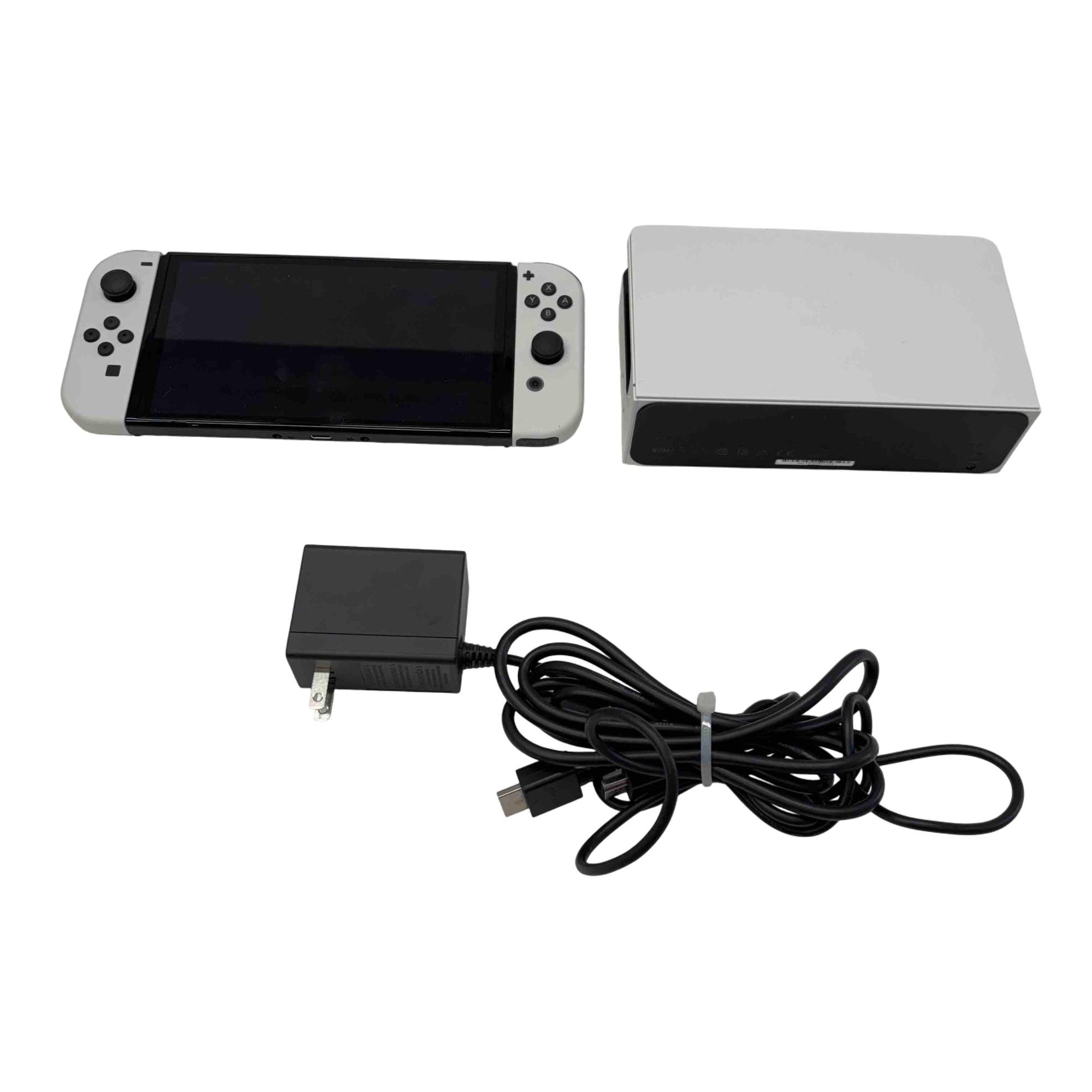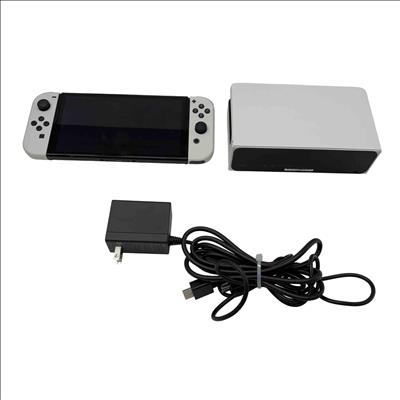 Nintendo Switch OLED Model HEG-001 with Dock and AC Adapter is a handheld and home video game console featuring a vibrant OLED screen and a sleek black rectangular design. This set includes the official dock for TV connectivity and an AC adapter for reliable power supply, delivering versatile gaming options with enhanced display quality.