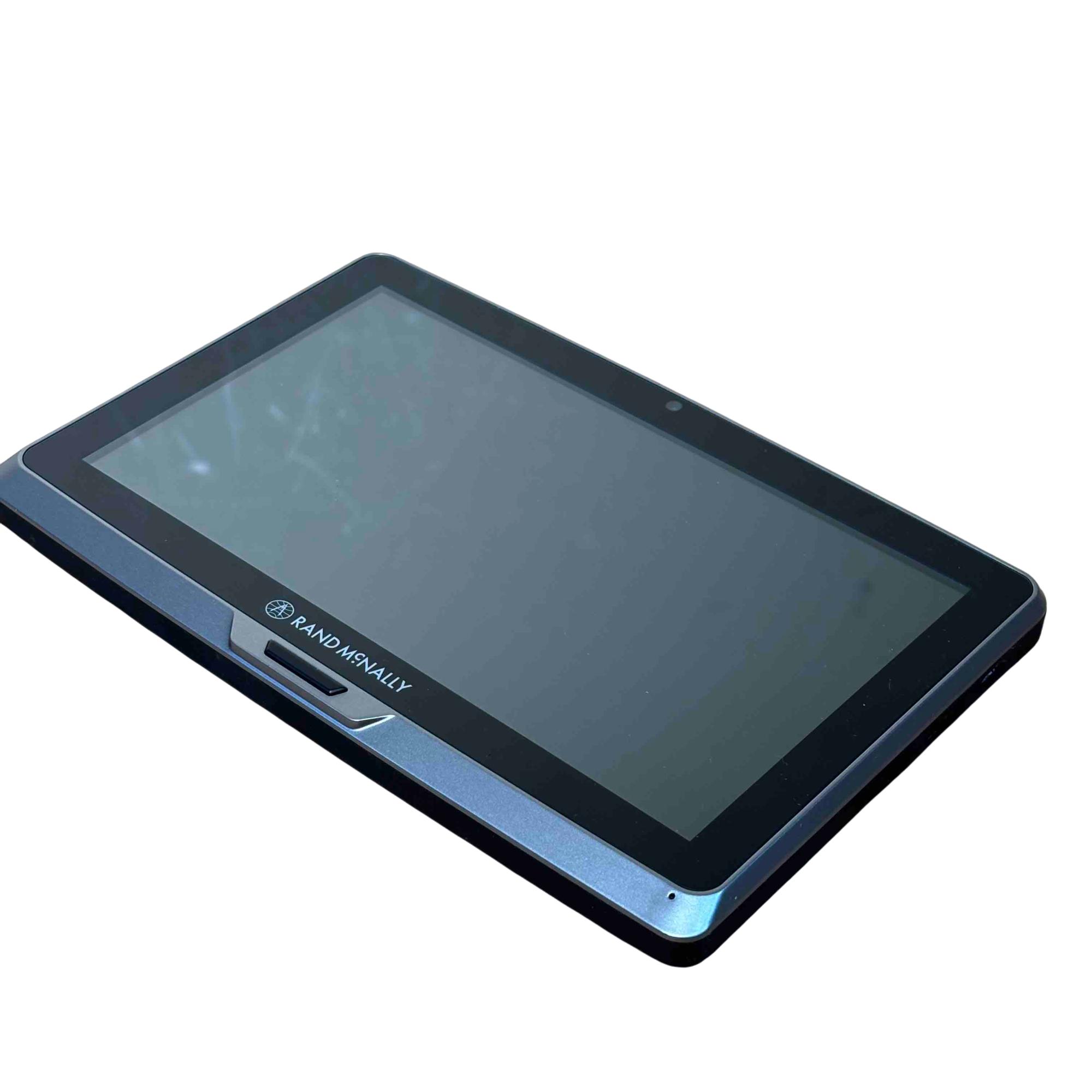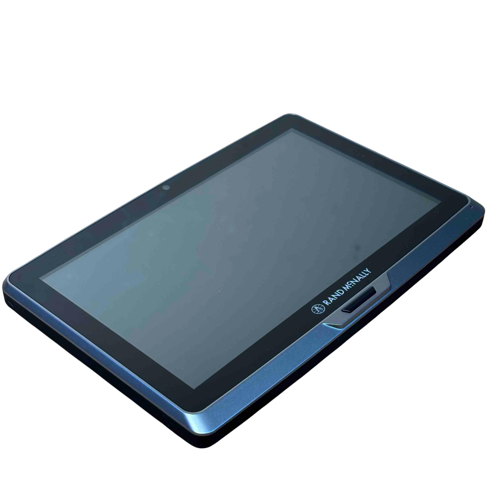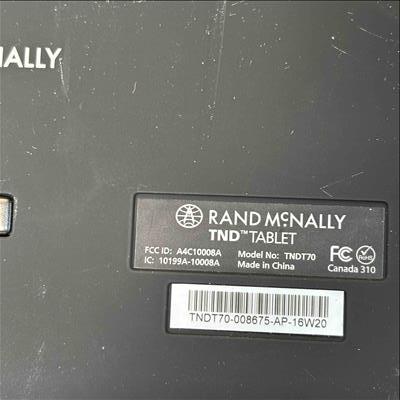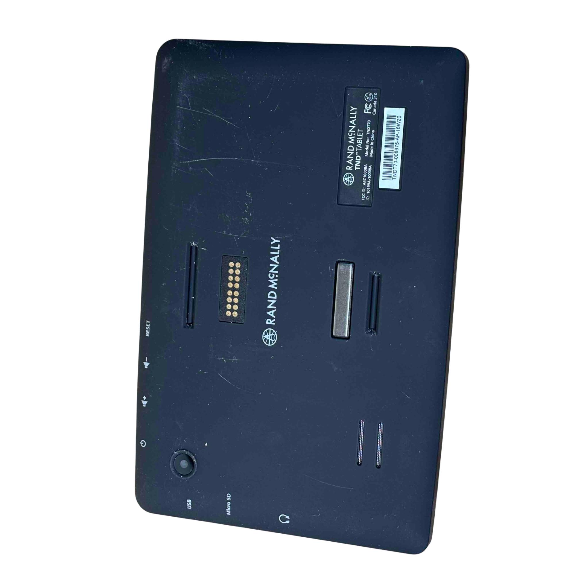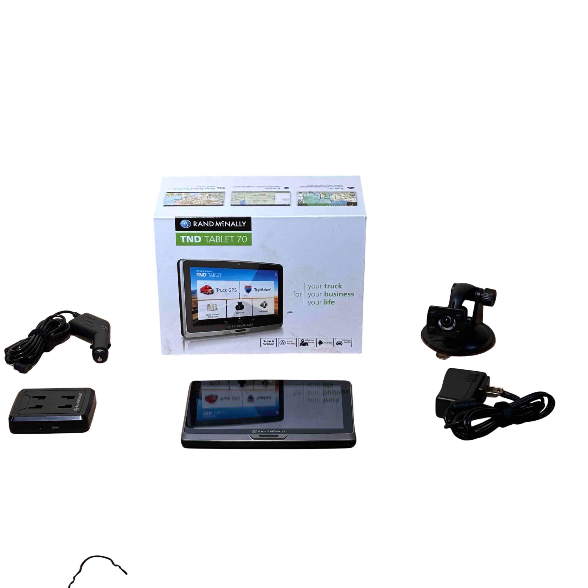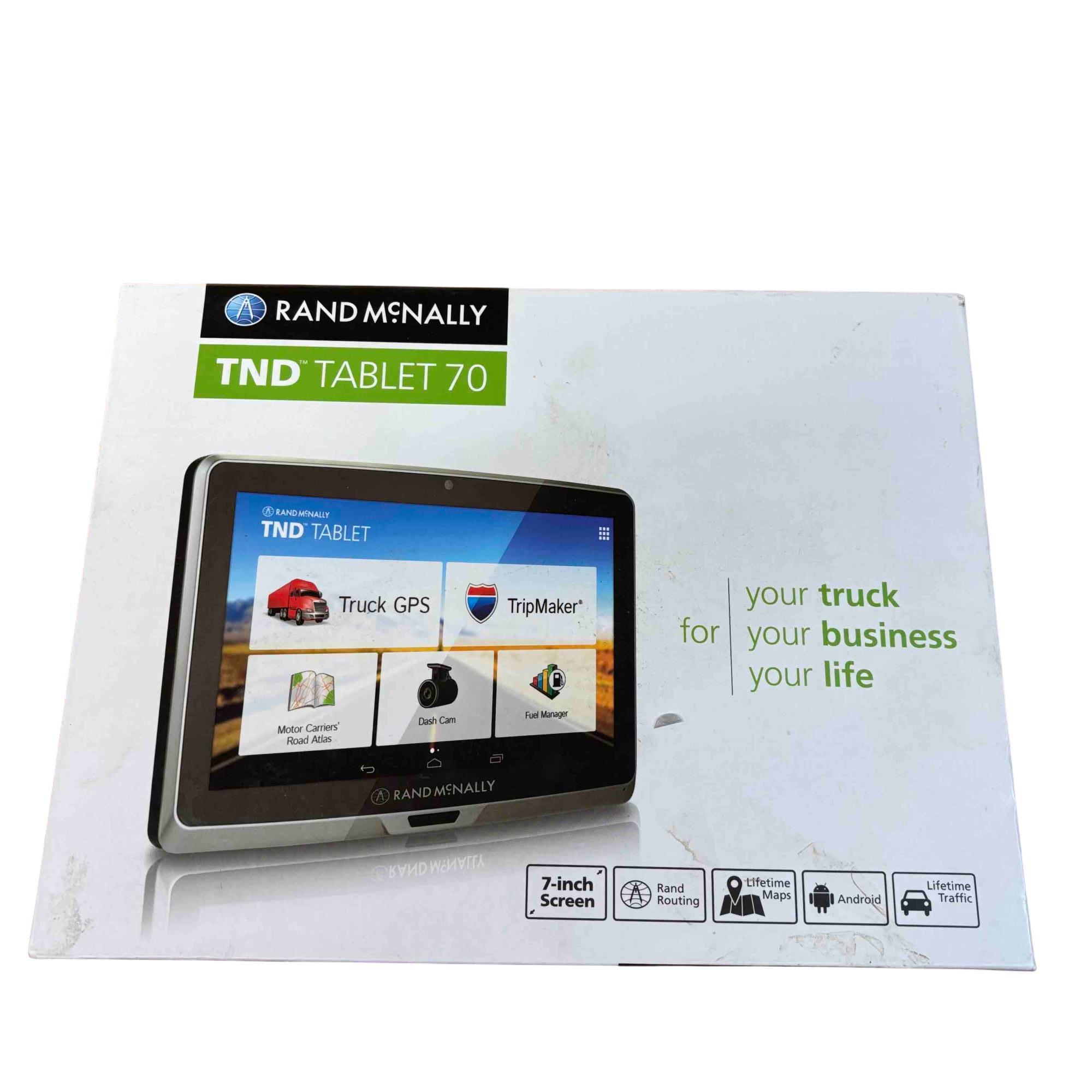 The Rand McNally TND Tablet 70 (TNDT70) features a 7-inch, 1024x600 IPS LCD capacitive touchscreen, an Android operating system, 16GB of internal storage, and a 2500 mAh battery. Key specifications include a Quad-core processor, Wi-Fi 802.11 a/b/g connectivity, Bluetooth 4.0, a 5MP front-facing camera, a 0.3MP self-facing camera, and a built-in dashcam. It also includes pre-loaded truck-specific navigation features, a microSD slot, and a magnetic mount with GPS boost.