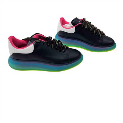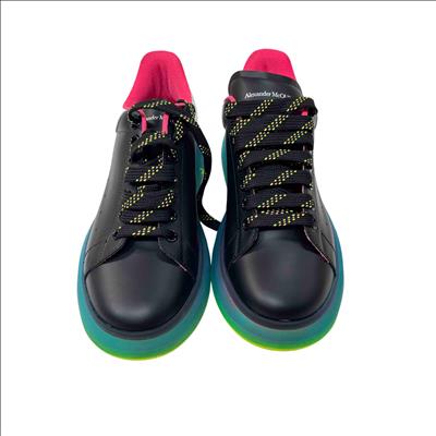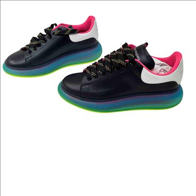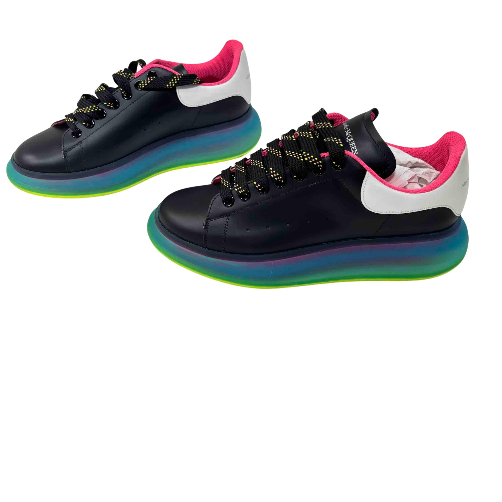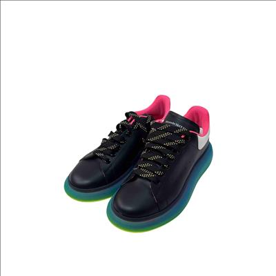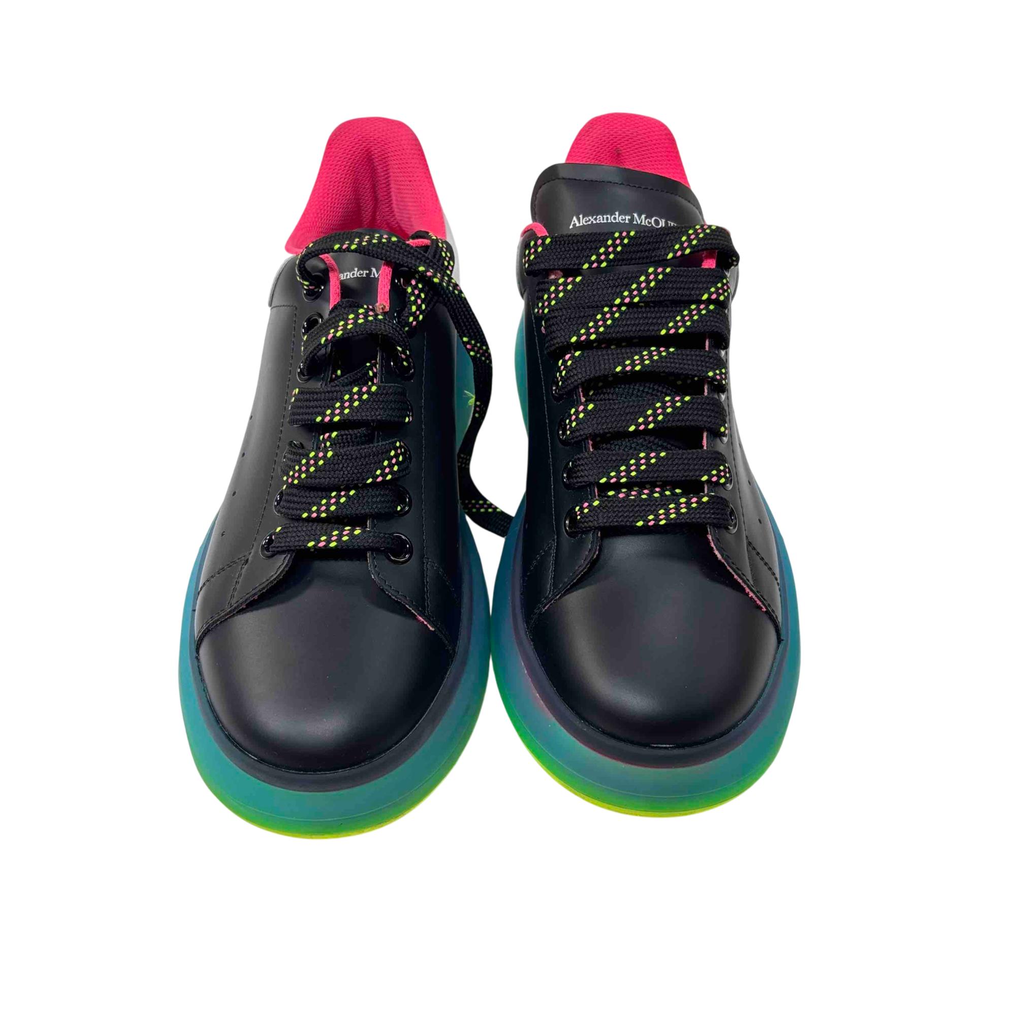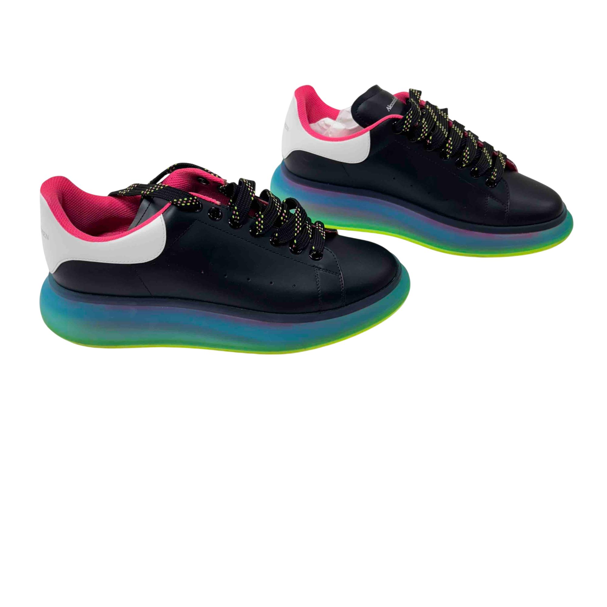 Alexander McQueen Oversized Sneakers - Black with Transparent Multicolor Sole, Pink Trim feature a sleek black leather upper with lace-up closure and a distinctive transparent sole accented with vibrant multicolor and pink trim. These designer sneakers combine high fashion with comfort, making them ideal for stylish everyday wear and outdoor activities.